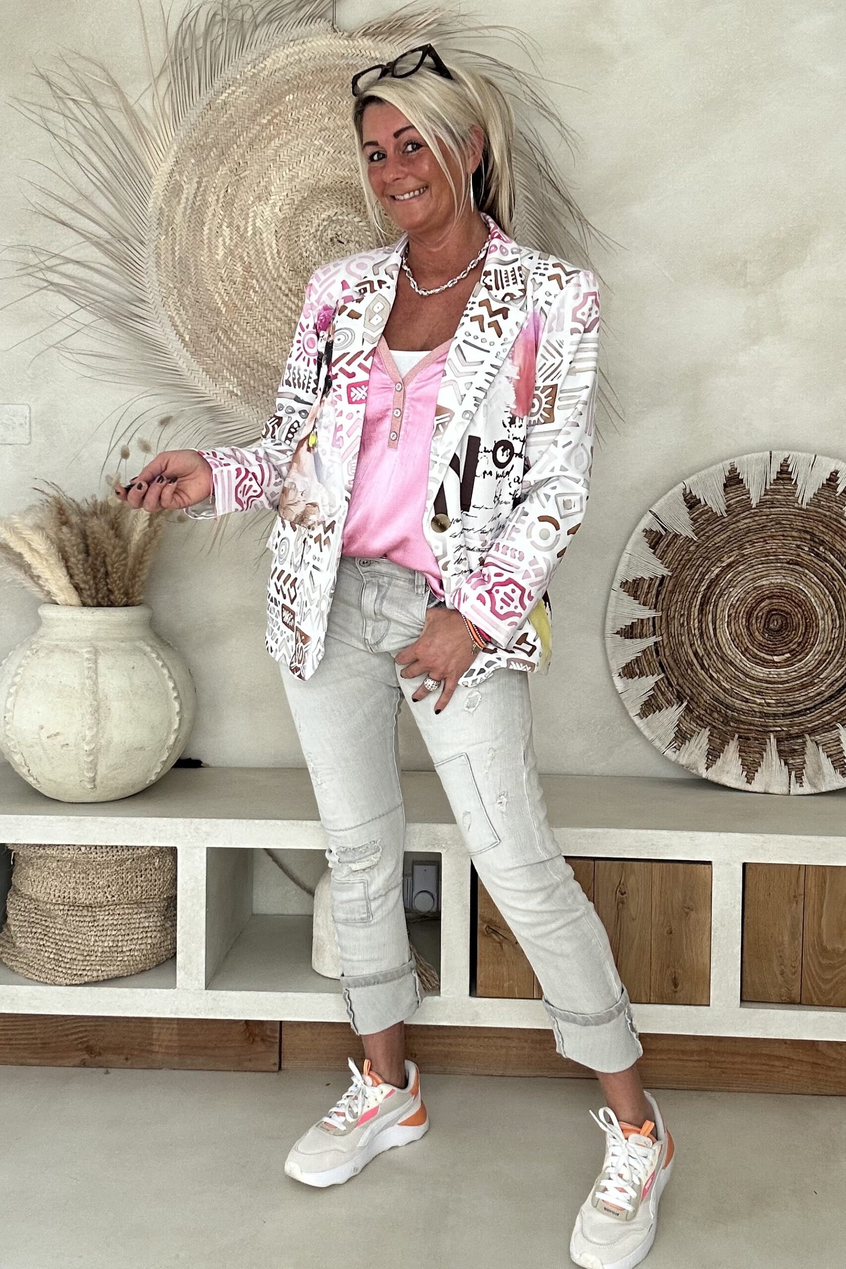 Deze licht grijze baggy jeans straalt moeiteloze coolness en comfort uit. Met zijn relaxte pasvorm en trendy gescheurde details en patches illustreert deze jeans een nonchalante stijl die perfect is voor casual dagen. Het oprollen van de broekspijpen voegt een speels tintje toe aan de look, terwijl de subtiele distressing zorgt voor een edgy uitstraling. Combineer deze jeans met een eenvoudig T-shirt en sneakers voor een relaxte en toch trendy outfit. Met zijn veelzijdigheid en comfort zal deze baggy jeans snel een favoriet worden in je garderobe voor dagelijkse avonturen. De jeans valt iets ruim, model draagt maat S voor een aangesloten fit en M voor een iets meer losse fit en heeft doorgaans maat 38 en is 1.66 m lang.