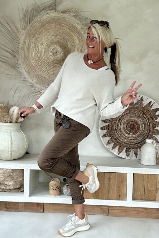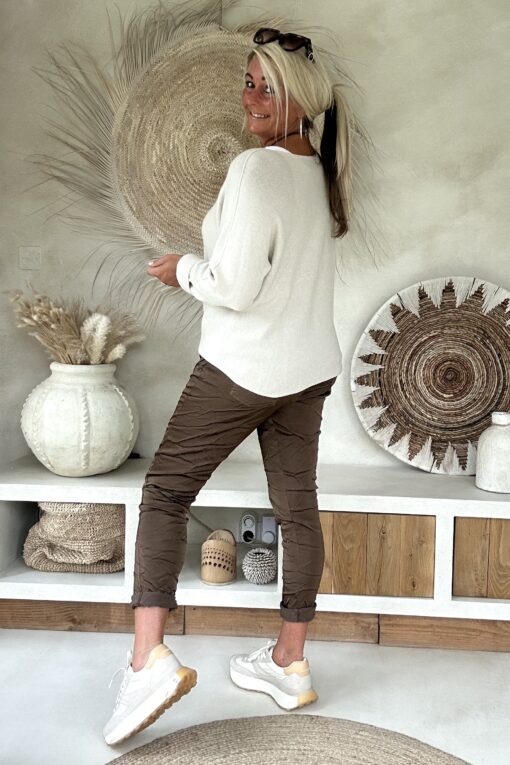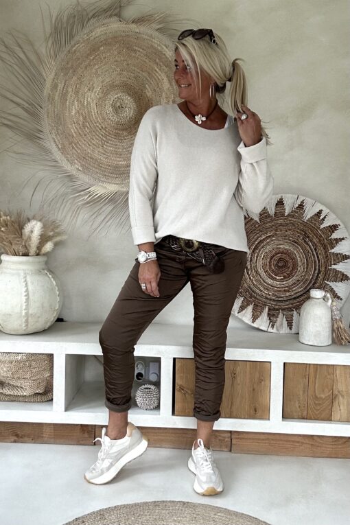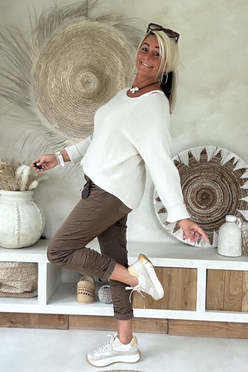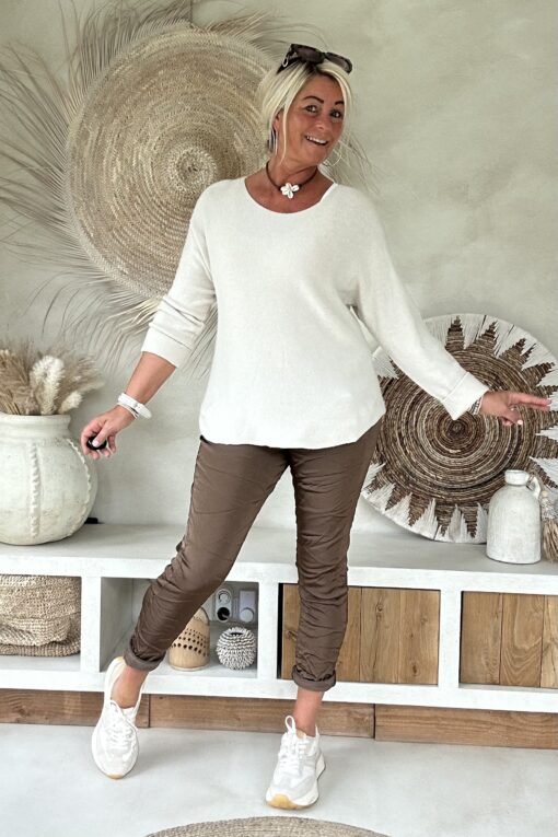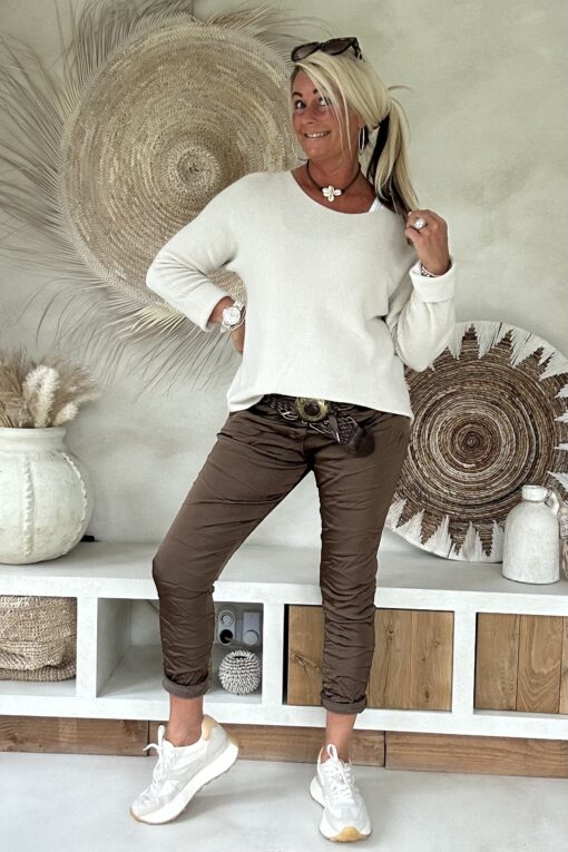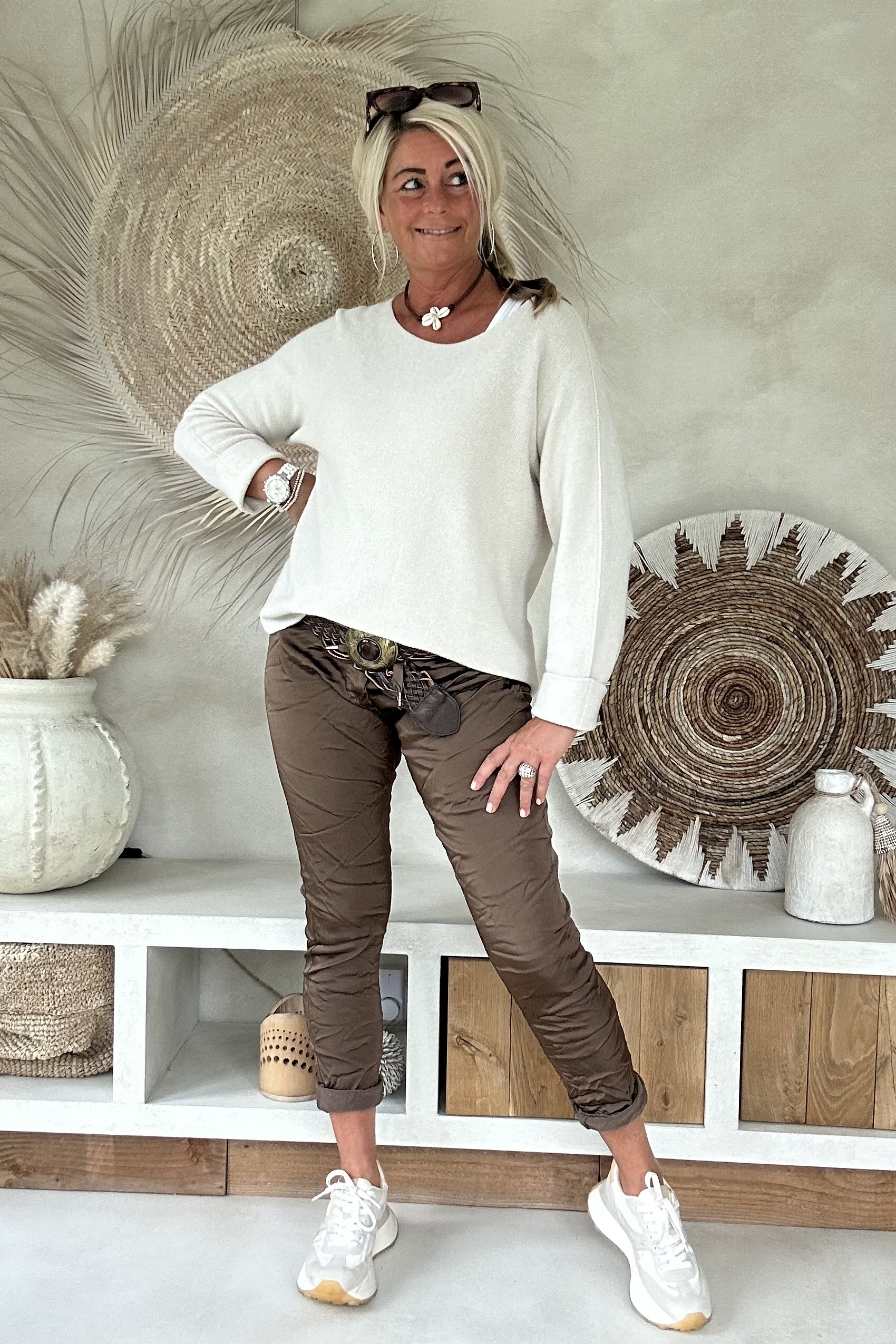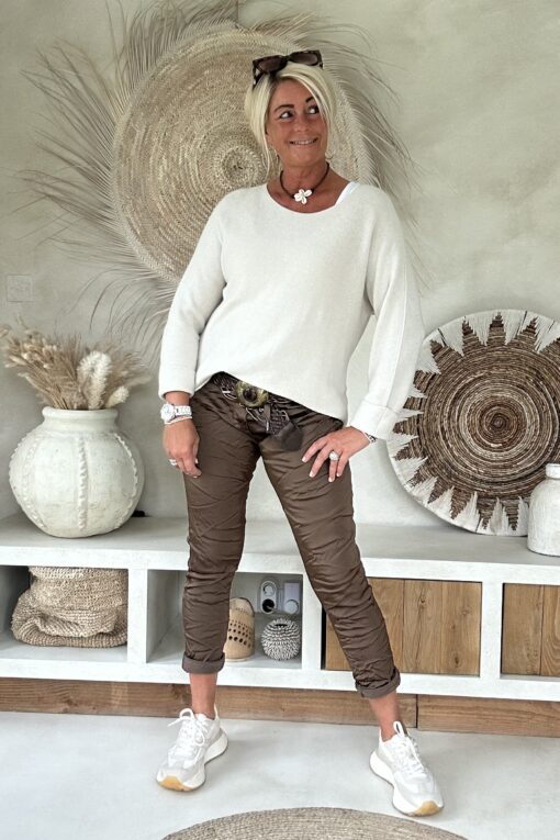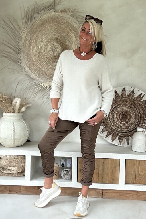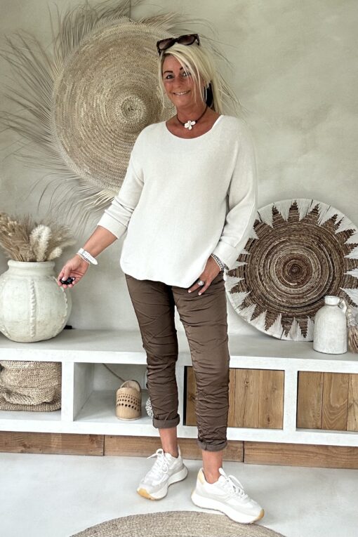 Deze basic trui is gemaakt van dunne, zachte knitwear met veel stretch, waardoor hij heerlijk comfortabel draagt. De trui heeft een ronde hals en kan zowel netjes als casual gestyled worden. Dankzij de one size pasvorm is hij passend tot en met maat 42. Ideaal om te combineren op een jeans of leatherlook broek, maar ook perfect onder een gilet, vest of poncho voor een gelaagde look.