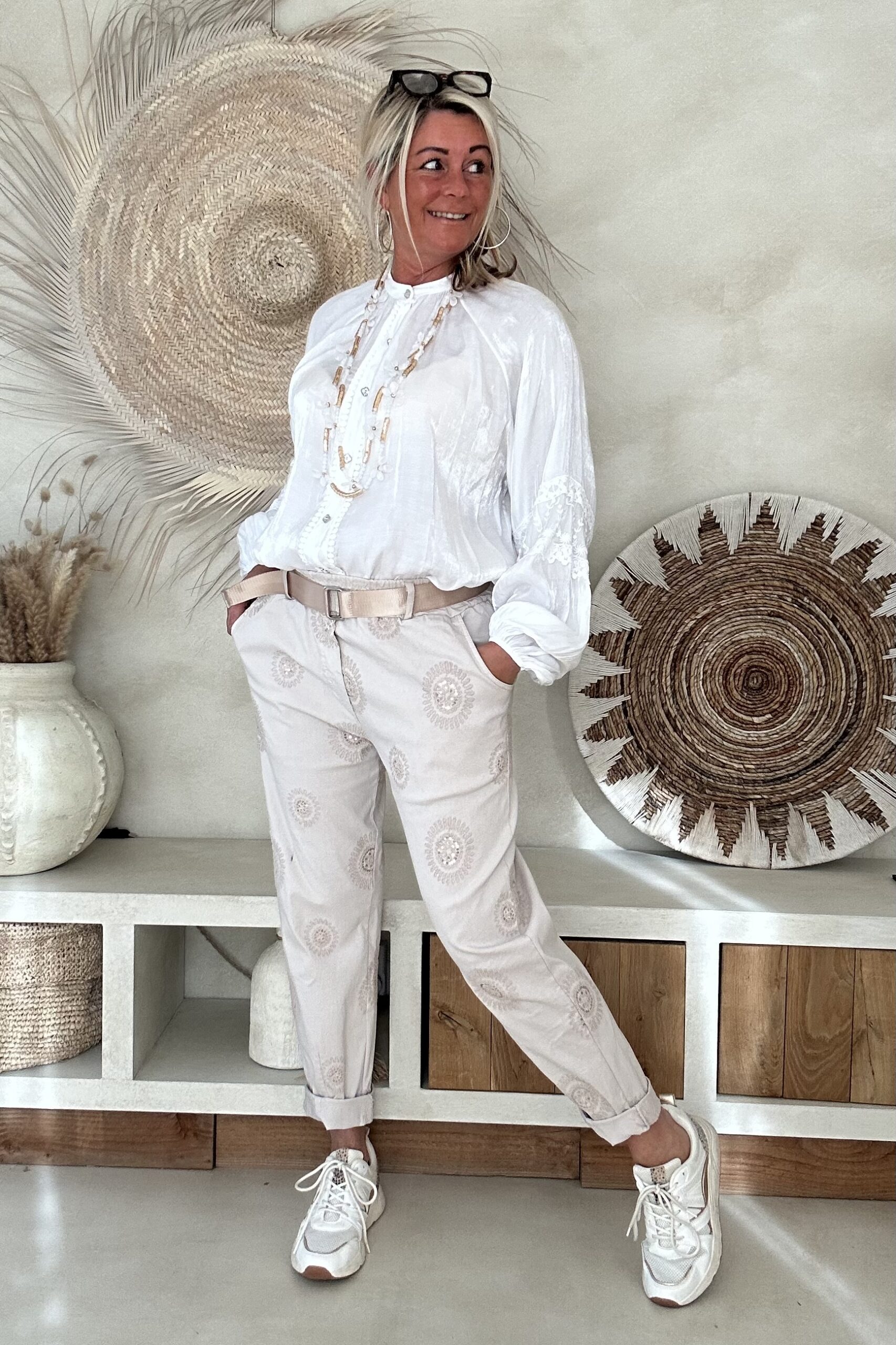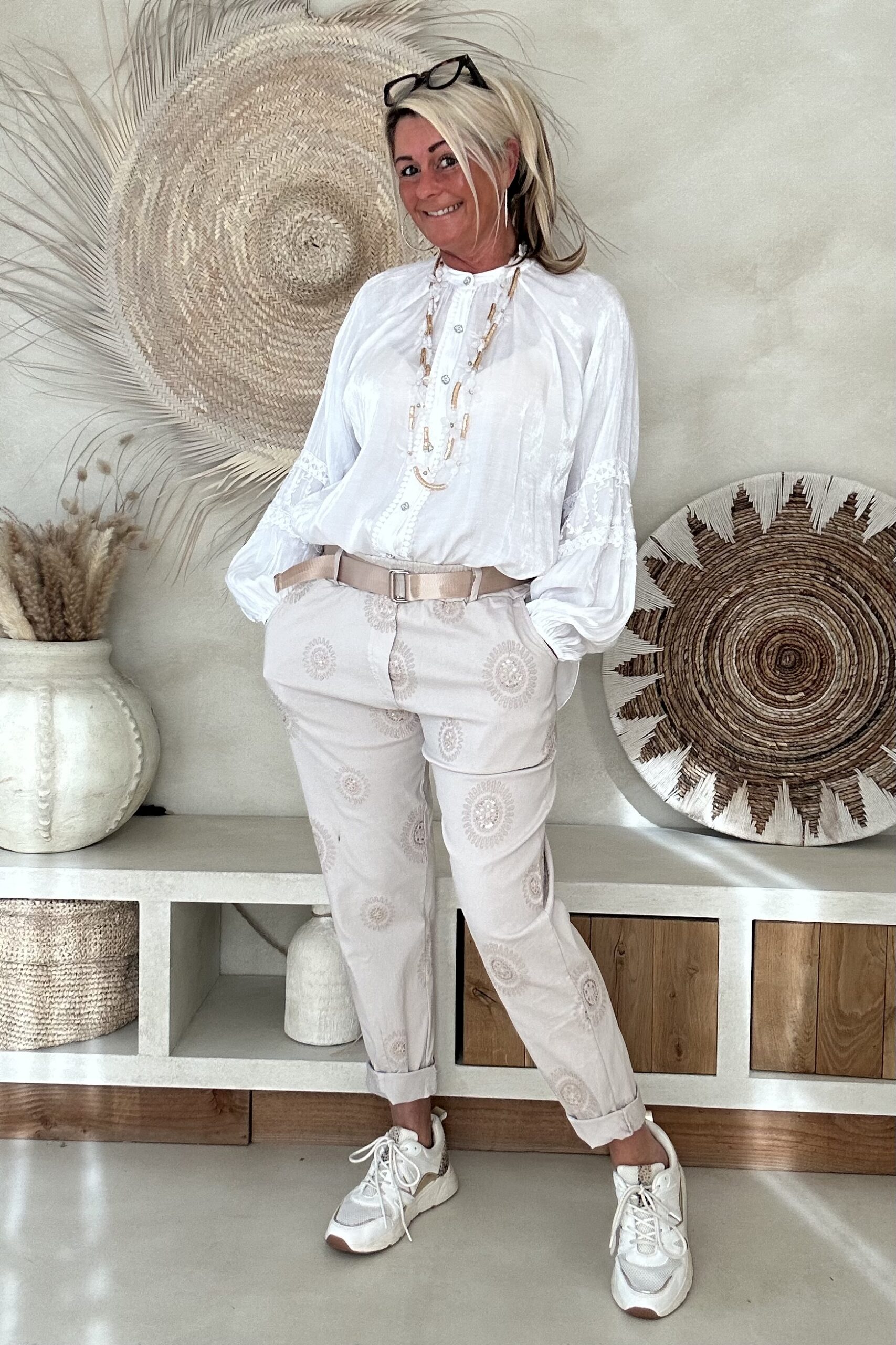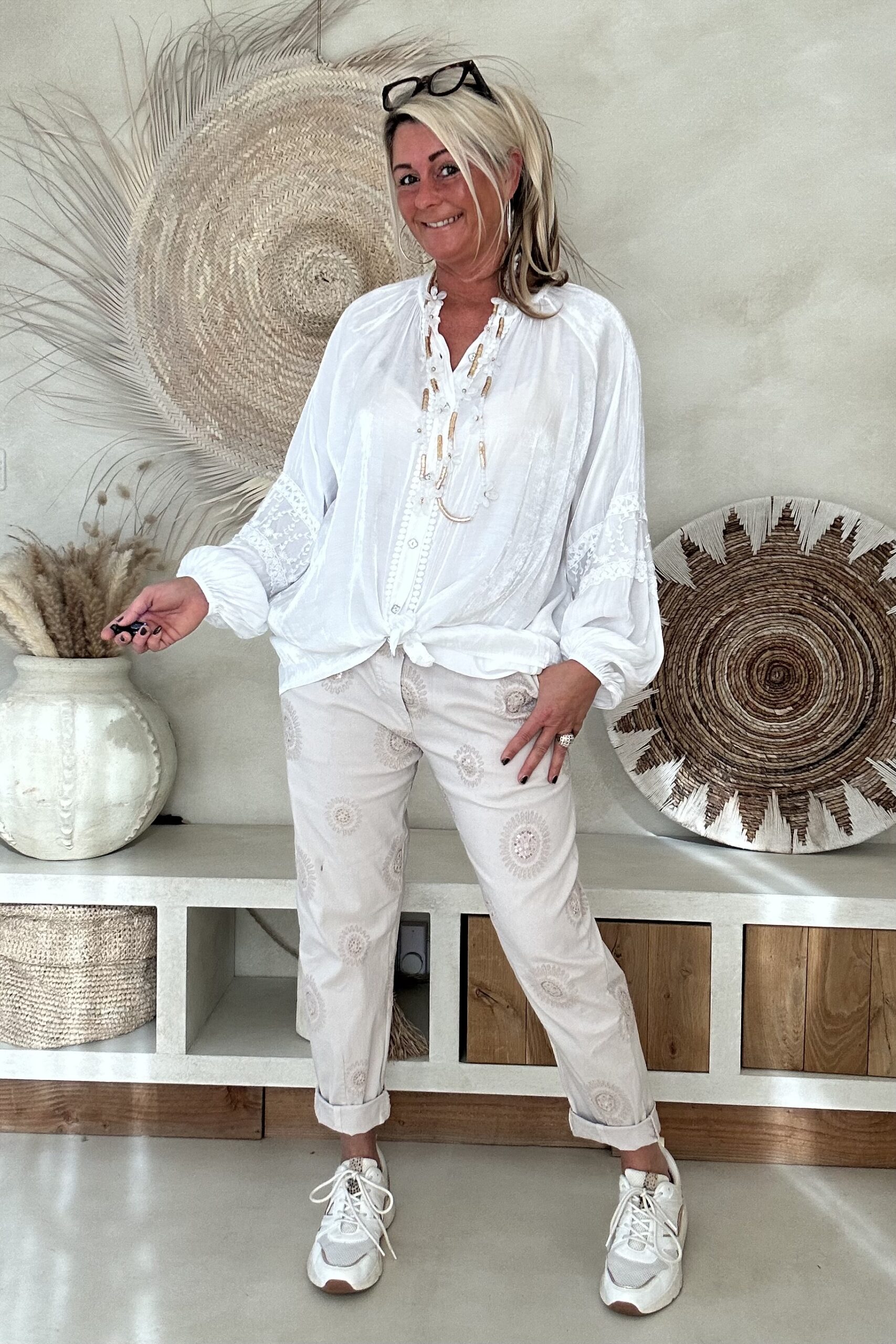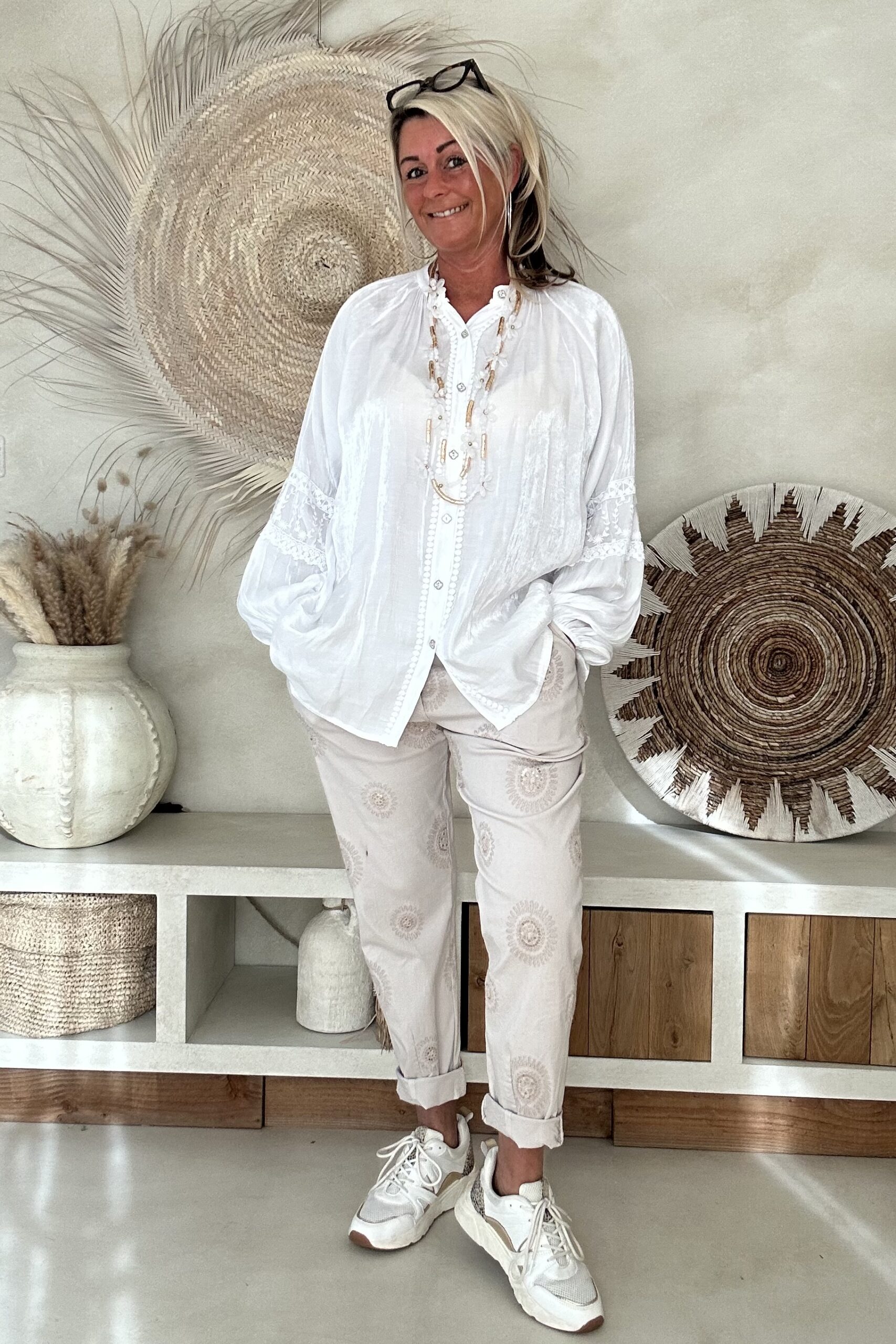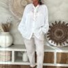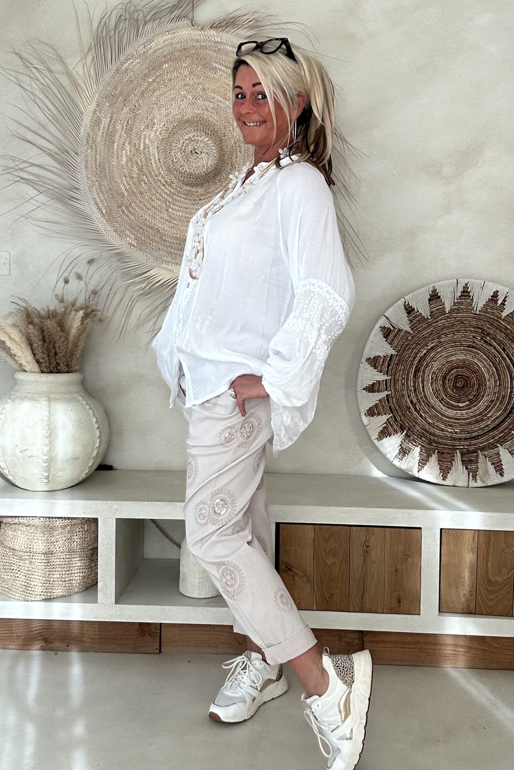 De blouse valt mooi ruim en draagt heerlijk licht, met een iets kortere voorkant waardoor hij speels te stylen is in een broek of rok. Perfect voor een vrouwelijke, bohemian look – of je hem nu casual draagt of chic combineert.