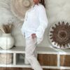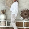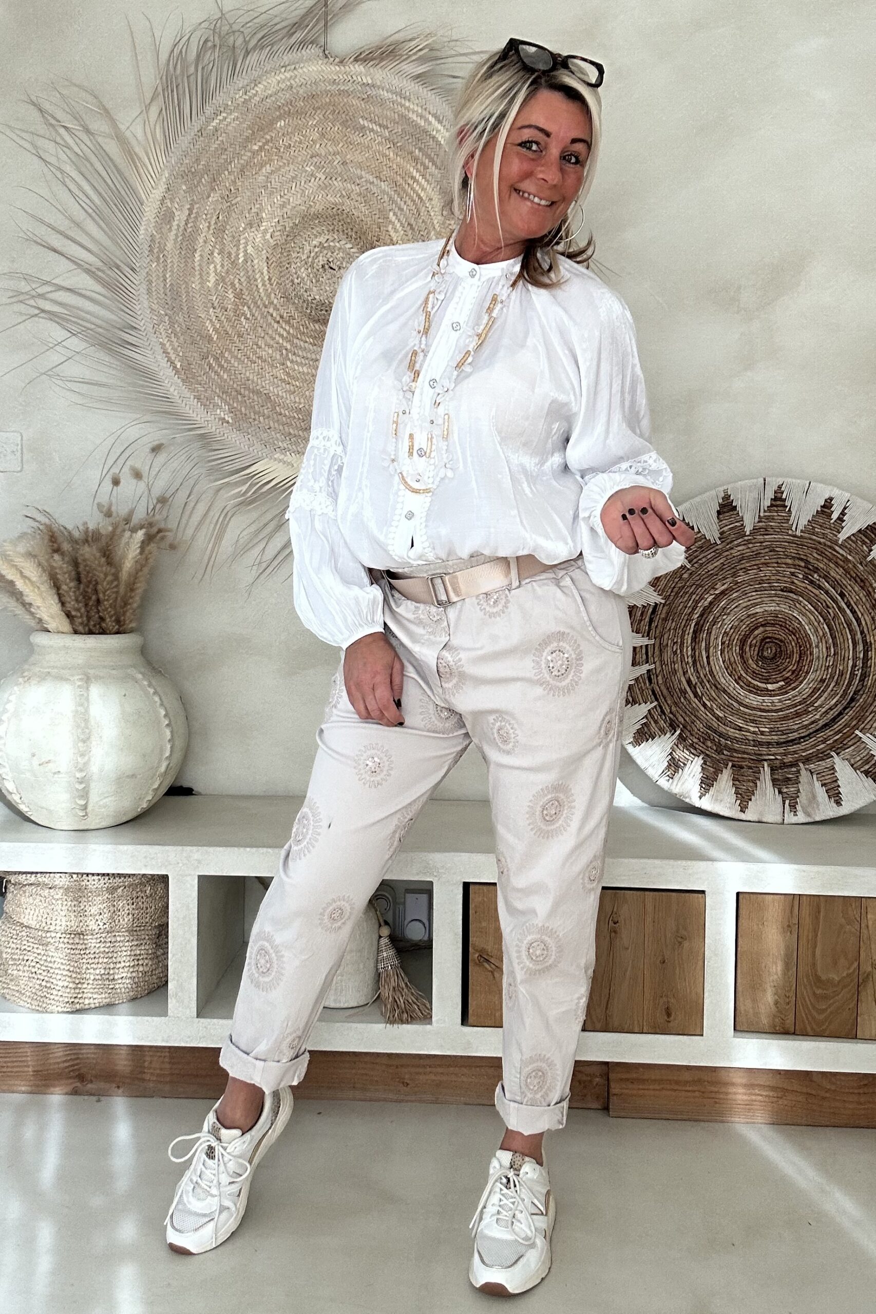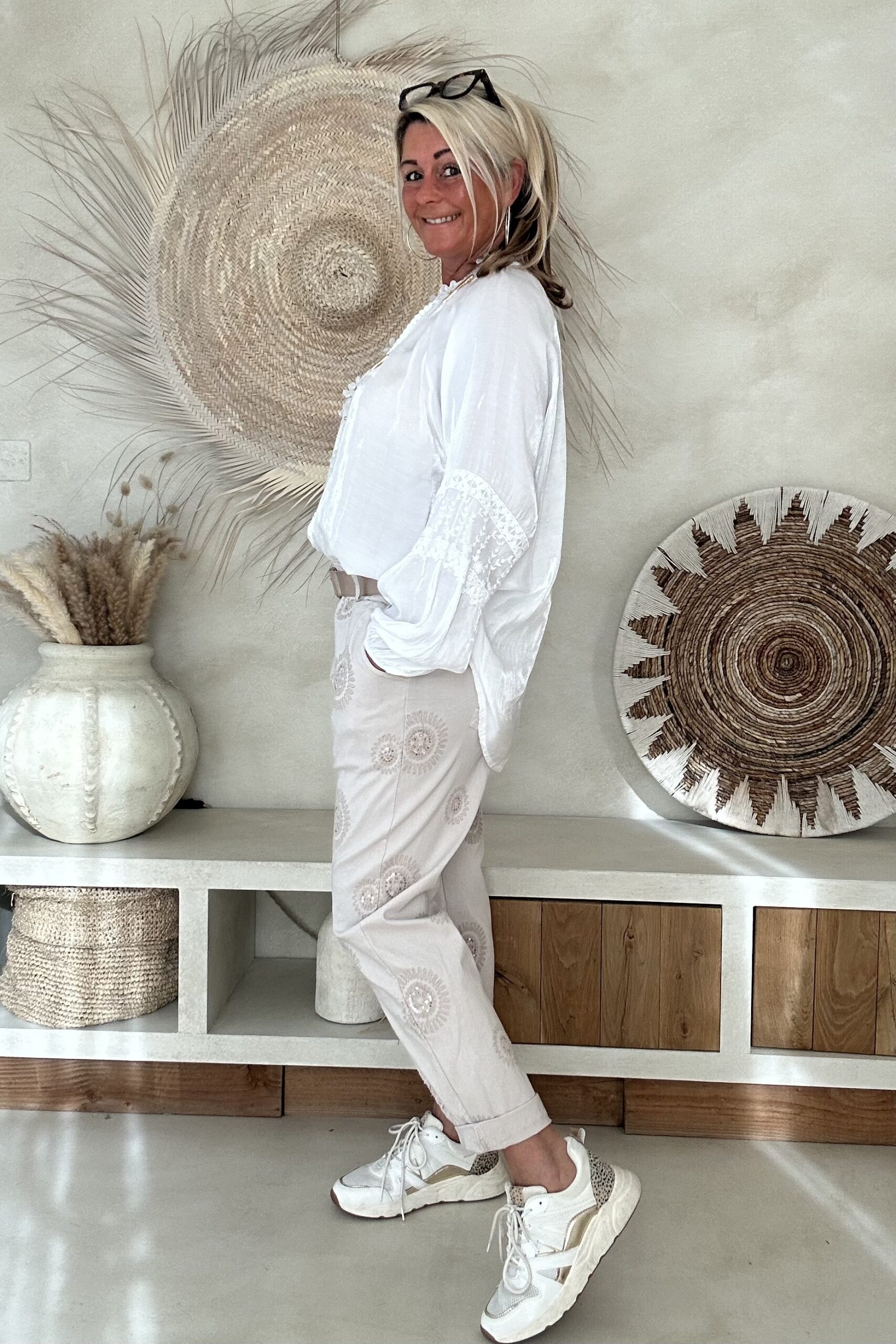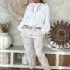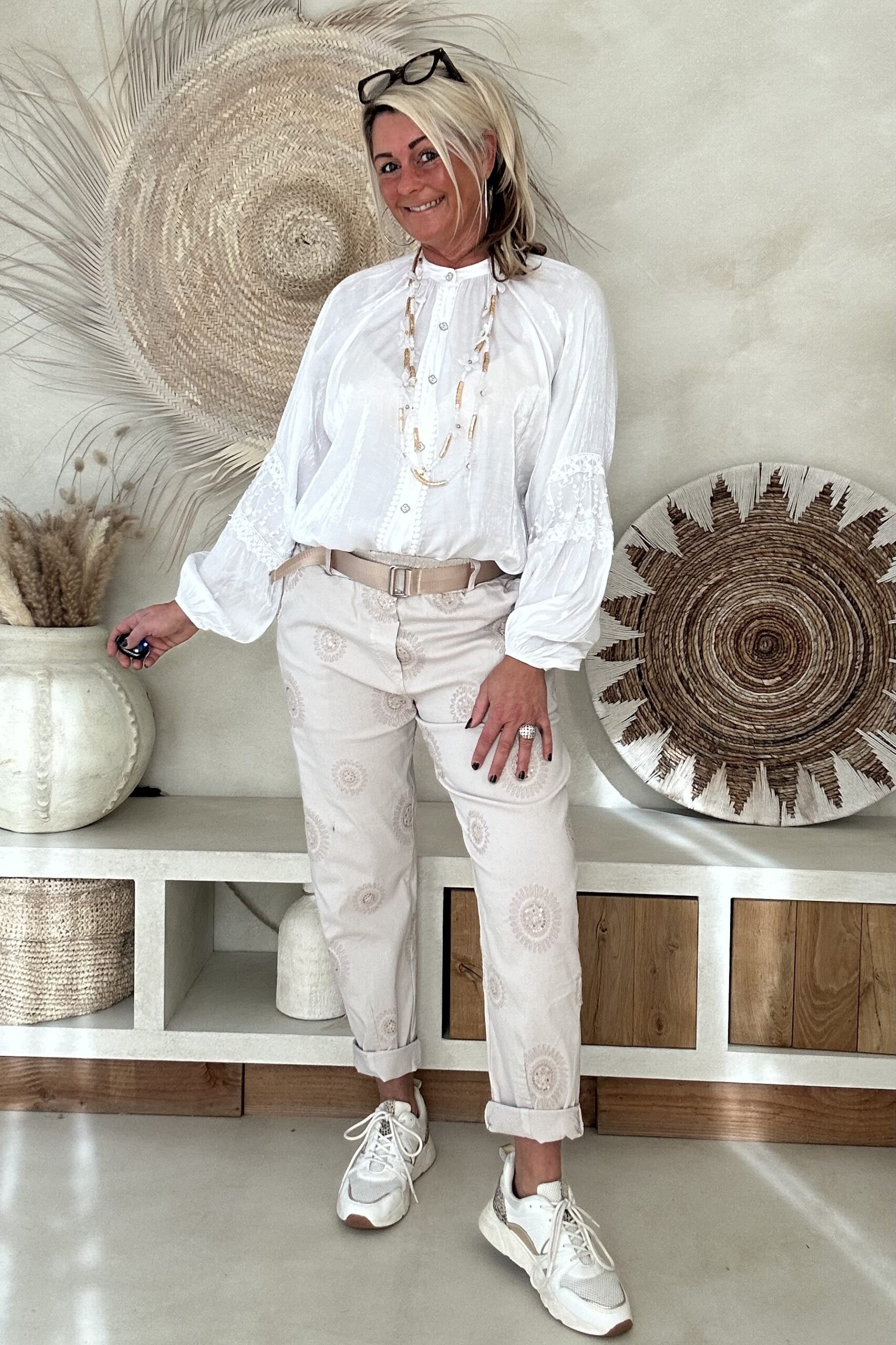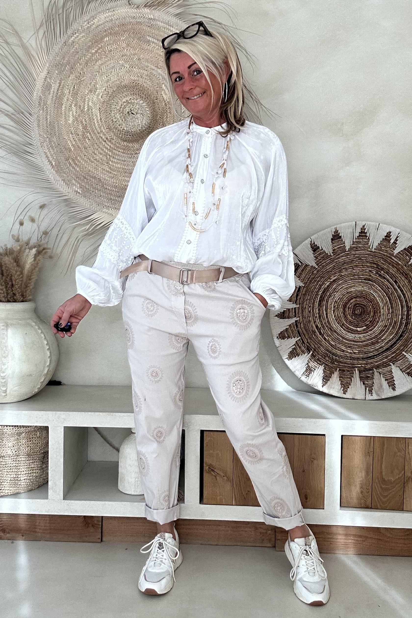 De blouse valt mooi ruim en draagt heerlijk licht, met een iets kortere voorkant waardoor hij speels te stylen is in een broek of rok. Perfect voor een vrouwelijke, bohemian look – of je hem nu casual draagt of chic combineert.