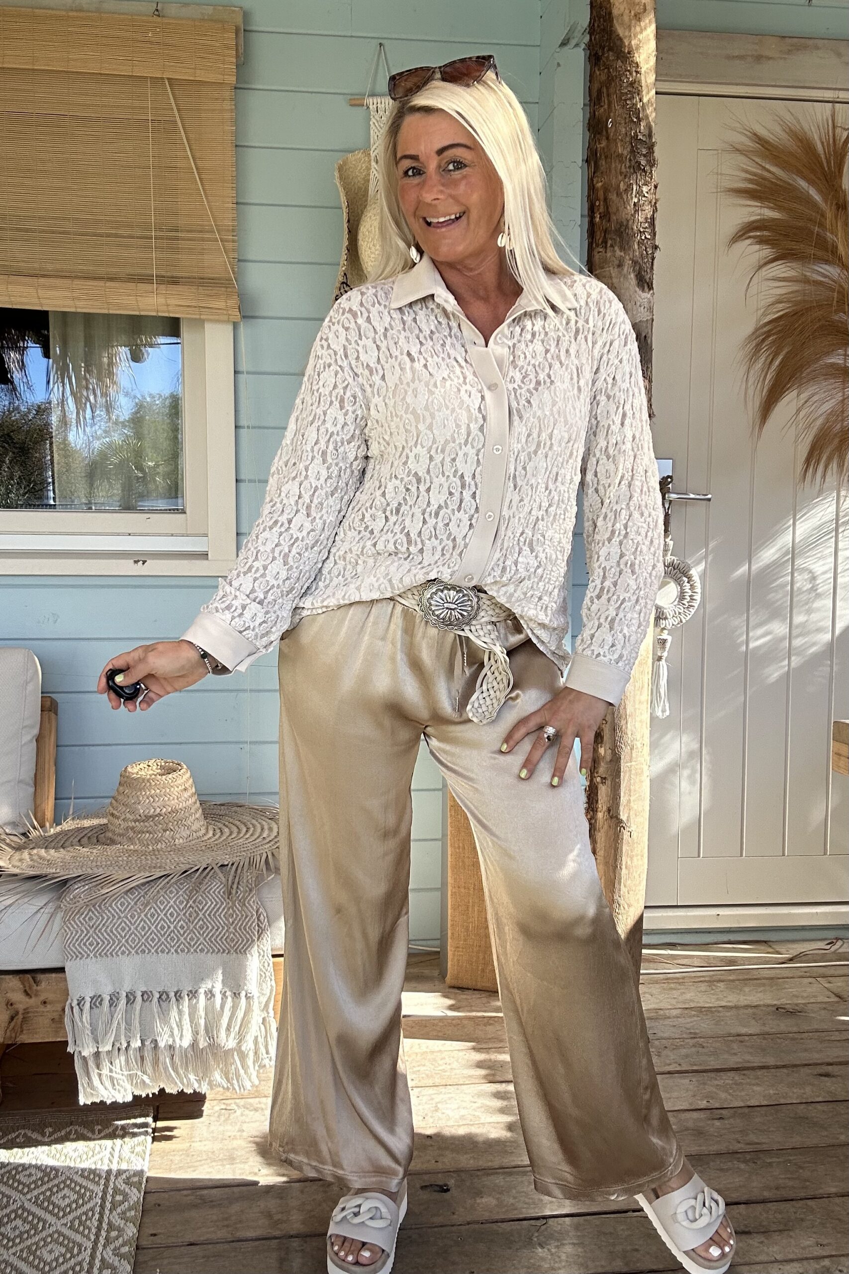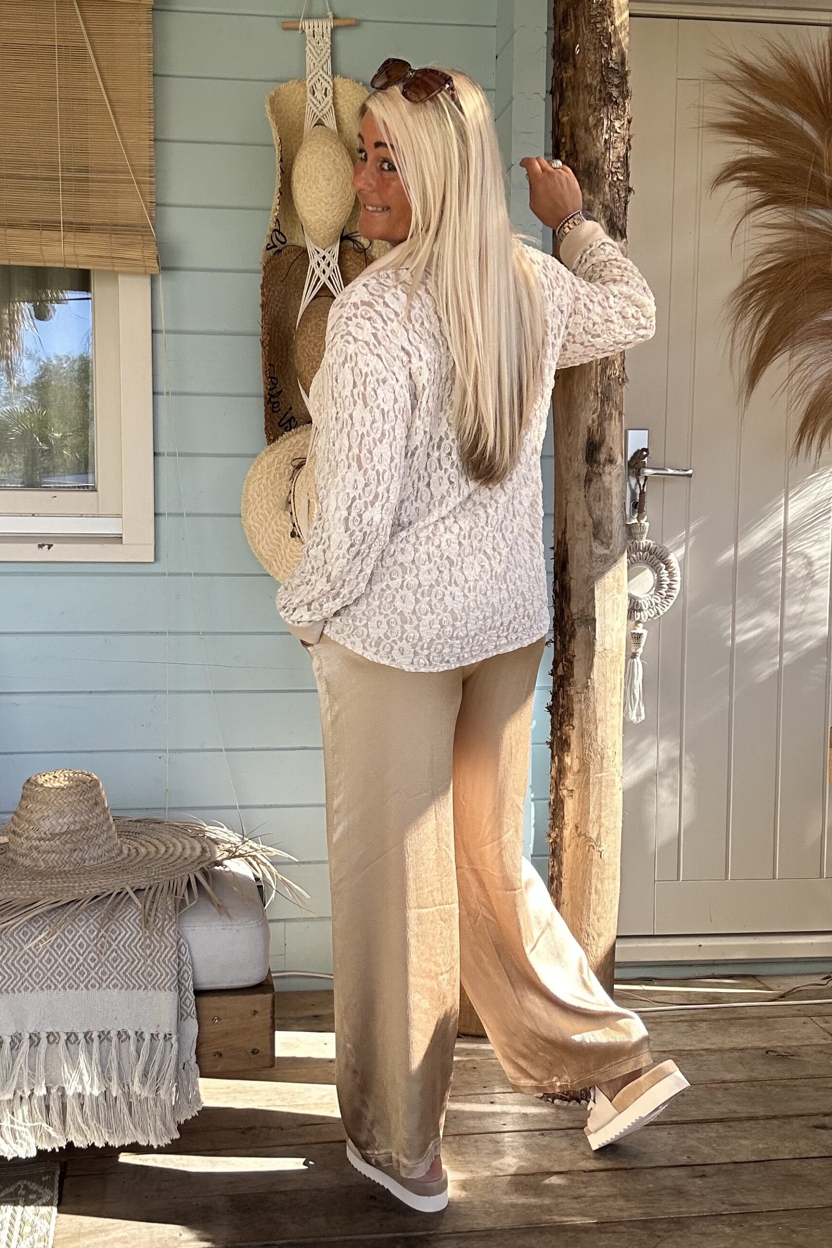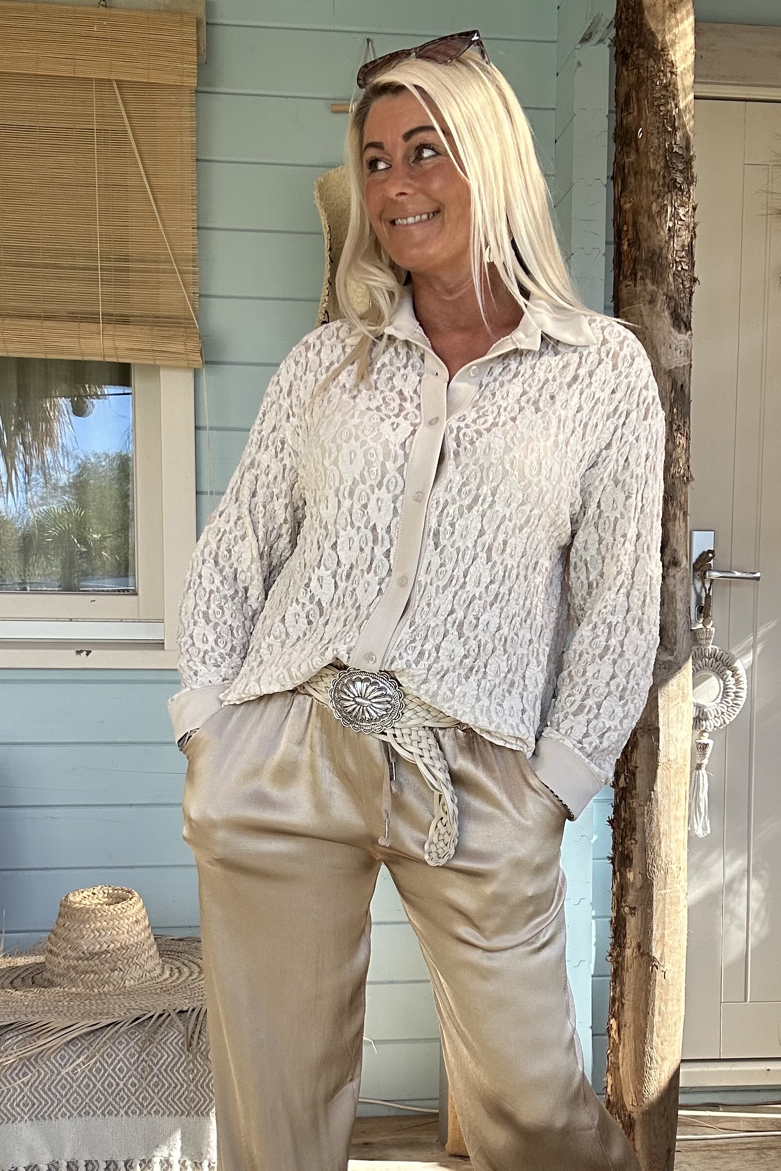 Deze luchtige kanten blouse heeft een verfijnde, licht transparante structuur die zorgt voor een elegante en vrouwelijke uitstraling. De blouse valt soepel en heeft een comfortabele pasvorm, waardoor je hem moeiteloos draagt op een rok of broek. De mouwen zijn voorzien van een handig bandje met knoopje, zodat je ze gemakkelijk kunt oprollen voor een nonchalante look. De subtiele structuur en het zachte materiaal maken dit een veelzijdig item dat zowel casual als iets gekleder te stylen is.