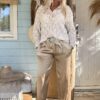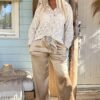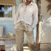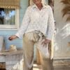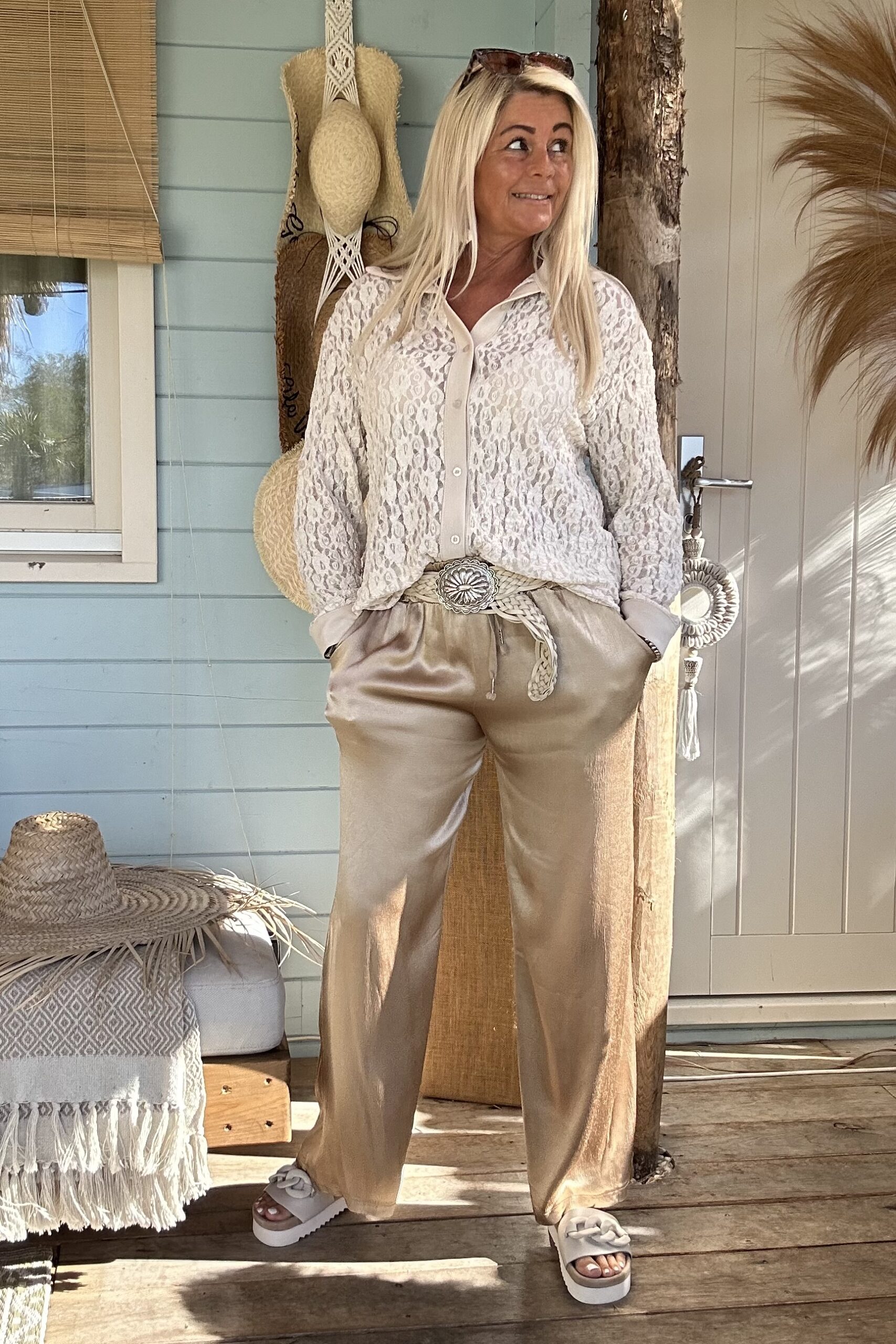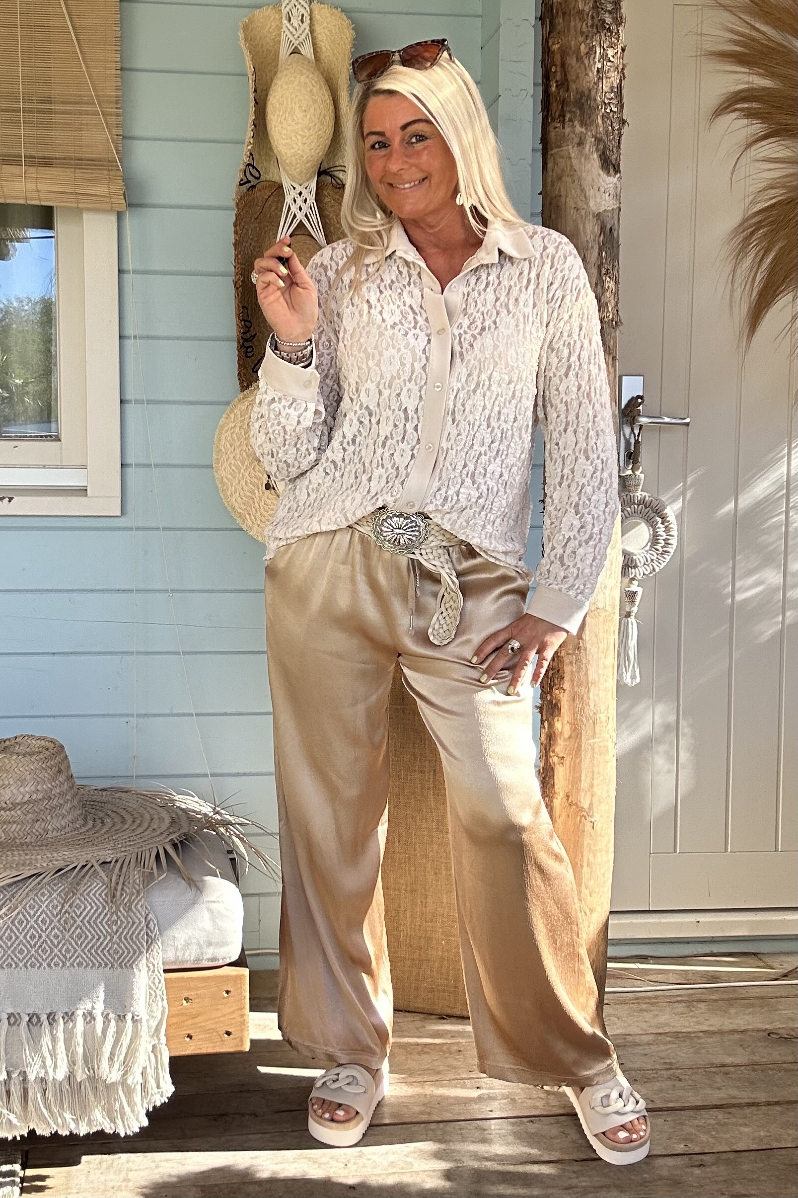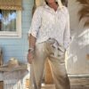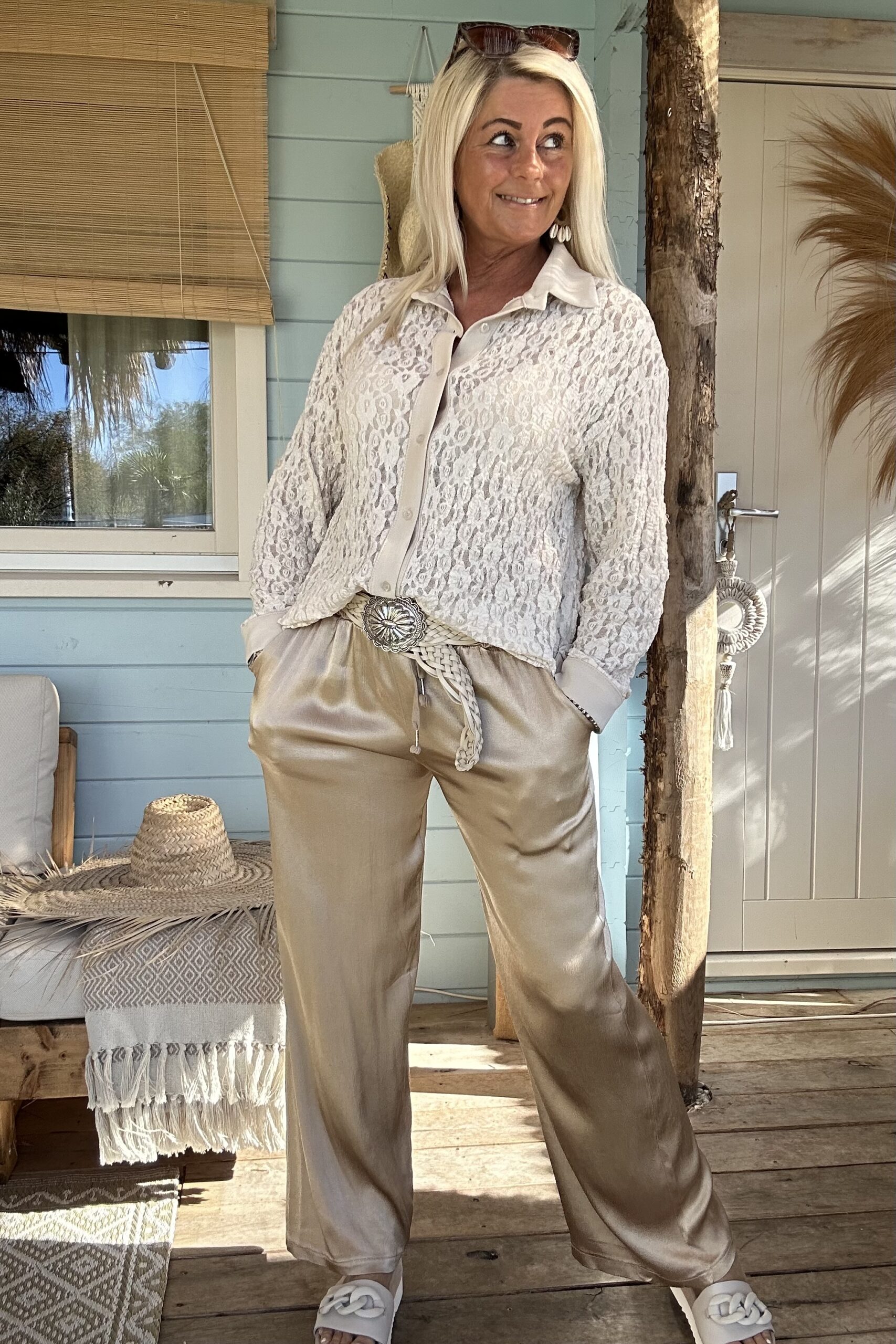 Deze luchtige kanten blouse heeft een verfijnde, licht transparante structuur die zorgt voor een elegante en vrouwelijke uitstraling. De blouse valt soepel en heeft een comfortabele pasvorm, waardoor je hem moeiteloos draagt op een rok of broek. De mouwen zijn voorzien van een handig bandje met knoopje, zodat je ze gemakkelijk kunt oprollen voor een nonchalante look. De subtiele structuur en het zachte materiaal maken dit een veelzijdig item dat zowel casual als iets gekleder te stylen is.