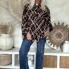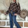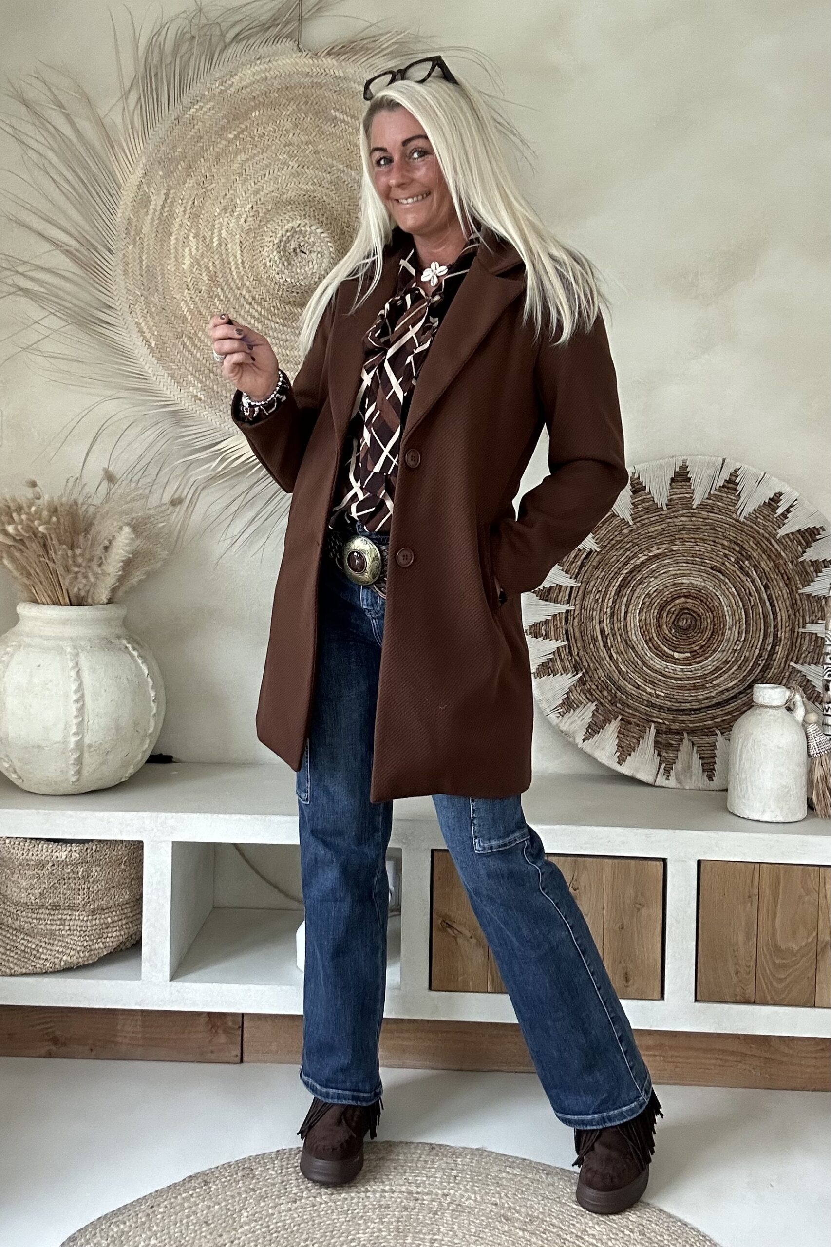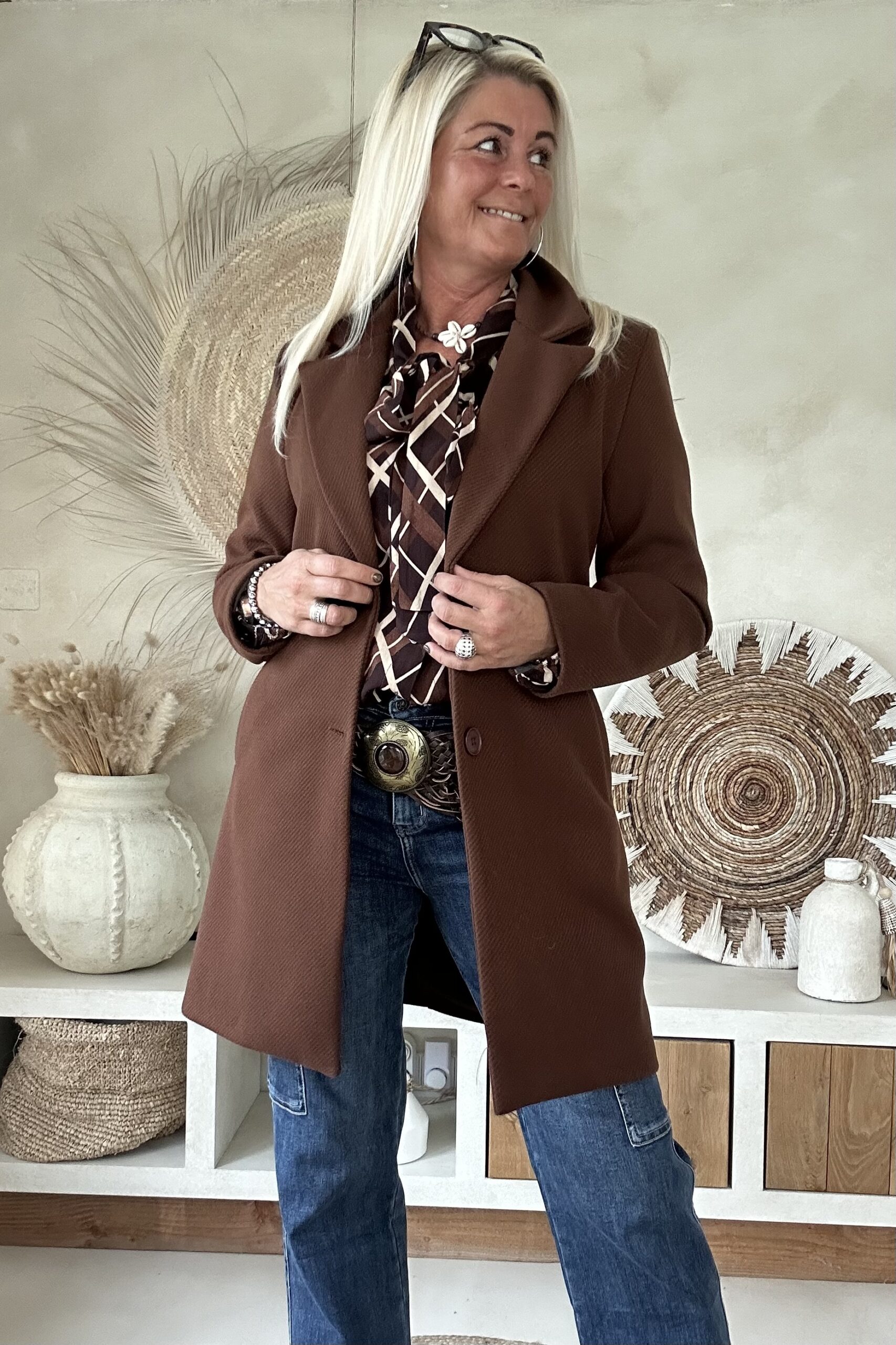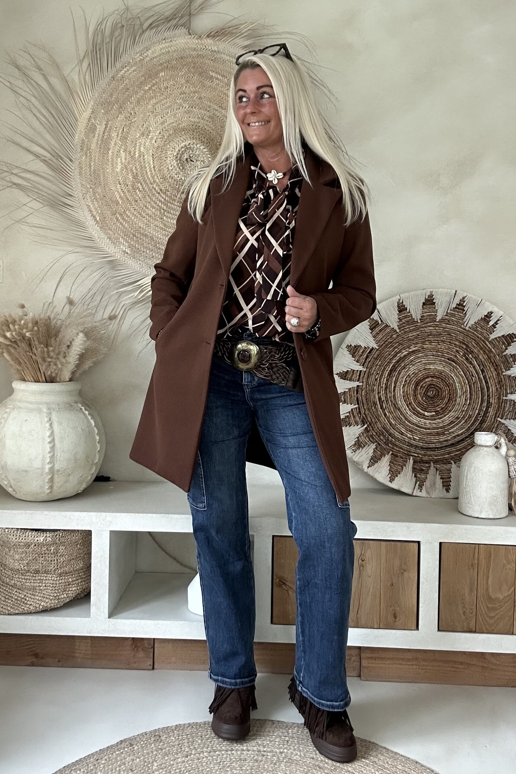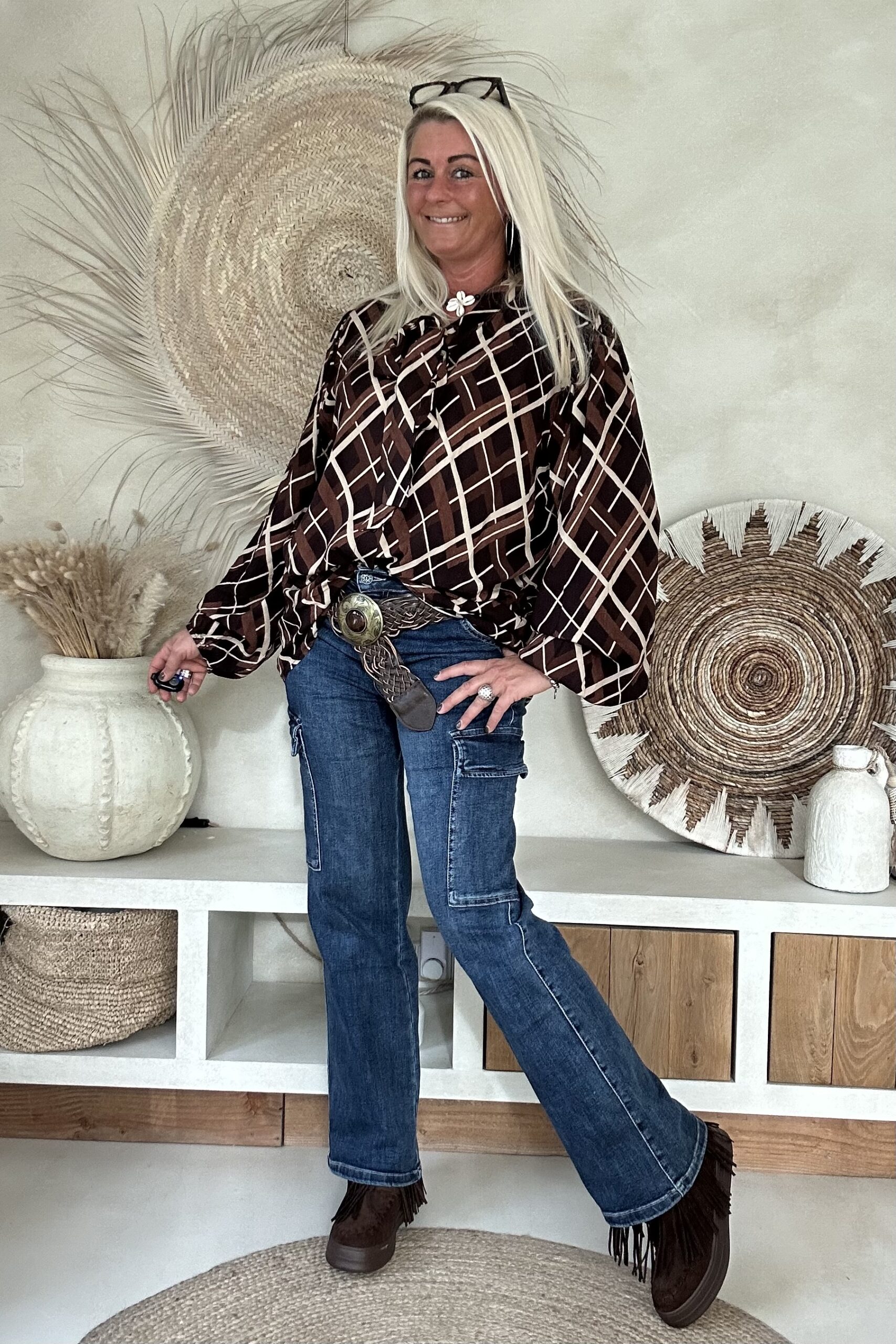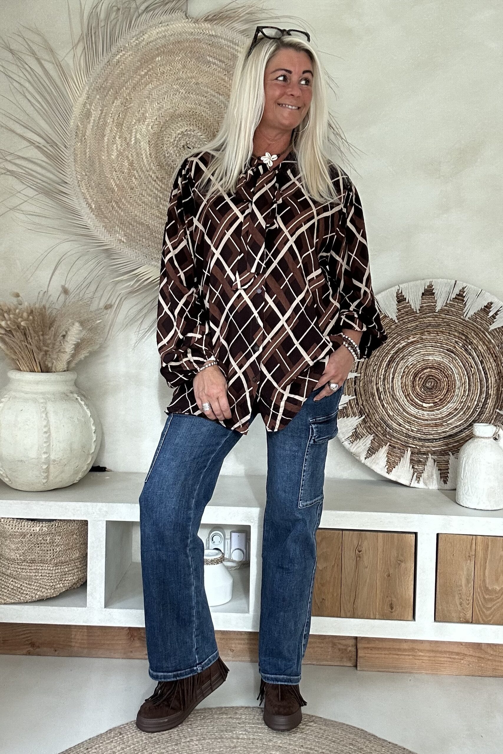 Stijlvolle lange blouse in warme cognac- en bruintinten met ruitdessin. De blouse heeft een doorknoopsluiting en een vrouwelijke strik bij de hals, wat zorgt voor een elegante uitstraling. De stof voelt soepel en comfortabel aan en valt mooi langs het lichaam. Dankzij de elastieken boorden aan de mouwen krijgt de blouse een speelse touch en blijft het draagcomfort optimaal. Een prachtige blouse die zowel casual als gekleed te combineren is.