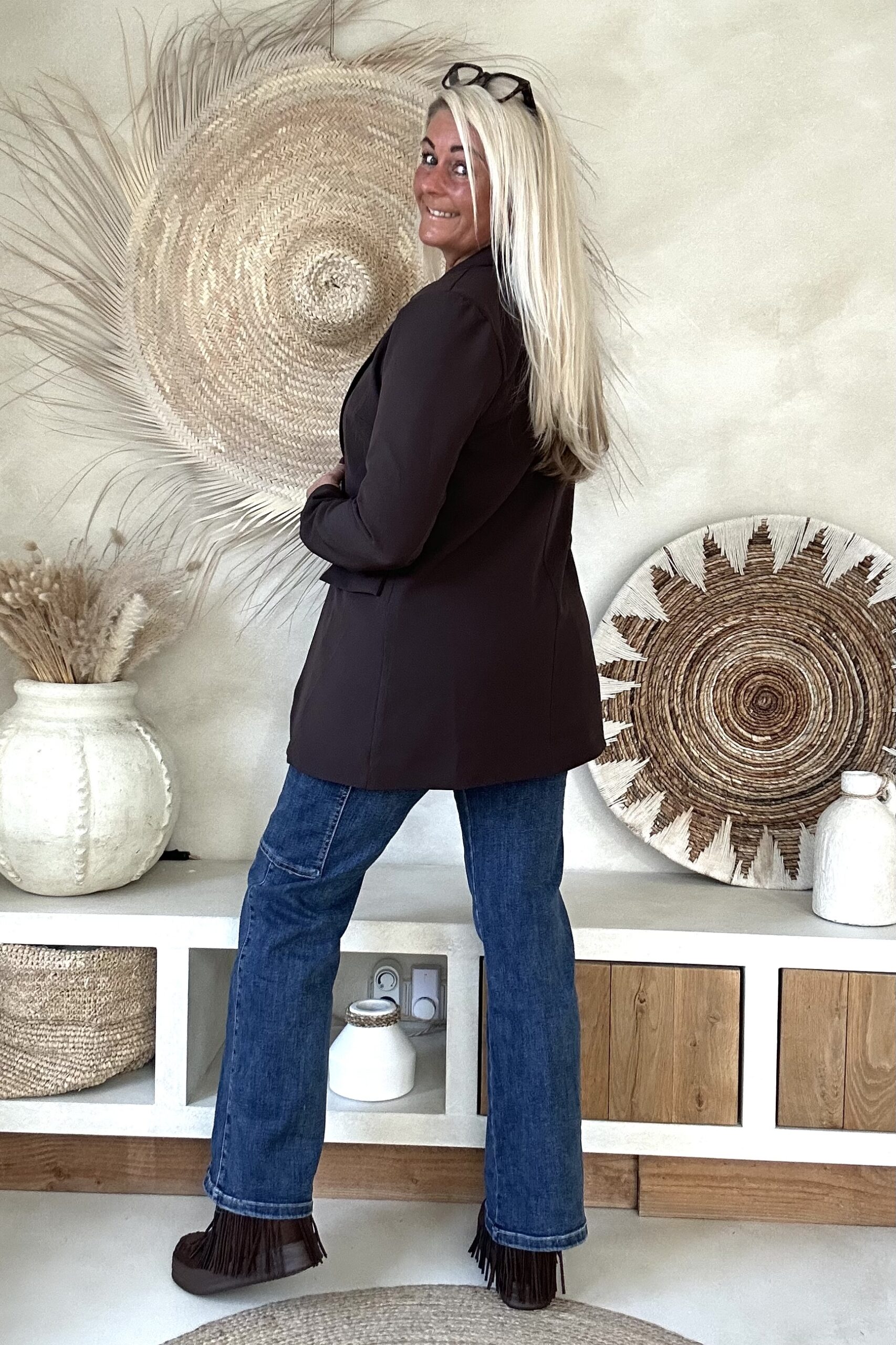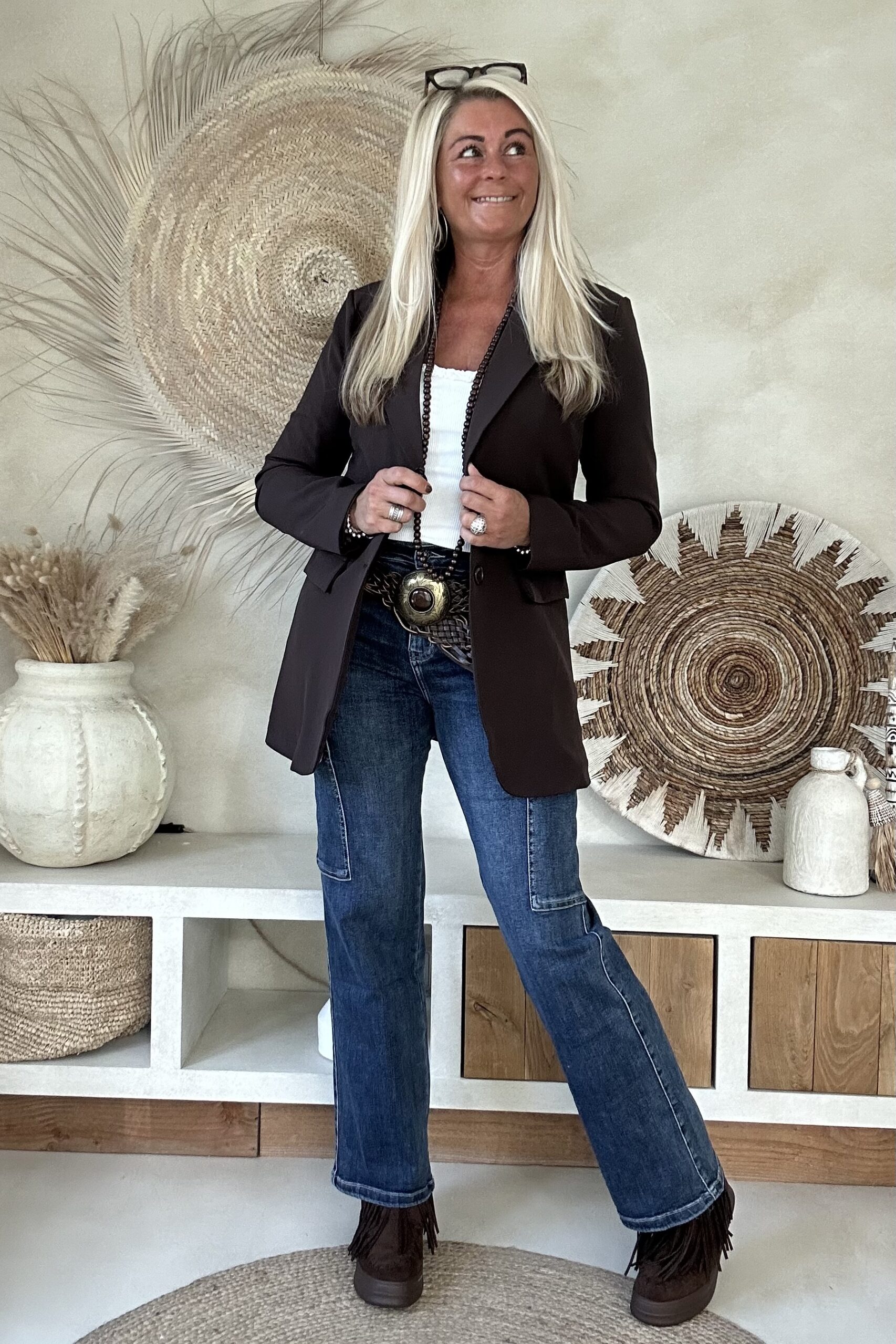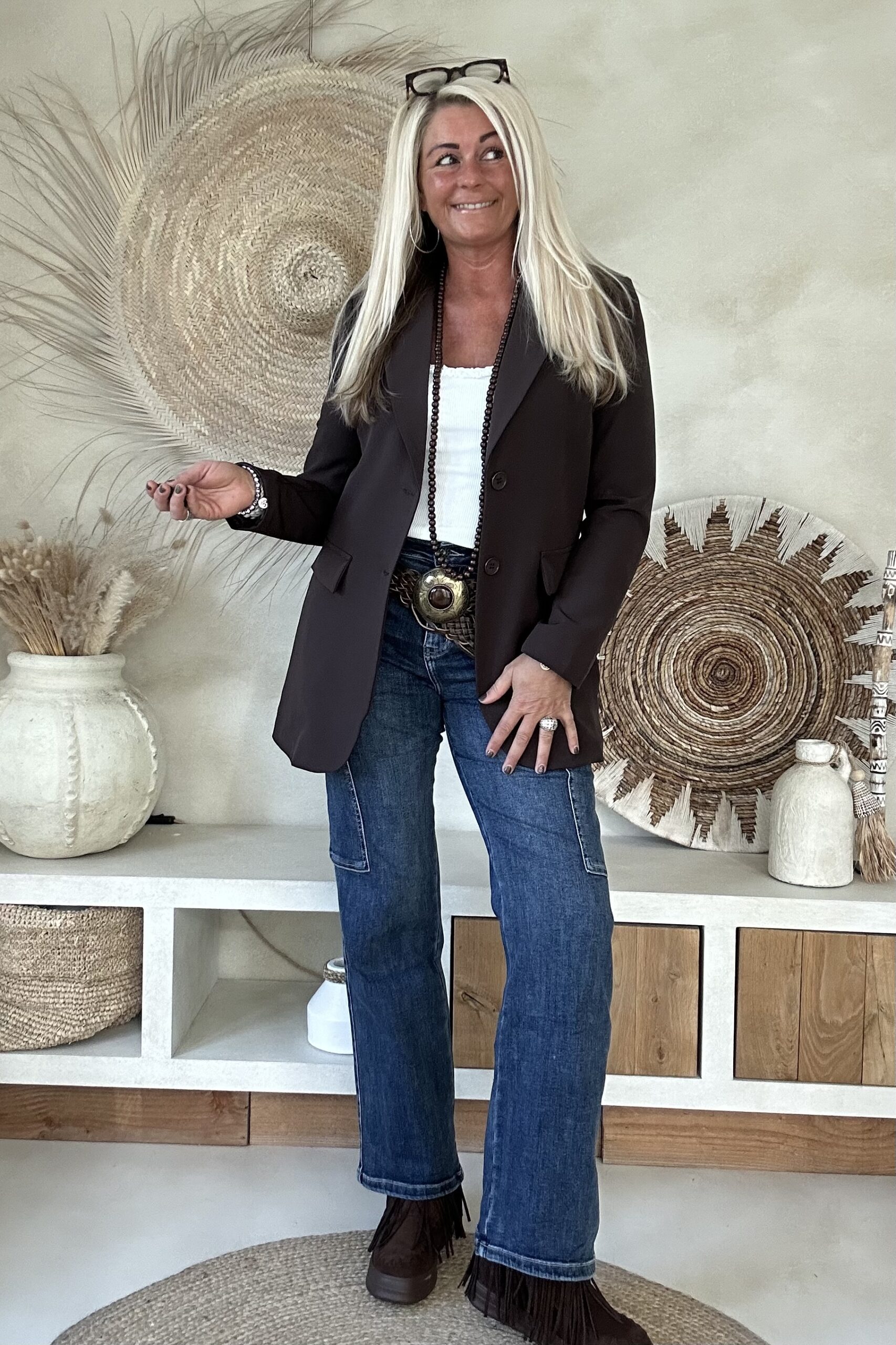 Ontdek het tijdloze en stijlvolle karakter van ons prachtige, soepel vallende licht getailleerde colbert. Met een verfijnde voering van dunne stof en elegante knopen aan de voorkant straalt dit colbert klasse uit. De veelzijdigheid komt tot uiting wanneer je het combineert met een speels t-shirt, chique blouse of een trendy topje. Voor een extra touch kun je het matchen met de bijpassende boho basic flared pantalon of creëer een ongedwongen, shabby chic uitstraling door het colbert te dragen op een comfortabele (baggy) jeans of legging. Het colbert is verkrijgbaar in de maten S, M, L, XL en XXL, het colbert valt normaal op maat. Het model draagt maat M, en heeft doorgaans maat 38 en is 1.66 m lang.