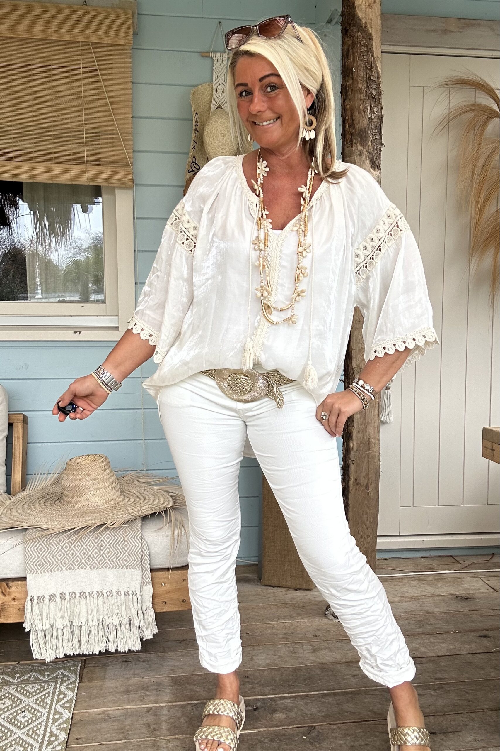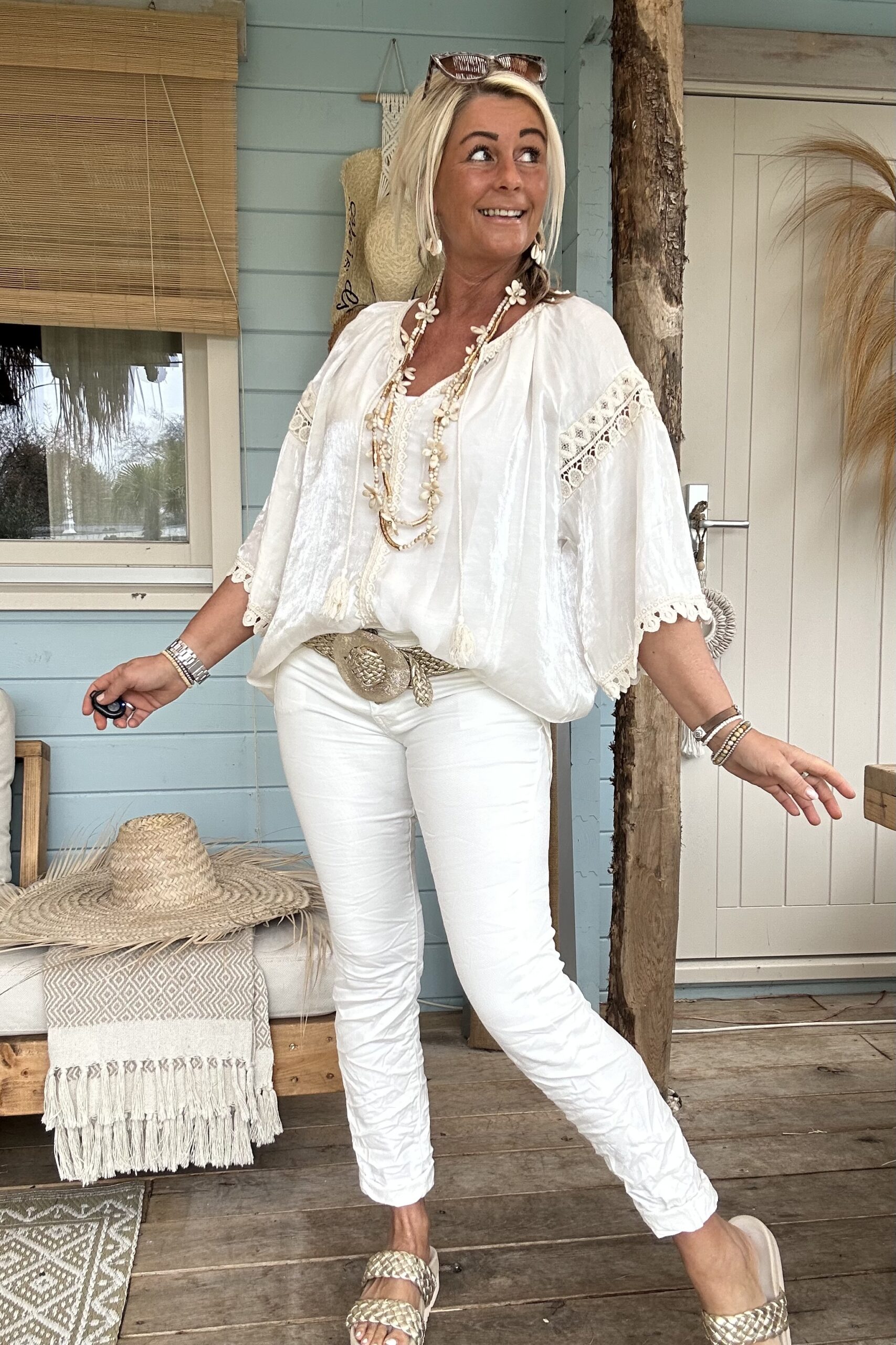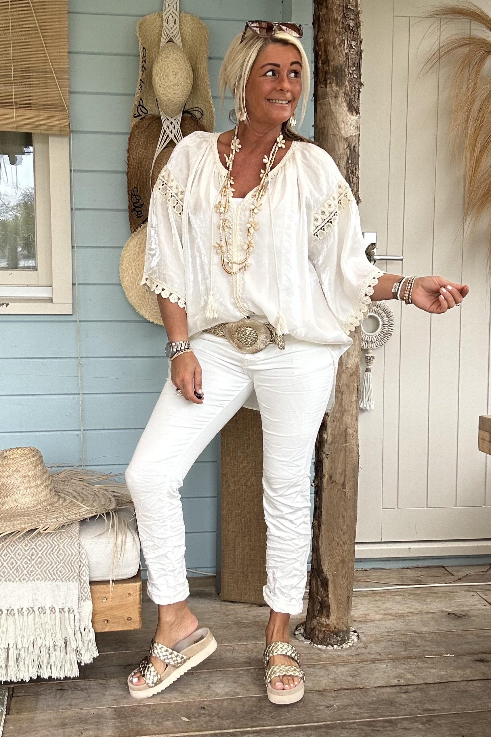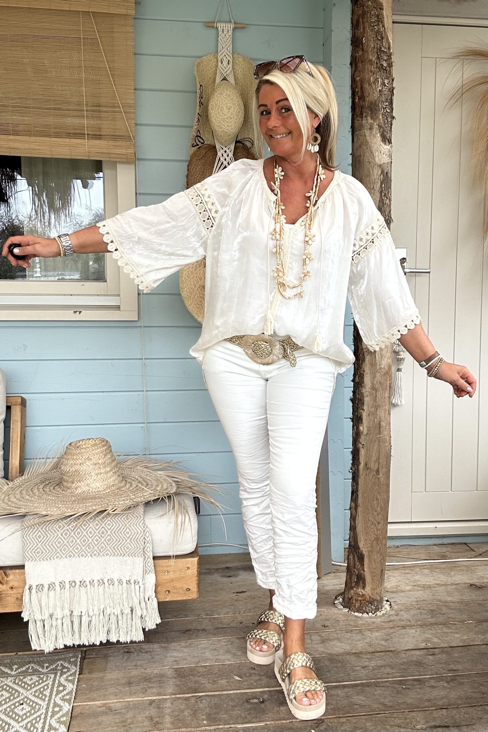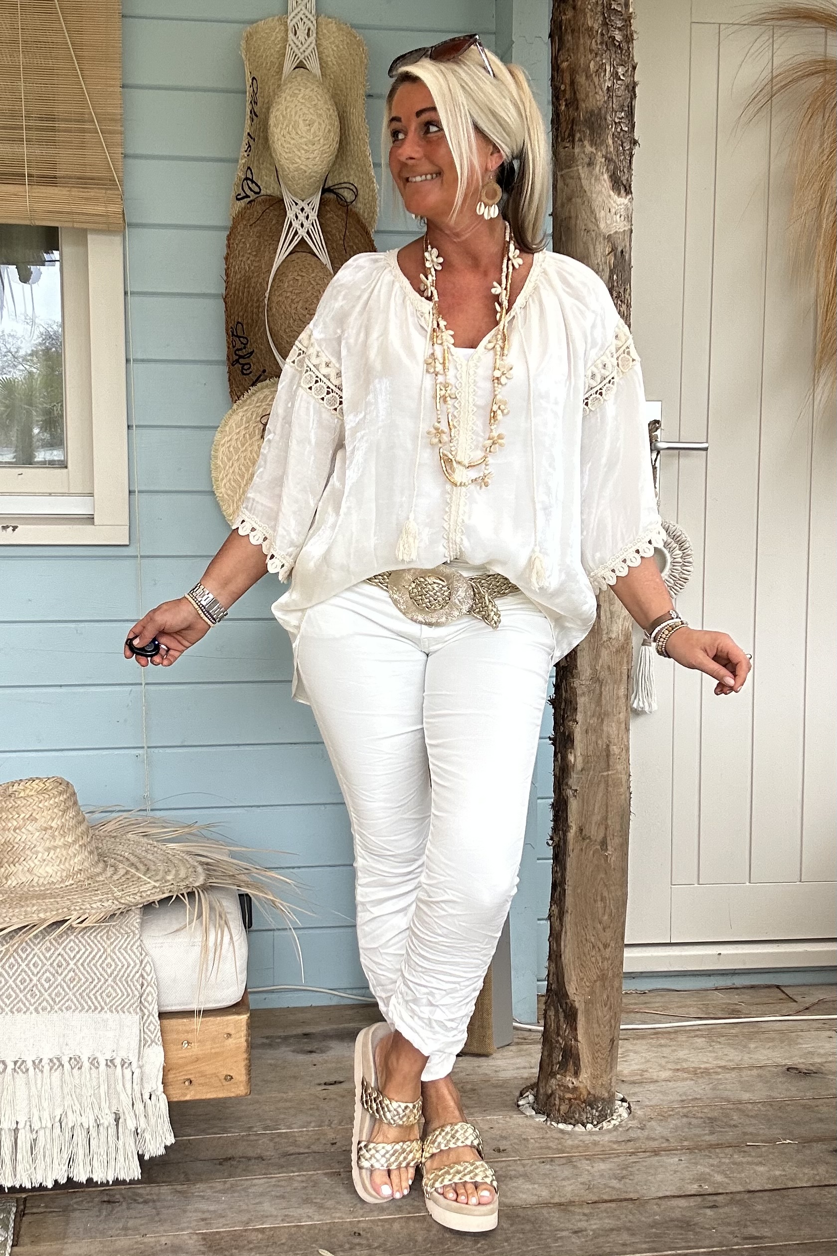 Deze prachtige tuniek blouse met satijnglans geeft jouw outfit direct een luxe en vrouwelijke uitstraling. De soepel vallende stof voelt heerlijk licht aan en heeft een subtiele glans die zorgt voor een chique touch. De blouse is afgewerkt met verfijnde kanten details langs de mouwen en halslijn, wat zorgt voor een romantische en bohemian look. Dankzij de losse pasvorm en het koordje met kwastjes draag je ‘m zowel casual als wat chiquer. De achterkant valt iets langer voor een speels en flatterend effect.