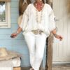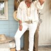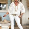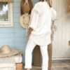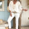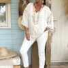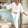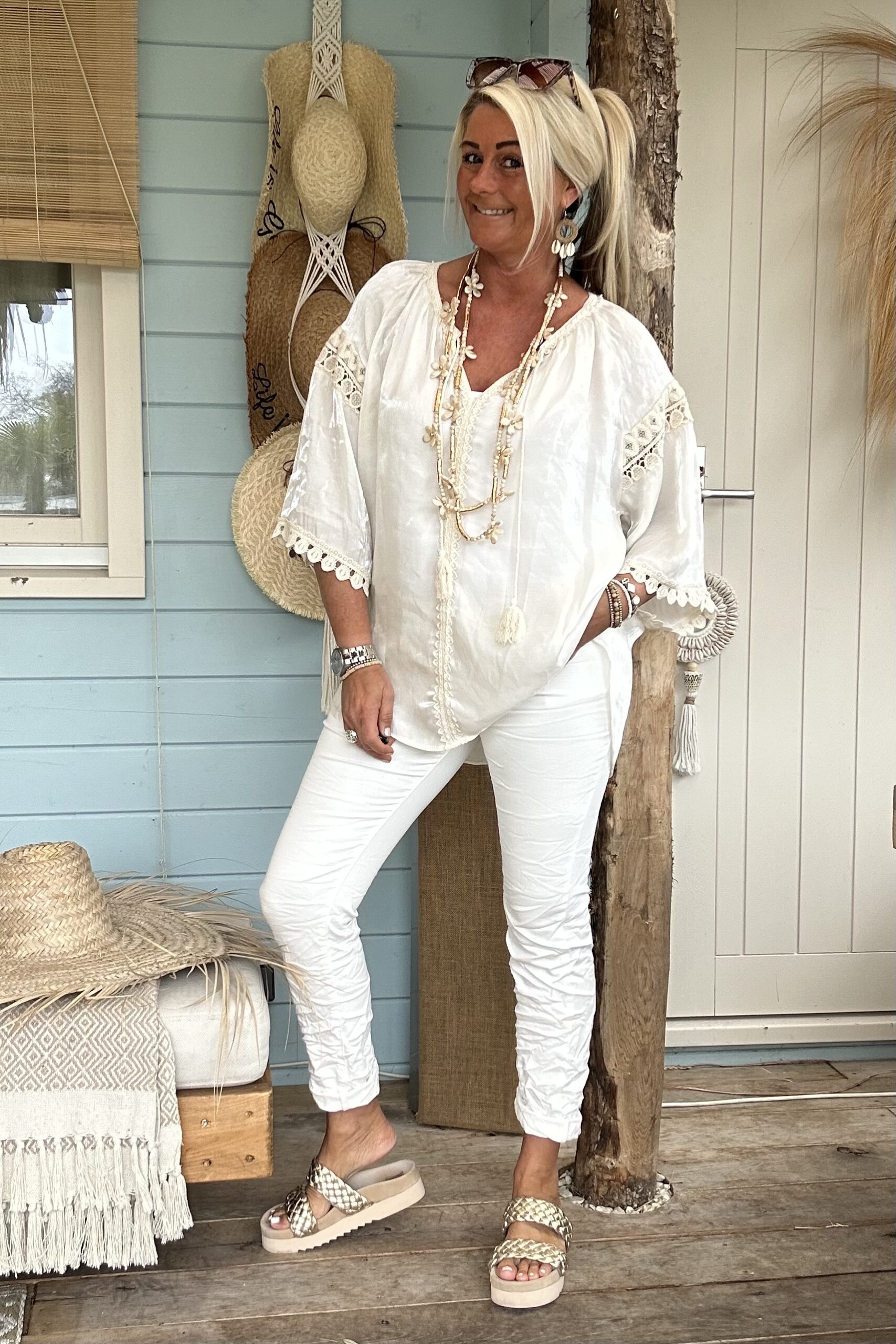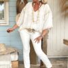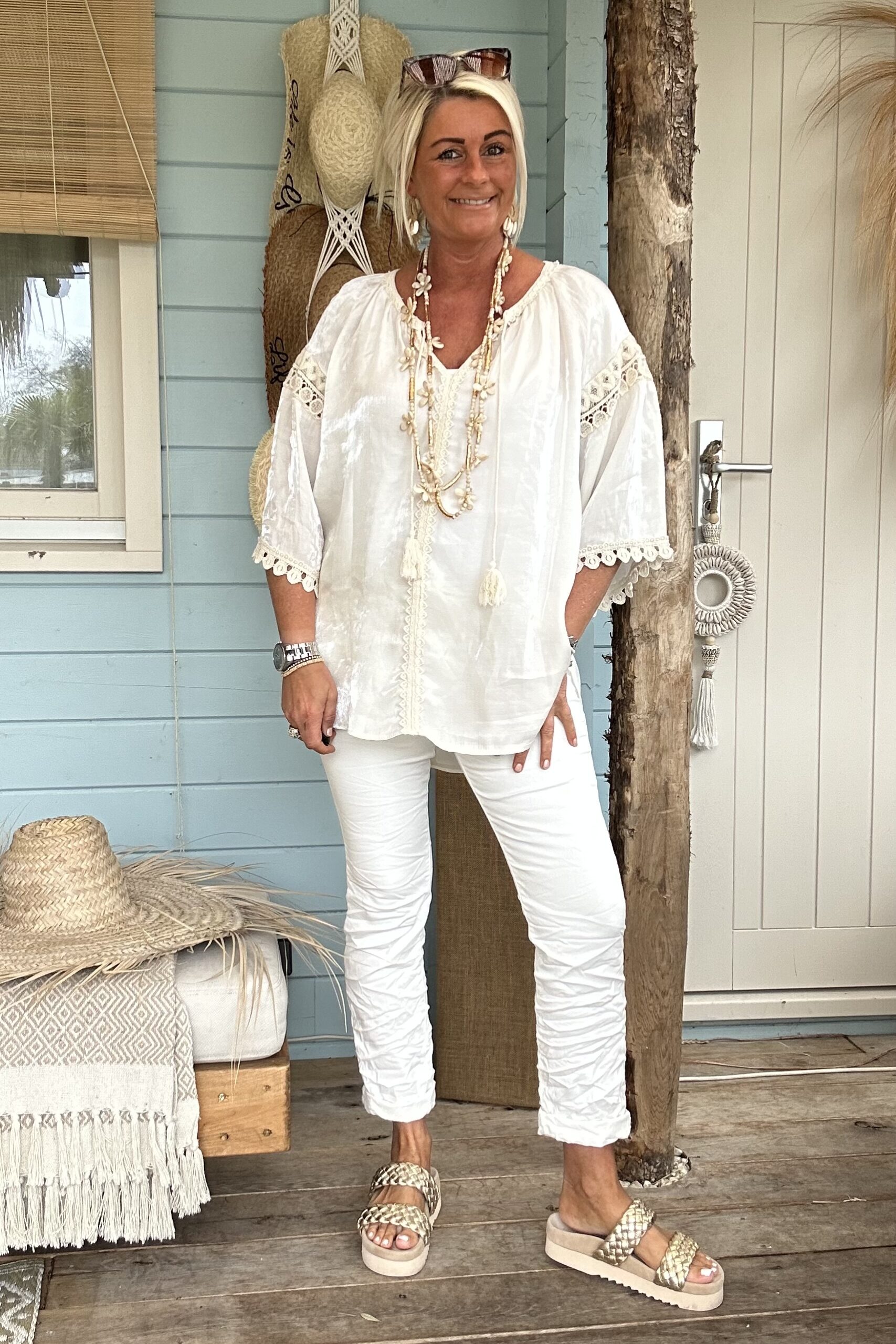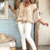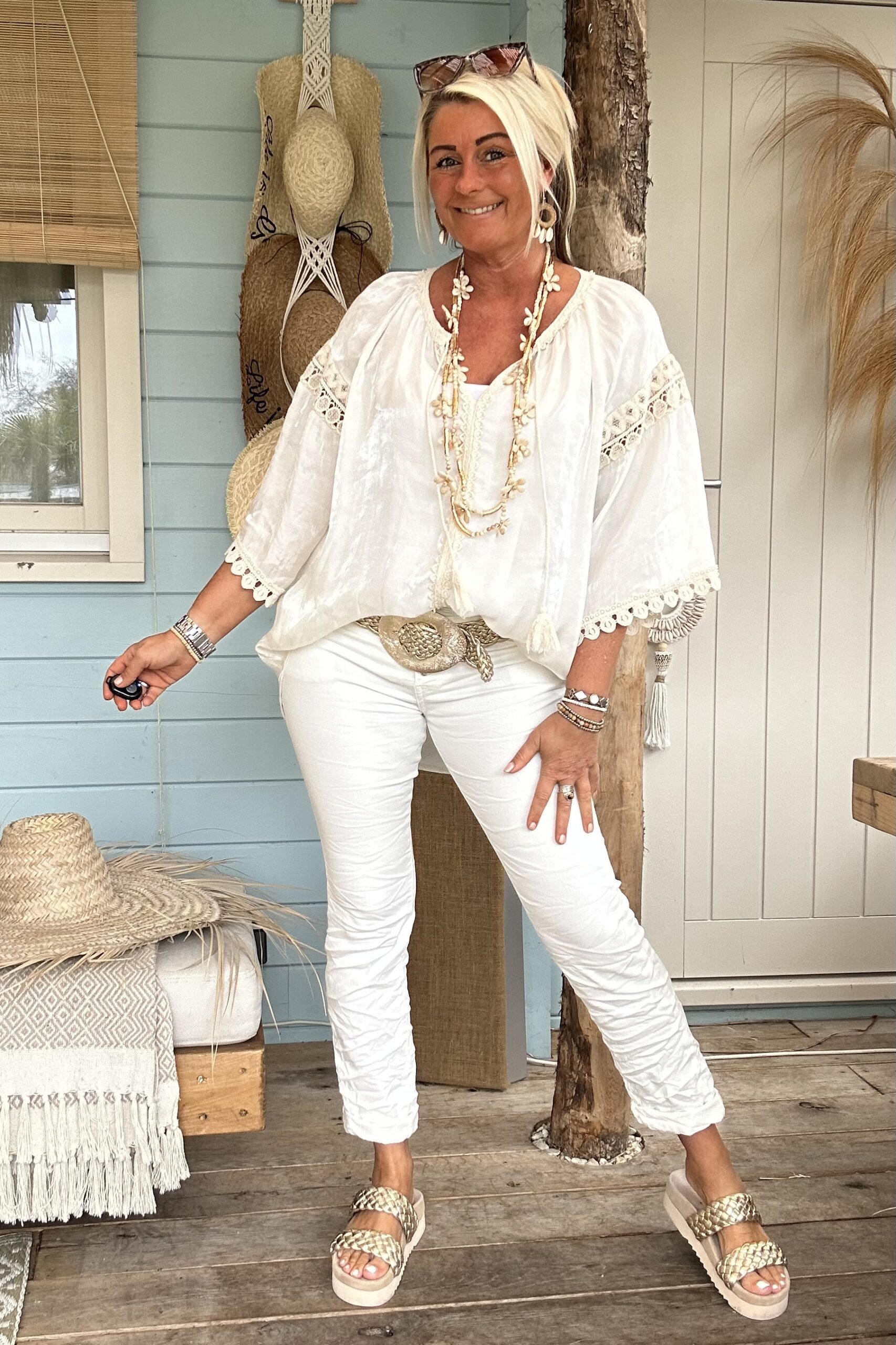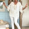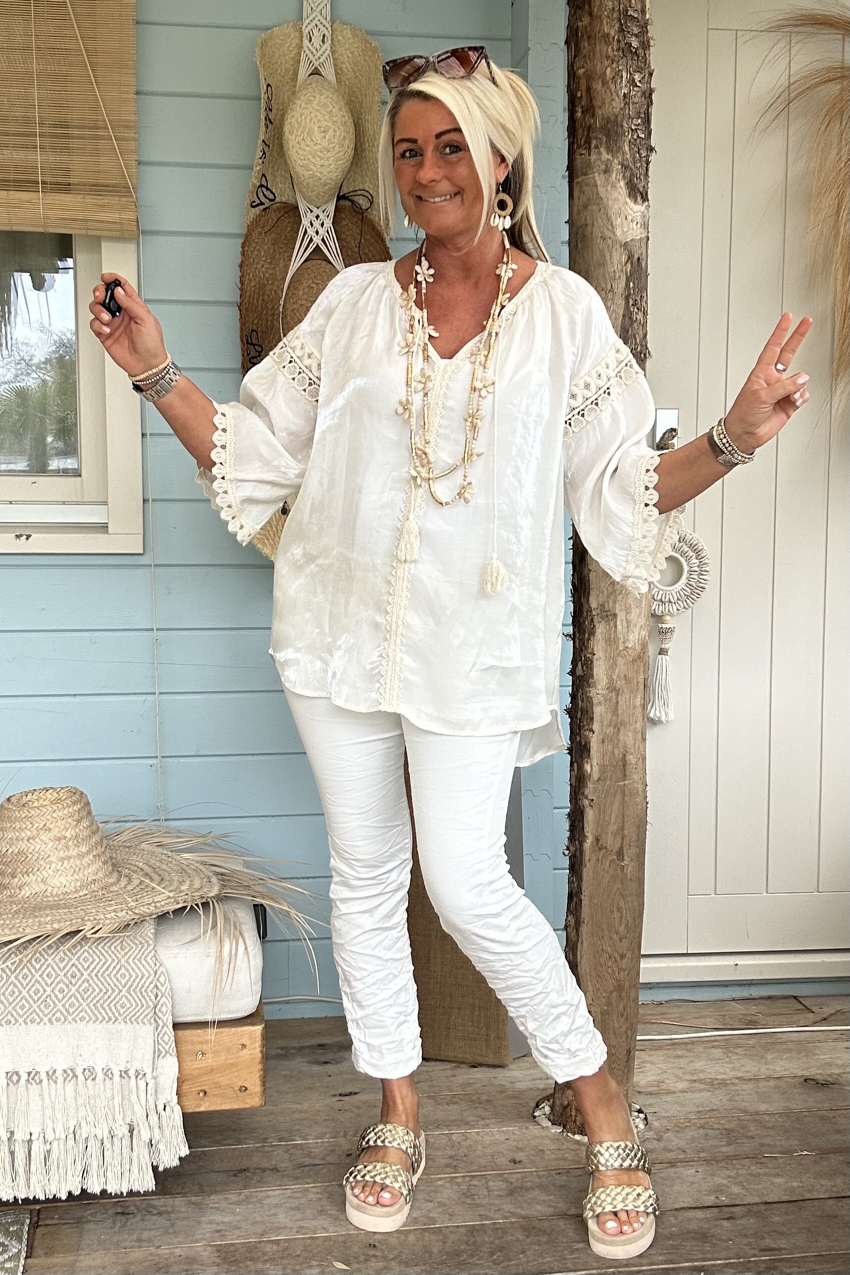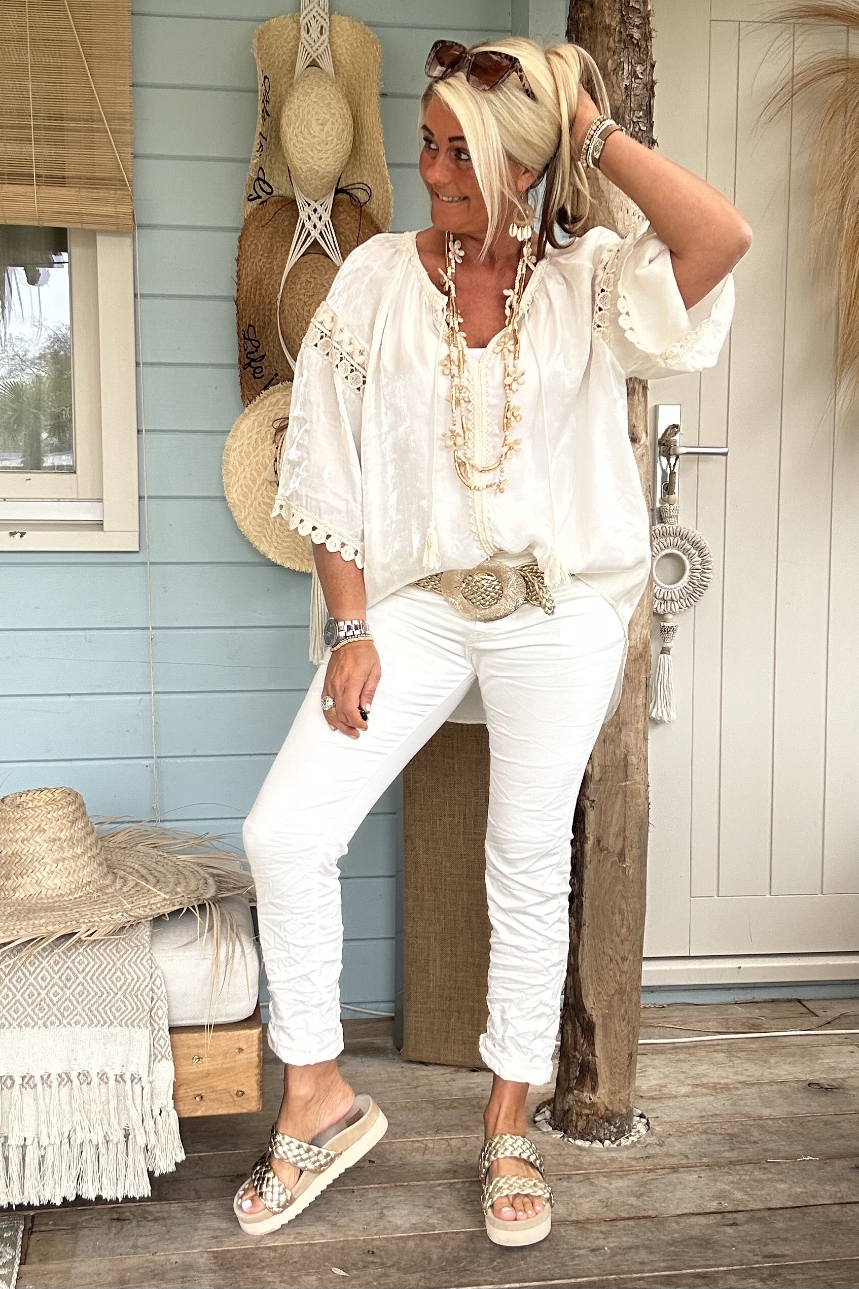 Deze prachtige tuniek blouse met satijnglans geeft jouw outfit direct een luxe en vrouwelijke uitstraling. De soepel vallende stof voelt heerlijk licht aan en heeft een subtiele glans die zorgt voor een chique touch. De blouse is afgewerkt met verfijnde kanten details langs de mouwen en halslijn, wat zorgt voor een romantische en bohemian look. Dankzij de losse pasvorm en het koordje met kwastjes draag je ‘m zowel casual als wat chiquer. De achterkant valt iets langer voor een speels en flatterend effect.
