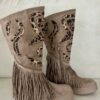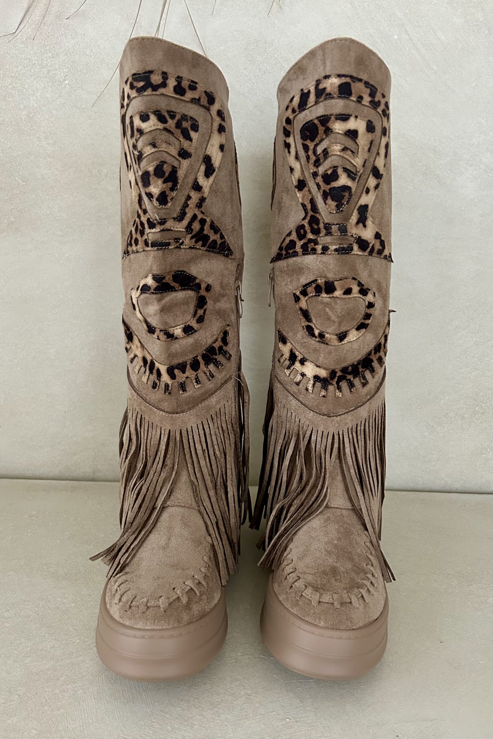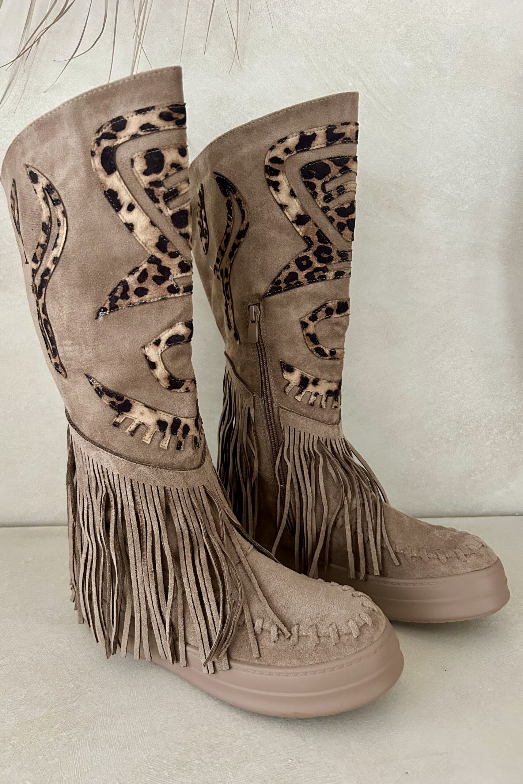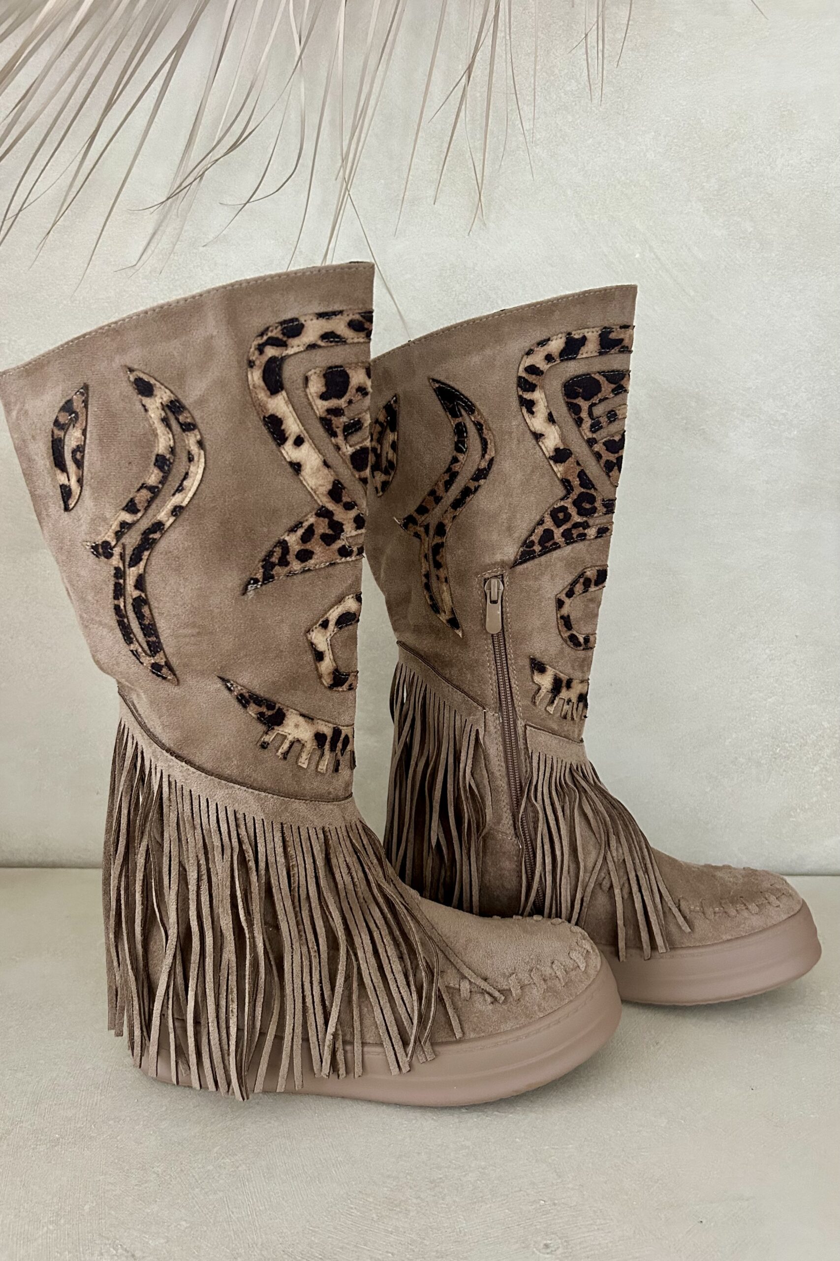 Boho Boots met Franjes & Panterdetails – Taupe Beige