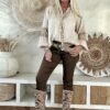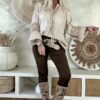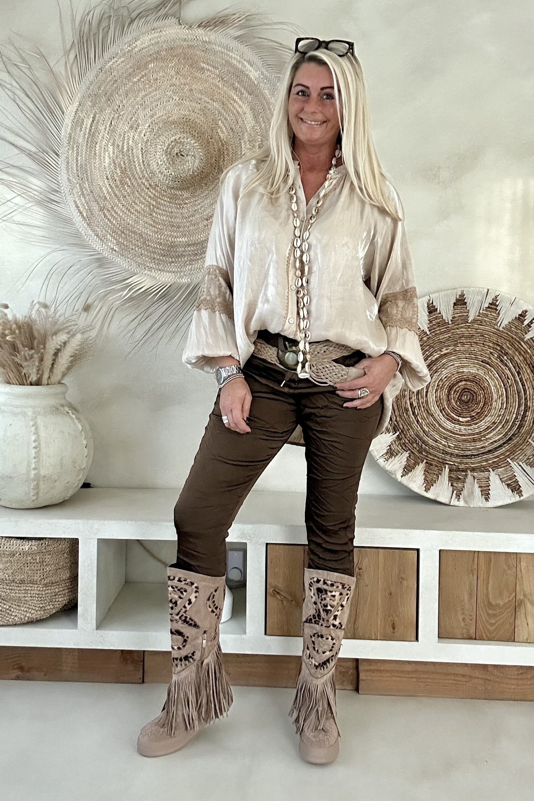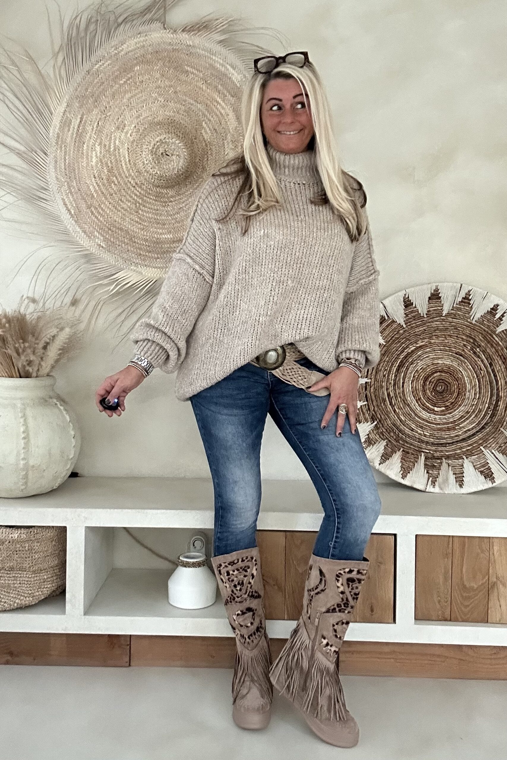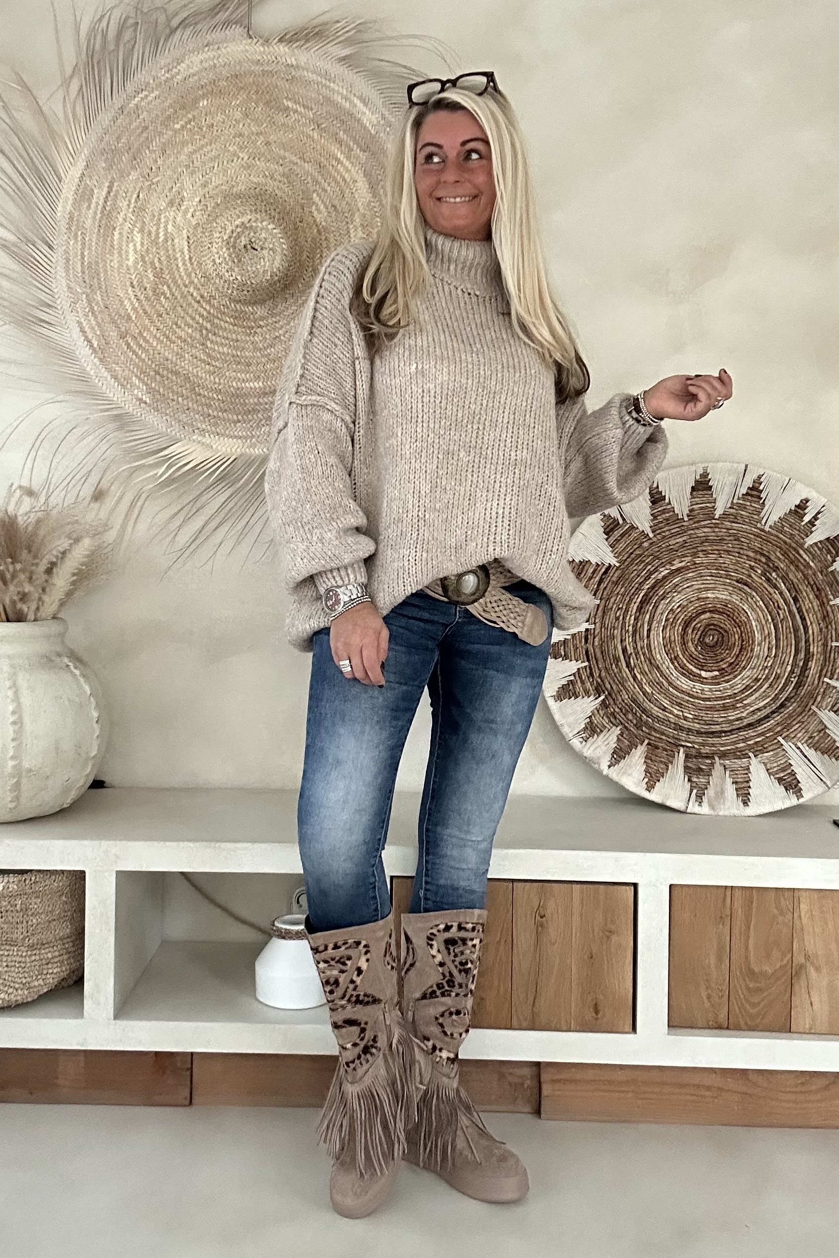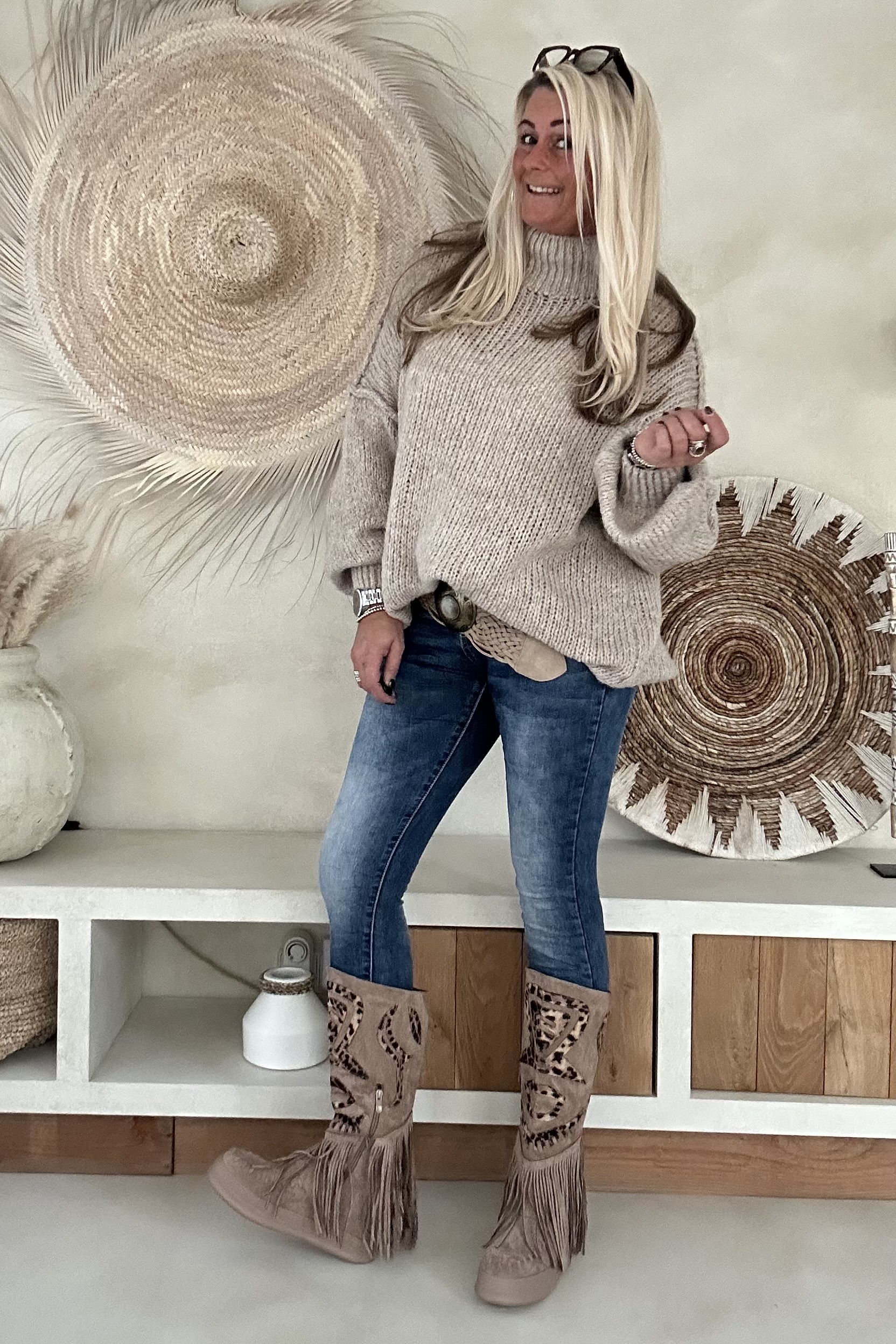 Deze toffe boho boots zijn een echte eyecatcher voor een outfit met een uitgesproken Ibiza vibe. De laarzen hebben een prachtige zachte taupe-beige tint en zijn afgewerkt met panterprint details die zorgen voor een speels en stijlvol effect. De lange franjes van suedine geven de boots die typische boho uitstraling die moeiteloos combineert met vele looks.