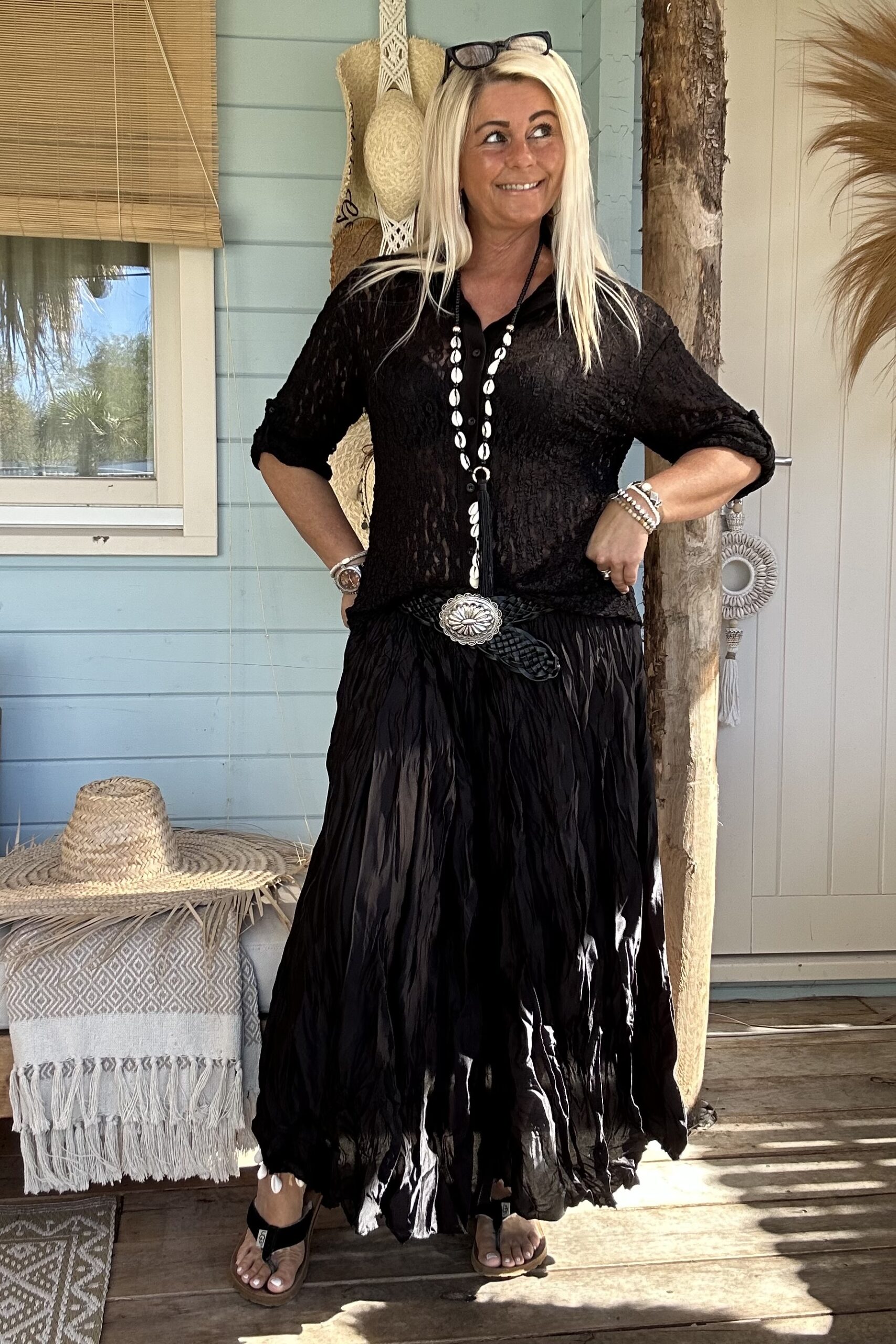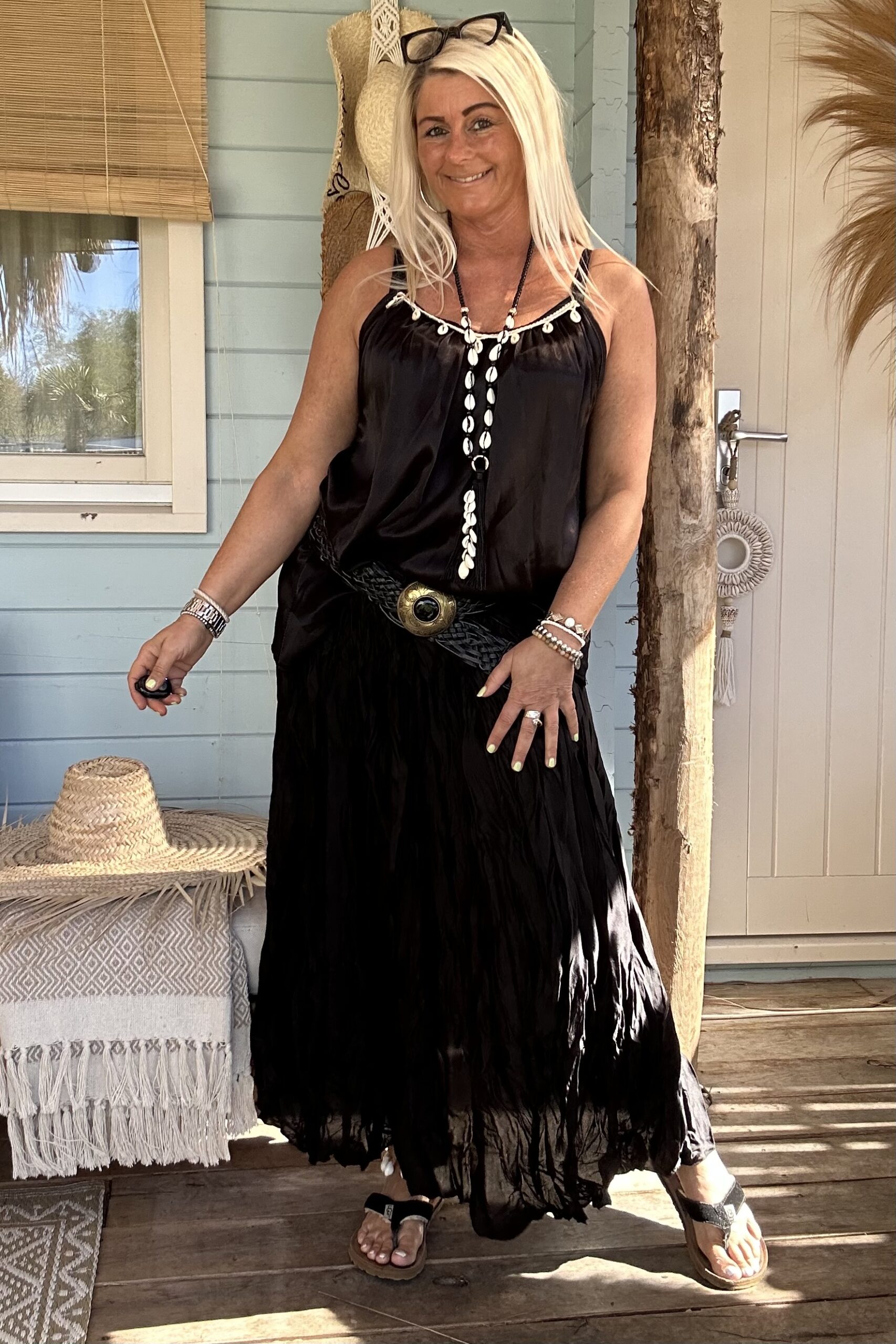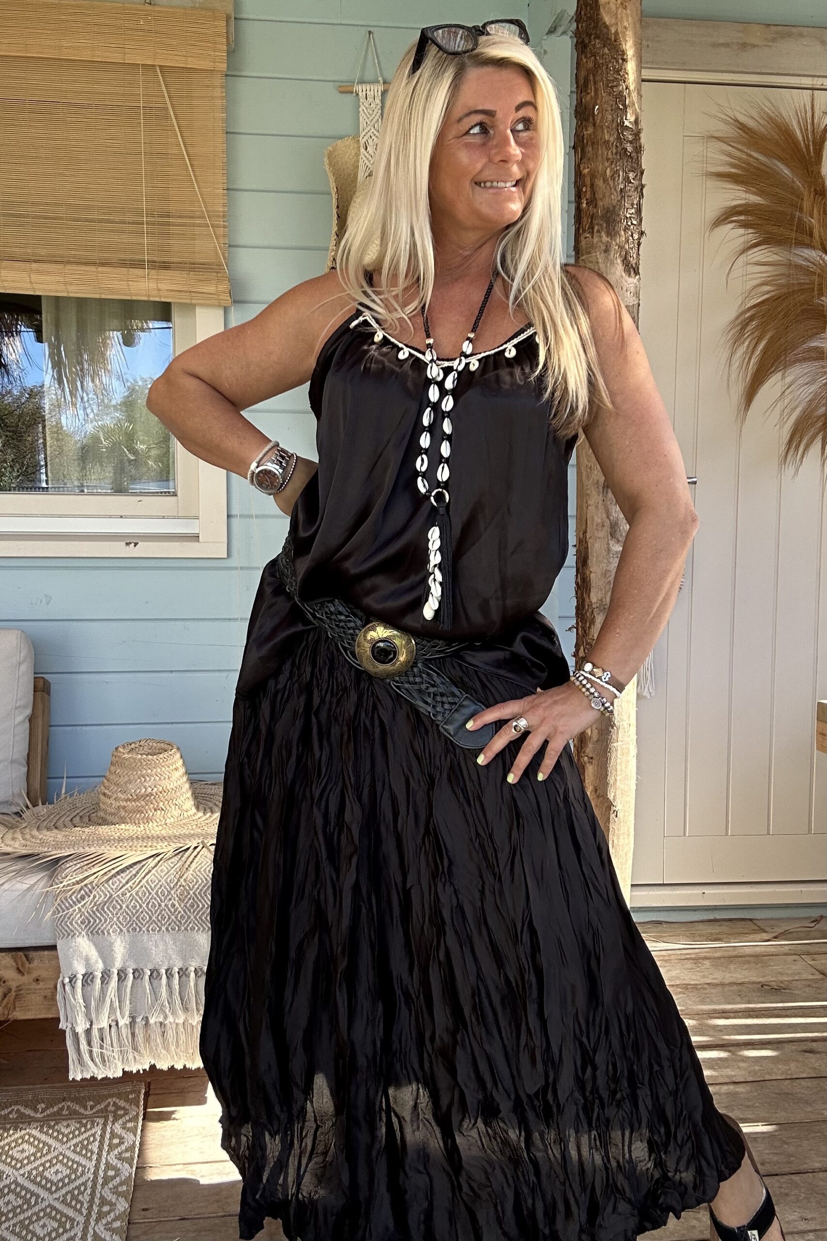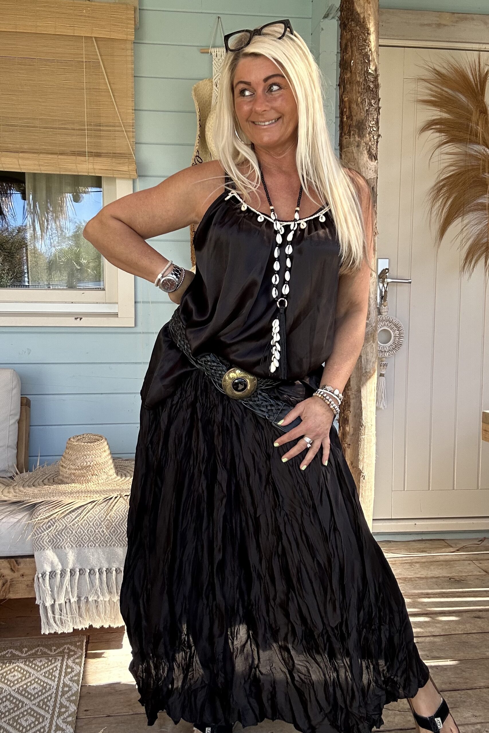 Laat je speelse kant zien met onze frivole satijnlook boho rok, voorzien van eigentijdse wrinkles/ kreukels voor een trendy twist. Deze rok is een ode aan vrouwelijkheid en vrijheid, en past perfect in elke moderne garderobe. Combineer het moeiteloos met een eenvoudige basic trui of een luchtige blouse voor een verfijnde look. Geef er een stoere draai aan met trendy boots en voeg een vleugje warmte toe met een grof gebreid vest. Met een one-size-pasvorm, geschikt voor maat 36 tot en met een kleine maat 44, biedt deze boho rok een universele charme voor elke vrouw die durft te stralen in haar eigen stijl. model draagt normaal maat 38 en is 1.66 m lang.