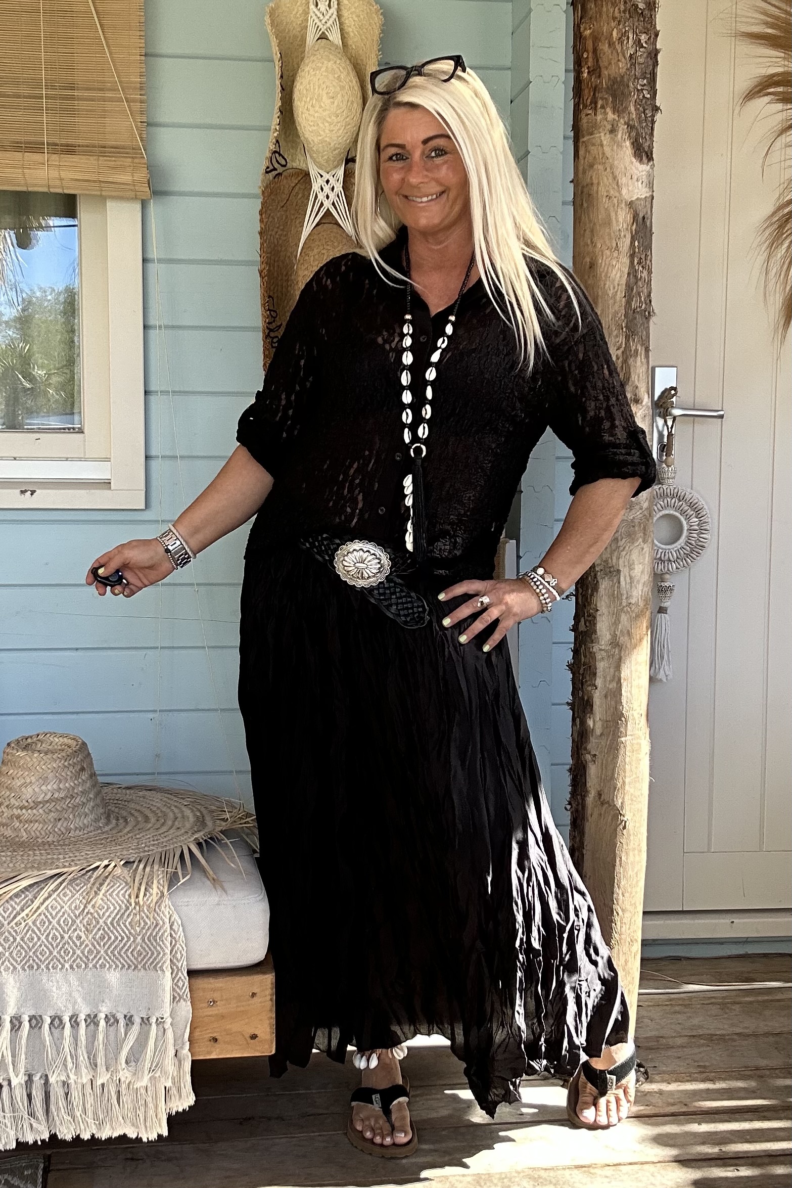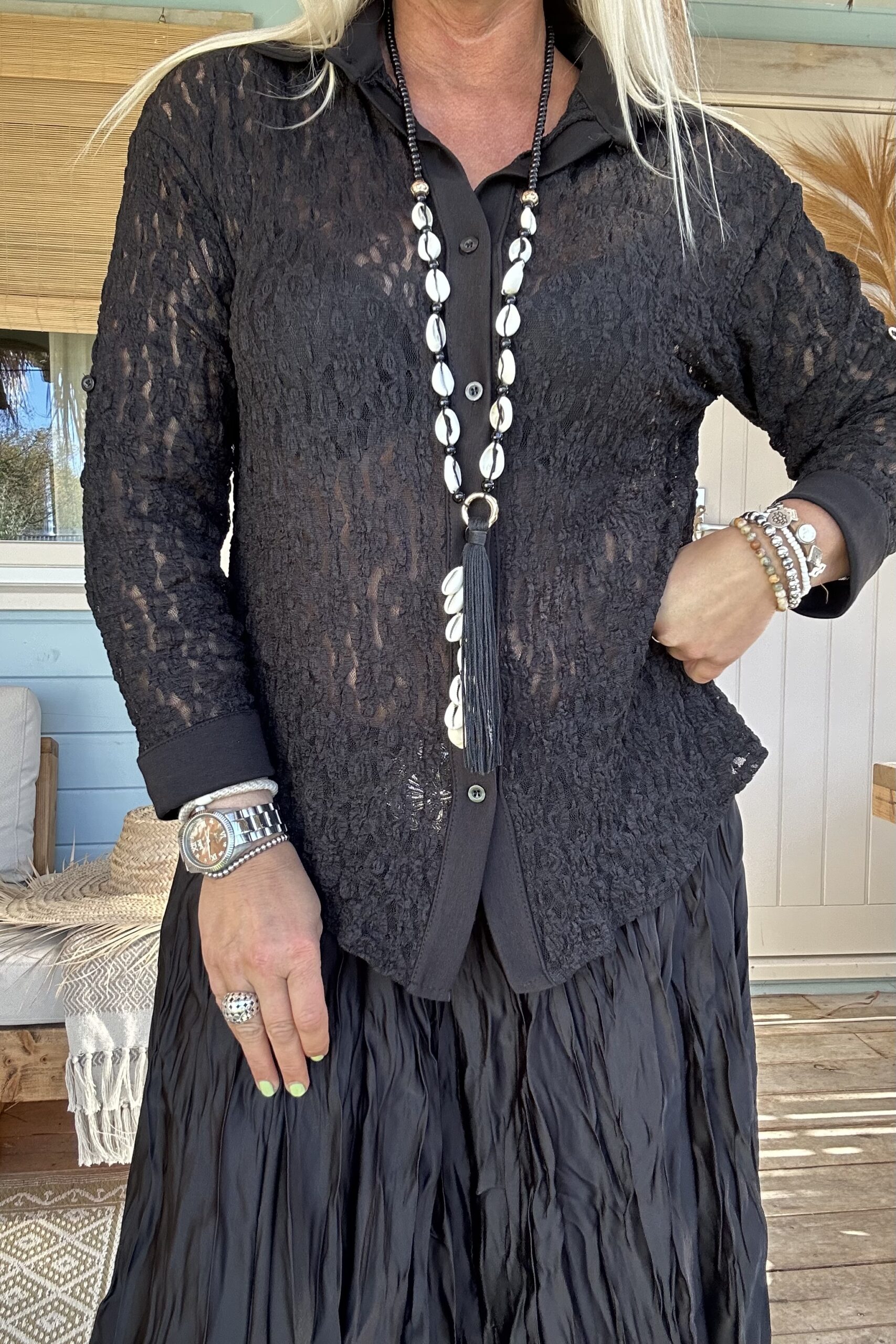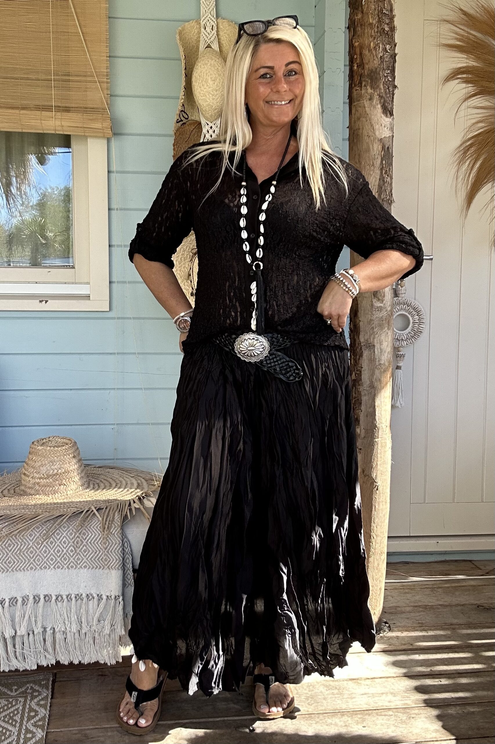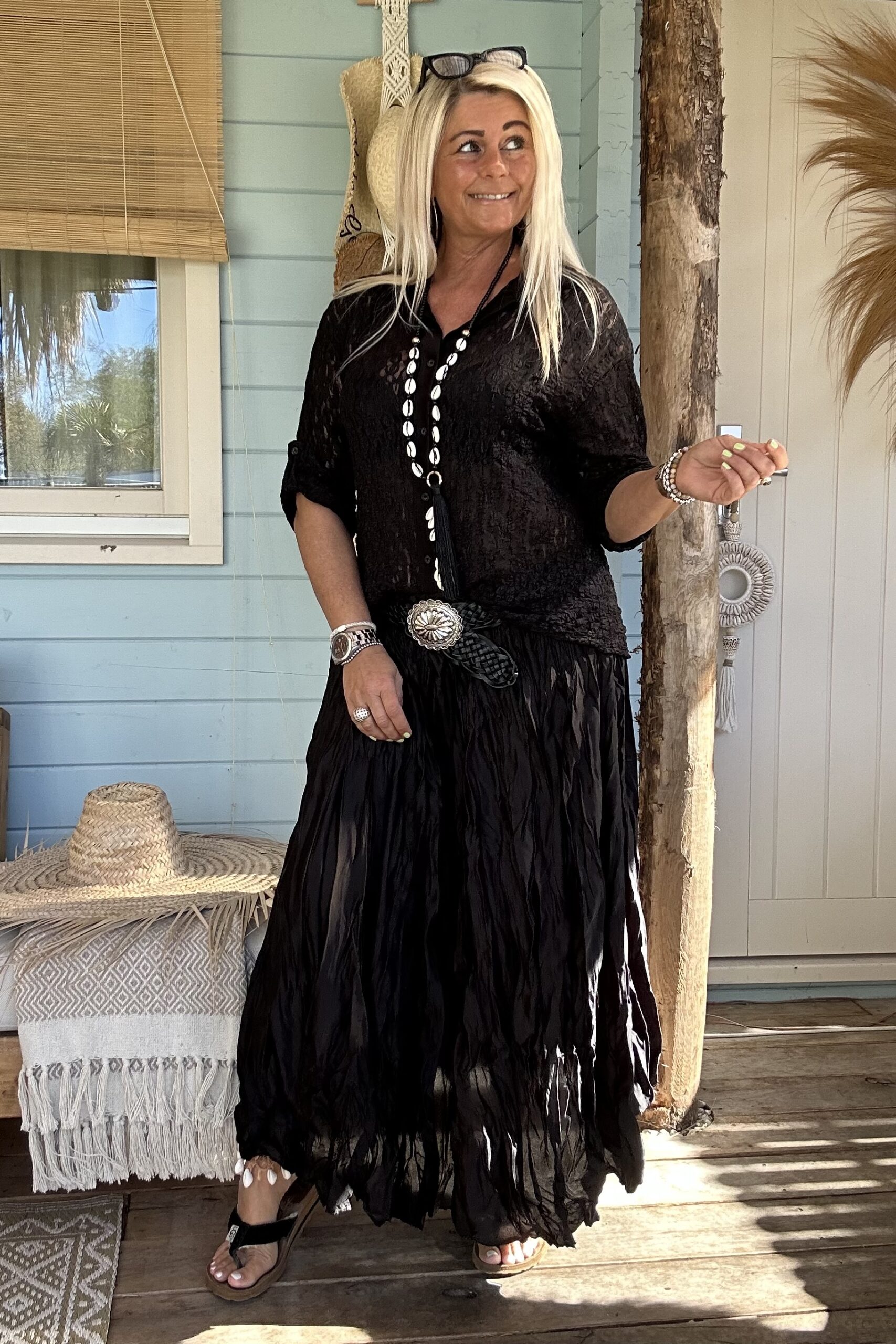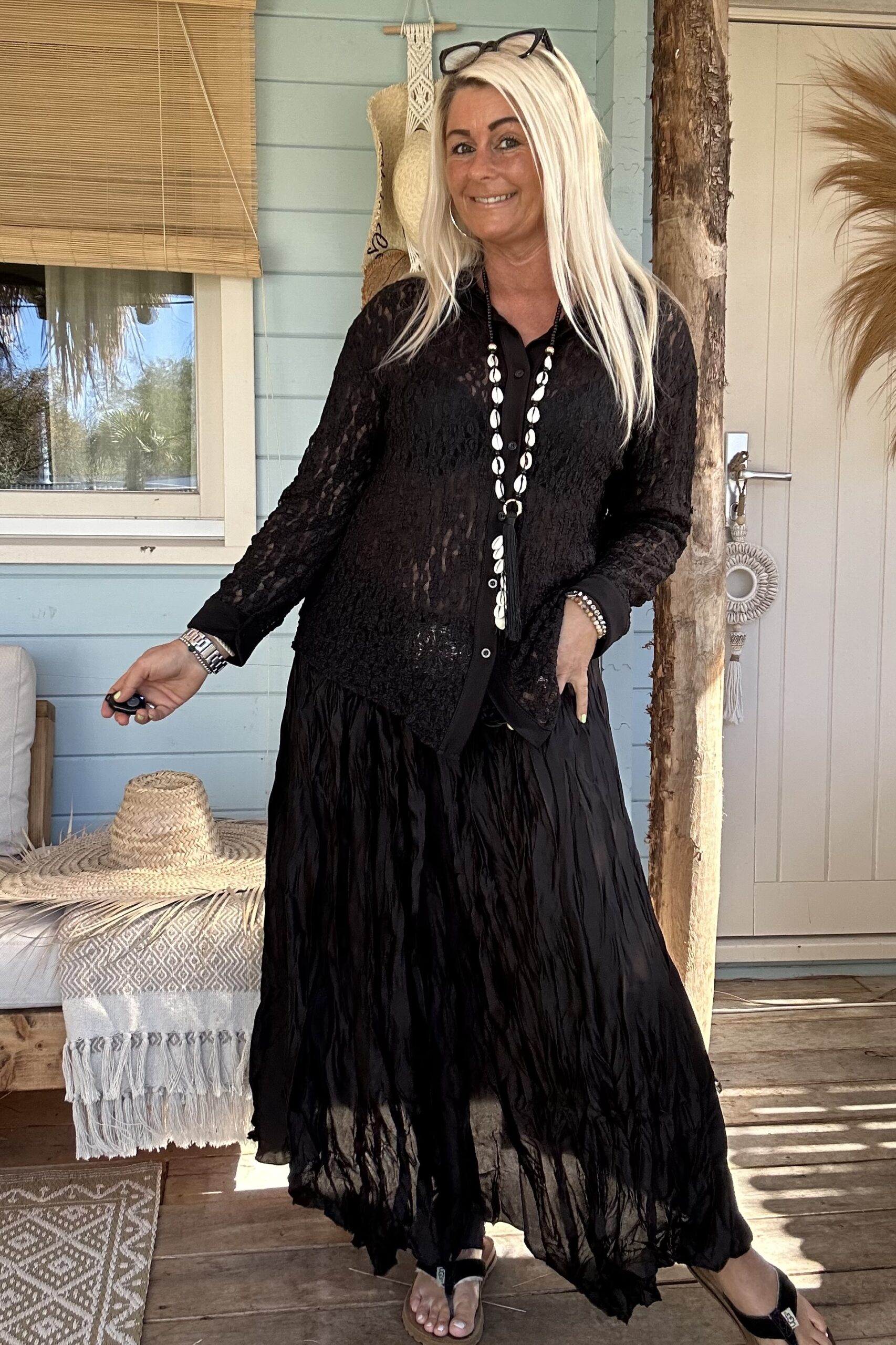 Laat je speelse kant zien met onze frivole satijnlook boho rok, voorzien van eigentijdse wrinkles/ kreukels voor een trendy twist. Deze rok is een ode aan vrouwelijkheid en vrijheid, en past perfect in elke moderne garderobe. Combineer het moeiteloos met een eenvoudige basic trui of een luchtige blouse voor een verfijnde look. Geef er een stoere draai aan met trendy boots en voeg een vleugje warmte toe met een grof gebreid vest. Met een one-size-pasvorm, geschikt voor maat 36 tot en met een kleine maat 44, biedt deze boho rok een universele charme voor elke vrouw die durft te stralen in haar eigen stijl. model draagt normaal maat 38 en is 1.66 m lang.