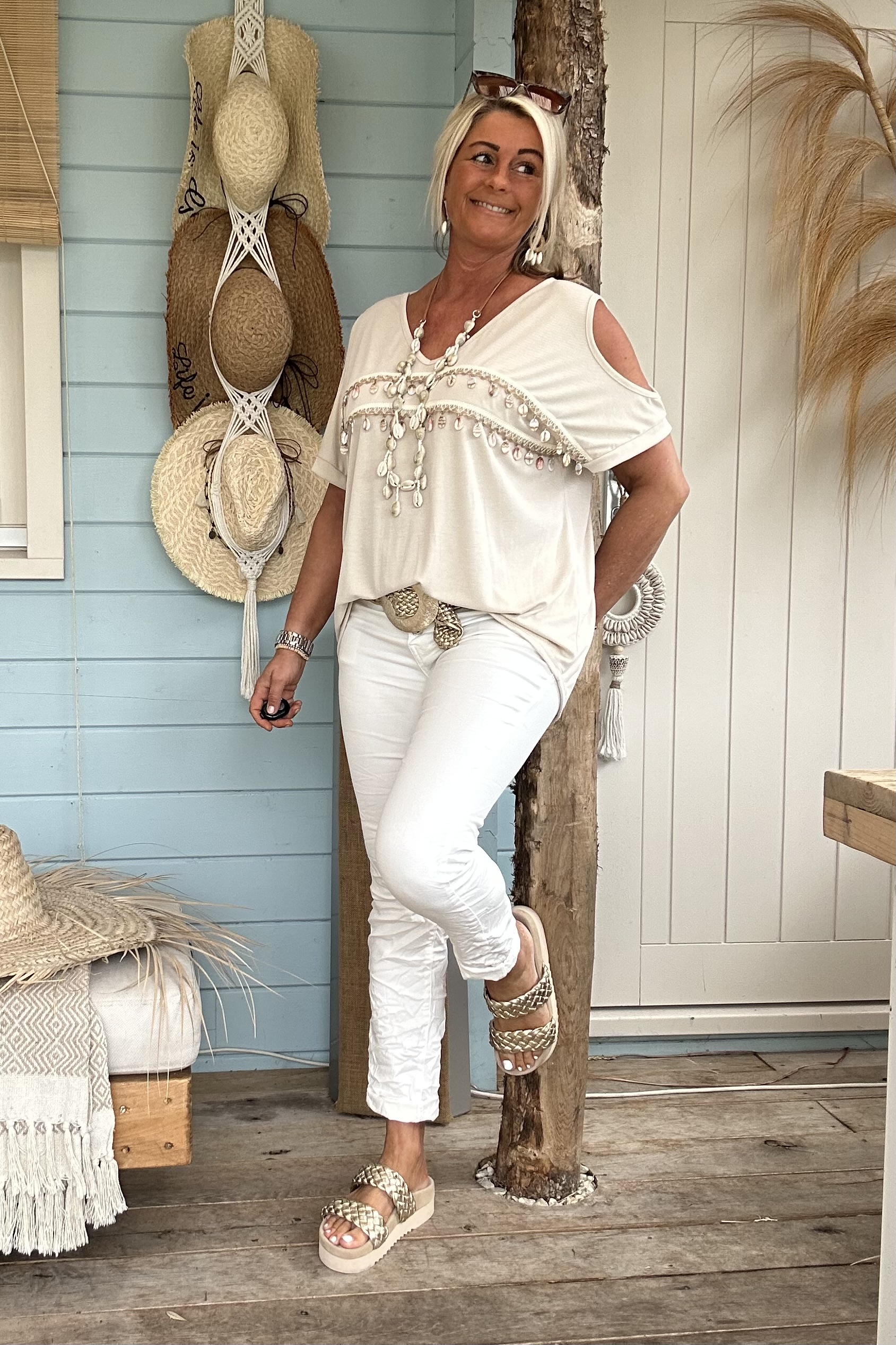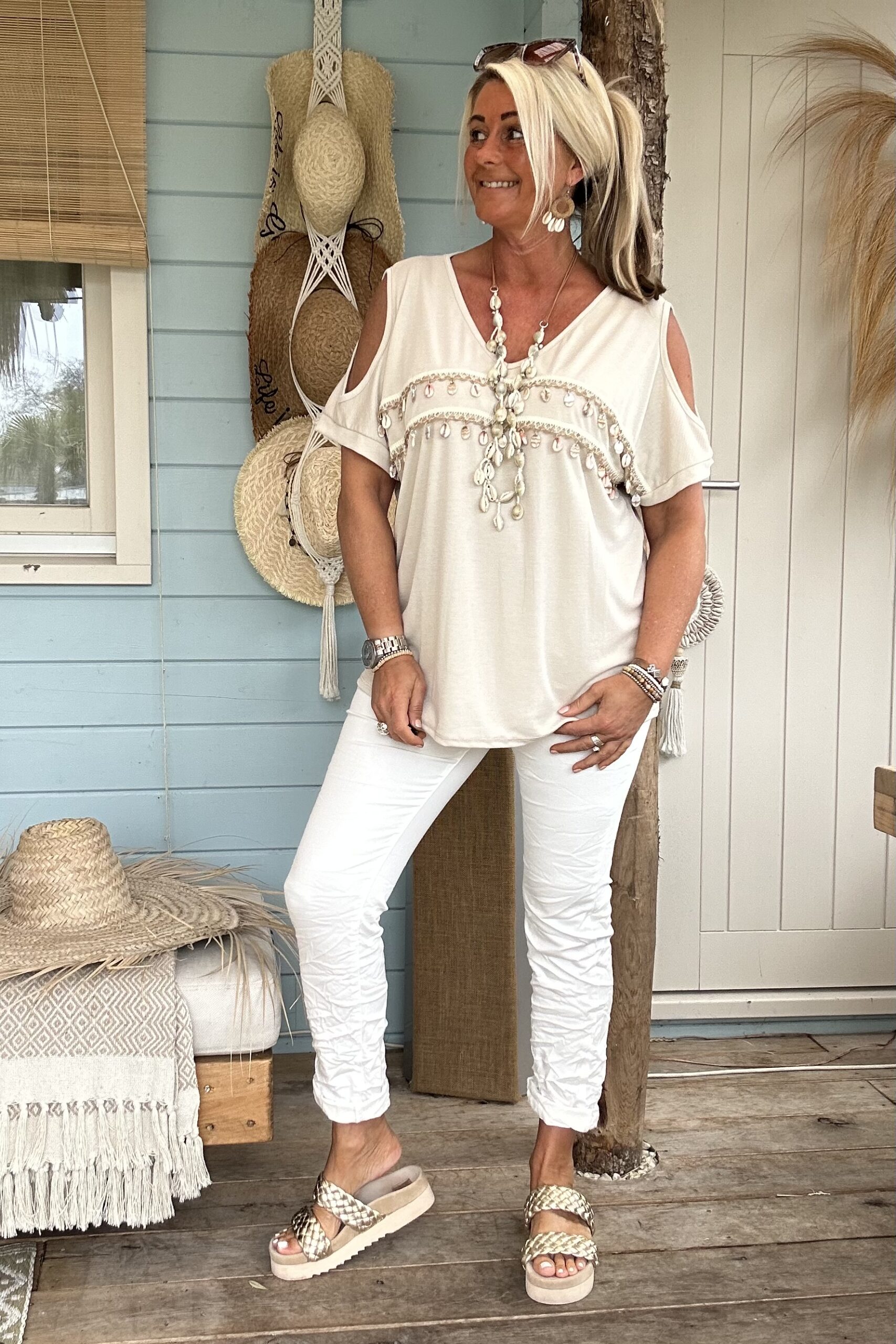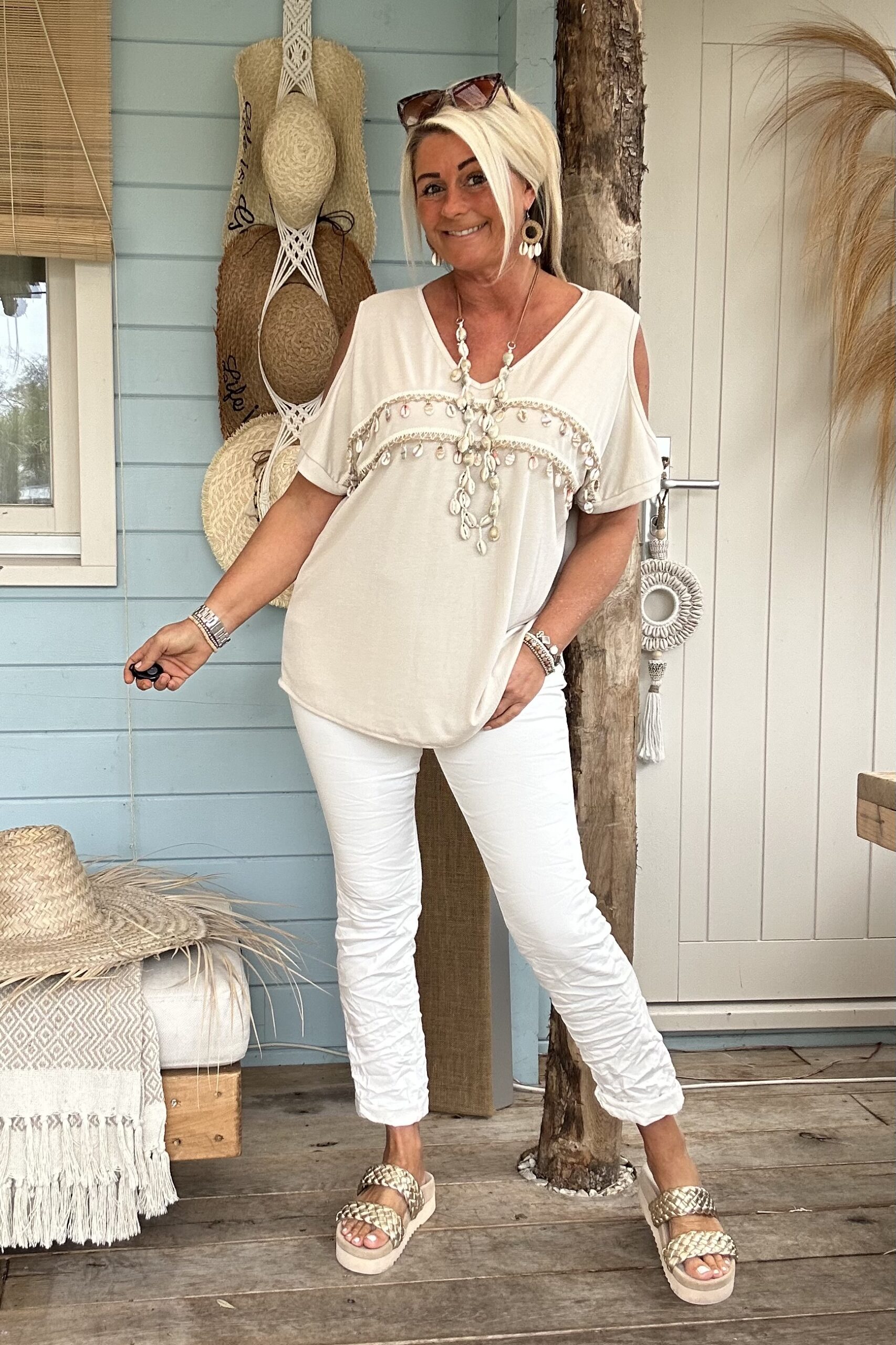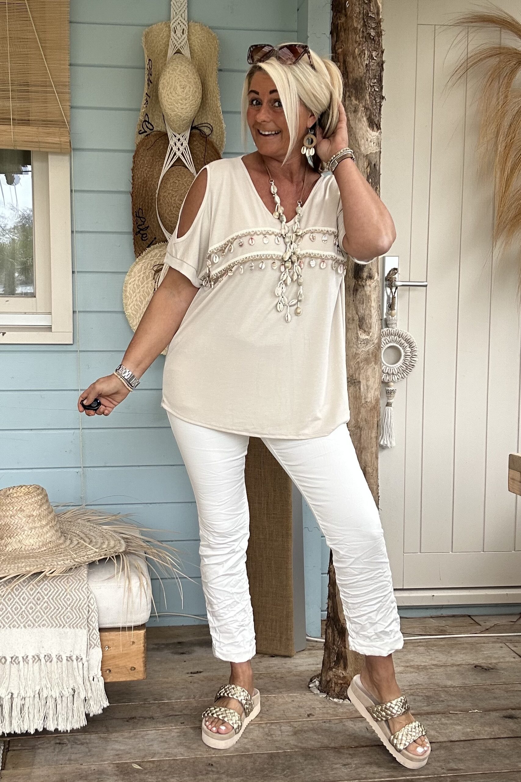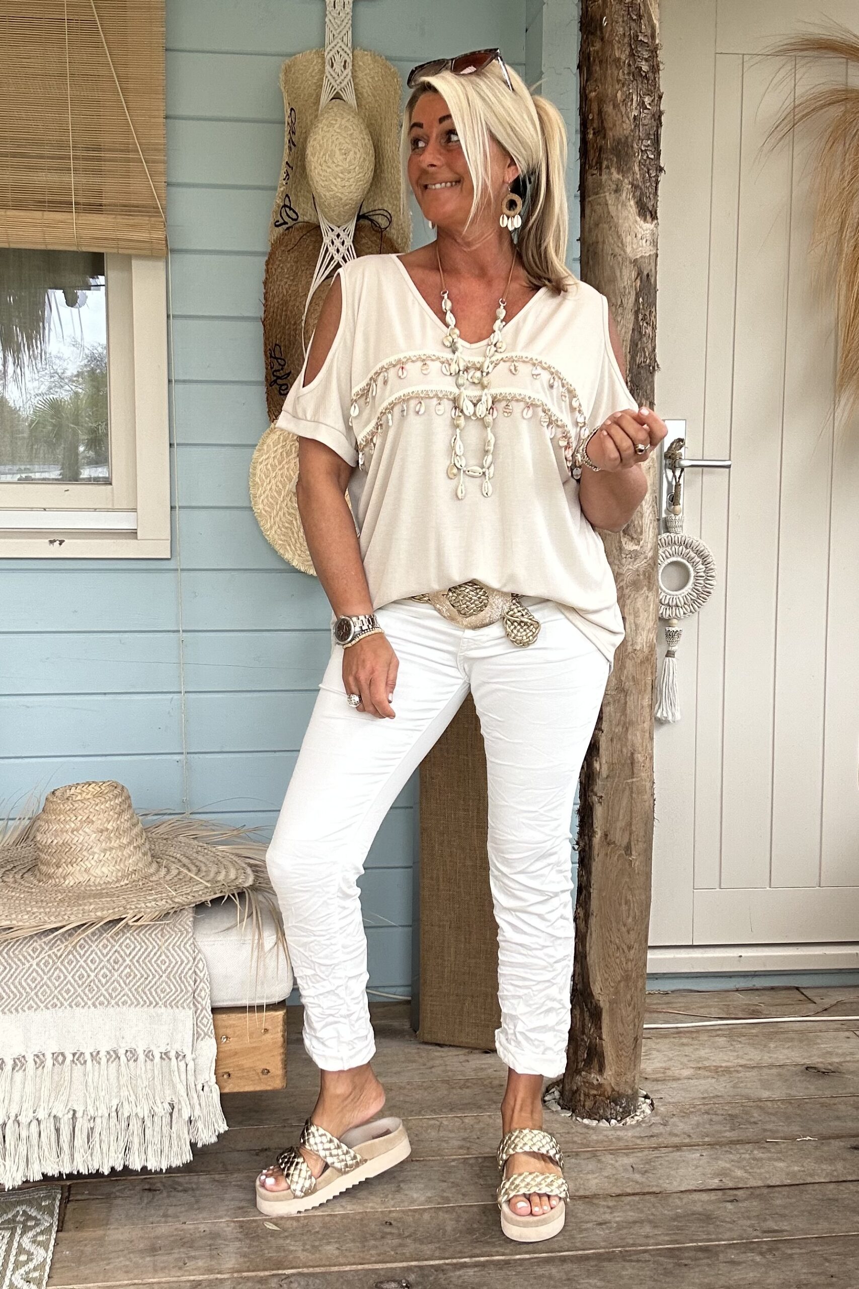 Deze prachtige cold shoulder top is een echte eyecatcher met haar verfijnde schelpjesdetails. De sierlijke afwerking over de borst geeft een speelse, zomerse uitstraling en zorgt direct voor die heerlijke Ibiza vibe. Dankzij de open schouders krijgt de top een vrouwelijke en luchtige look, terwijl de soepelvallende stof zorgt voor ultiem draagcomfort.