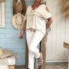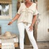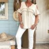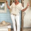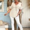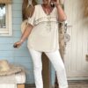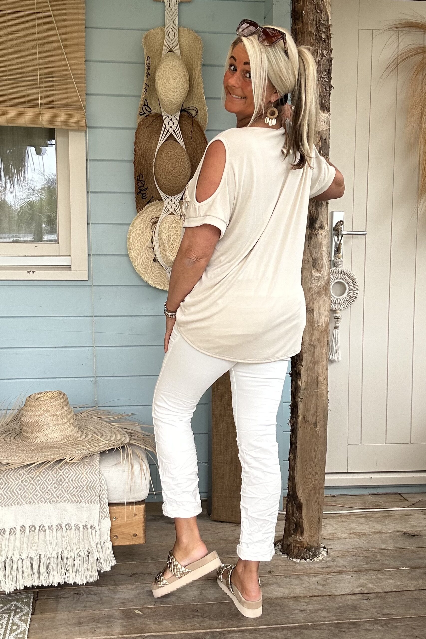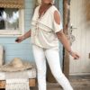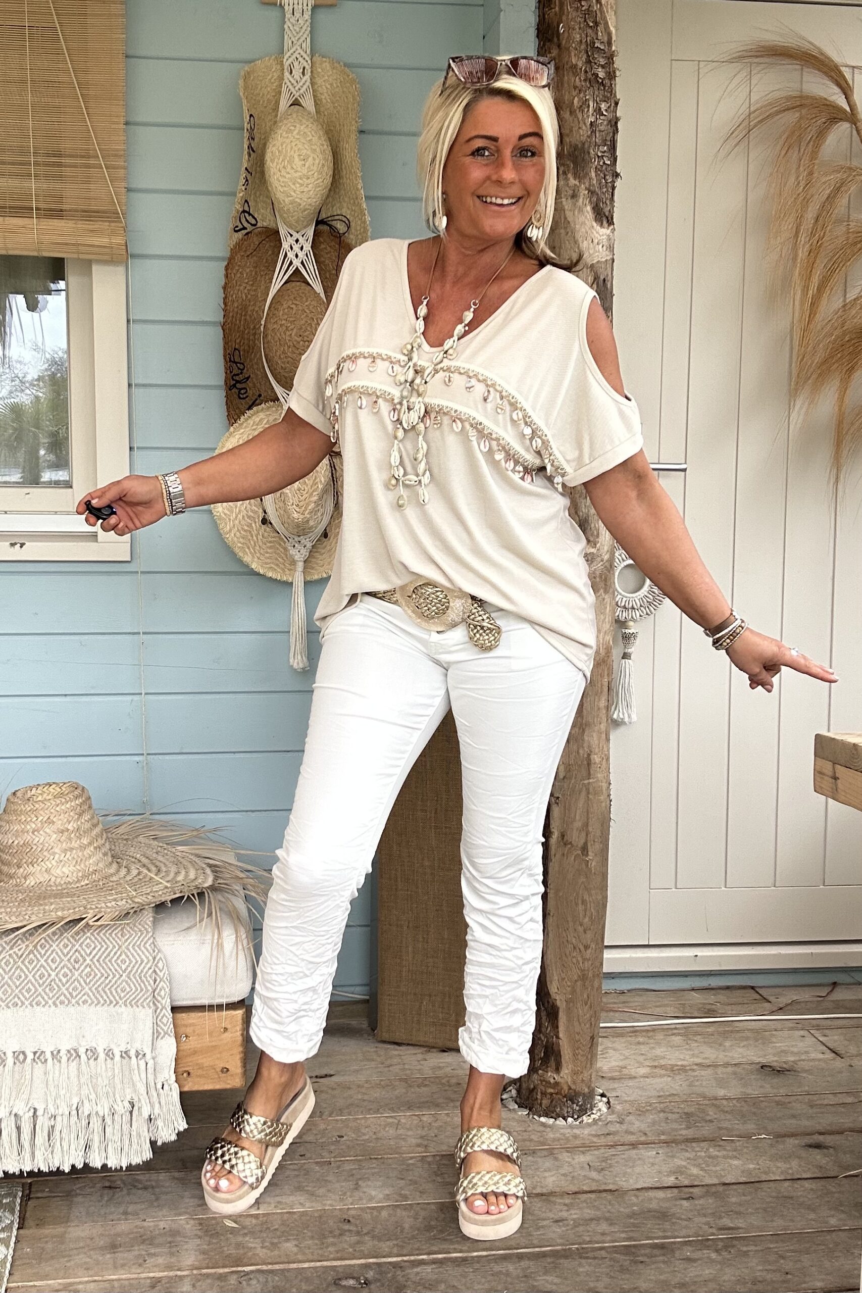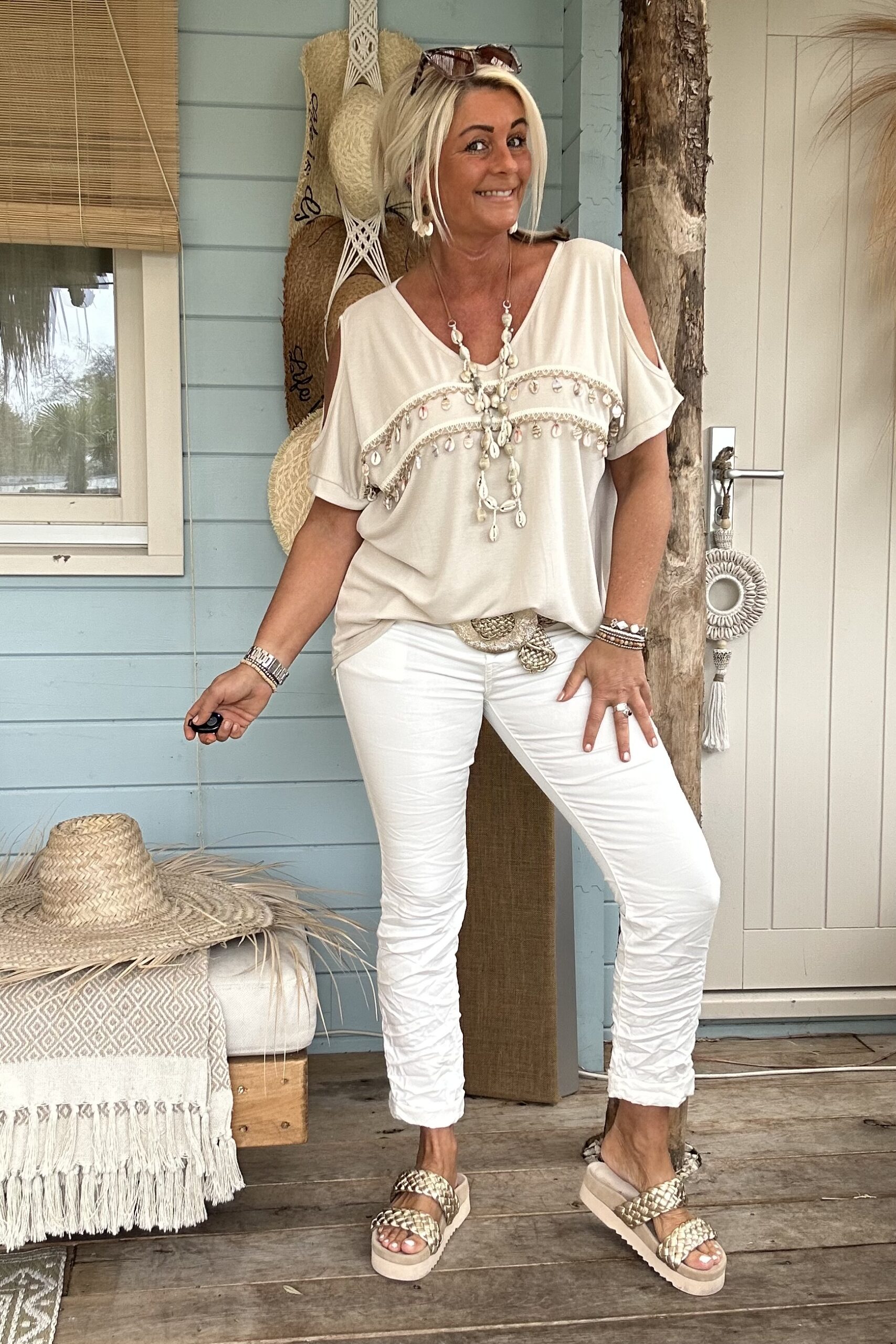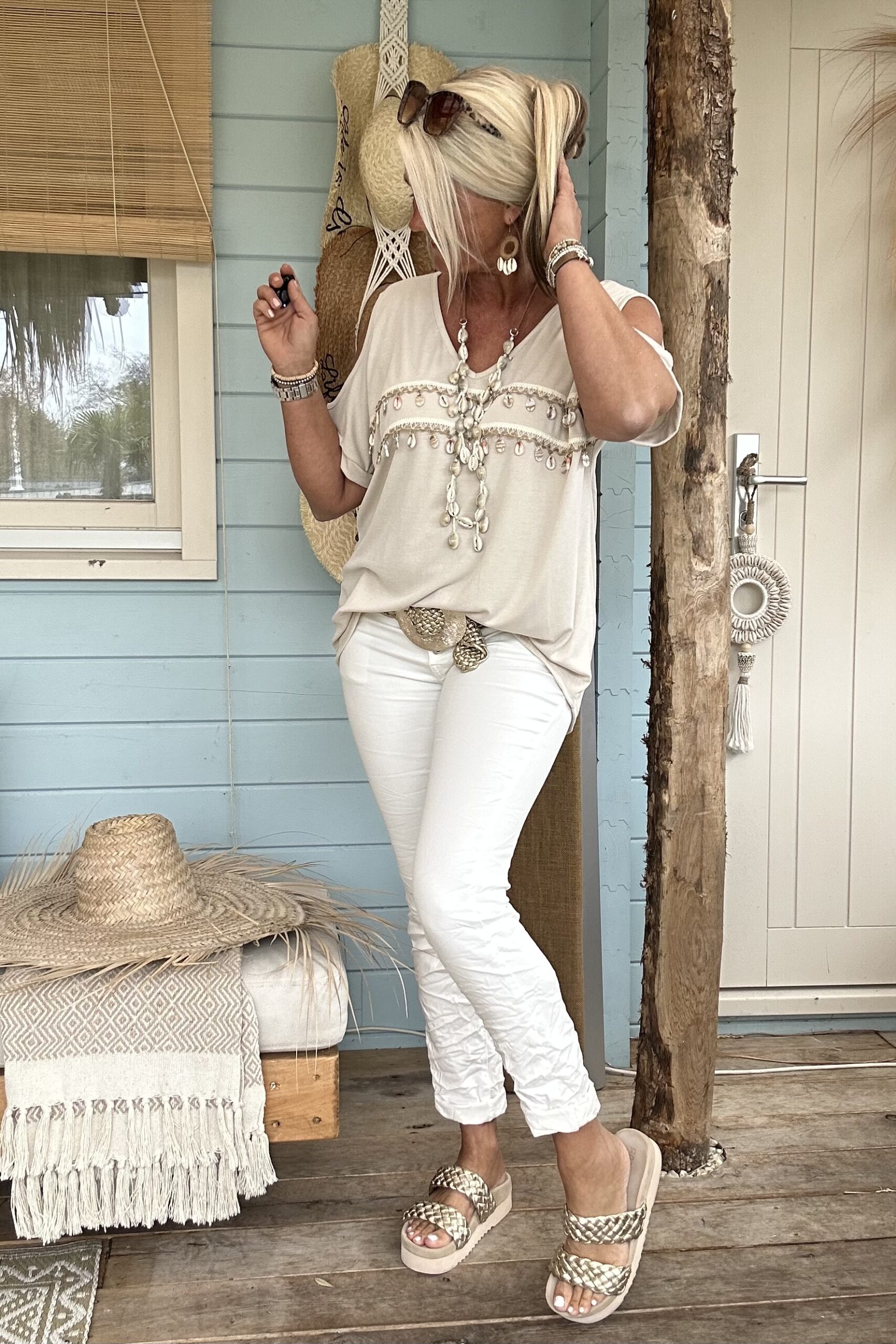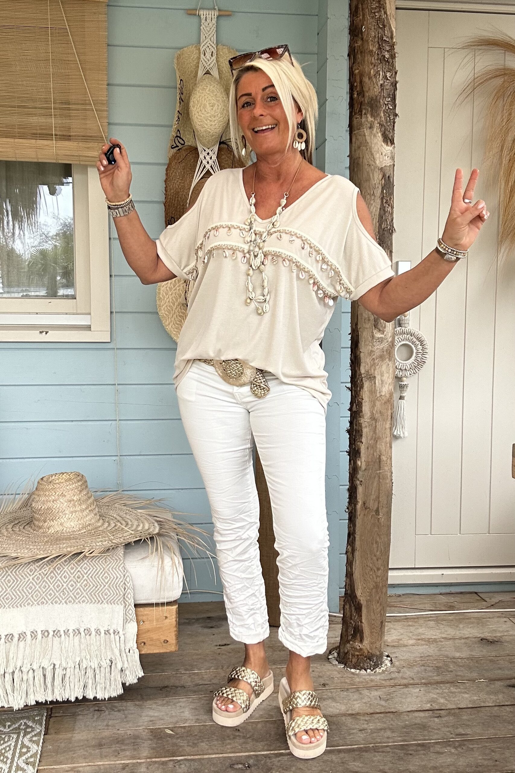 Deze prachtige cold shoulder top is een echte eyecatcher met haar verfijnde schelpjesdetails. De sierlijke afwerking over de borst geeft een speelse, zomerse uitstraling en zorgt direct voor die heerlijke Ibiza vibe. Dankzij de open schouders krijgt de top een vrouwelijke en luchtige look, terwijl de soepelvallende stof zorgt voor ultiem draagcomfort.