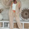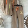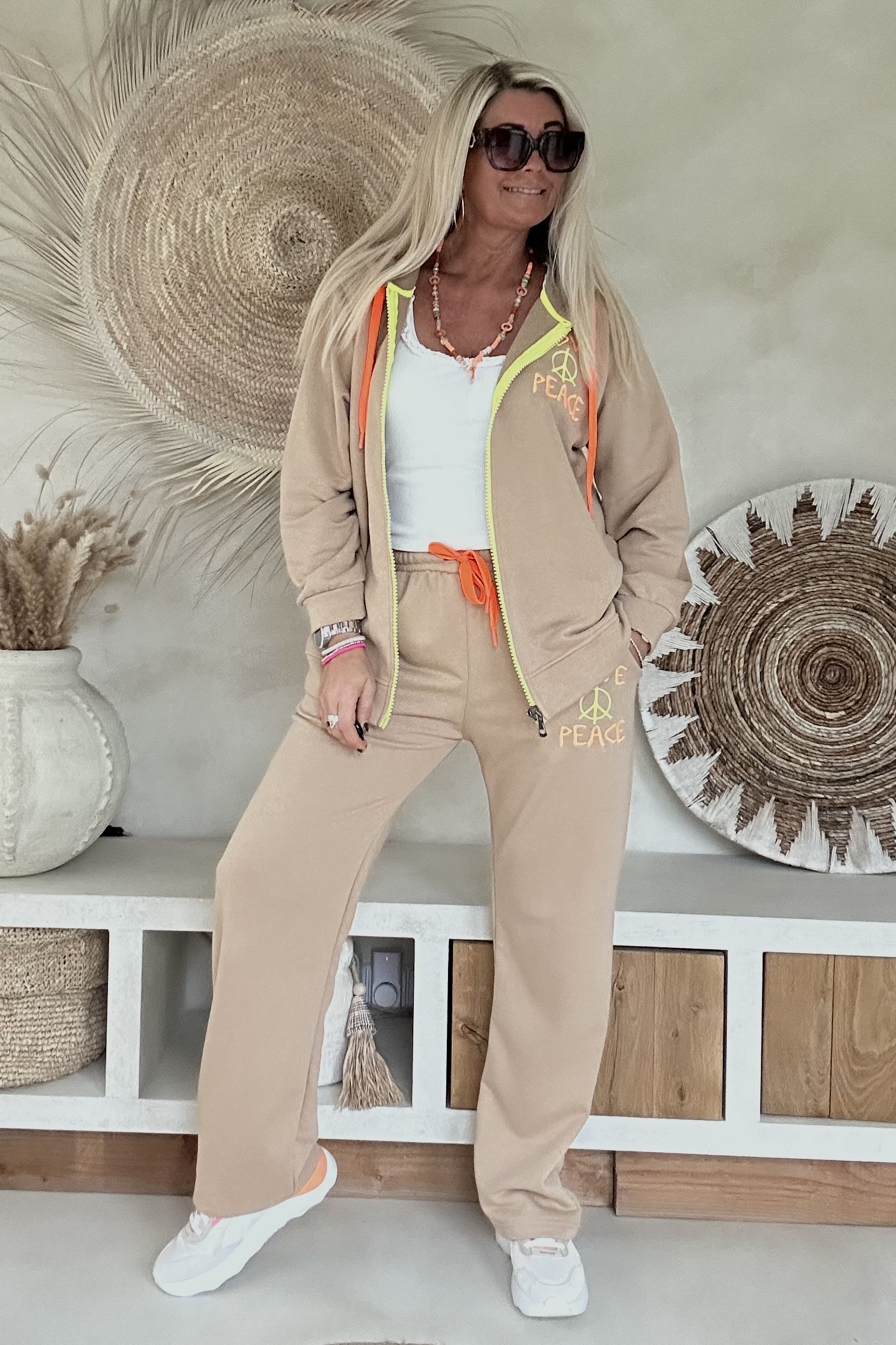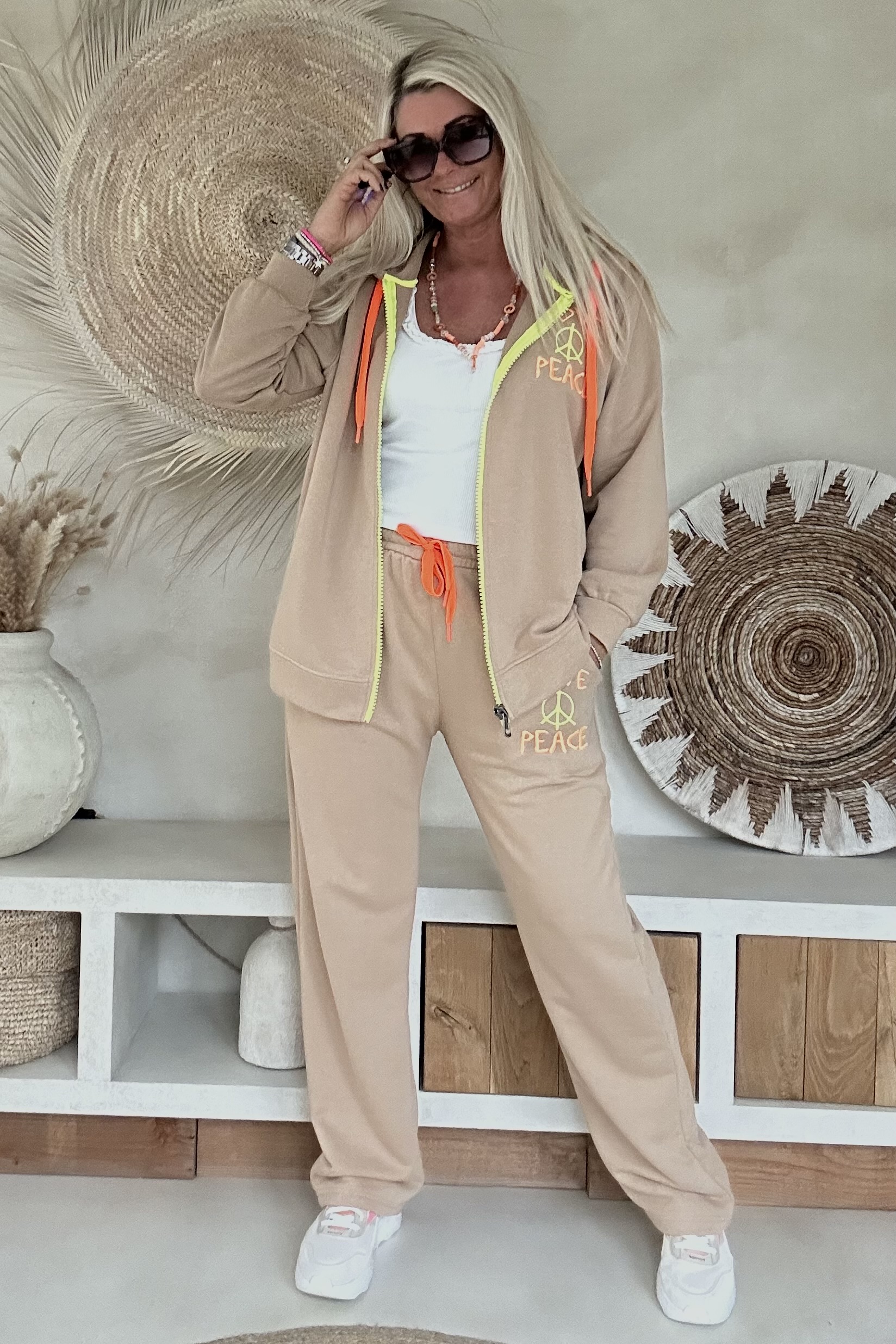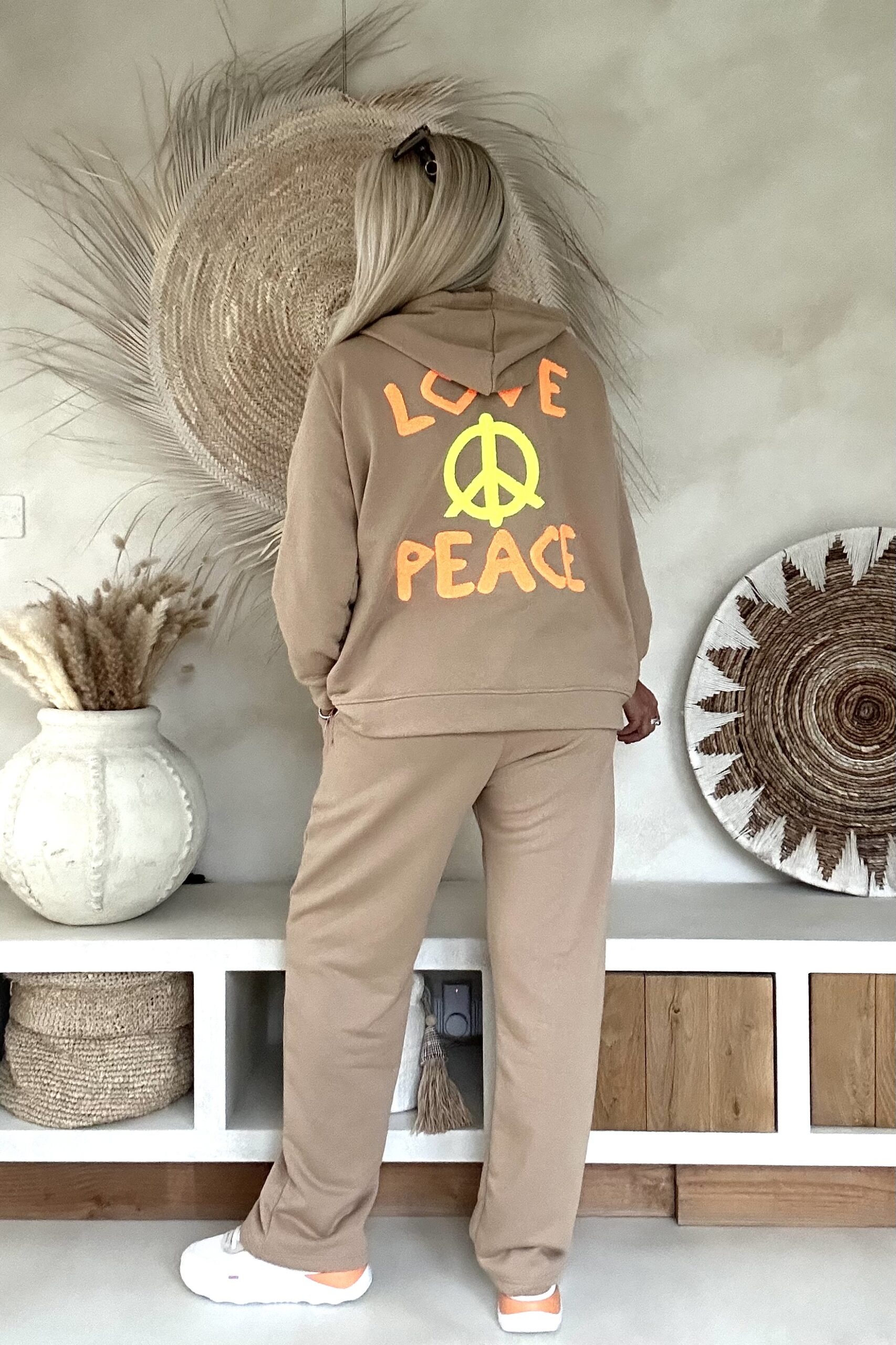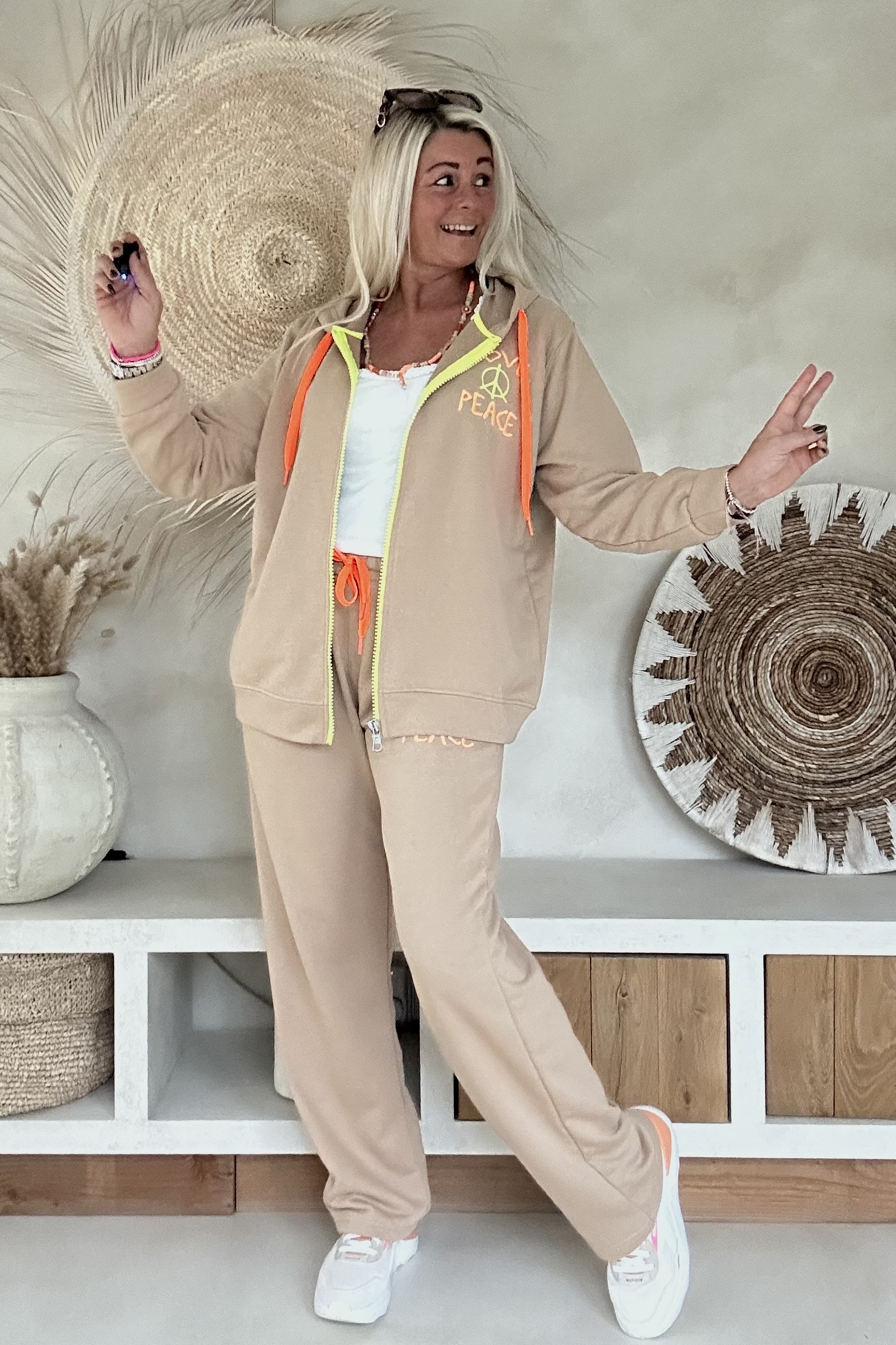 Dit comfy joggingpak met hoodie vest combineert een relaxte uitstraling met een opvallend statement. De set bestaat uit een vest met capuchon en rits en een bijpassende broek, beide uitgevoerd in een zachte katoenen kwaliteit. De neon badstof “LOVE & PEACE” print geeft het pak een speels en trendy accent. Het vest is voorzien van een capuchon en rits, terwijl de broek een elastische tailleband met aantrekkoord en steekzakken aan de zijkant heeft. Een fijne set voor comfortabele dagen met een stijlvolle twist.