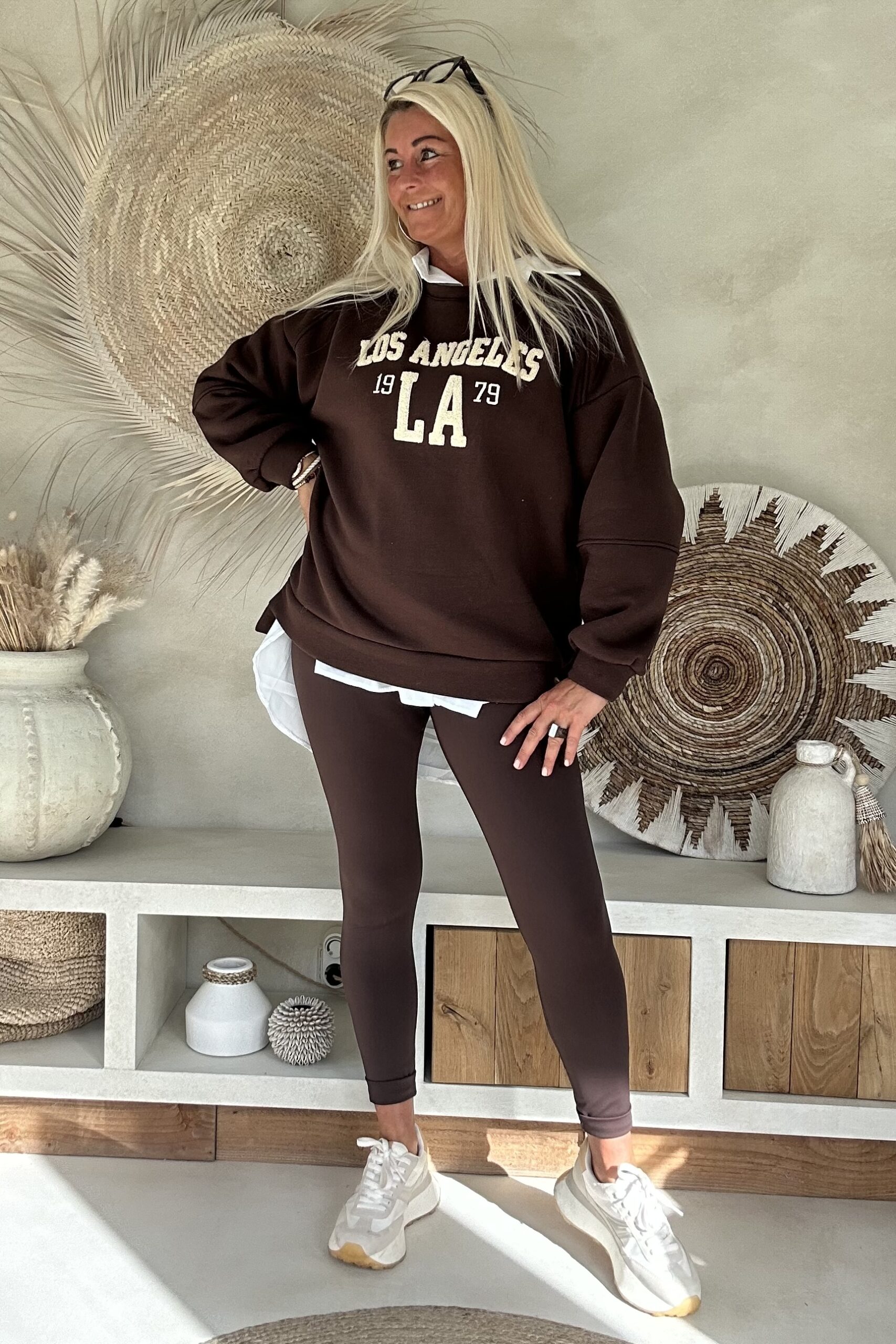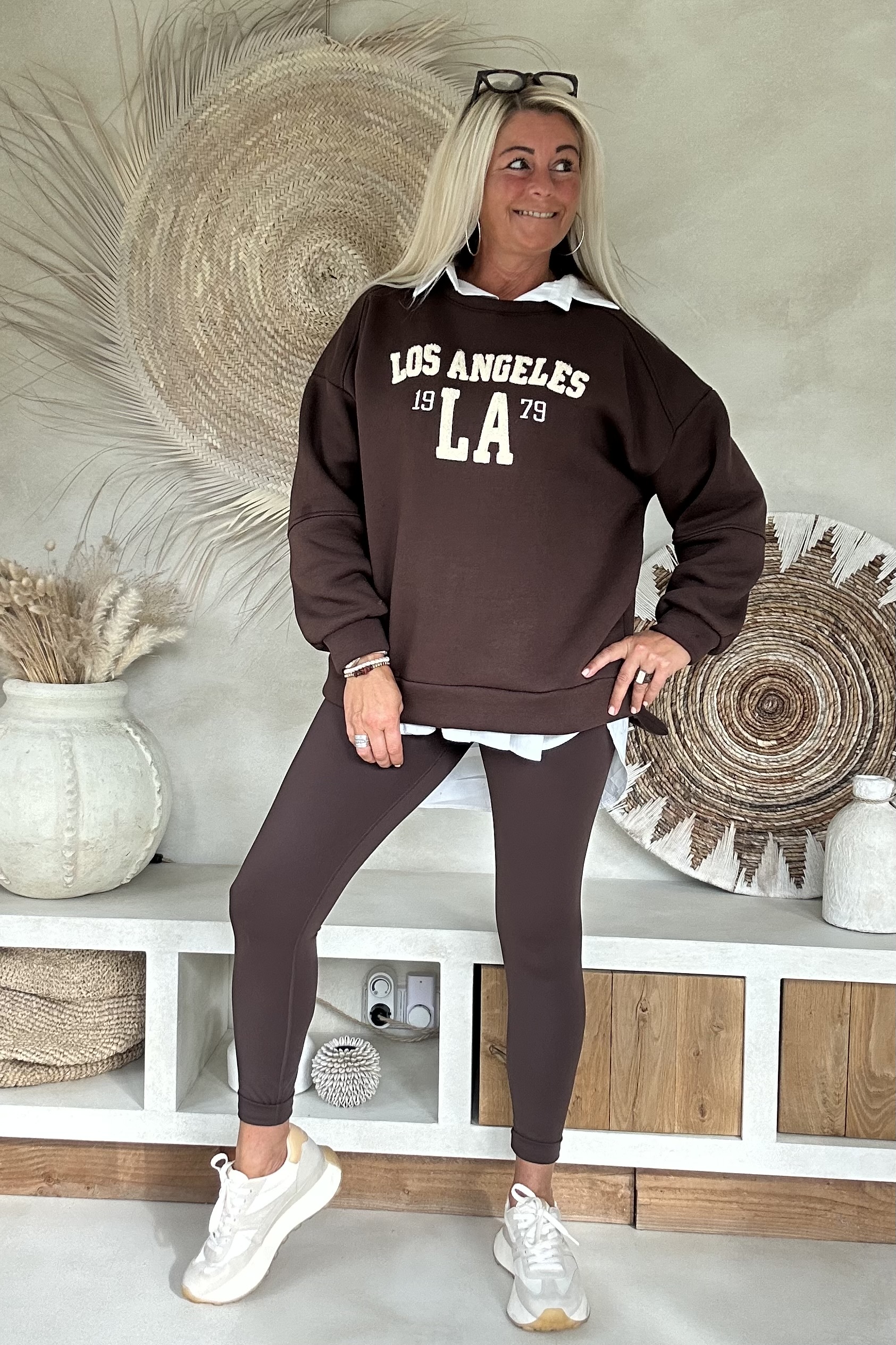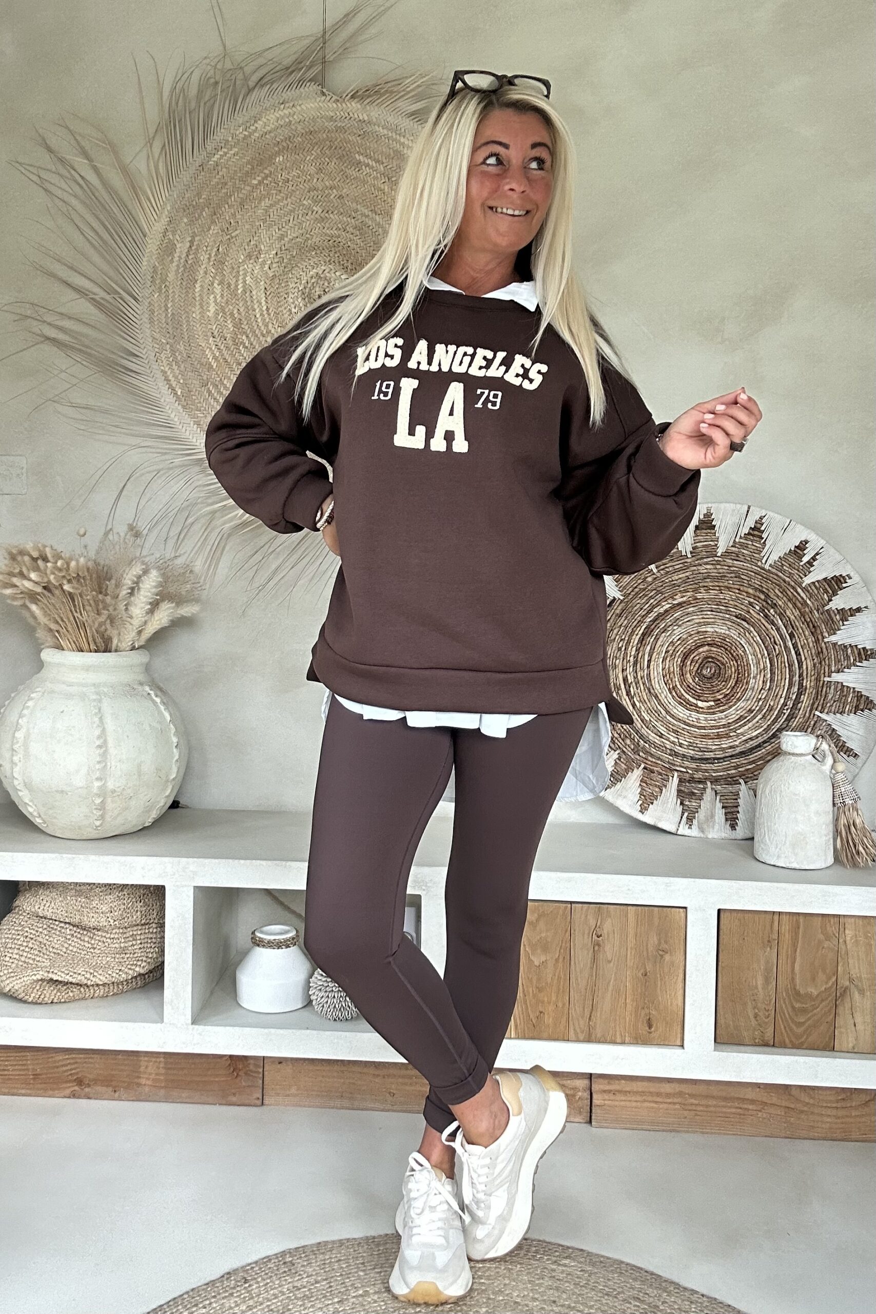 Heerlijk zachte en trendy sweater met badstof opdruk “Los Angeles LA 1979”. Deze trui heeft die typische relaxte college-look die perfect past bij een casual en sportieve stijl. De binnenkant is zacht en comfortabel, waardoor hij fijn draagt op koelere dagen. Draag hem met de Norfy sportlegging voor een comfy look of combineer met een jeans voor een stoerdere outfit. Verkrijgbaar in meerdere kleuren, zodat je altijd kunt variëren.
