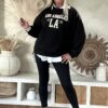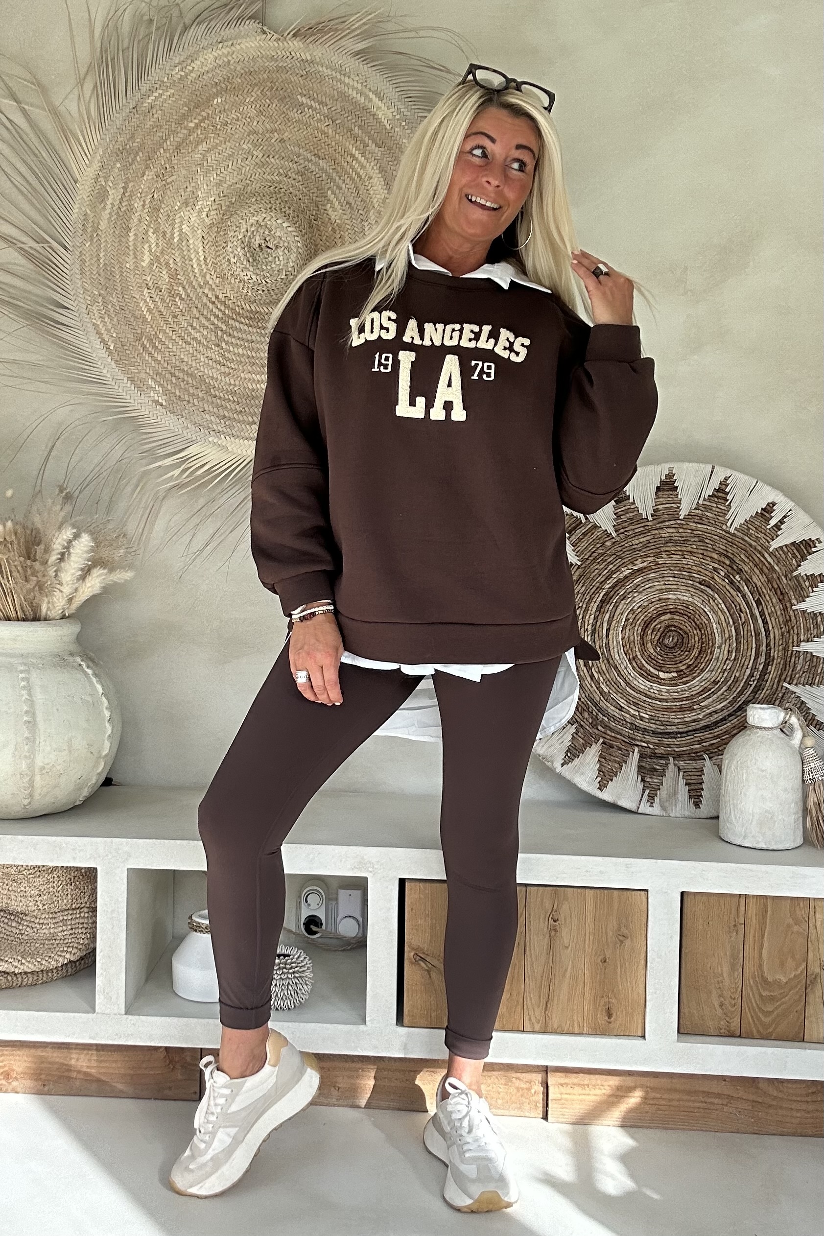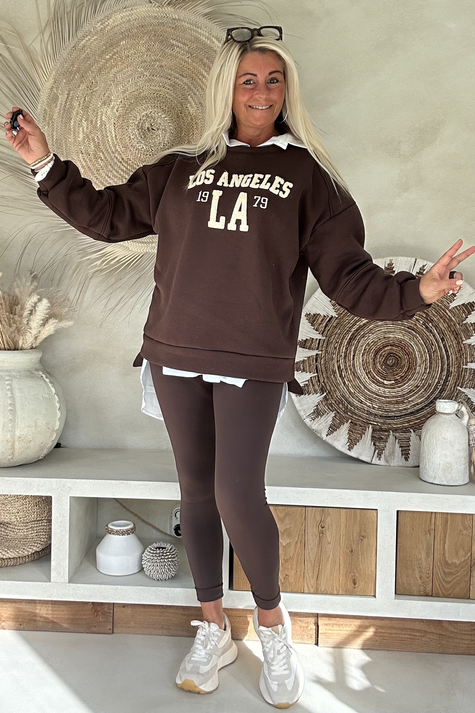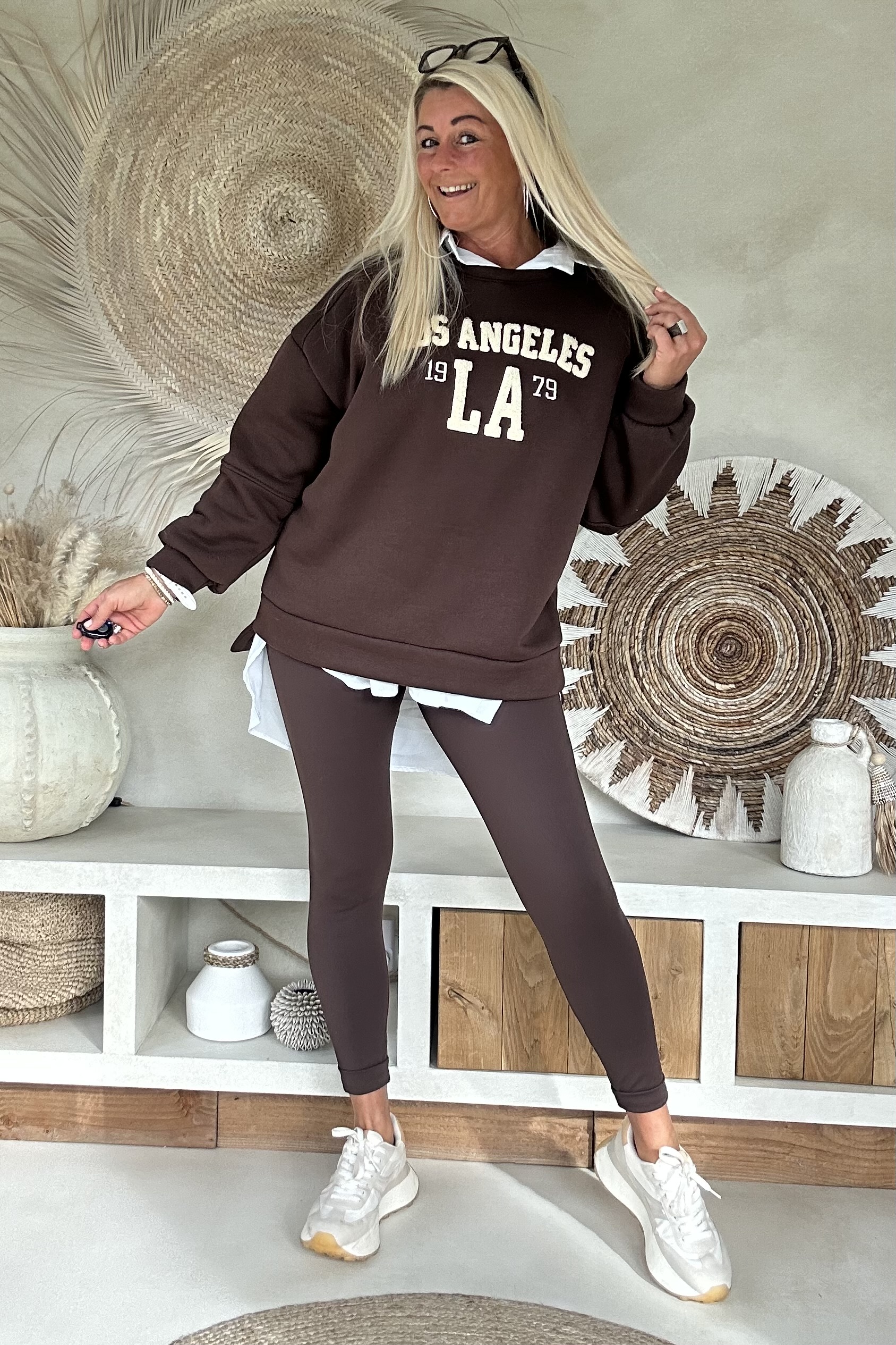 Heerlijk zachte en trendy sweater met badstof opdruk “Los Angeles LA 1979”. Deze trui heeft die typische relaxte college-look die perfect past bij een casual en sportieve stijl. De binnenkant is zacht en comfortabel, waardoor hij fijn draagt op koelere dagen. Draag hem met de Norfy sportlegging voor een comfy look of combineer met een jeans voor een stoerdere outfit. Verkrijgbaar in meerdere kleuren, zodat je altijd kunt variëren.