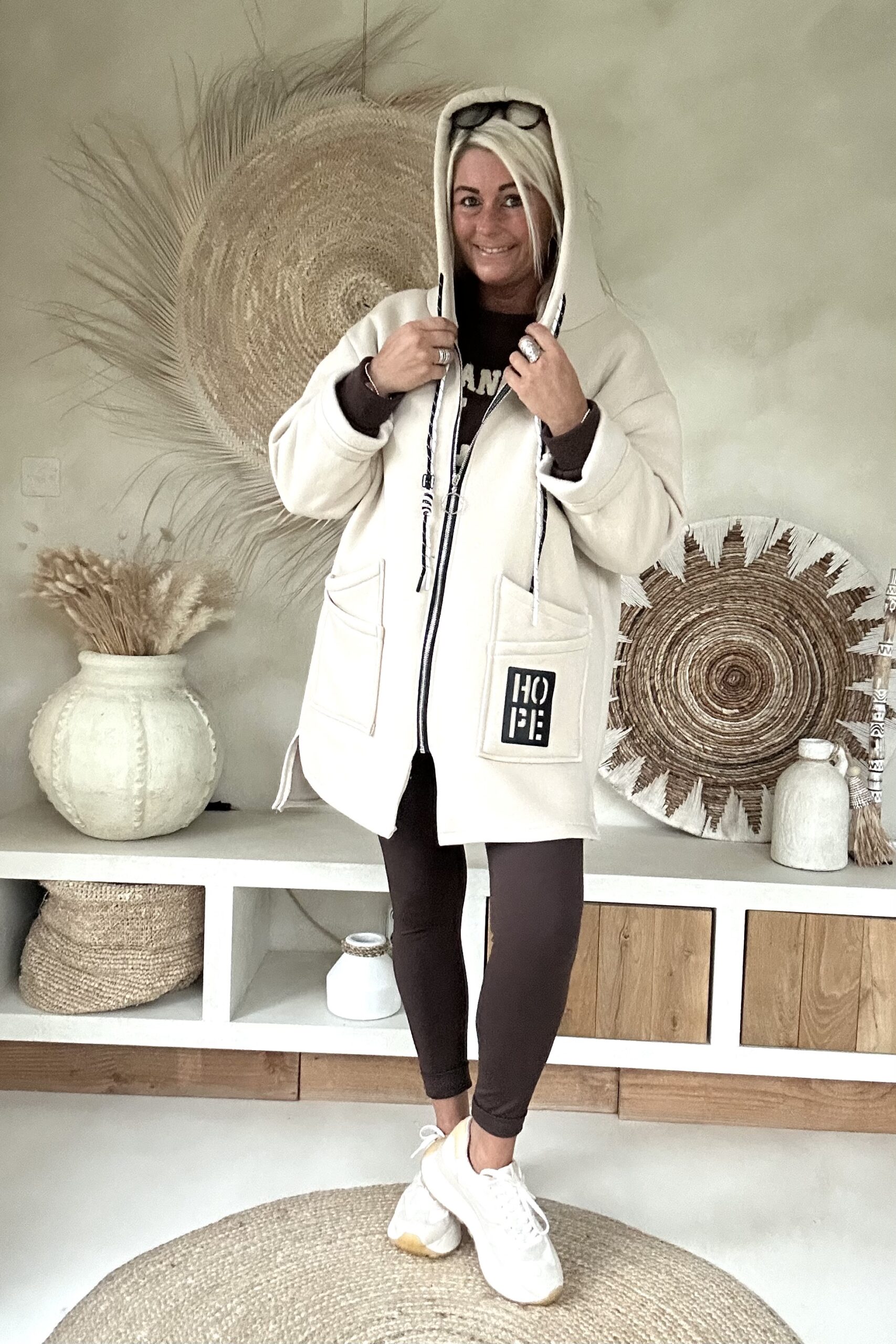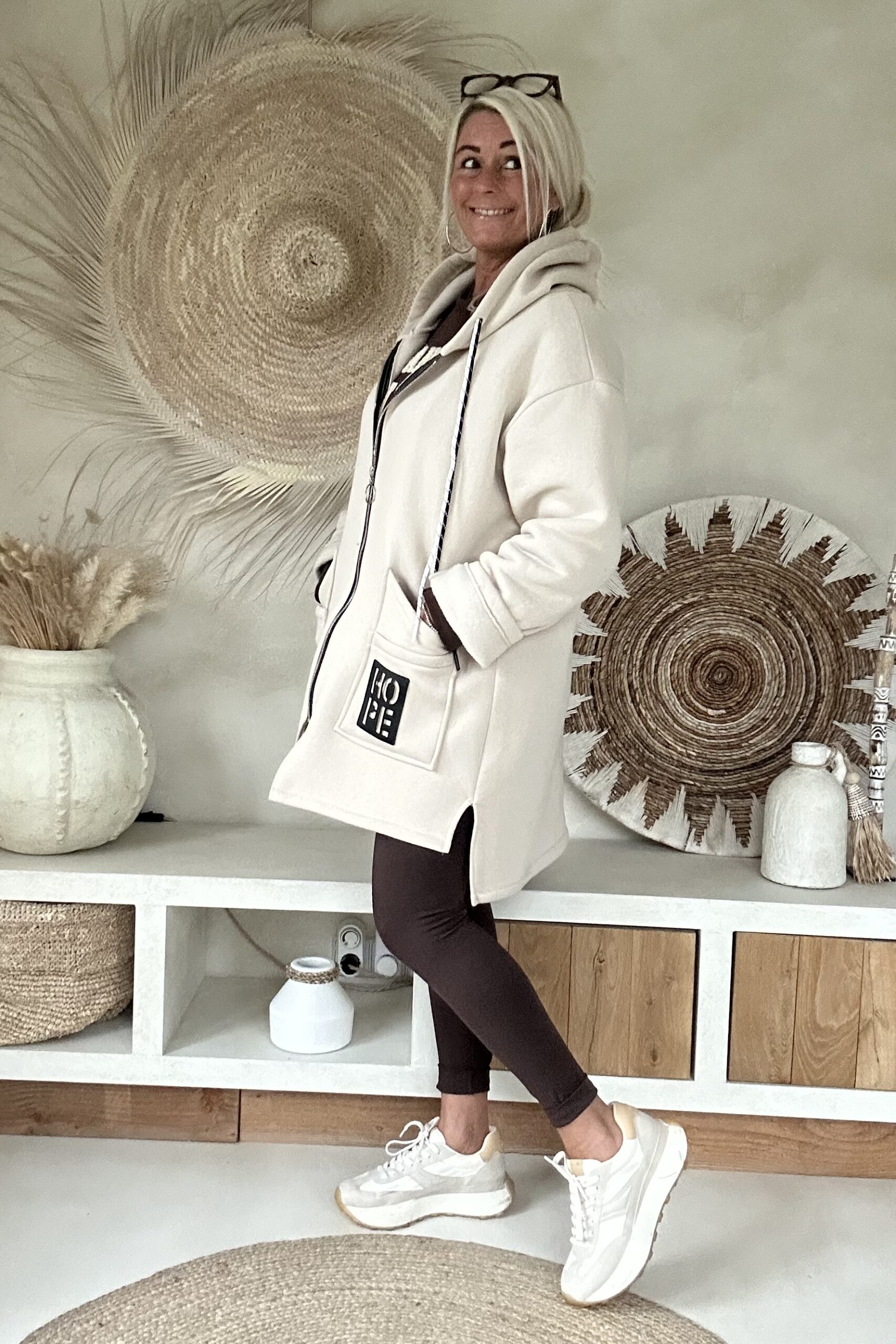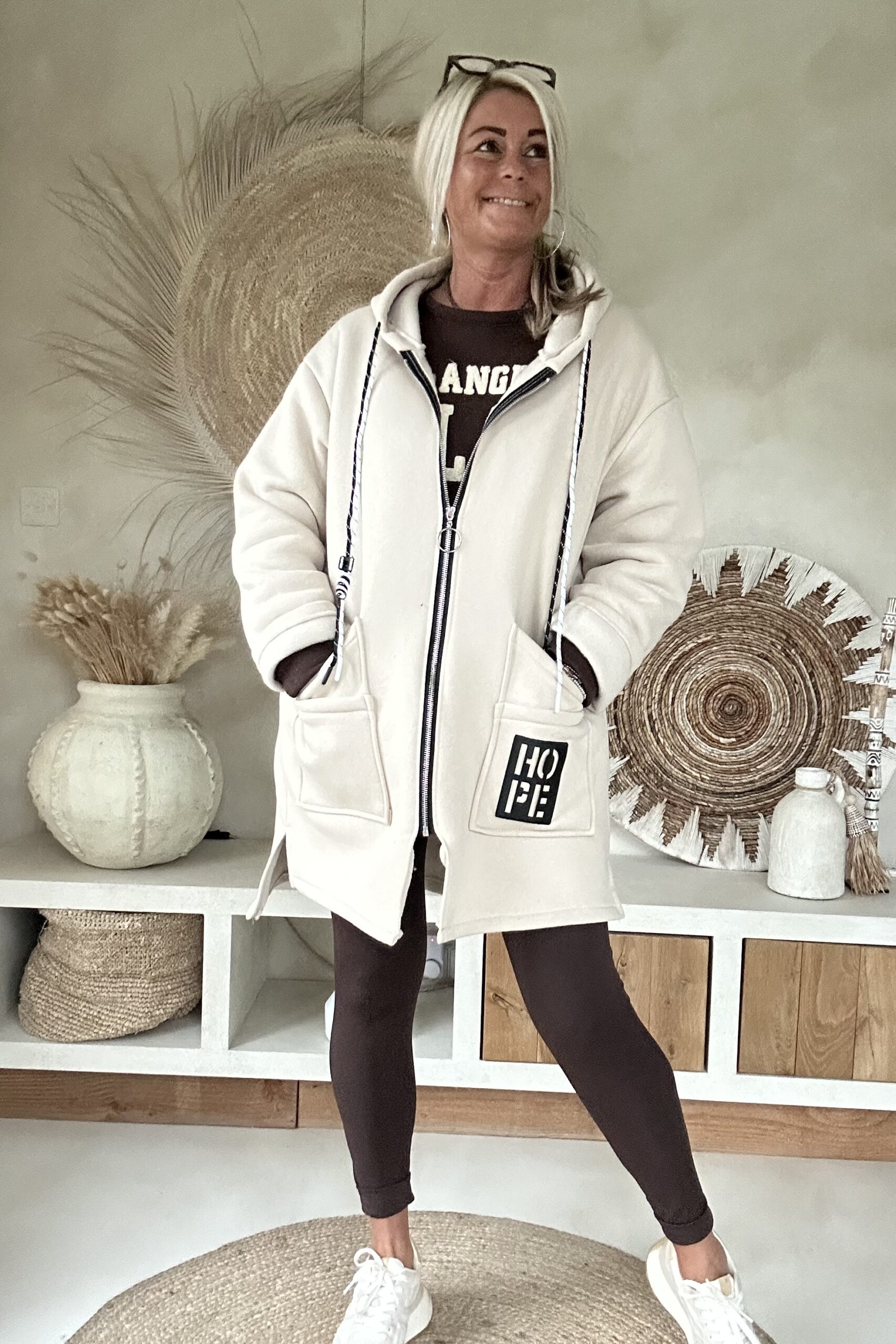 Comfortabel lang vest met een stoere uitstraling. Het vest heeft een capuchon met opvallende zwart-witte trekkoorden, opgestikte zakken met ‘HOPE’-patch en een robuuste ritssluiting. De zijkanten zijn voorzien van kleine splitjes en de achterkant is iets langer dan de voorkant. Verkrijgbaar in beige en donkerbruin – perfect om casual te combineren met een sportieve look.