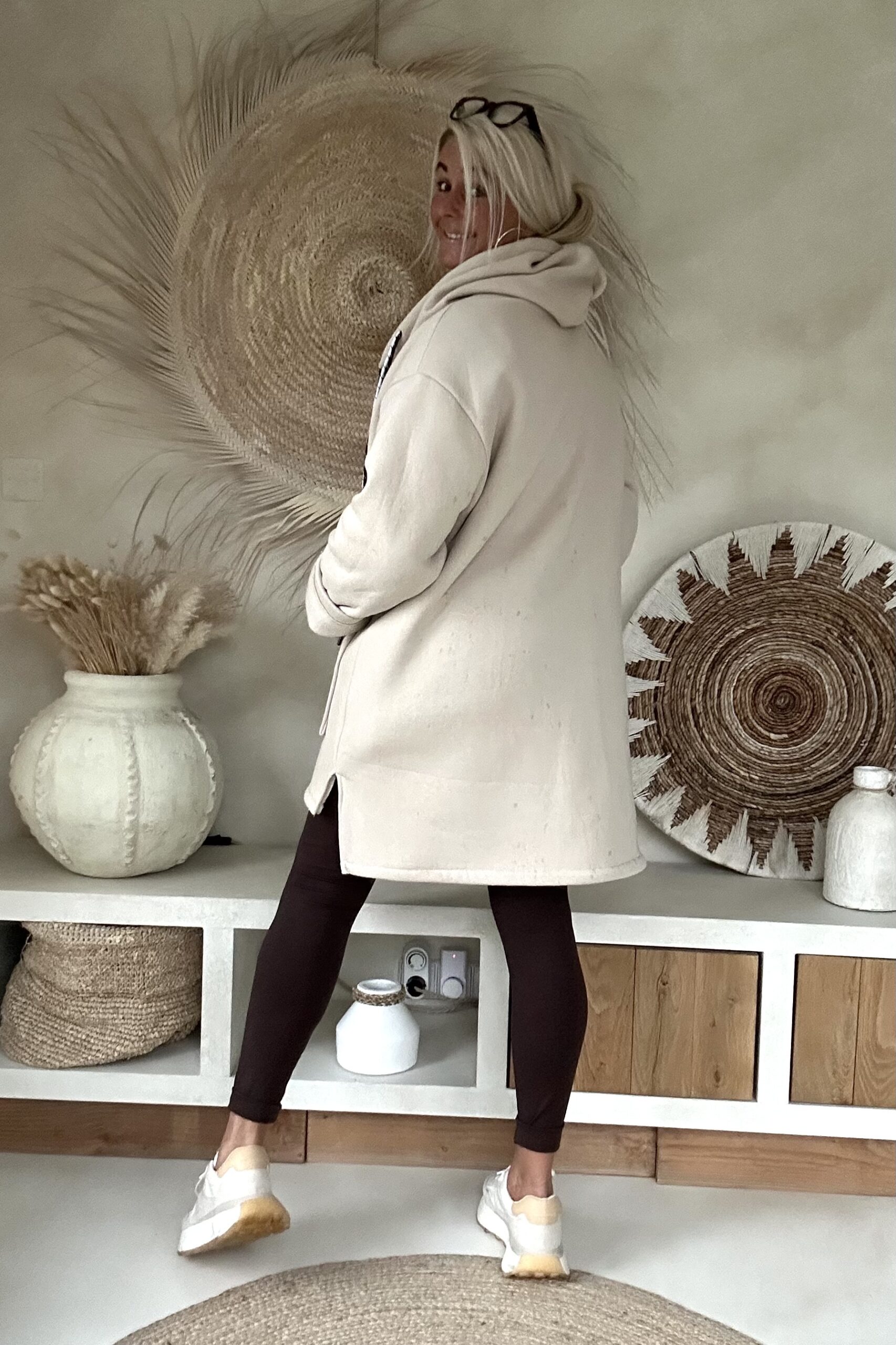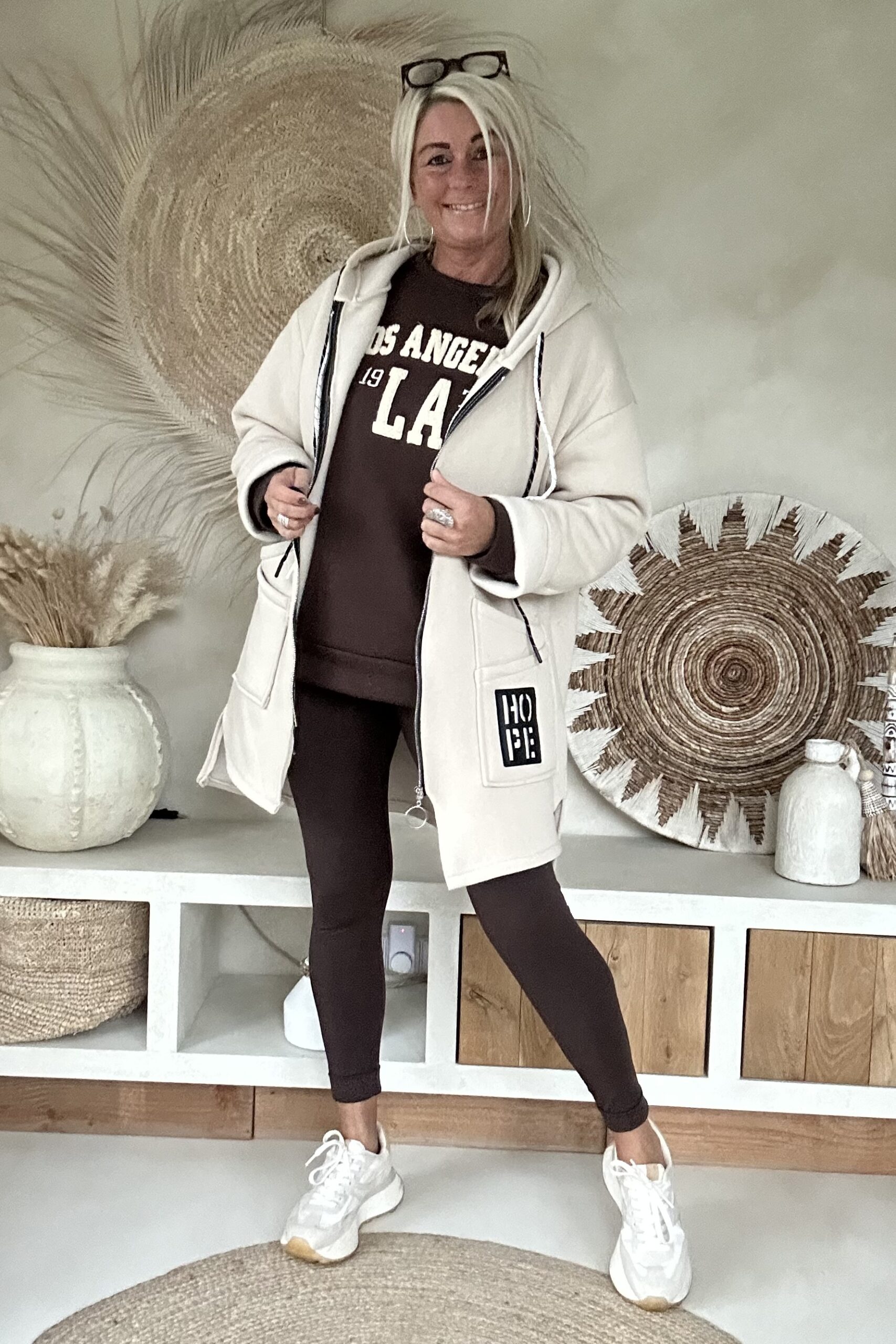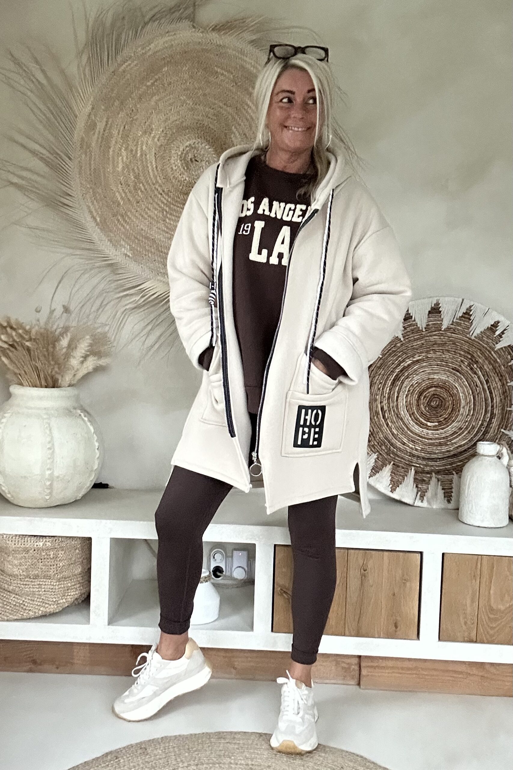 Comfortabel lang vest met een stoere uitstraling. Het vest heeft een capuchon met opvallende zwart-witte trekkoorden, opgestikte zakken met ‘HOPE’-patch en een robuuste ritssluiting. De zijkanten zijn voorzien van kleine splitjes en de achterkant is iets langer dan de voorkant. Verkrijgbaar in beige en donkerbruin – perfect om casual te combineren met een sportieve look.