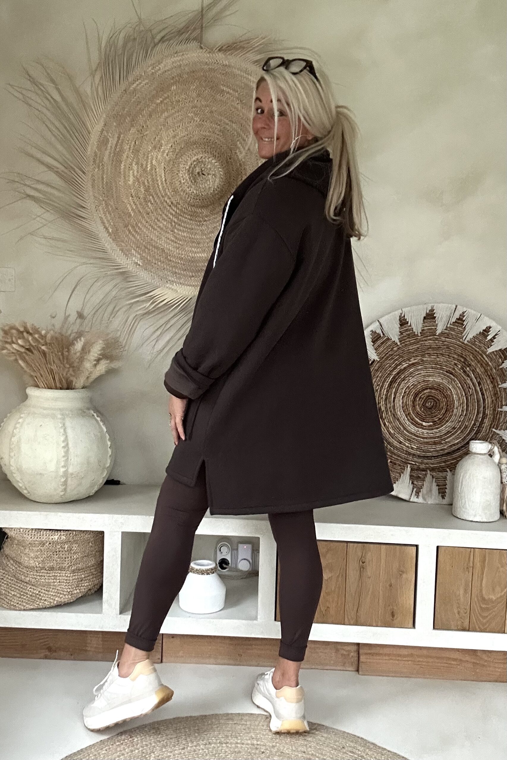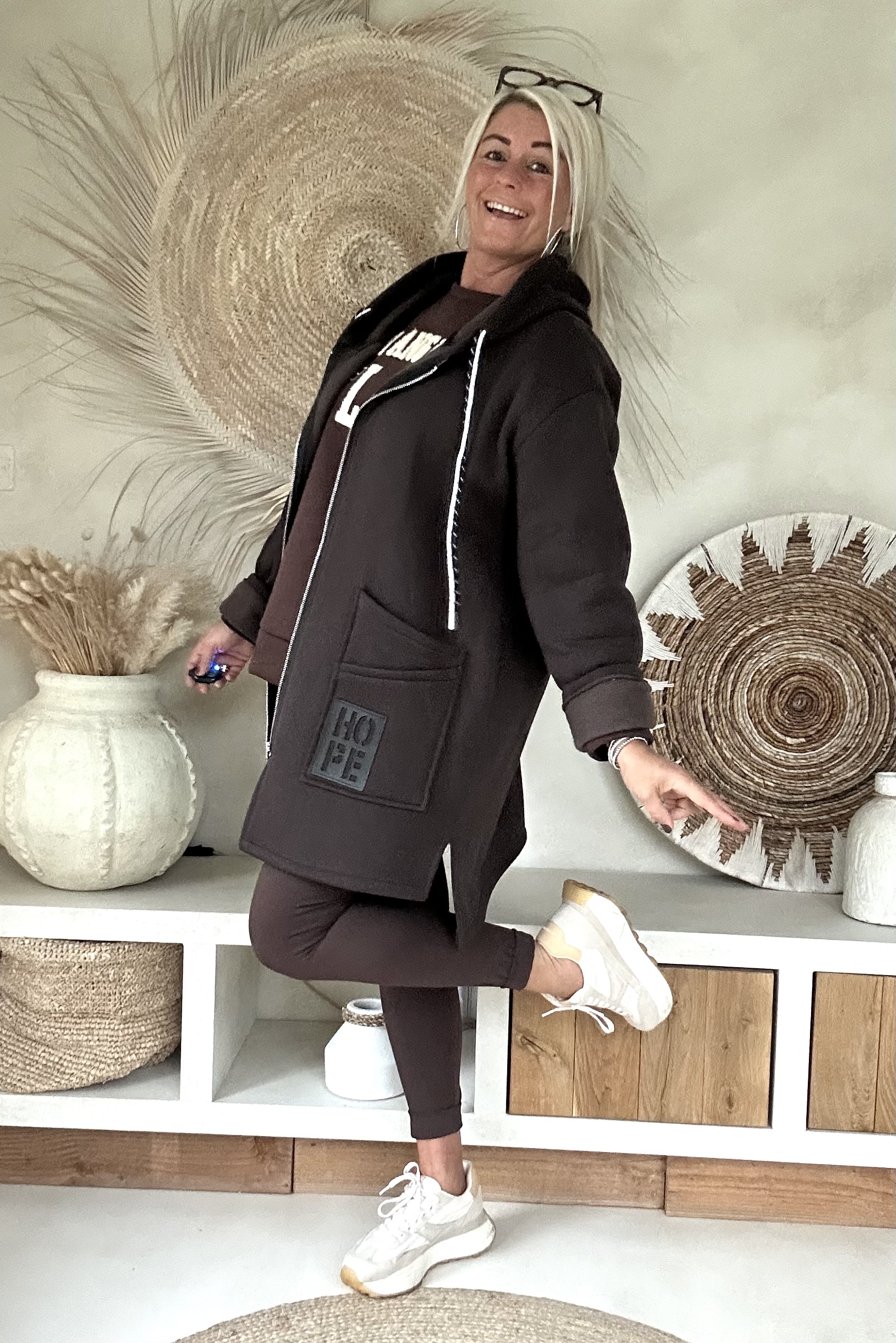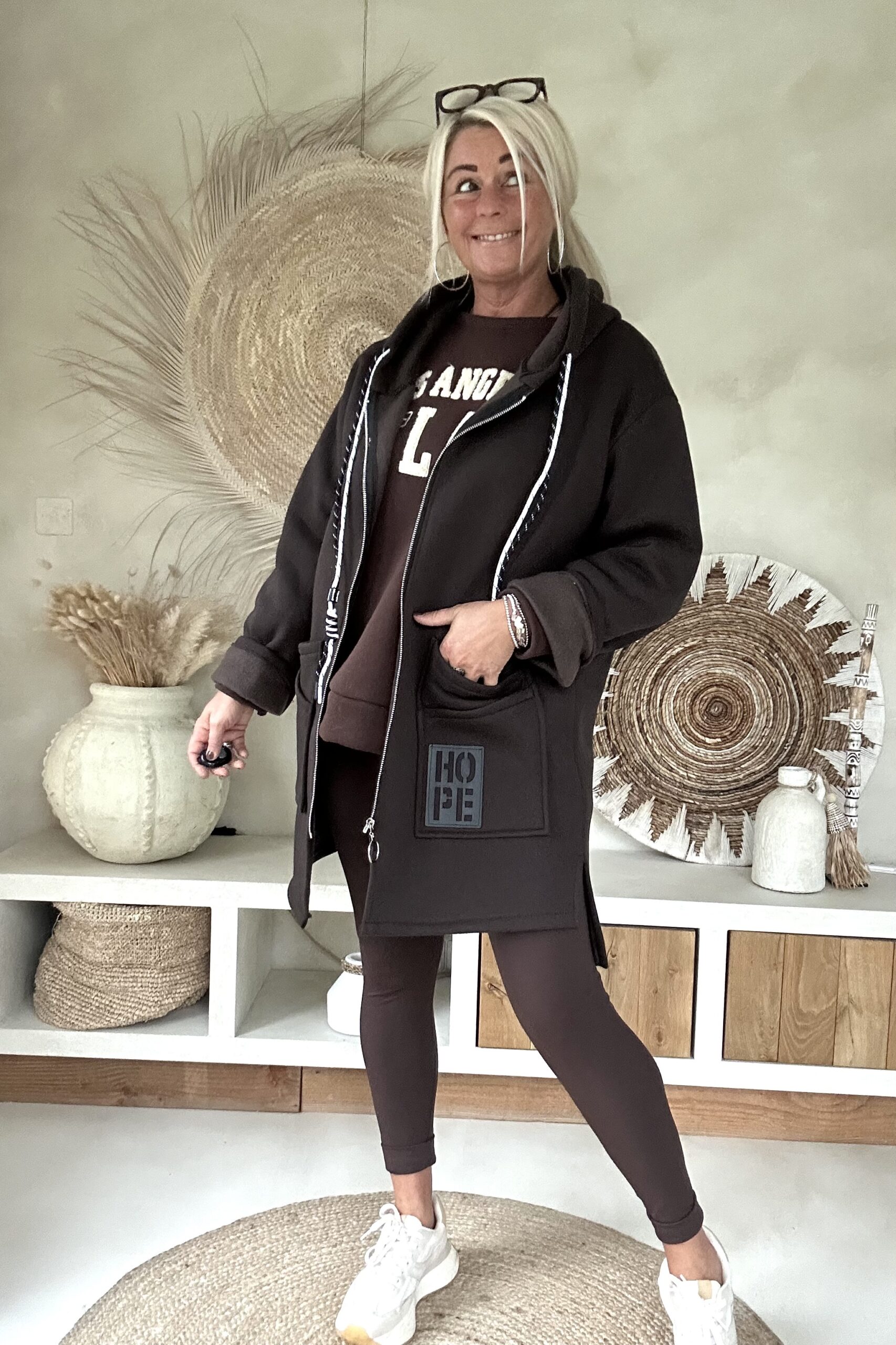 Comfortabel lang vest met een stoere uitstraling. Het vest heeft een capuchon met opvallende zwart-witte trekkoorden, opgestikte zakken met ‘HOPE’-patch en een robuuste ritssluiting. De zijkanten zijn voorzien van kleine splitjes en de achterkant is iets langer dan de voorkant. Verkrijgbaar in beige en donkerbruin – perfect om casual te combineren met een sportieve look.