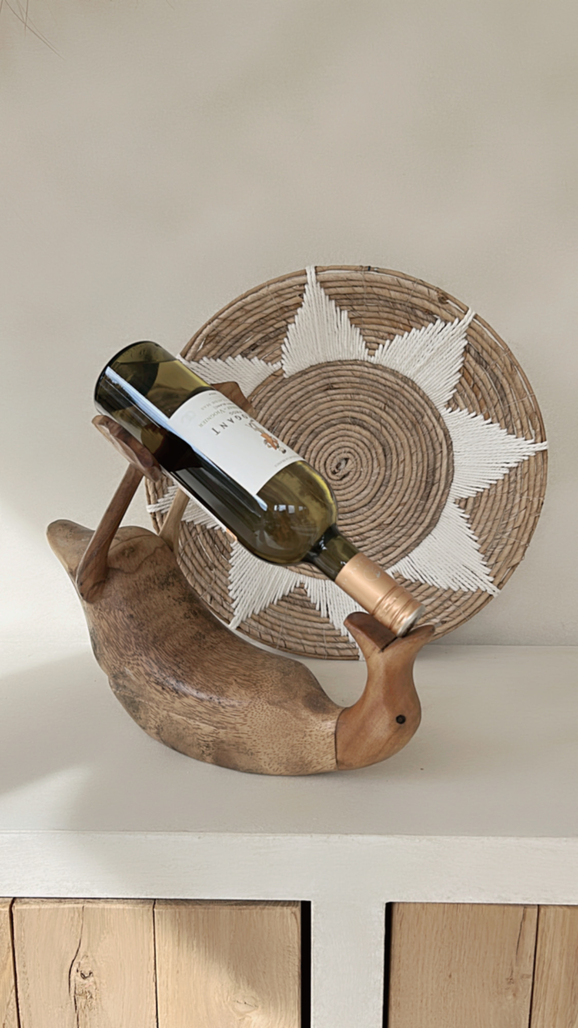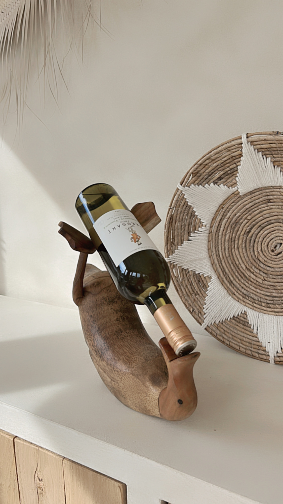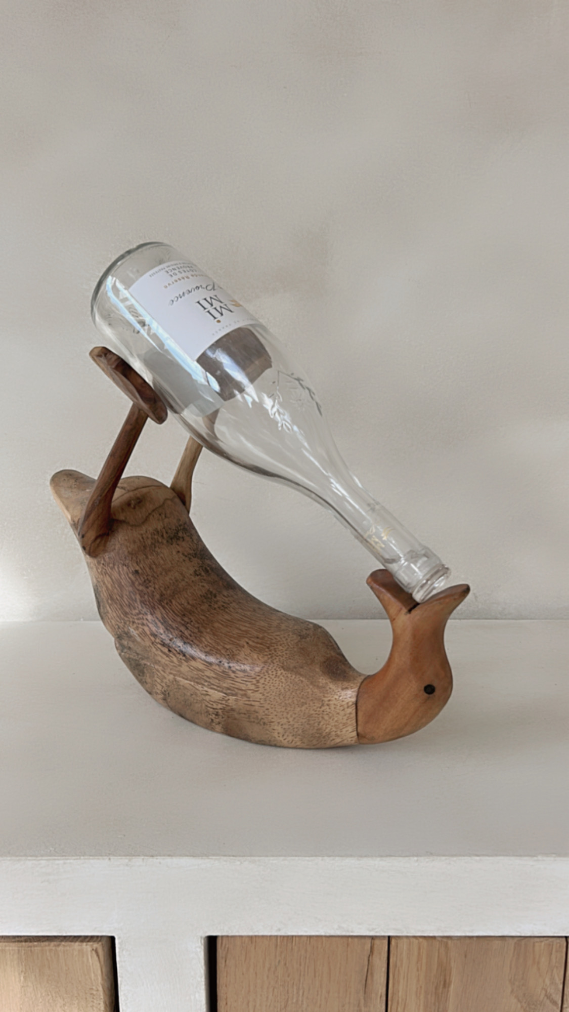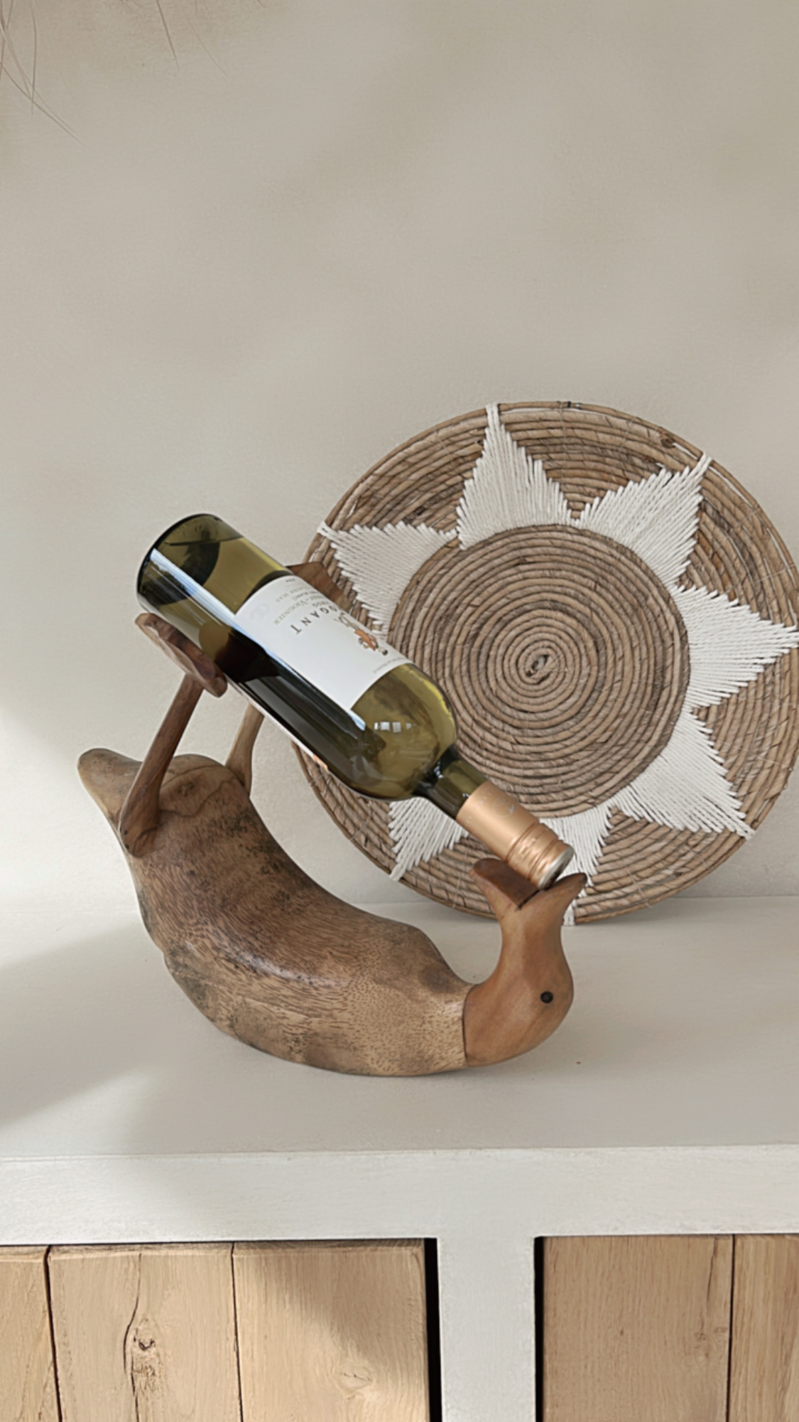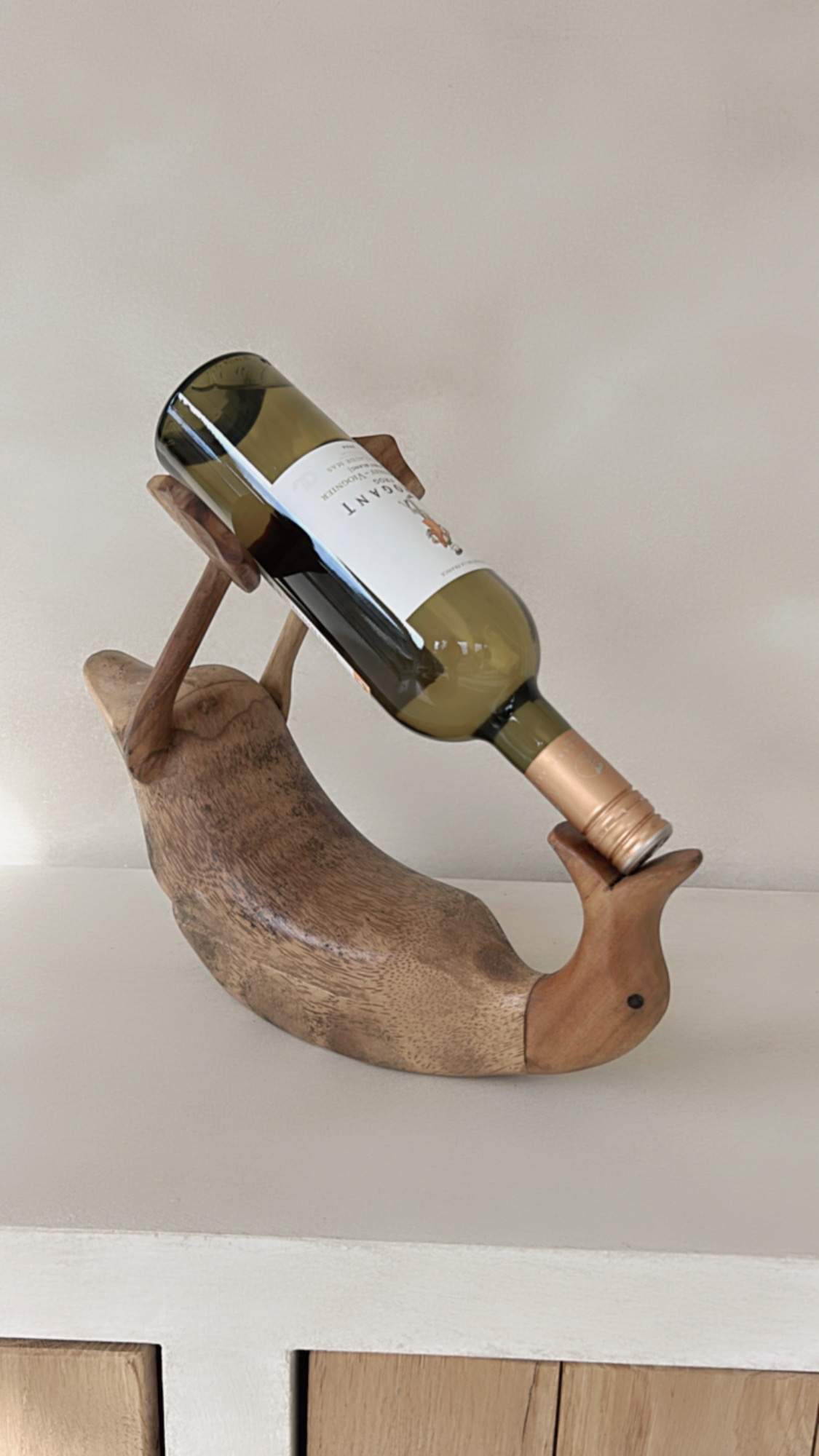 Deze speelse wijnhouder in de vorm van een eend steelt gegarandeerd de show. De ‘Drunken Duck’ houdt je fles wijn stevig vast met zijn snavel én pootjes, alsof hij nét iets te diep in het glaasje heeft gekeken. Gemaakt van massief hout, met oog voor detail en een warme, natuurlijke afwerking.