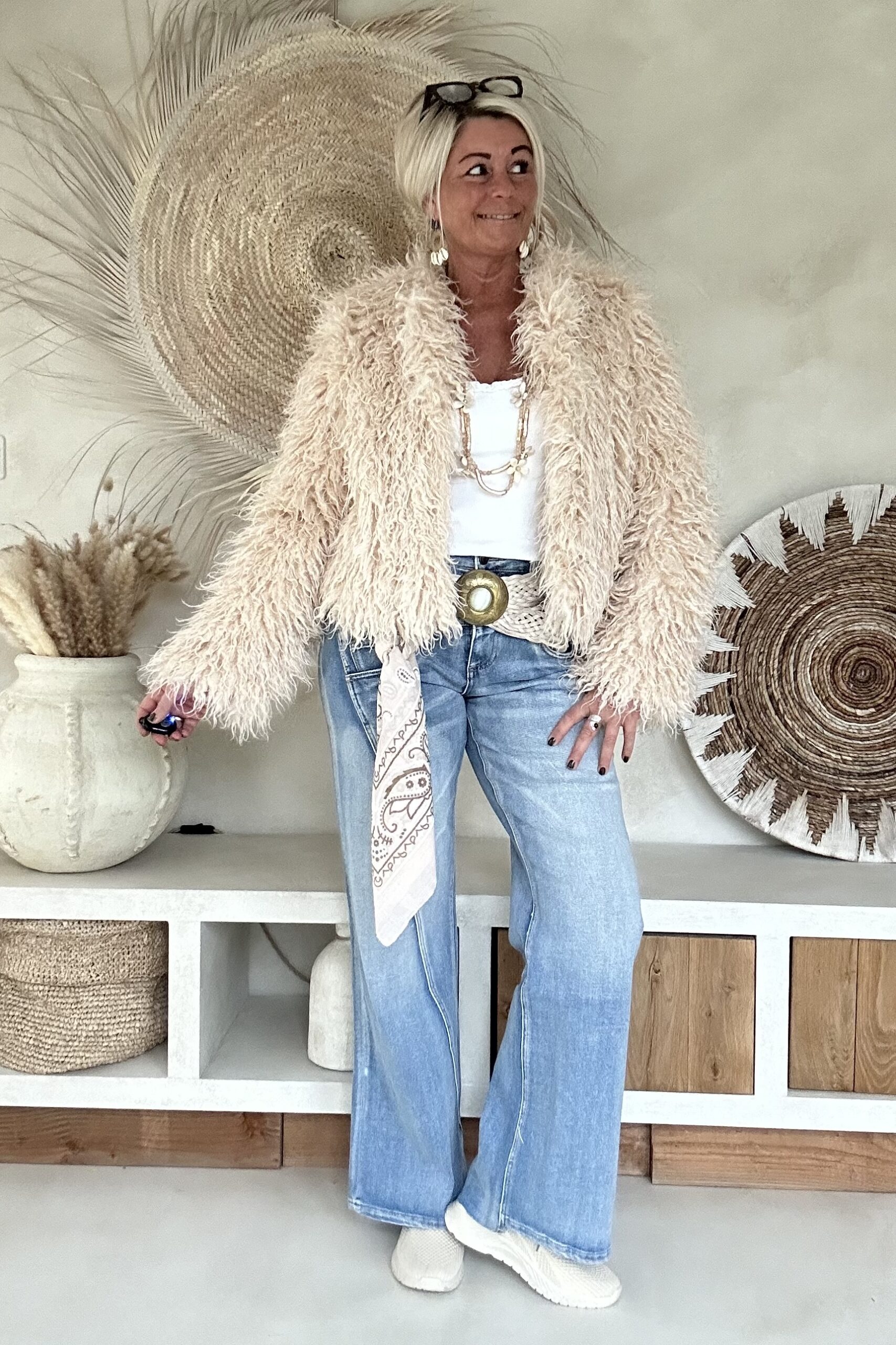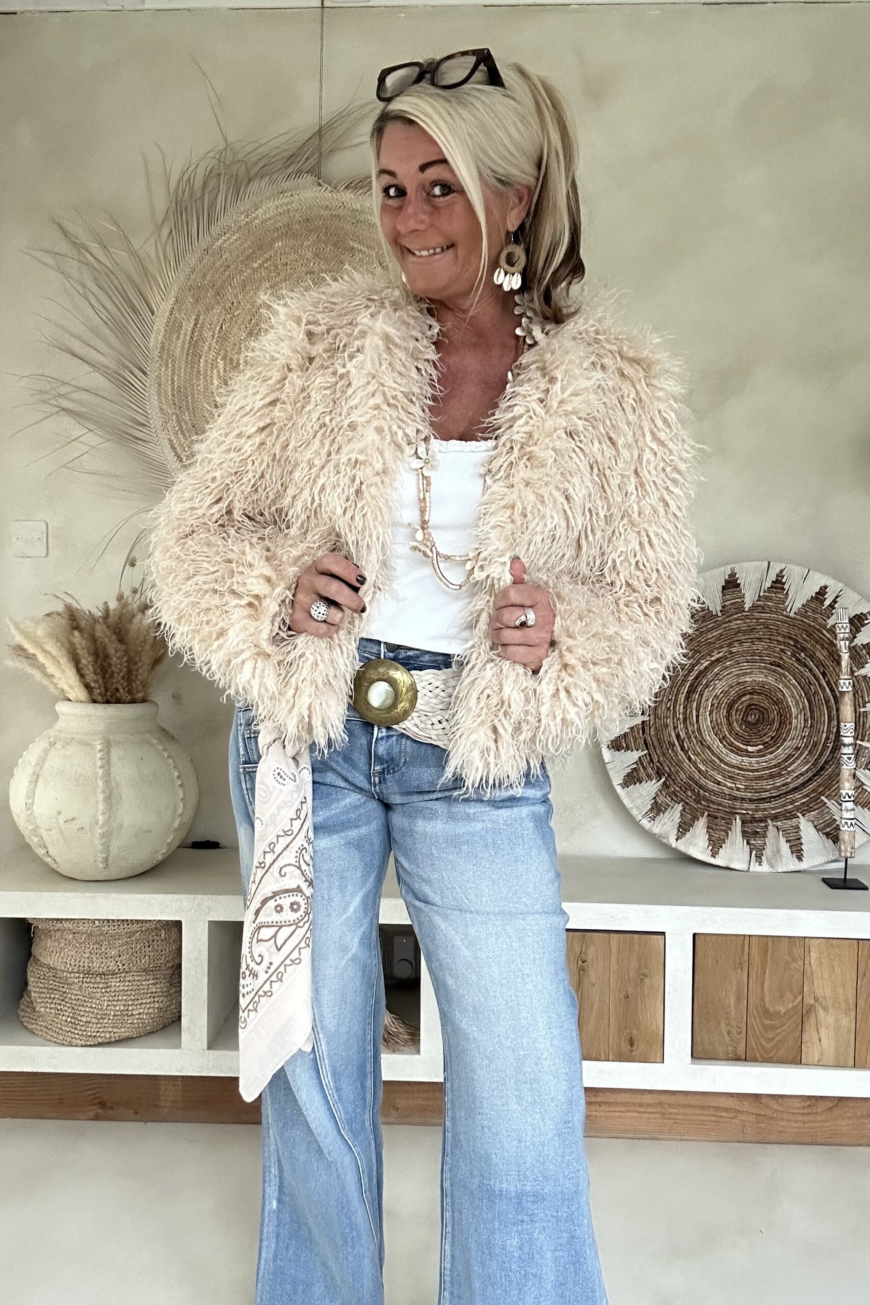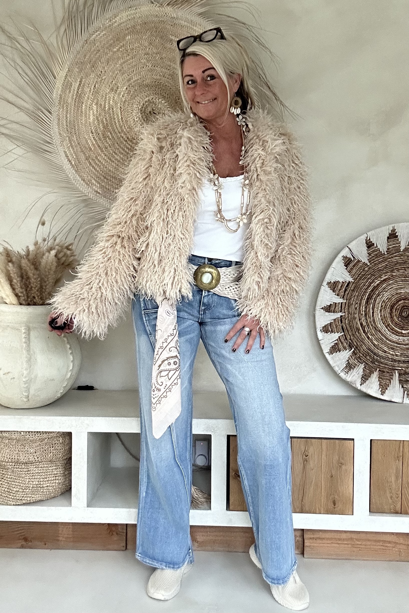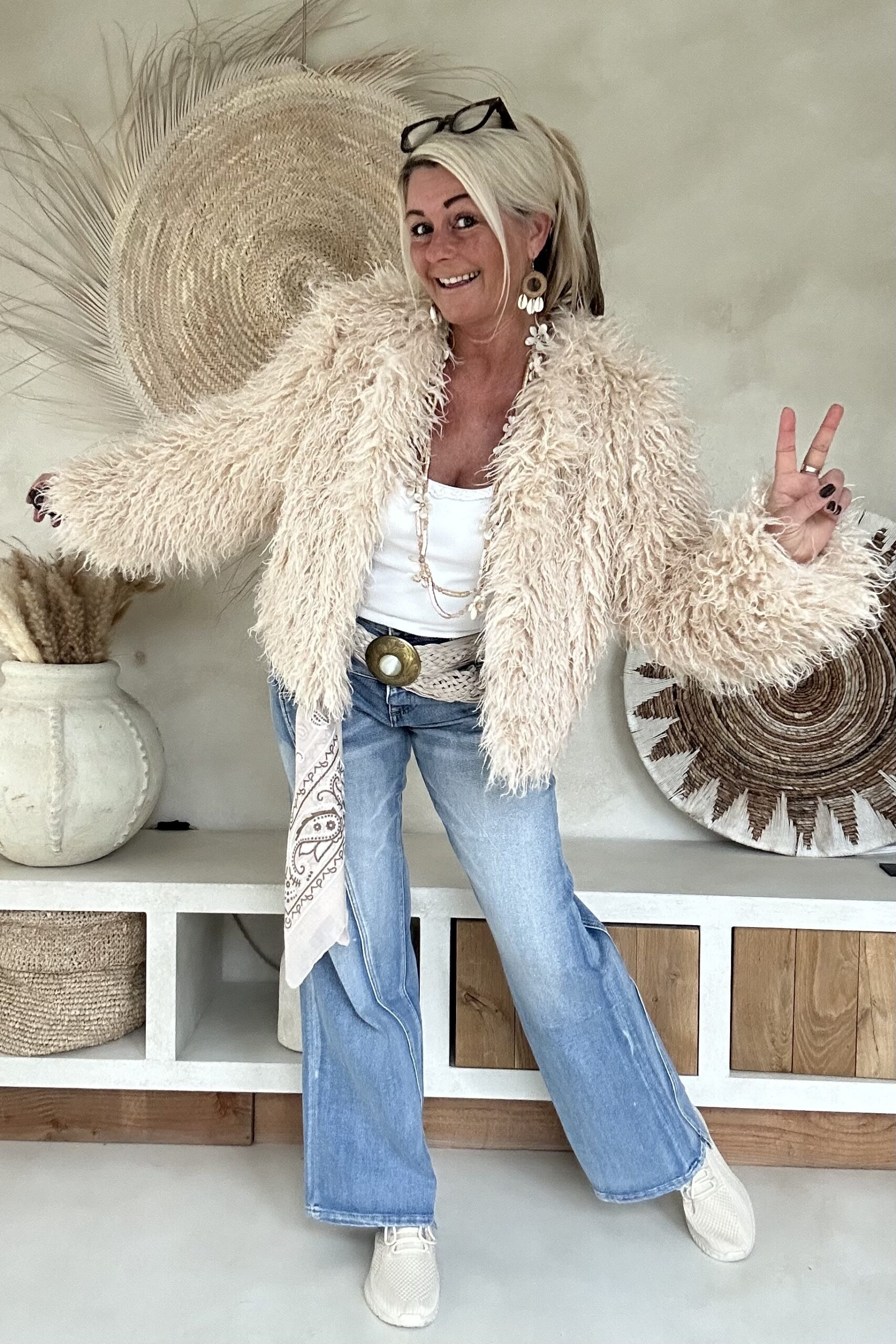 Het jasje sluit met subtiele haakjes aan de voorkant en valt soepel om het lichaam. De zachte fluffy structuur maakt ’m tot een echte eyecatcher zonder overdreven te zijn. Mooi op een jeans of de Charlie jogpant, maar ook heel tof in een boho look over een jurk. Daarnaast laat hij zich ook prima chique stylen.