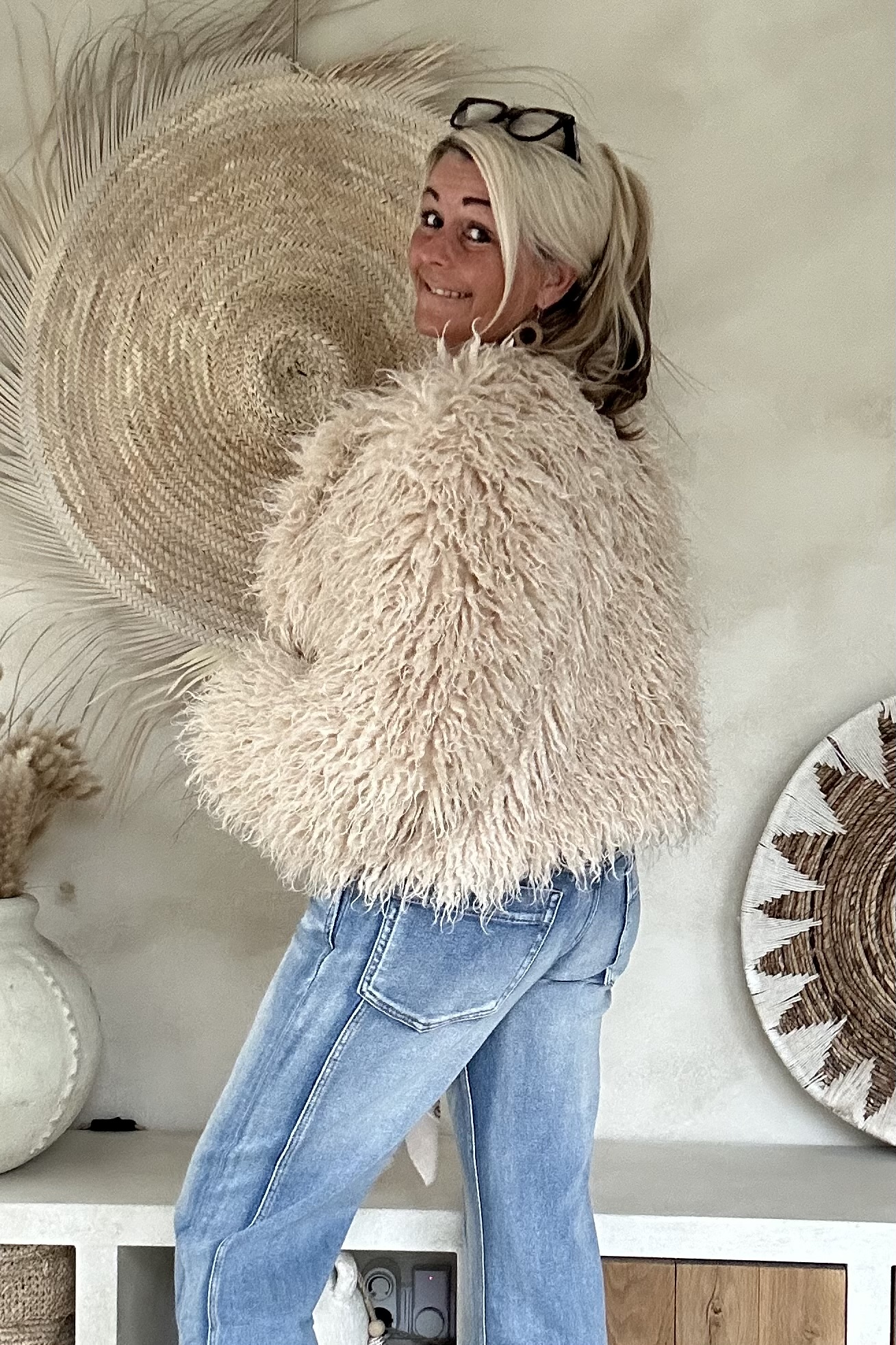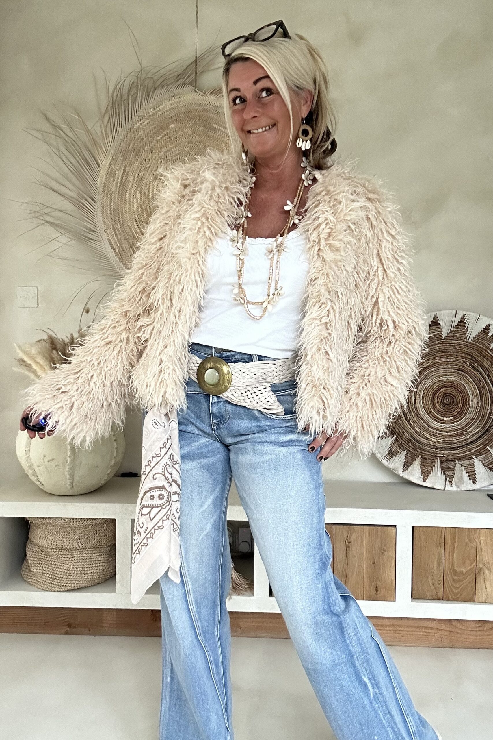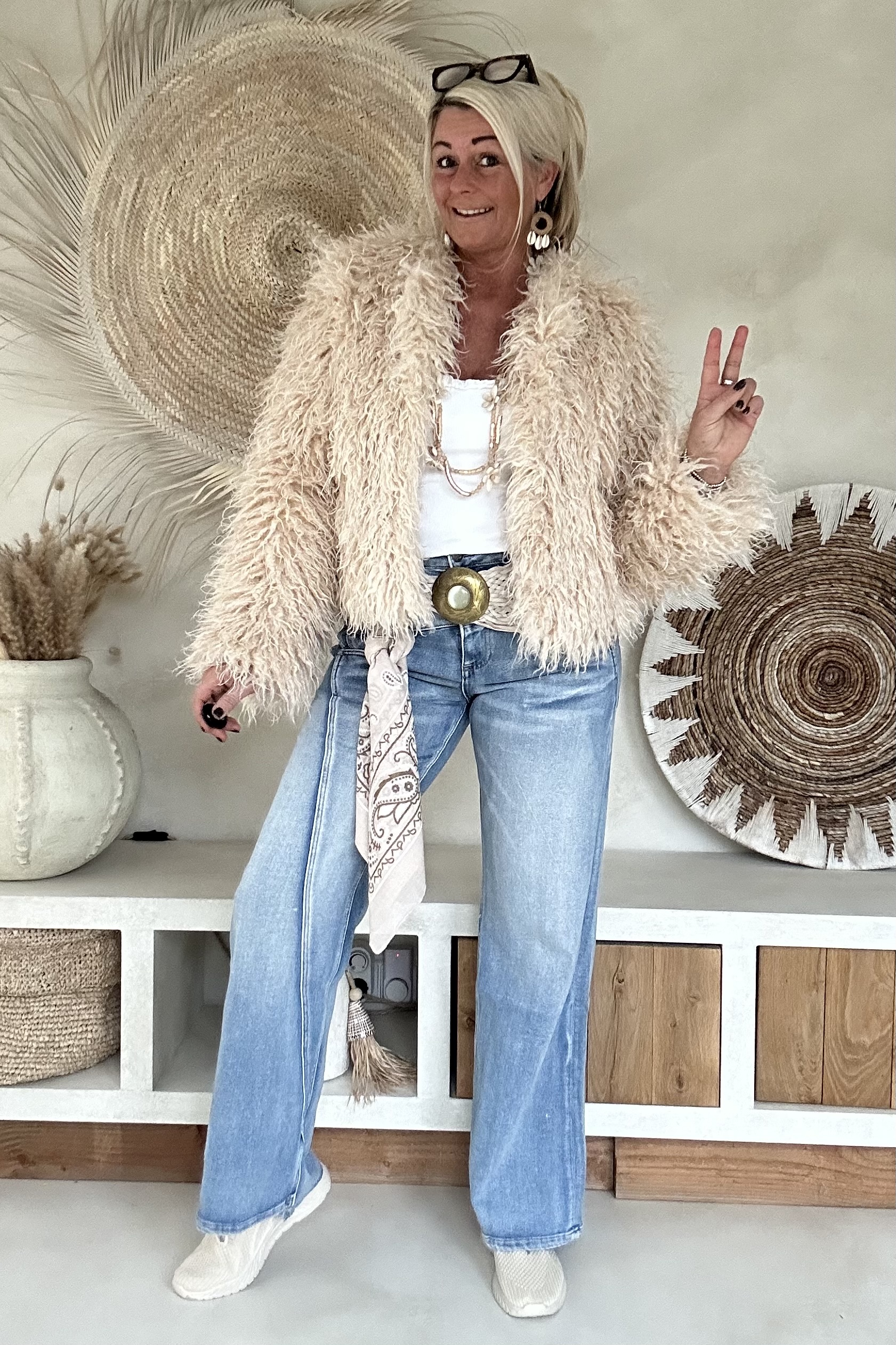 Het jasje sluit met subtiele haakjes aan de voorkant en valt soepel om het lichaam. De zachte fluffy structuur maakt ’m tot een echte eyecatcher zonder overdreven te zijn. Mooi op een jeans of de Charlie jogpant, maar ook heel tof in een boho look over een jurk. Daarnaast laat hij zich ook prima chique stylen.