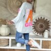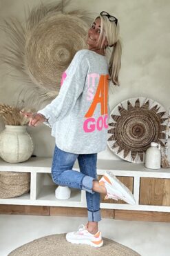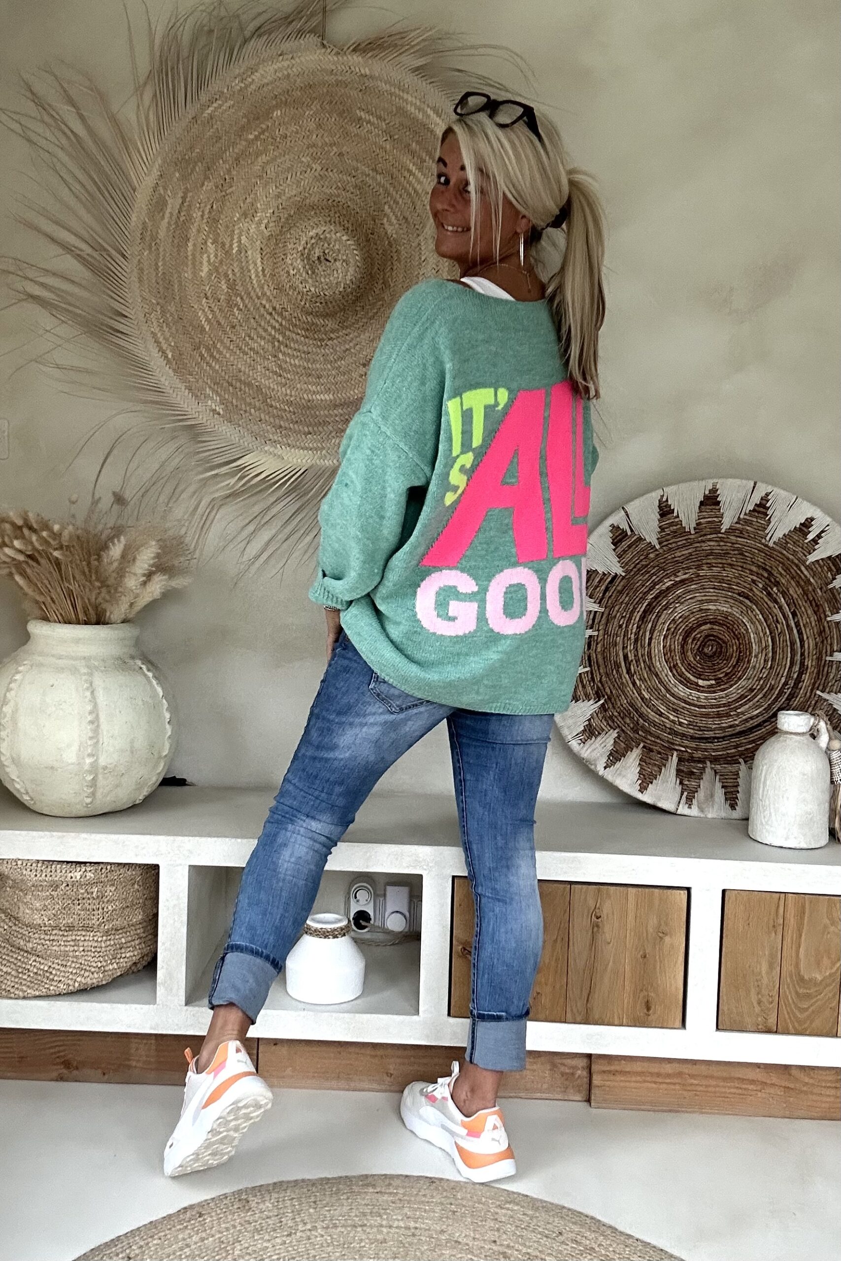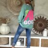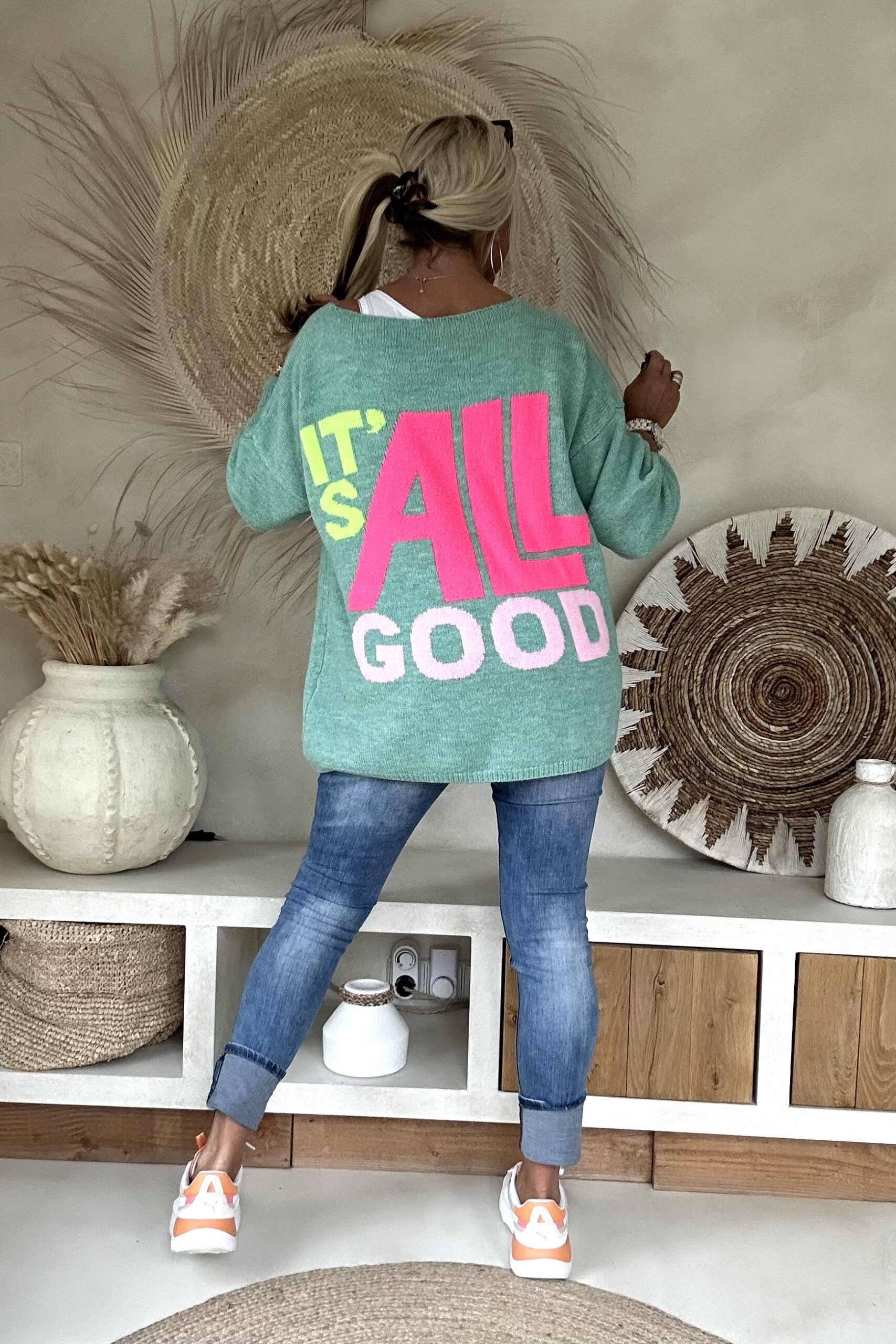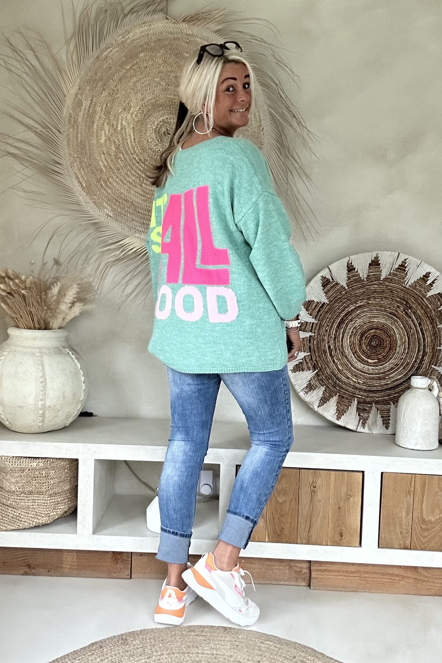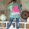 Deze heerlijk comfortabele trui straalt pure good vibes uit met de speelse tekst “It’s All Good” op de rug en een ingeweven smiley op de voorkant. De oversized pasvorm en zachte knit maken hem perfect voor een relaxte hippie- of Ibiza-look. Draag hem casual met een jeans en sneakers of combineer hem met een flared broek voor die ultieme boho-stijl. Valt ruim en heeft een pasbereik tot en met maat 46. Het model draagt normaal maat 38 en is 1.66m lang.
