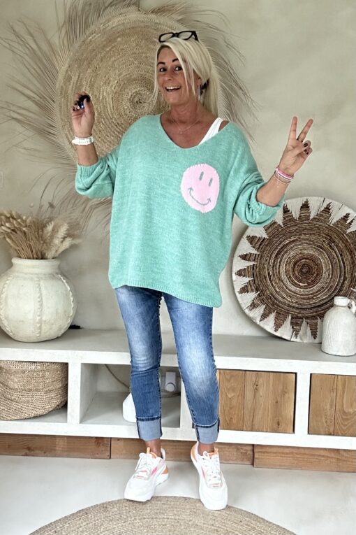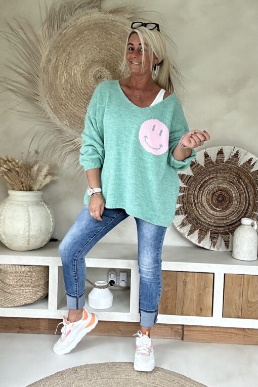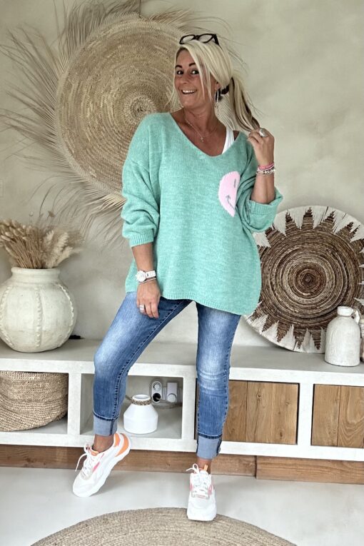 Gebreide Trui Macy met Smiley en Backprint, Aqua.