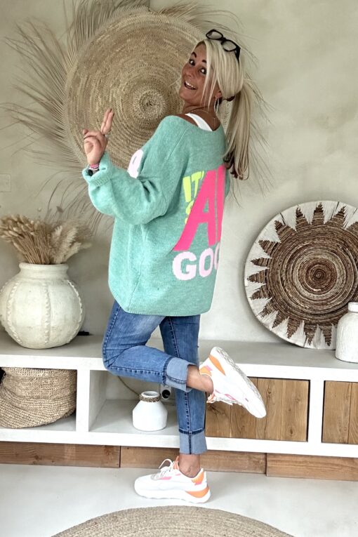 Deze heerlijk comfortabele trui straalt pure good vibes uit met de speelse tekst “It’s All Good” op de rug en een ingeweven smiley op de voorkant. De oversized pasvorm en zachte knit maken hem perfect voor een relaxte hippie- of Ibiza-look. Draag hem casual met een jeans en sneakers of combineer hem met een flared broek voor die ultieme boho-stijl. Valt ruim en heeft een pasbereik tot en met maat 46. Het model draagt normaal maat 38 en is 1.66m lang.
