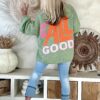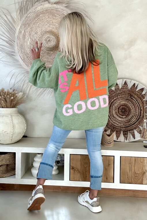 Deze heerlijk comfortabele trui straalt pure good vibes uit met de speelse tekst “It’s All Good” op de rug en een ingeweven smiley op de voorkant. De oversized pasvorm en zachte knit maken hem perfect voor een relaxte hippie- of Ibiza-look. Draag hem casual met een jeans en sneakers of combineer hem met een flared broek voor die ultieme boho-stijl. Valt ruim en heeft een pasbereik tot en met maat 46. Het model draagt normaal maat 38 en is 1.66m lang.