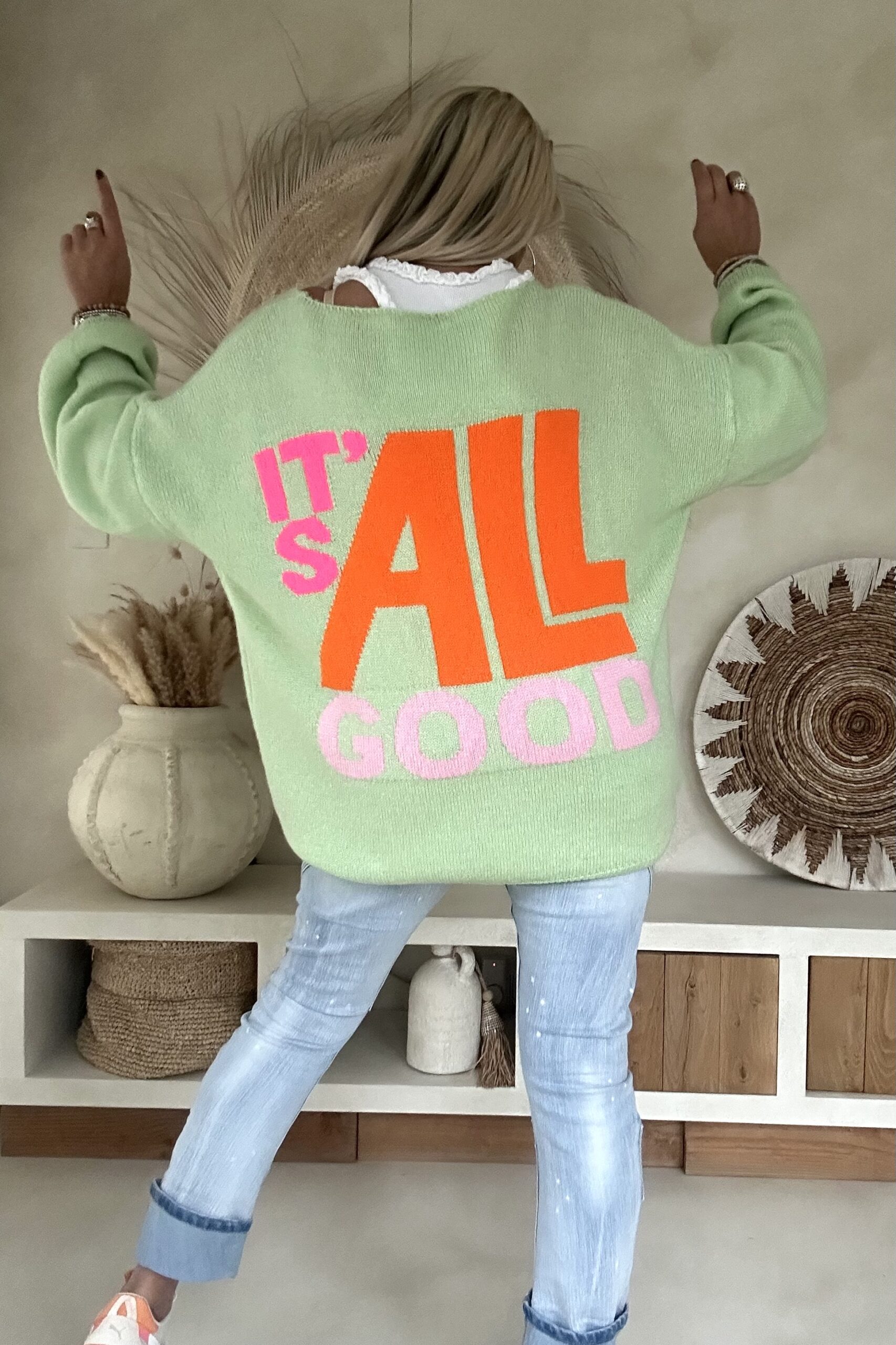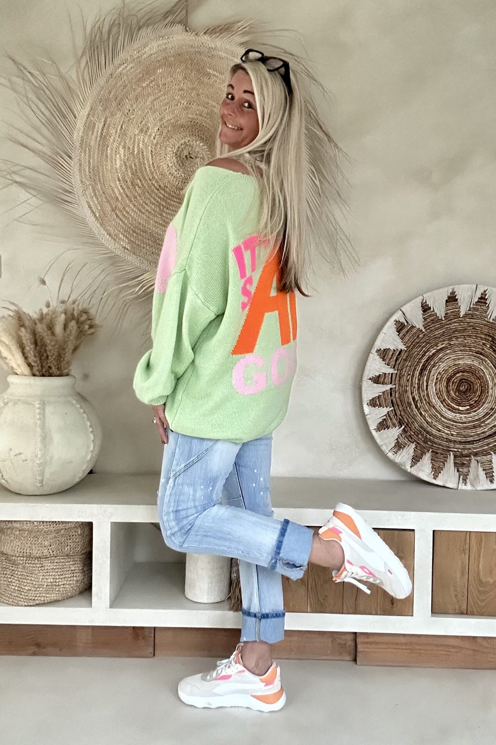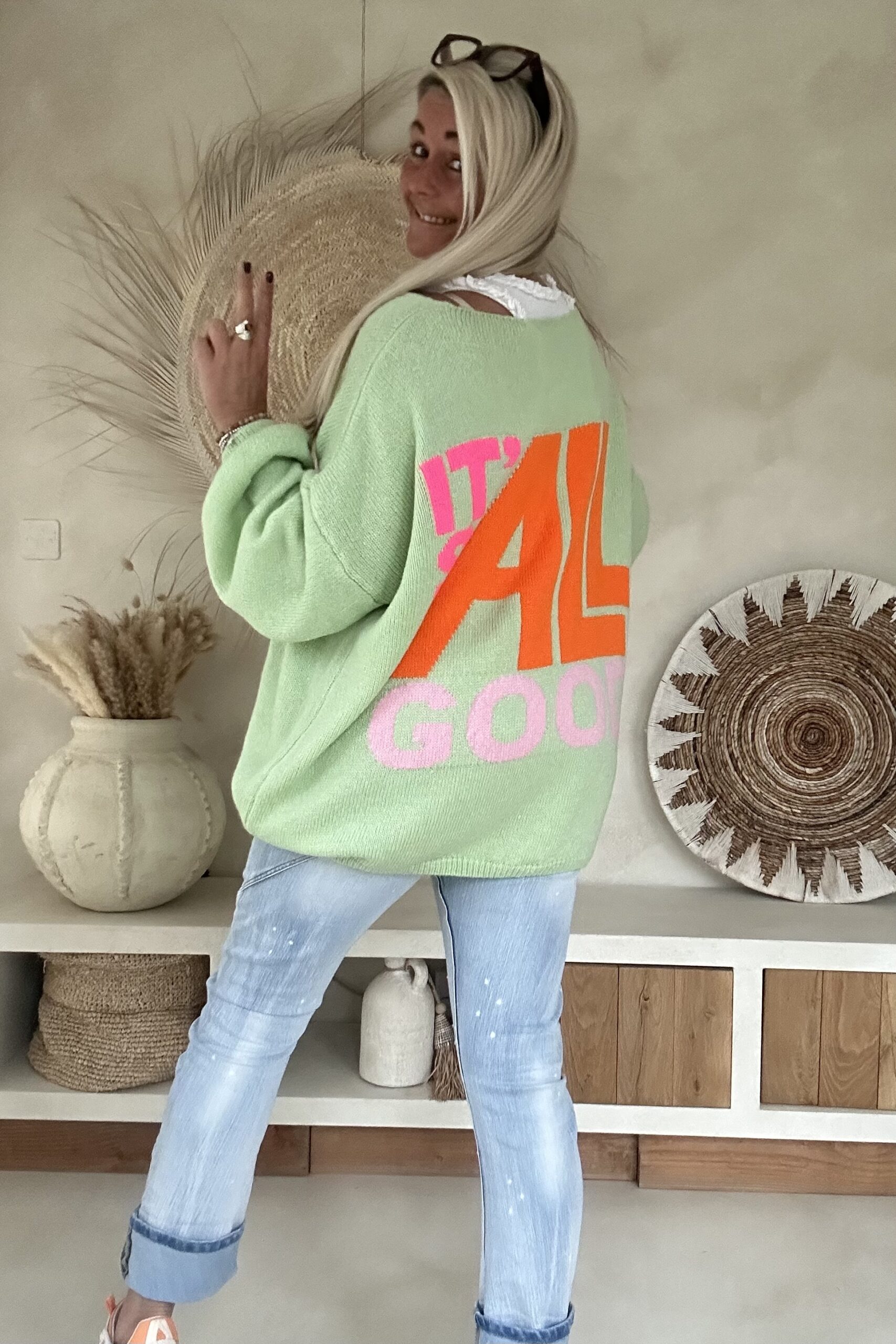 Deze heerlijk comfortabele trui straalt pure good vibes uit met de speelse tekst “It’s All Good” op de rug en een ingeweven smiley op de voorkant. De oversized pasvorm en zachte knit maken hem perfect voor een relaxte hippie- of Ibiza-look. Draag hem casual met een jeans en sneakers of combineer hem met een flared broek voor die ultieme boho-stijl. Valt ruim en heeft een pasbereik tot en met 46. Het model draagt normaal maat 38 en is 1.66m lang.