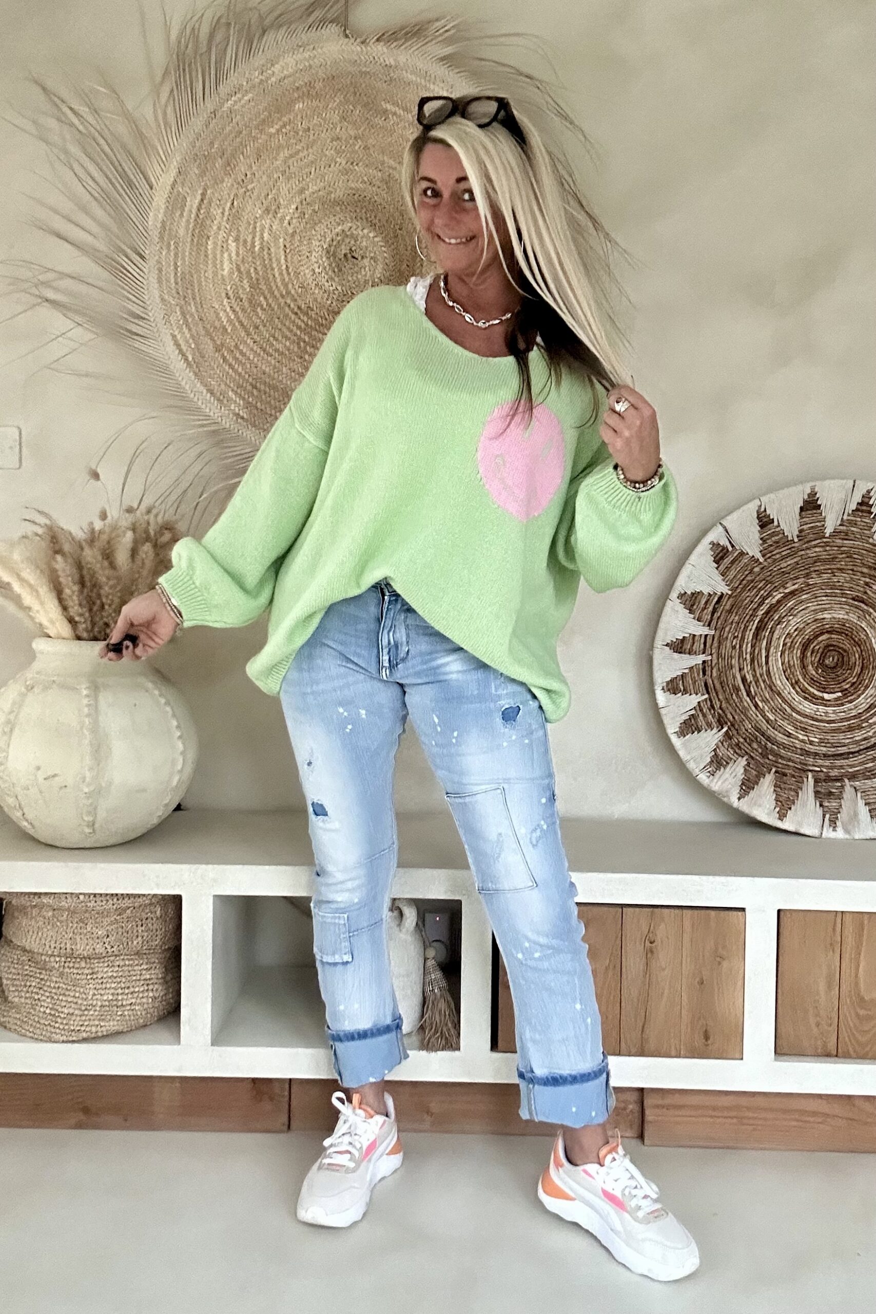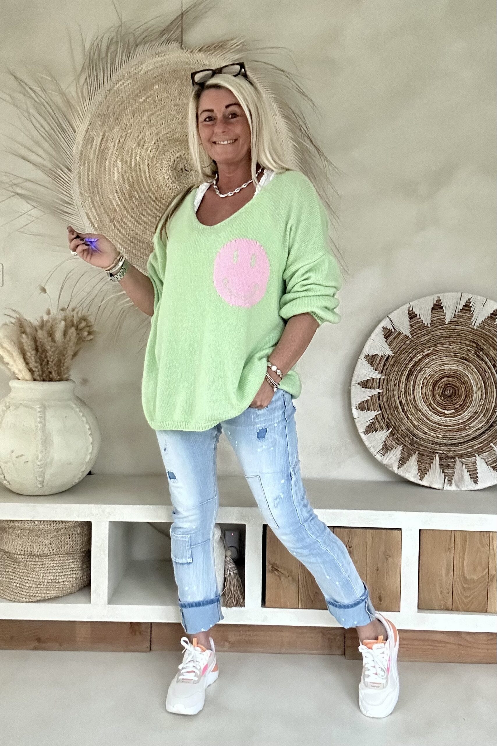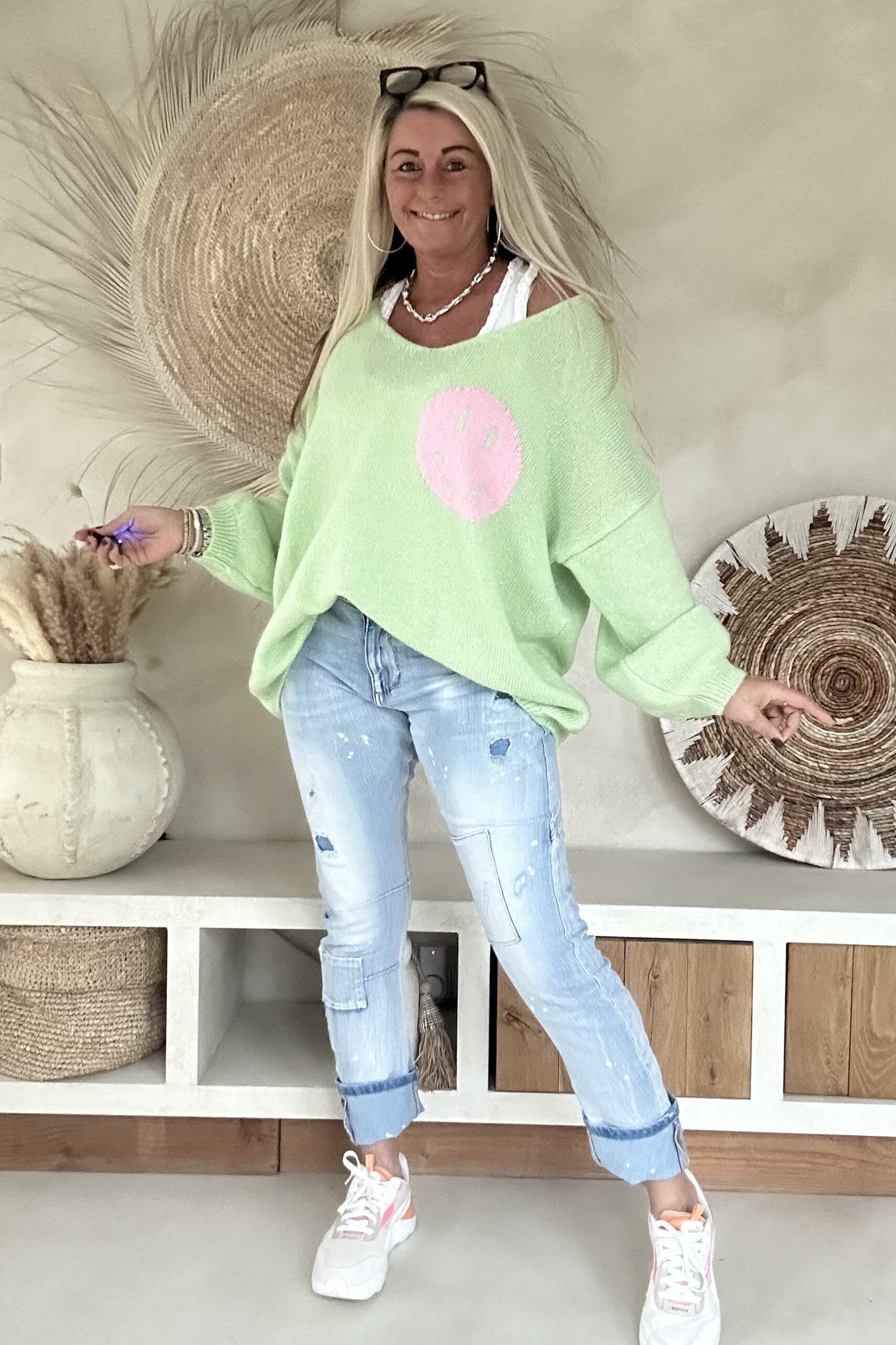 Deze heerlijk comfortabele trui straalt pure good vibes uit met de speelse tekst “It’s All Good” op de rug en een ingeweven smiley op de voorkant. De oversized pasvorm en zachte knit maken hem perfect voor een relaxte hippie- of Ibiza-look. Draag hem casual met een jeans en sneakers of combineer hem met een flared broek voor die ultieme boho-stijl. Valt ruim en heeft een pasbereik tot en met 46. Het model draagt normaal maat 38 en is 1.66m lang.