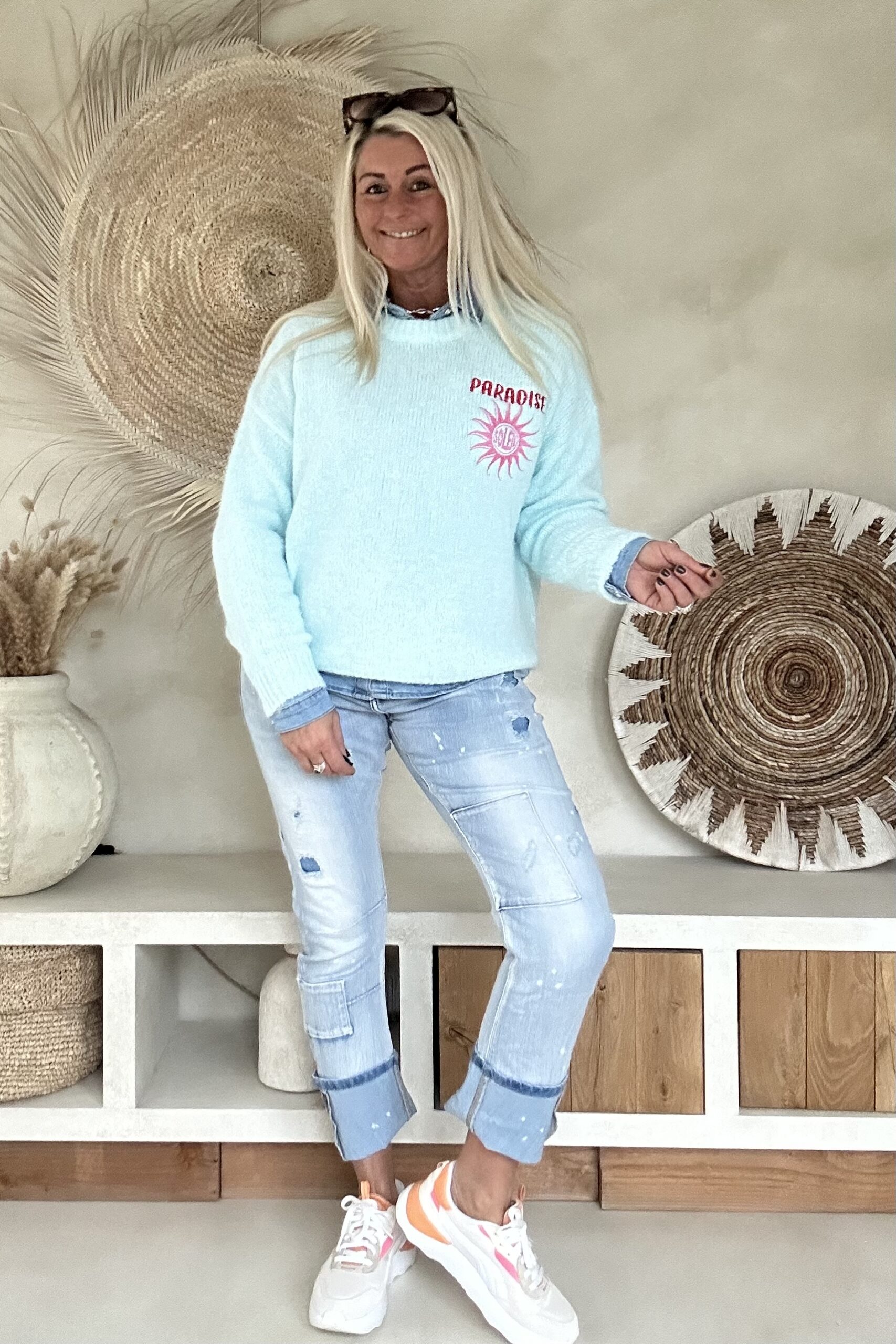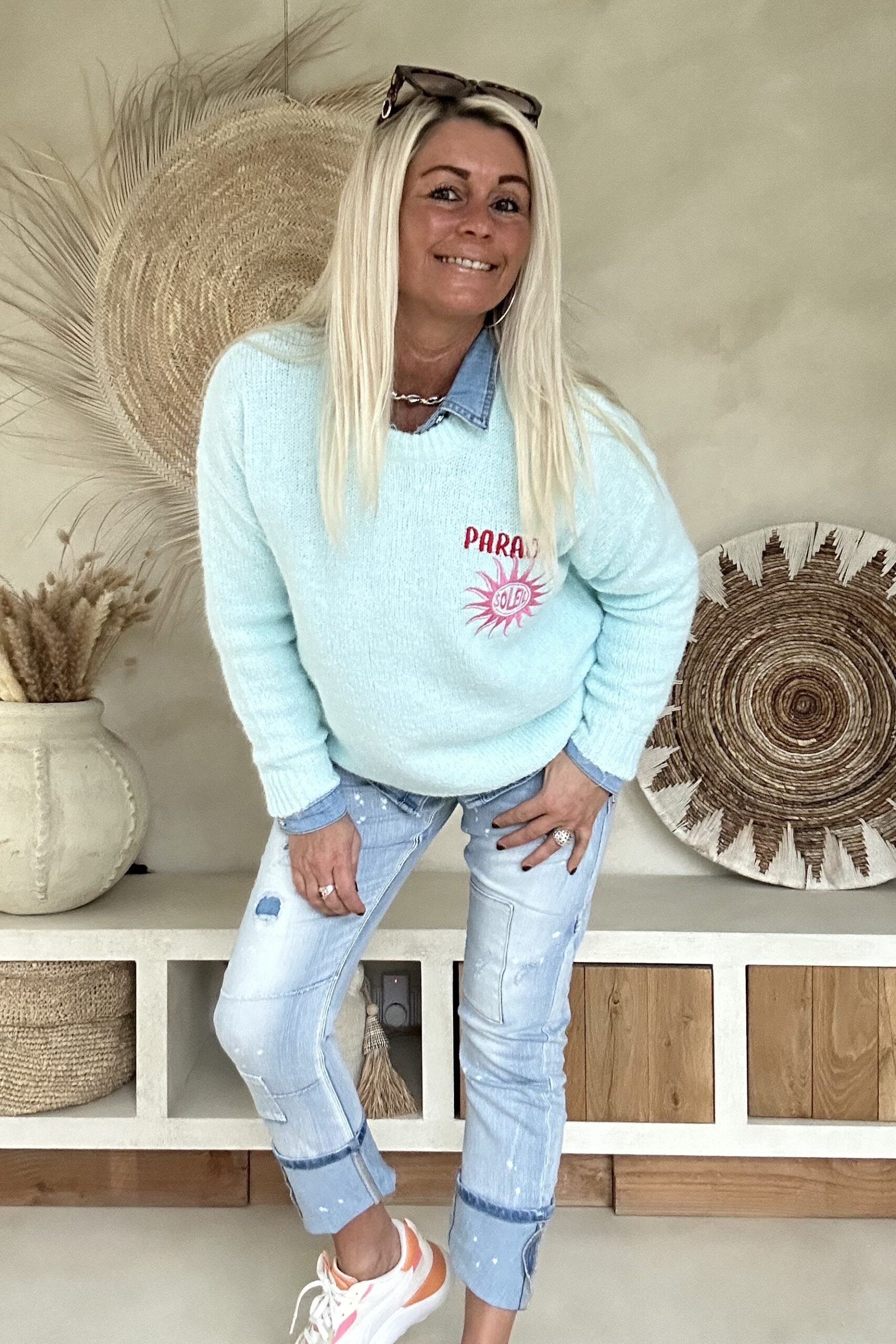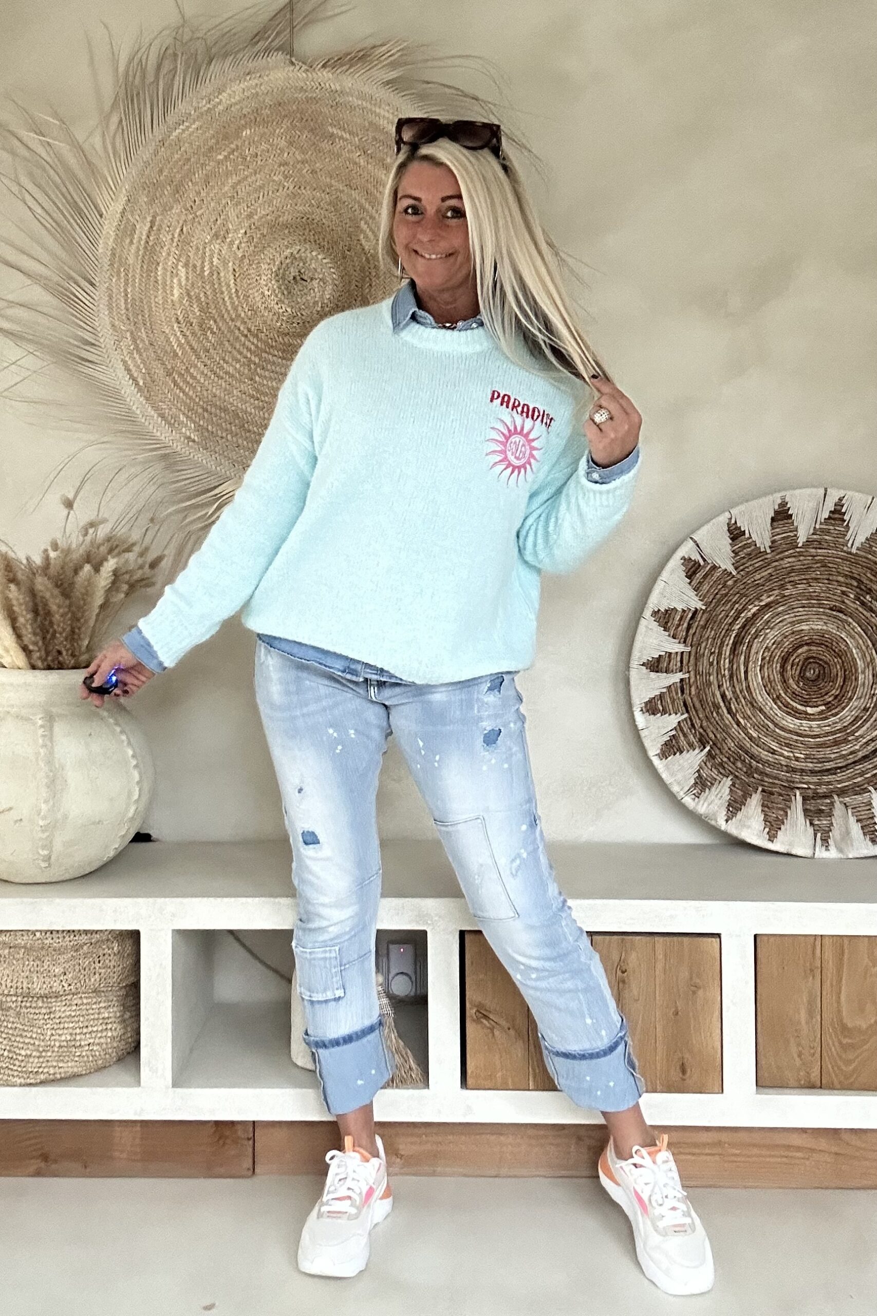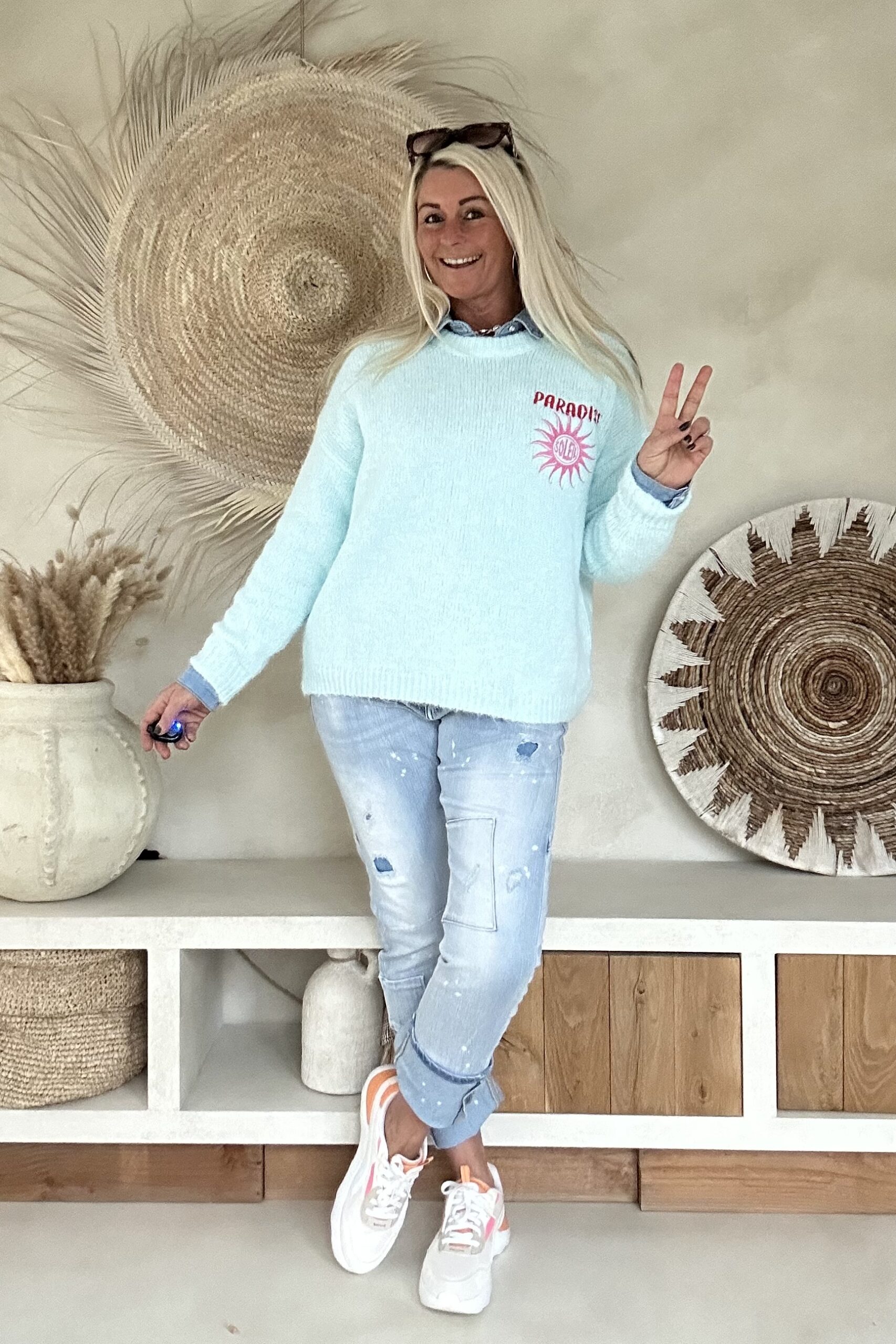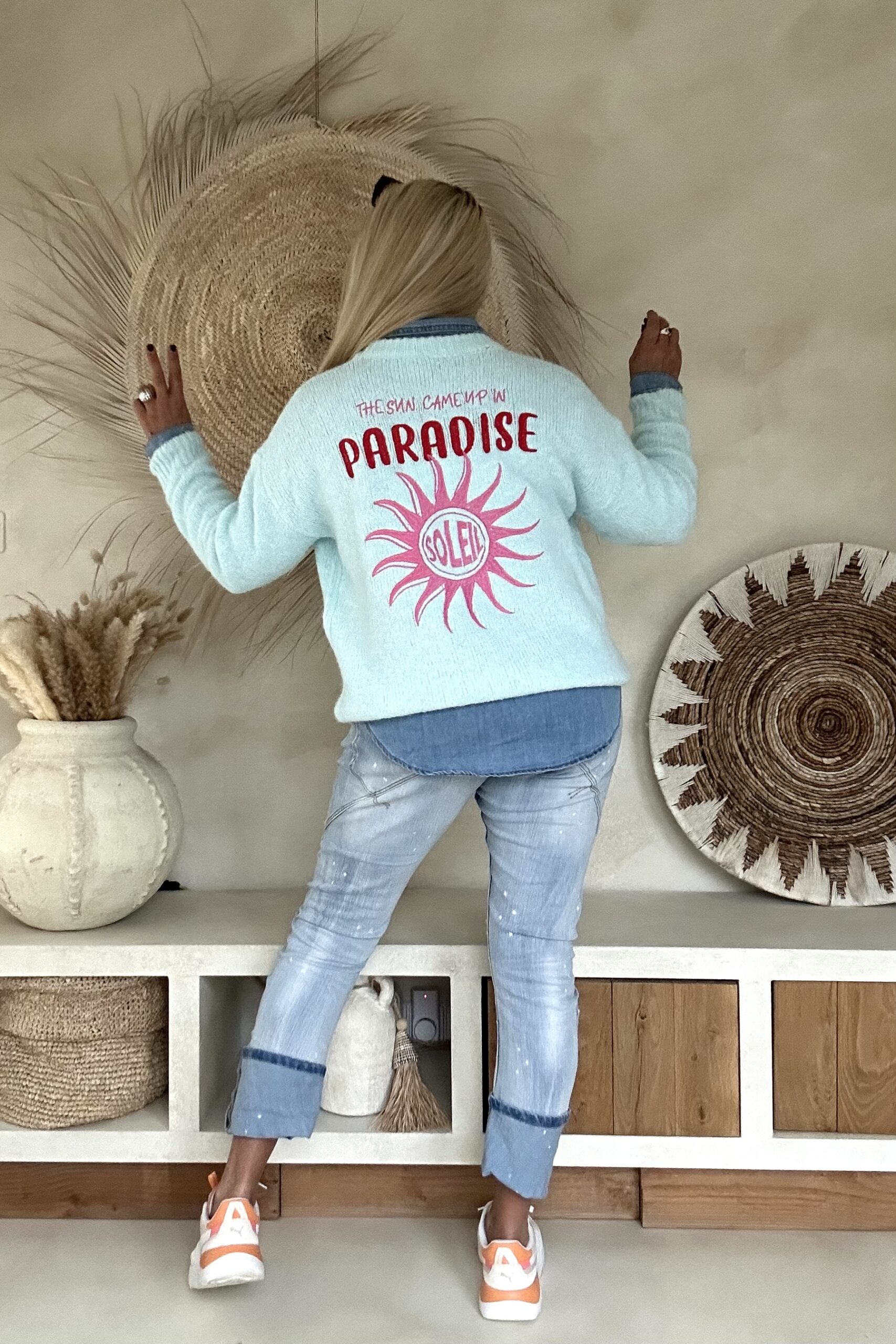 Deze super zachte en comfortabele trui brengt meteen een zonnige vibe in je outfit. Dankzij de fijne stretch draagt hij heerlijk en voelt hij soepel aan. De eyecatcher is de zonnige geborduurde print op de achterkant met de tekst “the sun came up in paradise”, die zorgt voor een speelse en vrolijke uitstraling. Perfect te combineren met de jeansblouse Billie en jeans Bobbie voor een casual maar stijlvolle look.