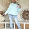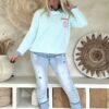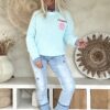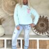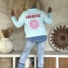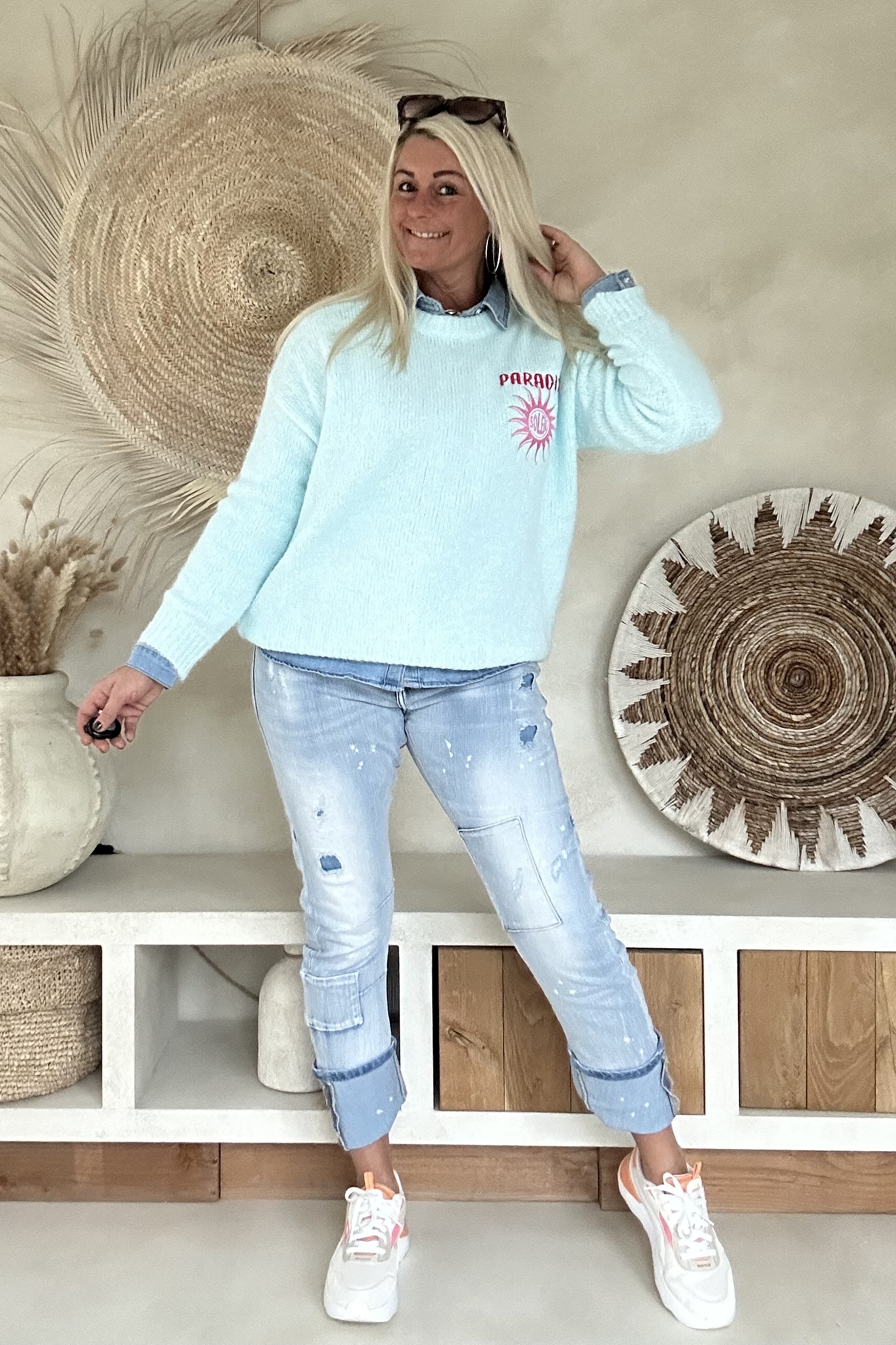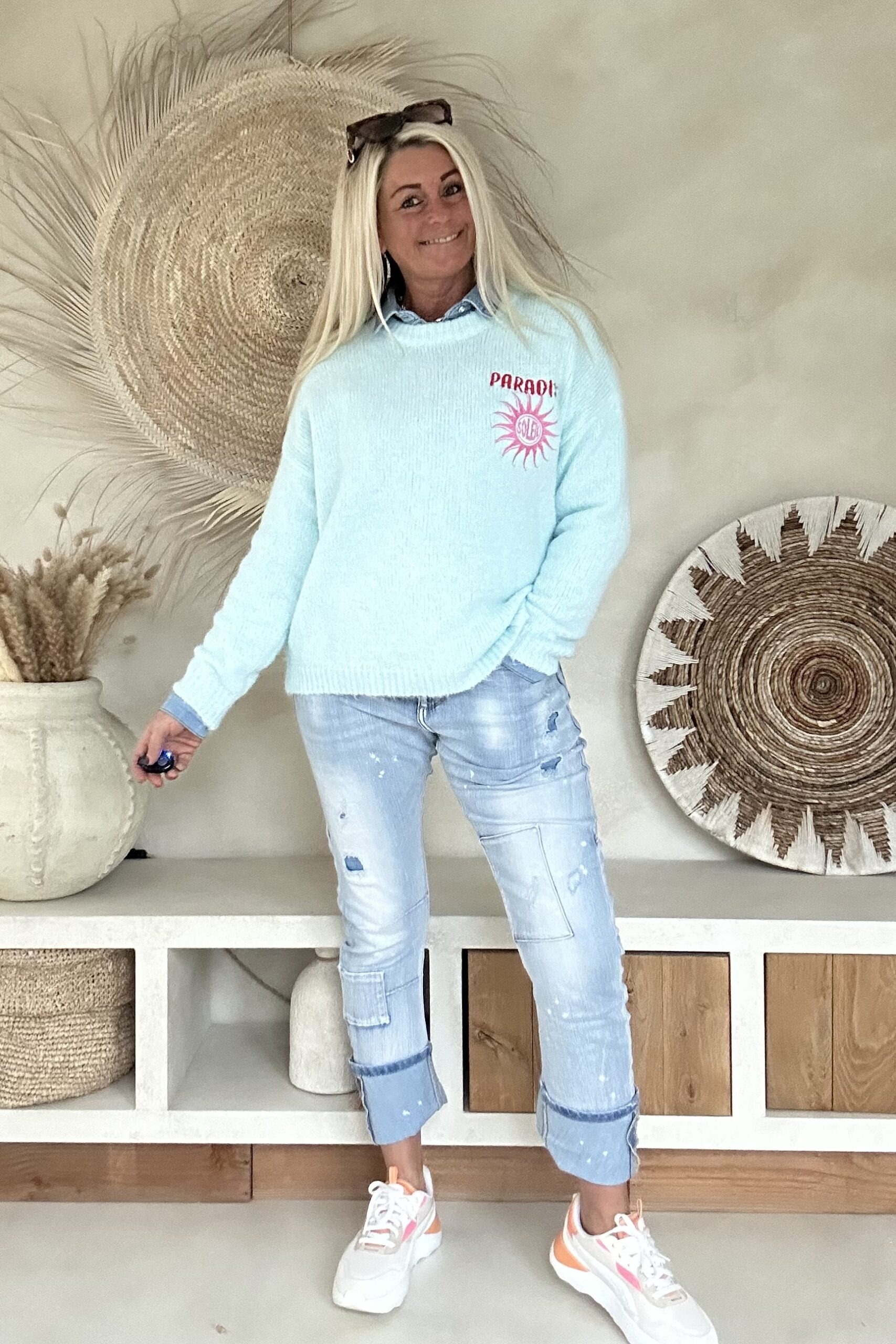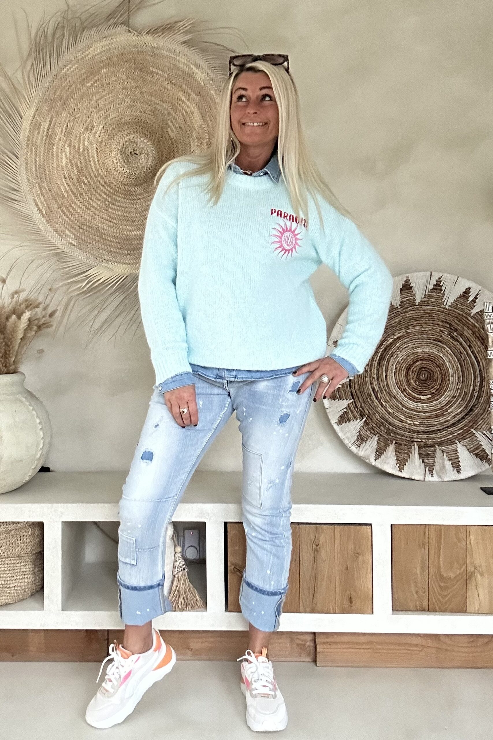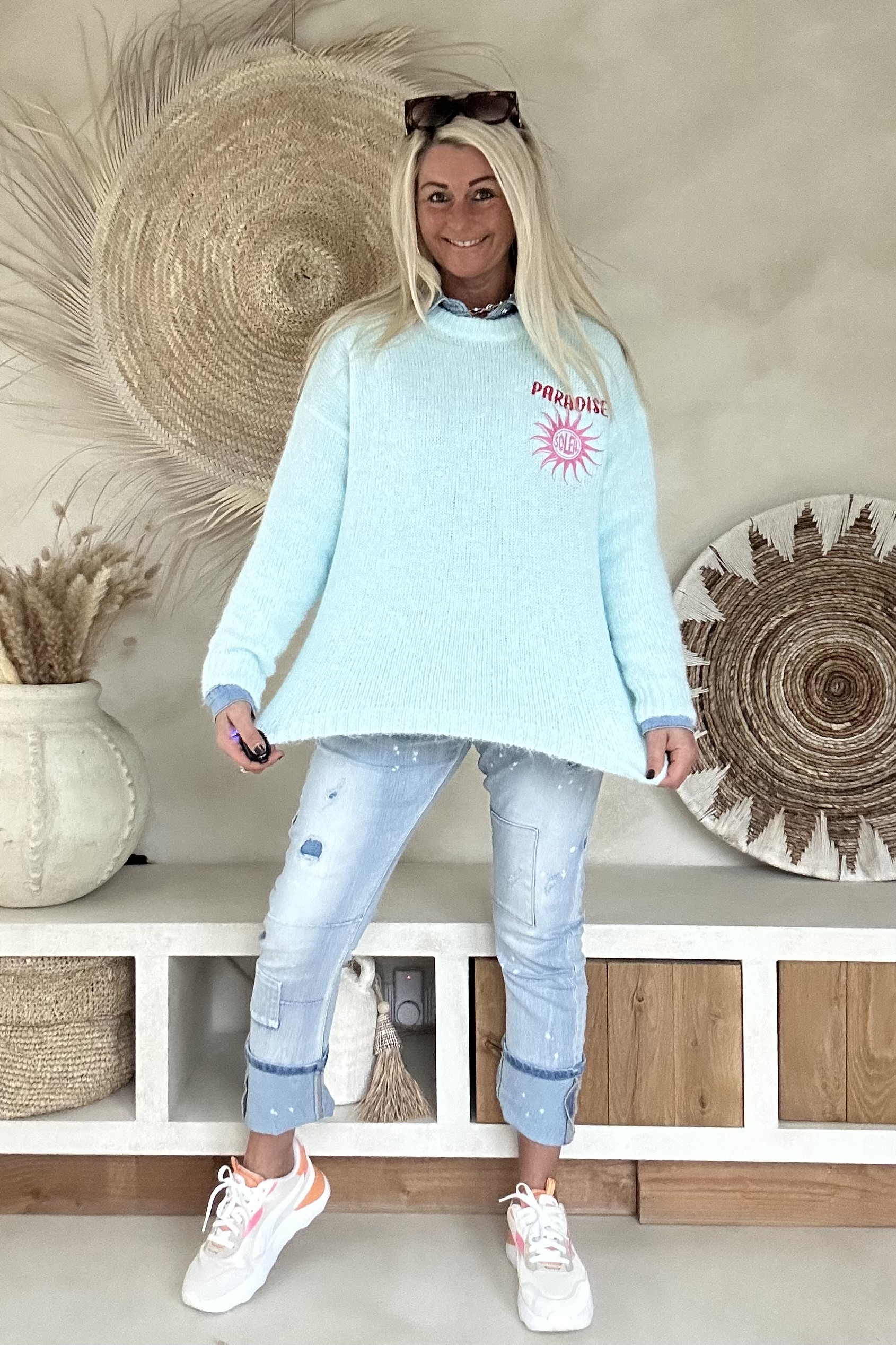 Deze super zachte en comfortabele trui brengt meteen een zonnige vibe in je outfit. Dankzij de fijne stretch draagt hij heerlijk en voelt hij soepel aan. De eyecatcher is de zonnige geborduurde print op de achterkant met de tekst “the sun came up in paradise”, die zorgt voor een speelse en vrolijke uitstraling. Perfect te combineren met de jeansblouse Billie en jeans Bobbie voor een casual maar stijlvolle look.