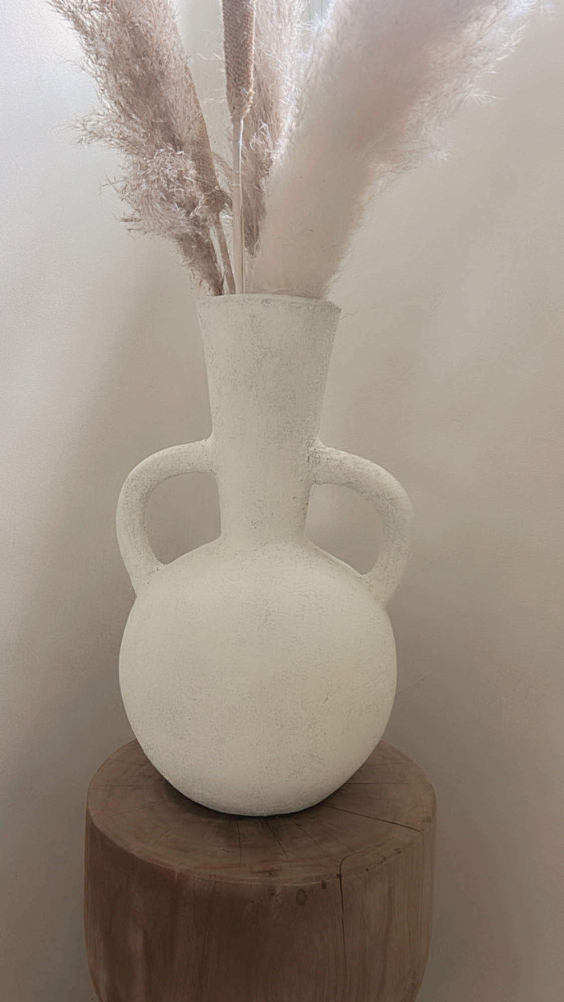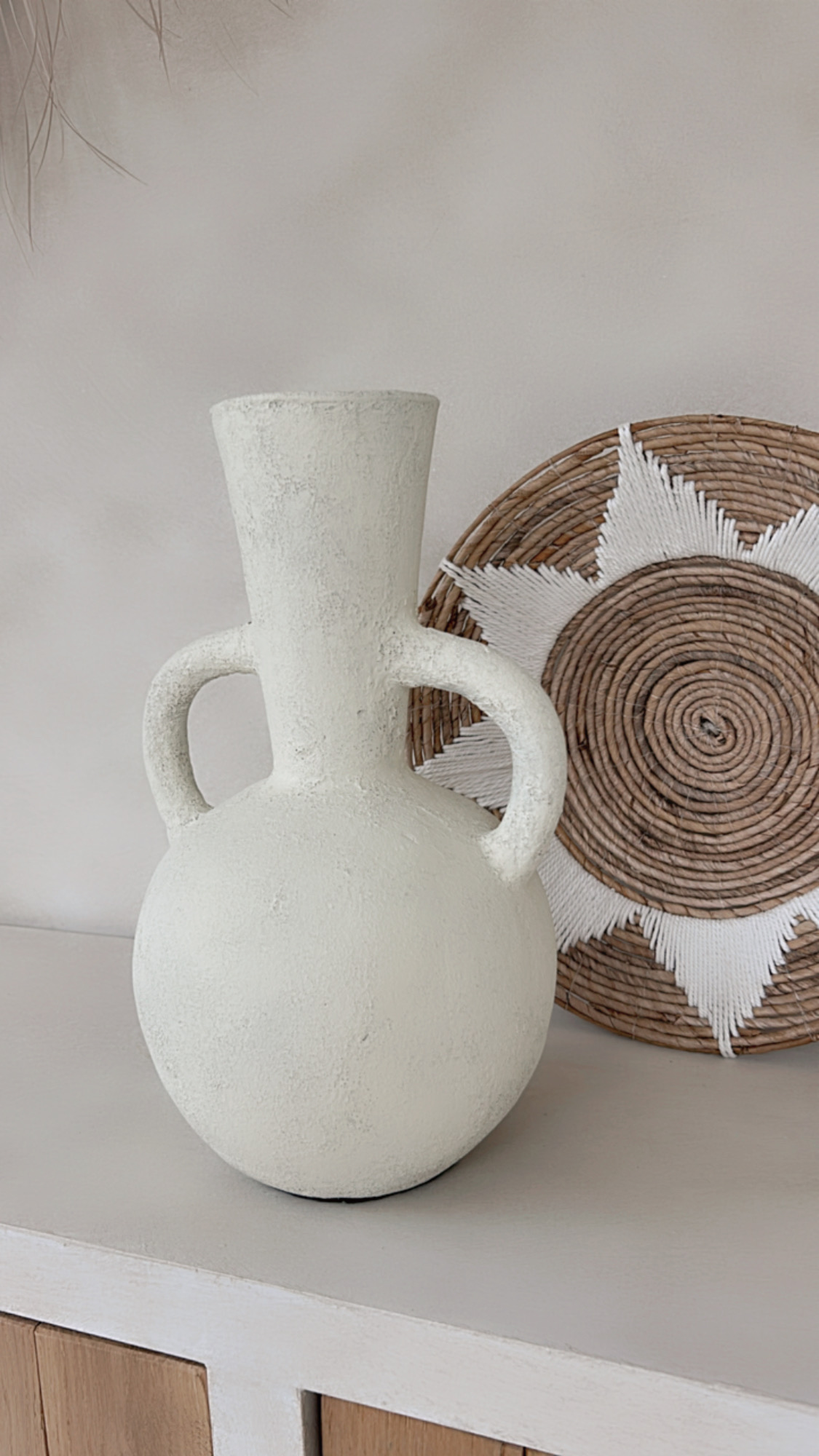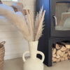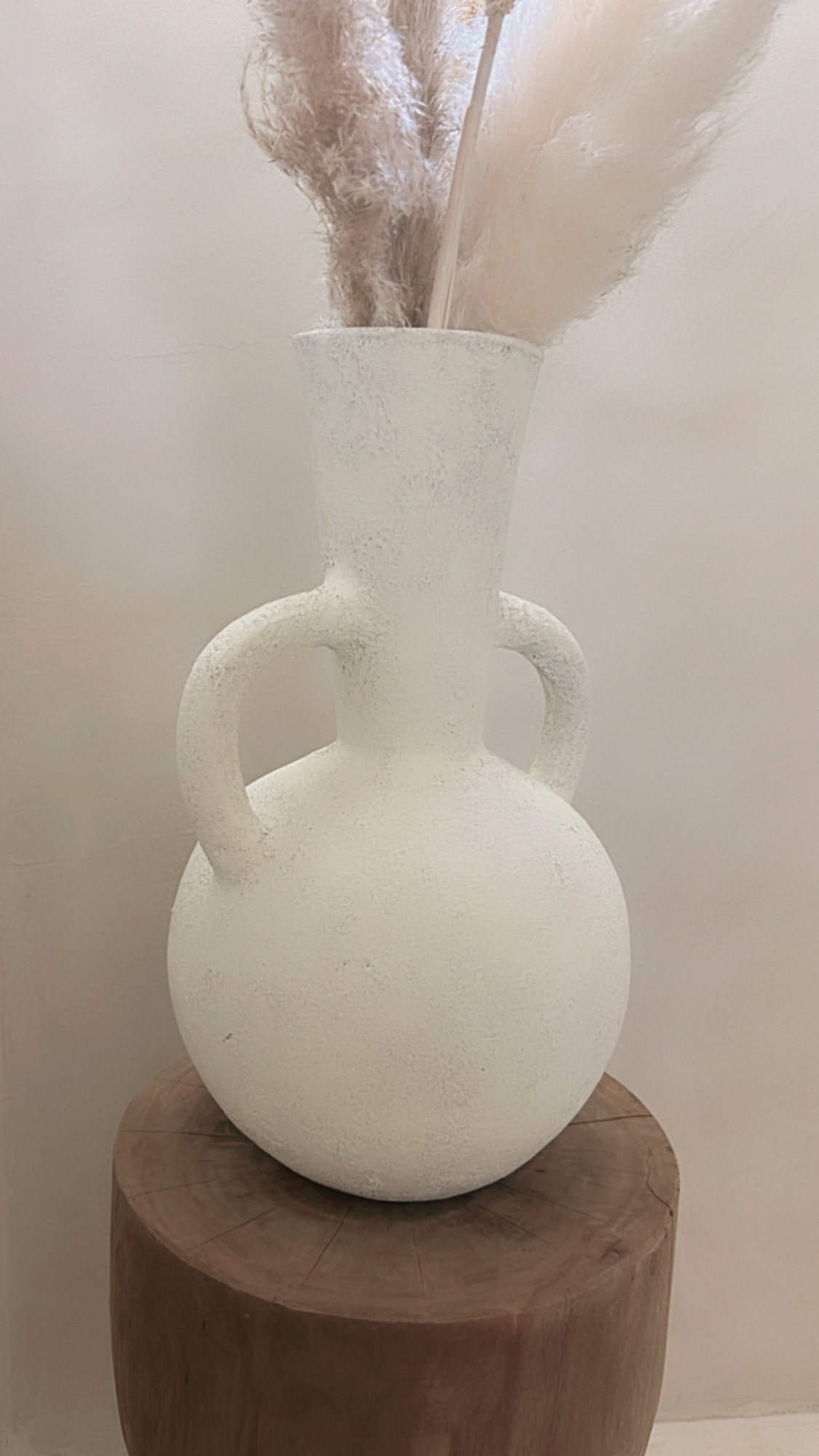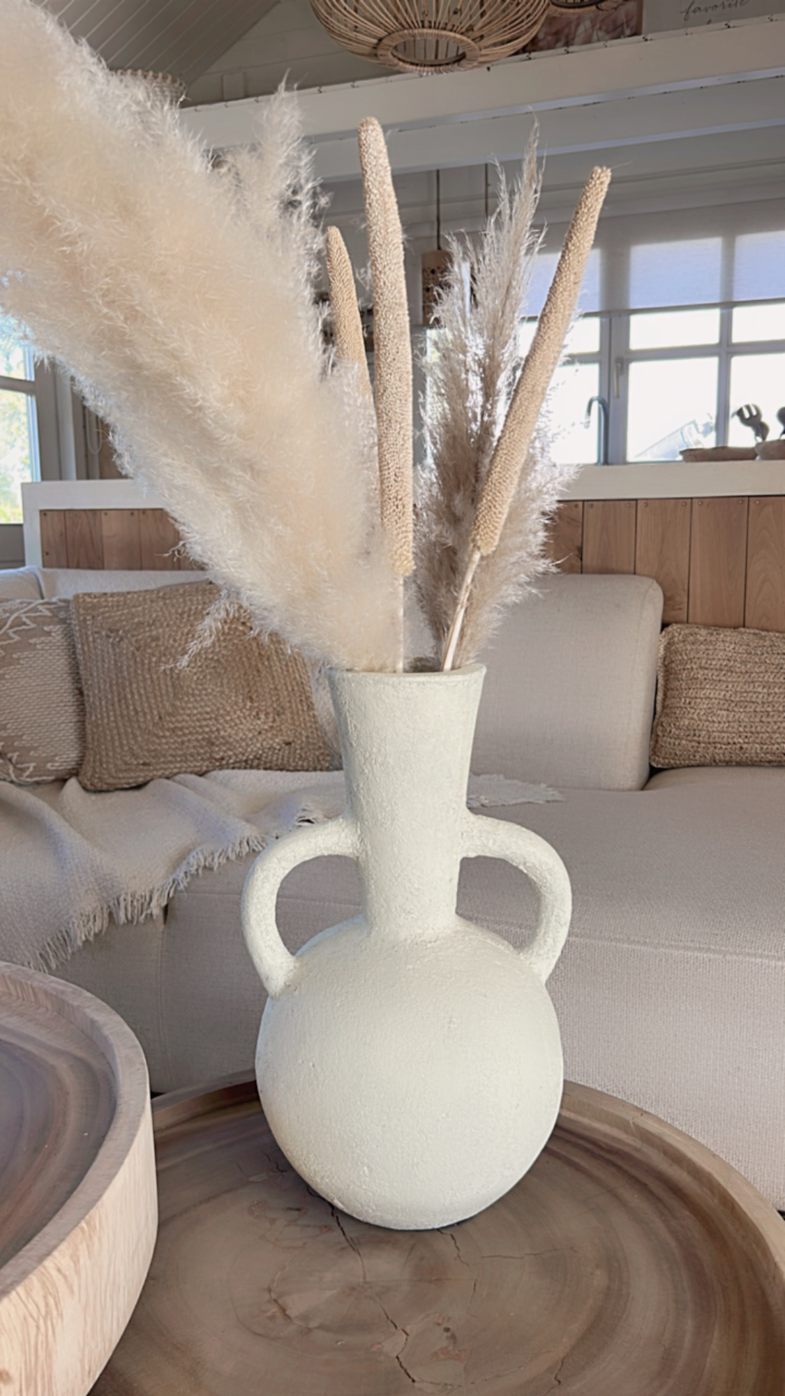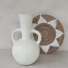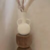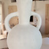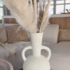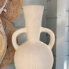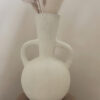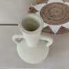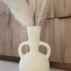 Deze prachtige vaas met zijn ronde vorm en karakteristieke dubbele handgrepen is een echte eyecatcher in elk interieur. De vaas heeft een robuuste, rustieke textuur en een lichte, naturel tint die moeiteloos aansluit bij een boho, Scandinavische of mediterrane woonstijl. Prachtig met droogbloemen of pampasgras, maar ook op zichzelf een decoratief statement.