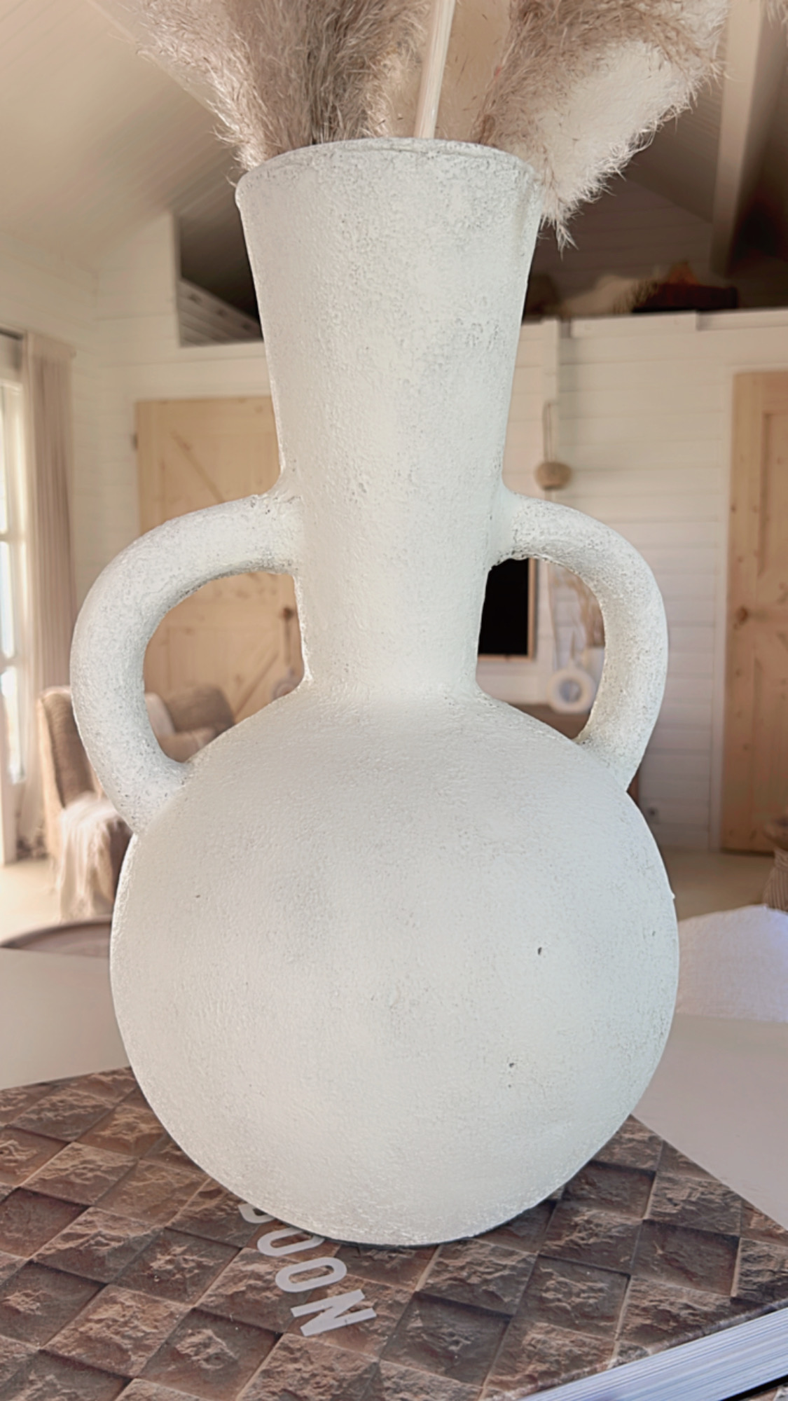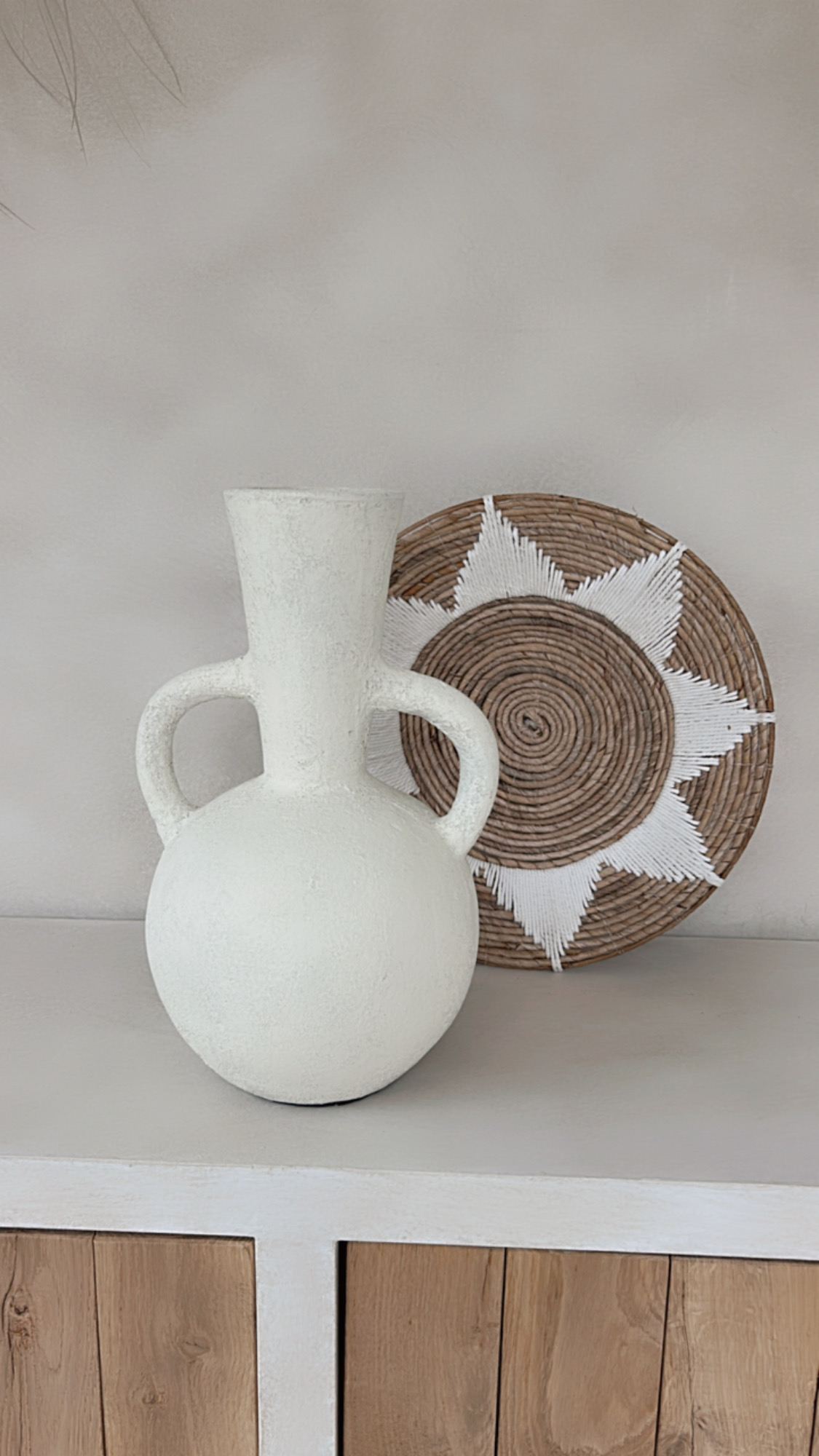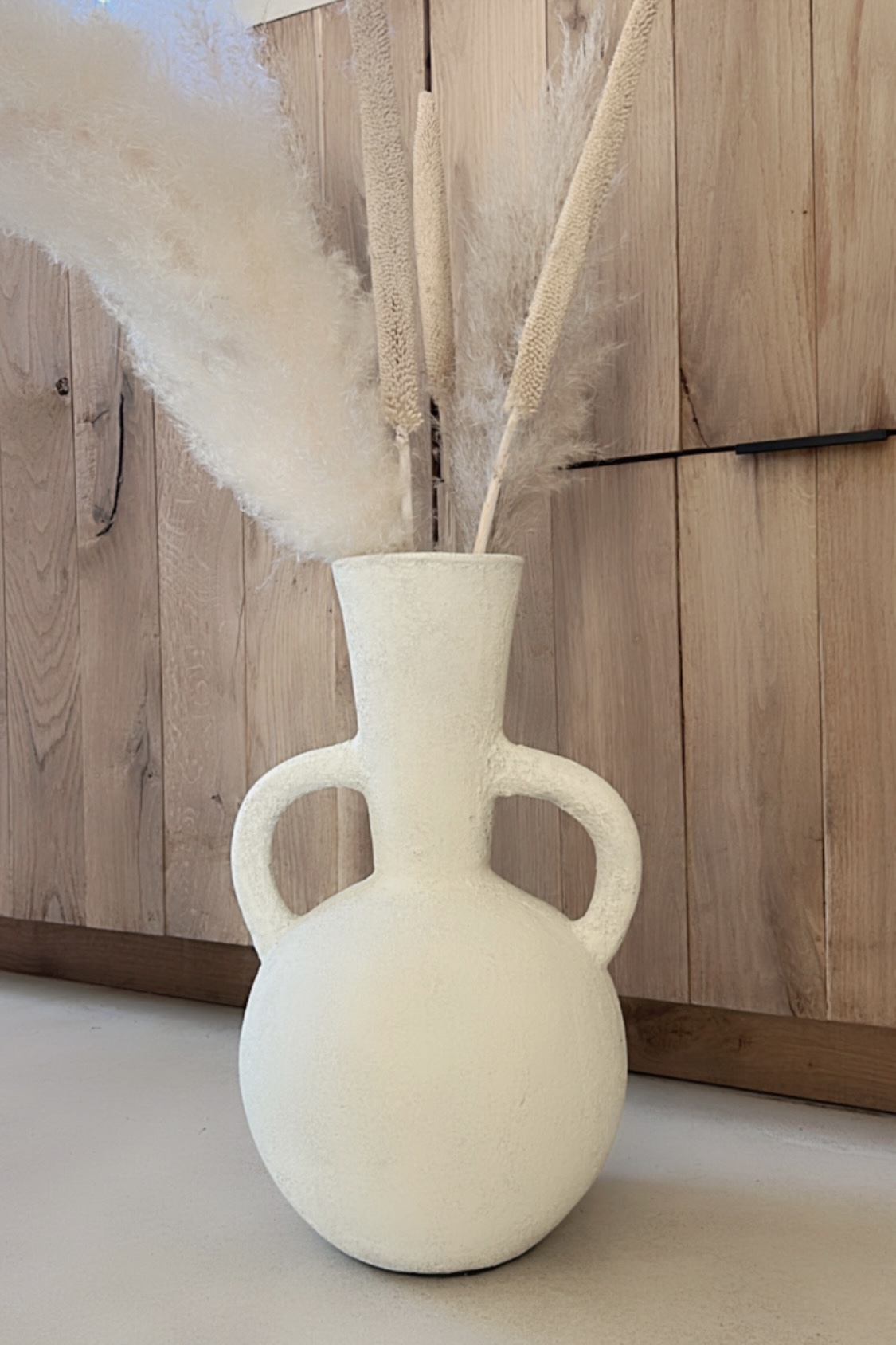 Deze prachtige vaas met zijn ronde vorm en karakteristieke dubbele handgrepen is een echte eyecatcher in elk interieur. De vaas heeft een robuuste, rustieke textuur en een lichte, naturel tint die moeiteloos aansluit bij een boho, Scandinavische of mediterrane woonstijl. Prachtig met droogbloemen of pampasgras, maar ook op zichzelf een decoratief statement.