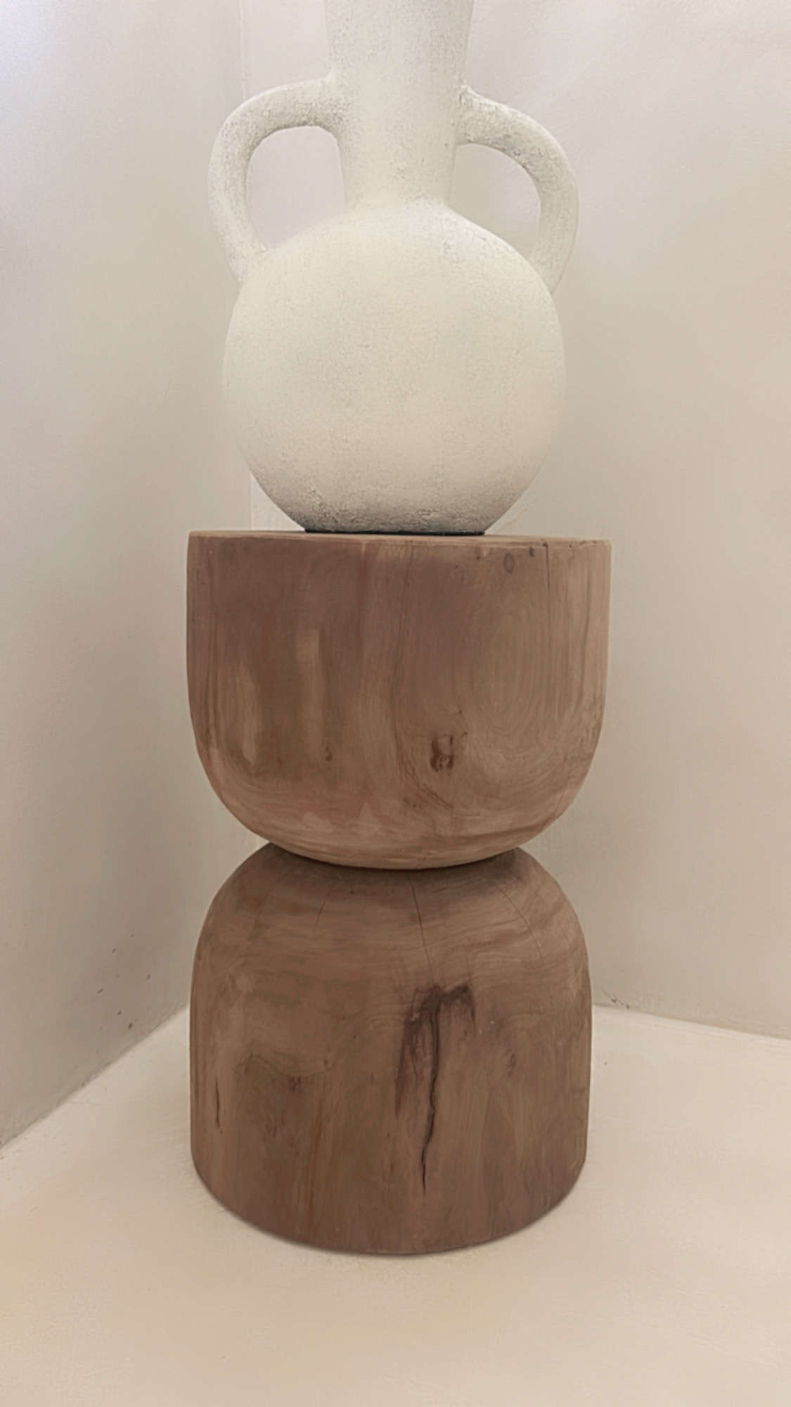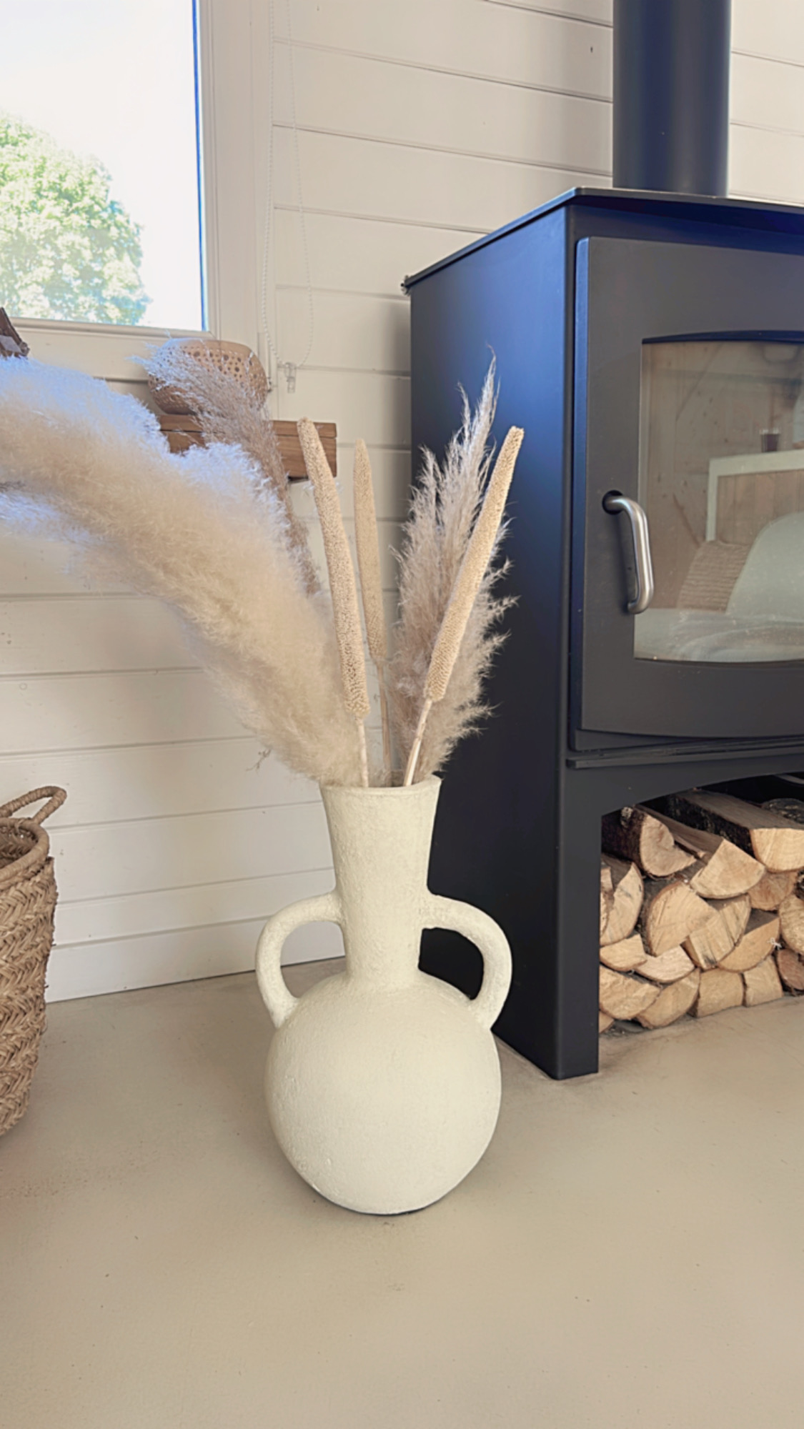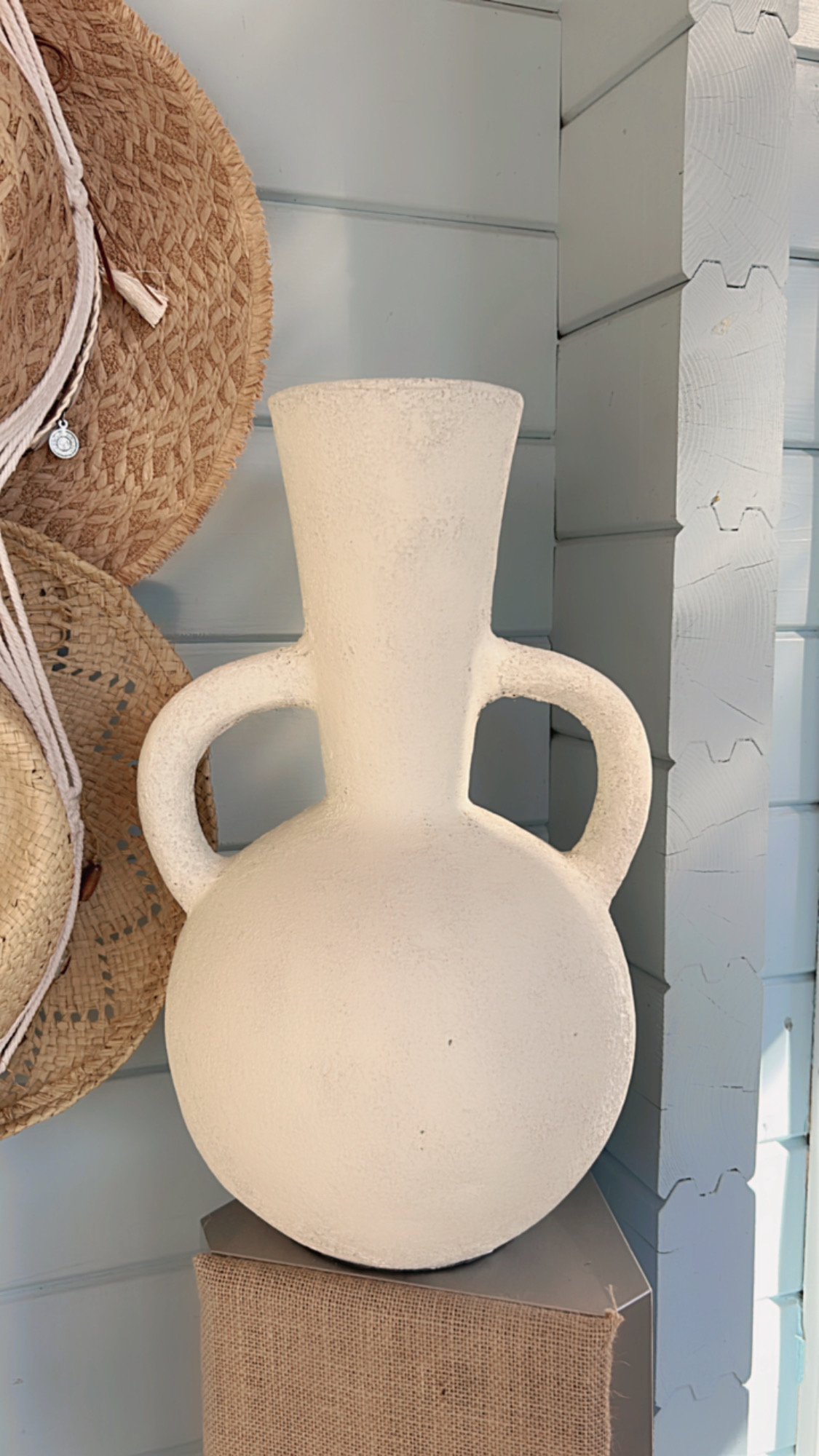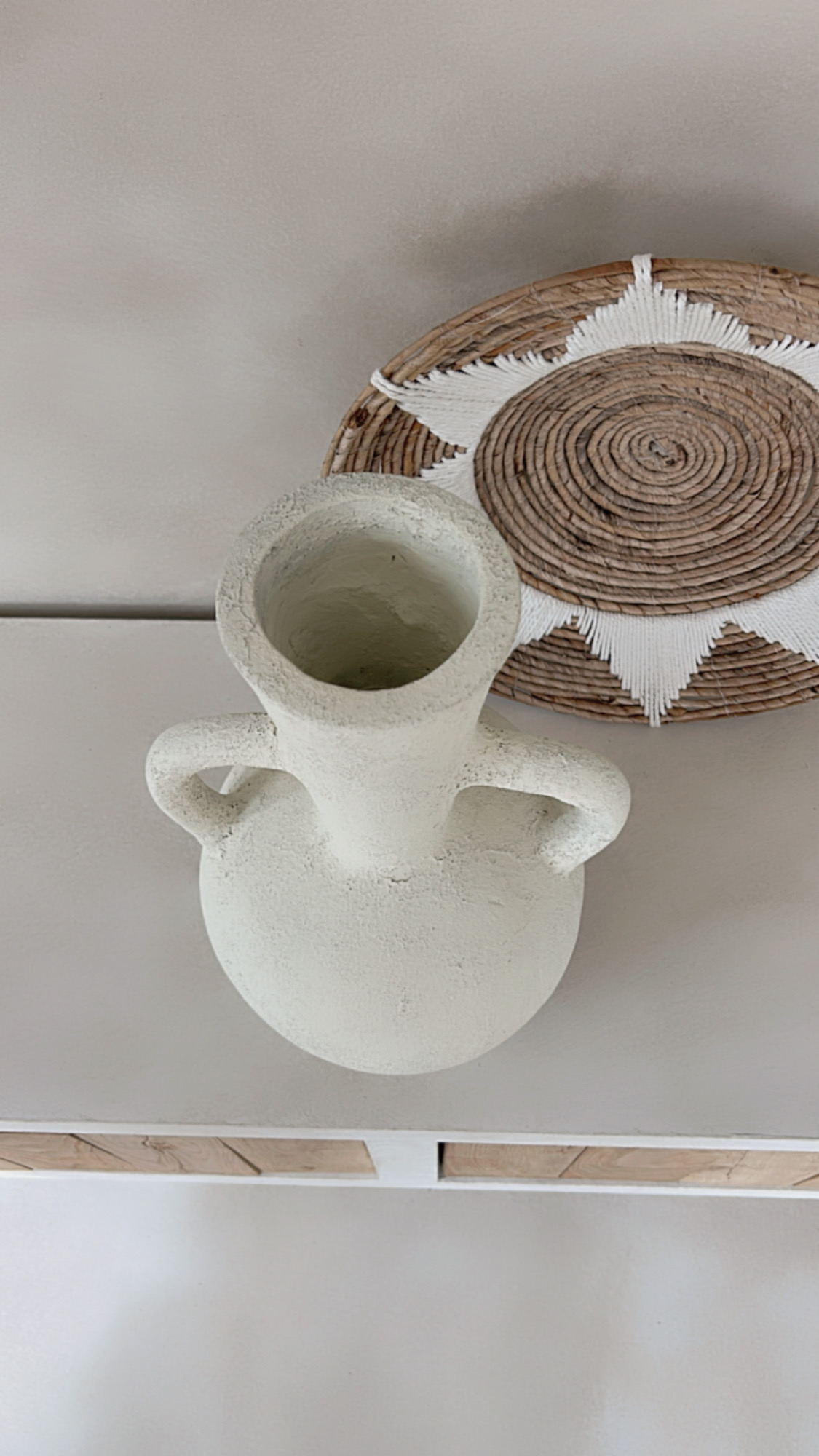 Deze prachtige vaas met zijn ronde vorm en karakteristieke dubbele handgrepen is een echte eyecatcher in elk interieur. De vaas heeft een robuuste, rustieke textuur en een lichte, naturel tint die moeiteloos aansluit bij een boho, Scandinavische of mediterrane woonstijl. Prachtig met droogbloemen of pampasgras, maar ook op zichzelf een decoratief statement.