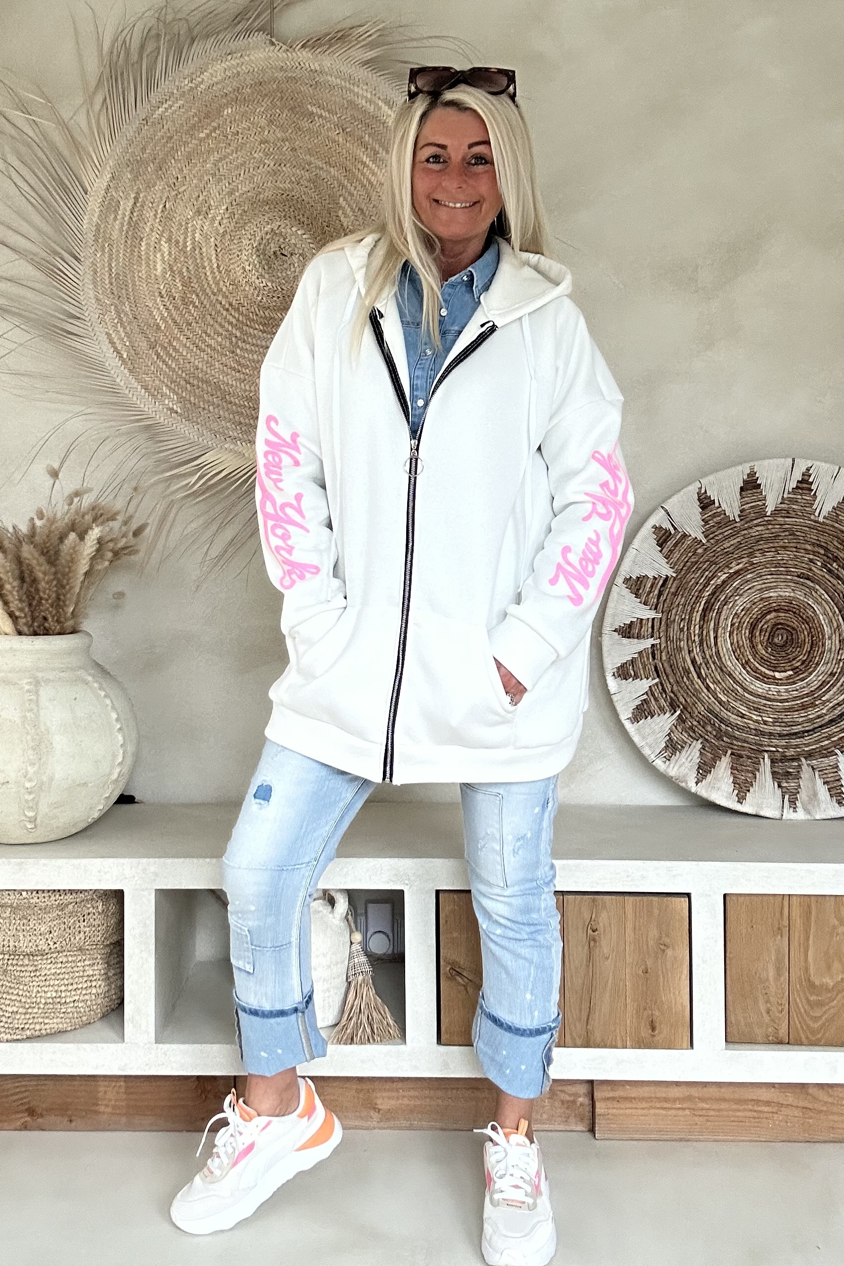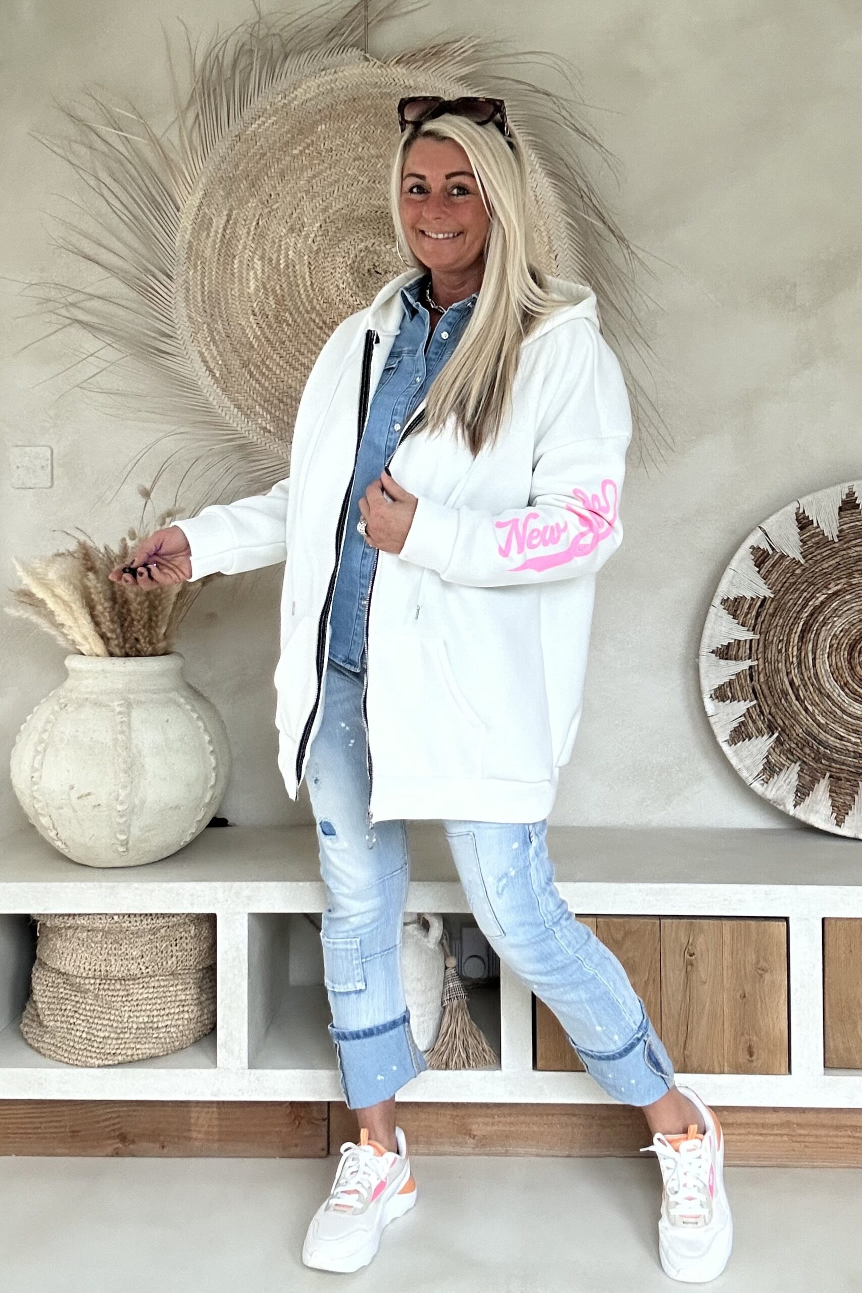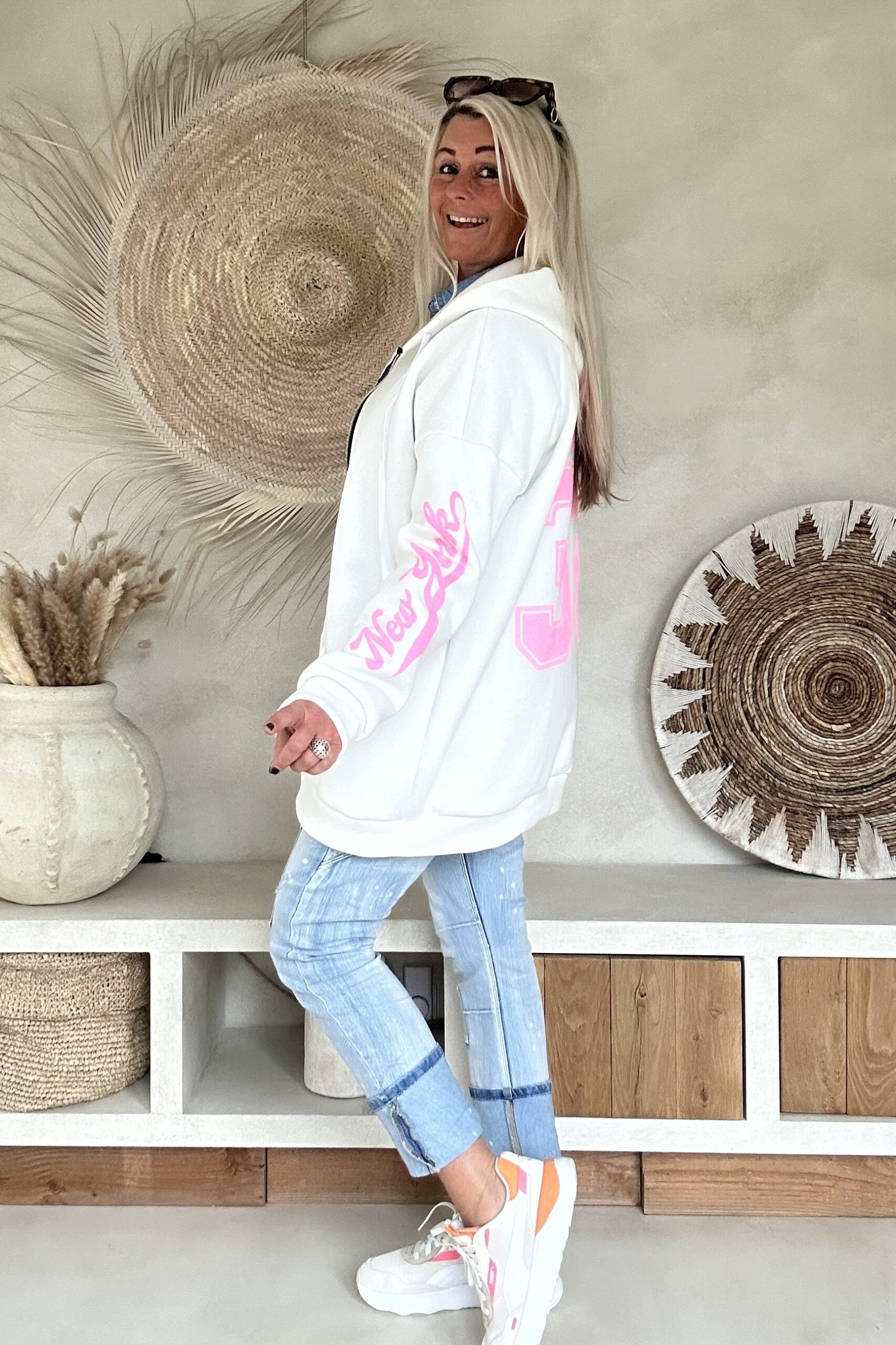 Dit comfy hoodie sweat vest is een echte eyecatcher dankzij de opvallende roze opdruk. De zachte sweatkwaliteit draagt heerlijk en maakt dit vest perfect voor een casual, sportieve look. Leuk open te dragen over een jeansblouse of dichtgeritst als comfy hoodie. Een fijne toevoeging aan je everyday outfit met een speelse twist.