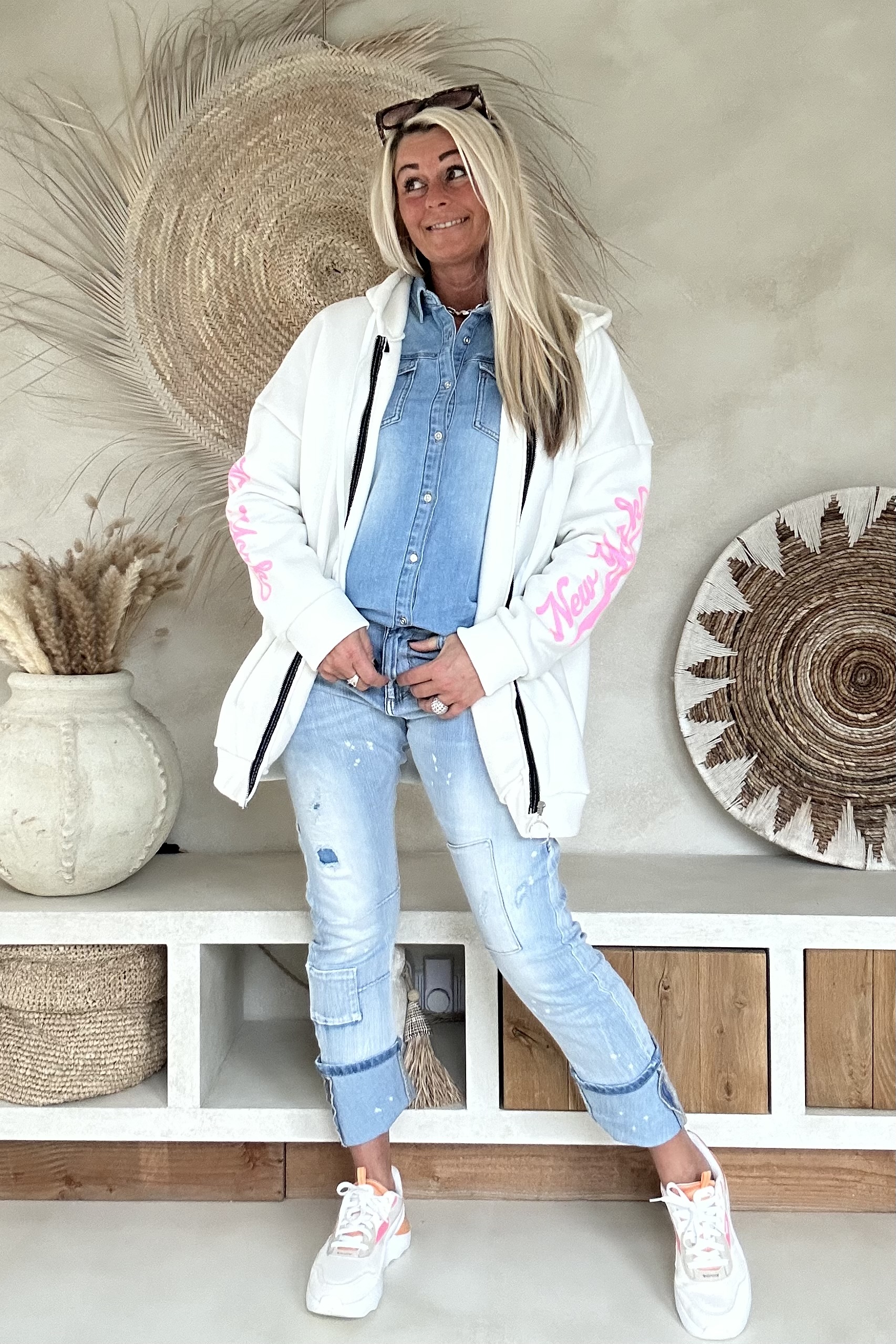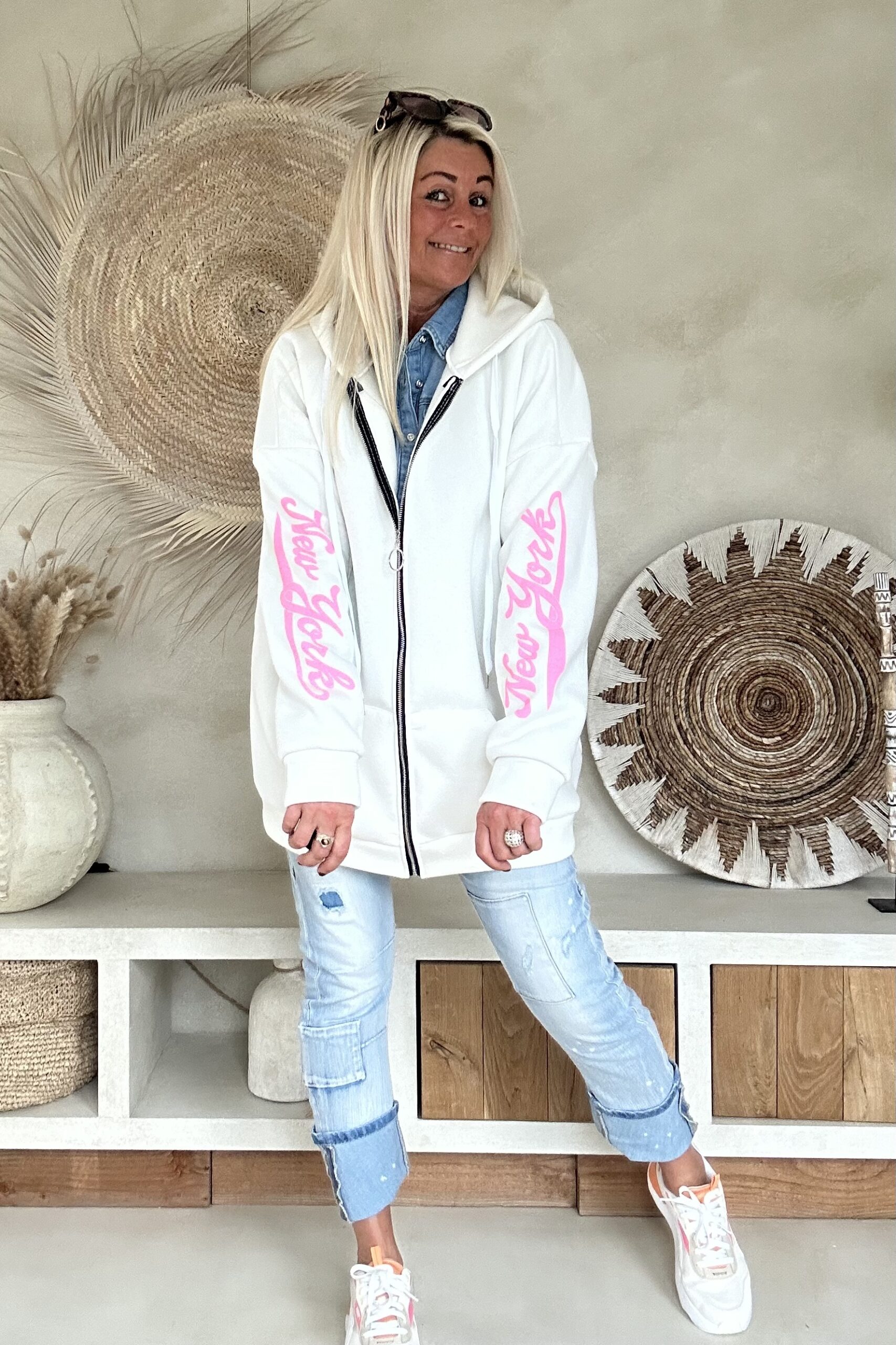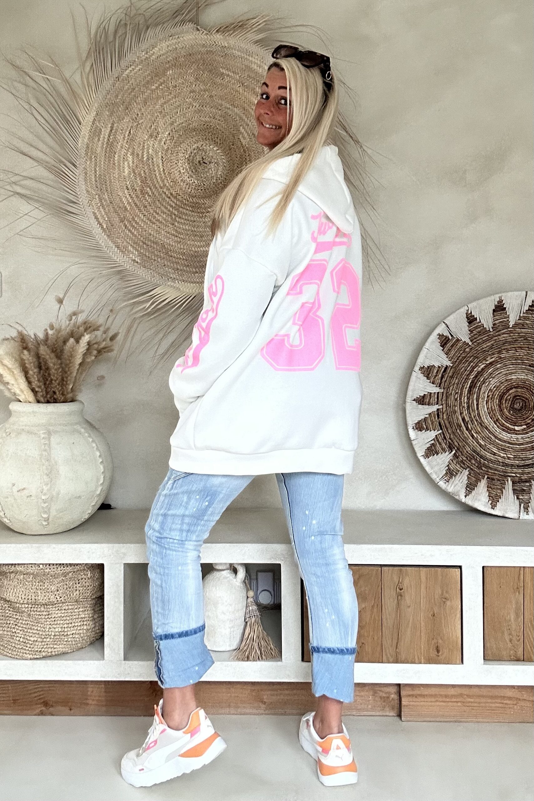 Dit comfy hoodie sweat vest is een echte eyecatcher dankzij de opvallende roze opdruk. De zachte sweatkwaliteit draagt heerlijk en maakt dit vest perfect voor een casual, sportieve look. Leuk open te dragen over een jeansblouse of dichtgeritst als comfy hoodie. Een fijne toevoeging aan je everyday outfit met een speelse twist.
