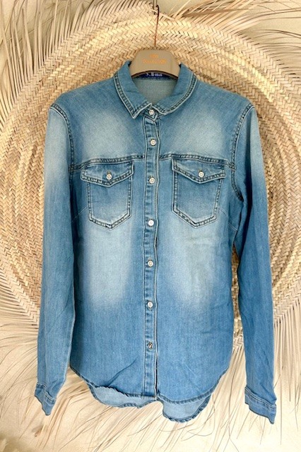 Stoere jeansblouse in lichtblauwe denimstof met stretch voor ultiem draagcomfort en een casual, trendy uitstraling. De blouse is eindeloos te combineren: draag hem open over een T-shirt, knoop hem dicht voor een klassieke look of rol de mouwen op voor een nonchalante vibe. Verkrijgbaar in maat S t/m XL en valt goed op maat. Het model draagt maat M en heeft doorgaans maat 38. Een veelzijdig item dat niet mag ontbreken in je garderobe!
