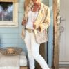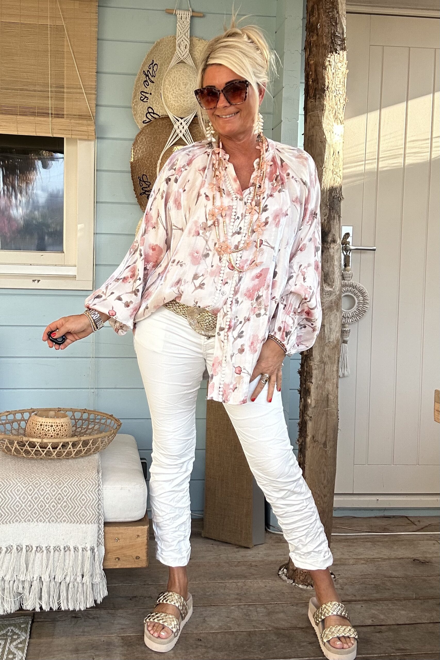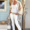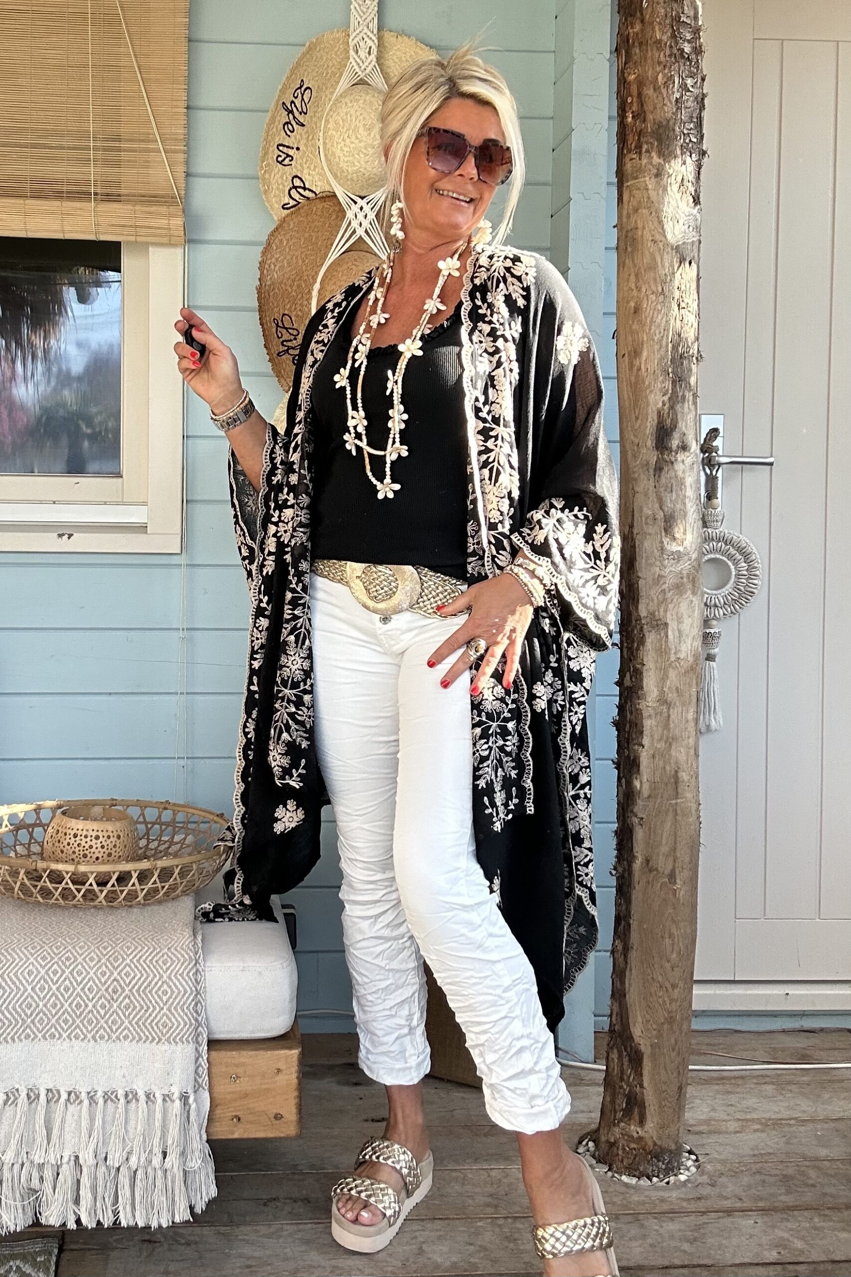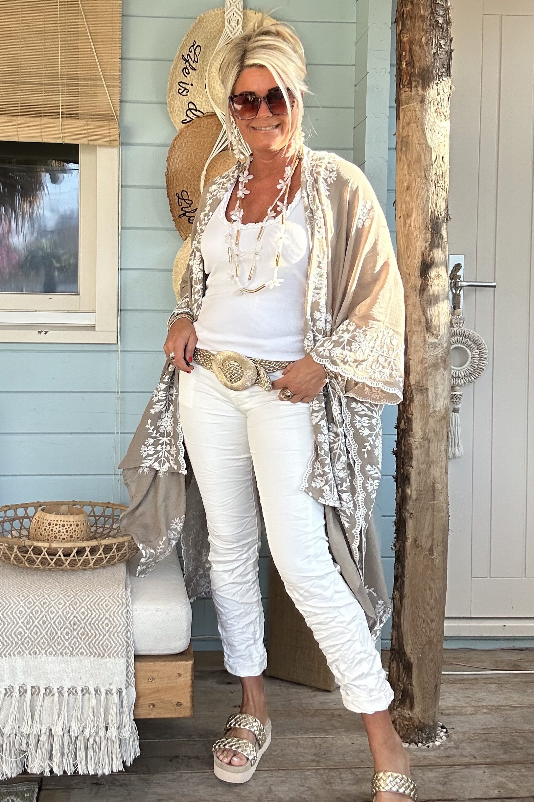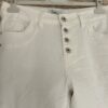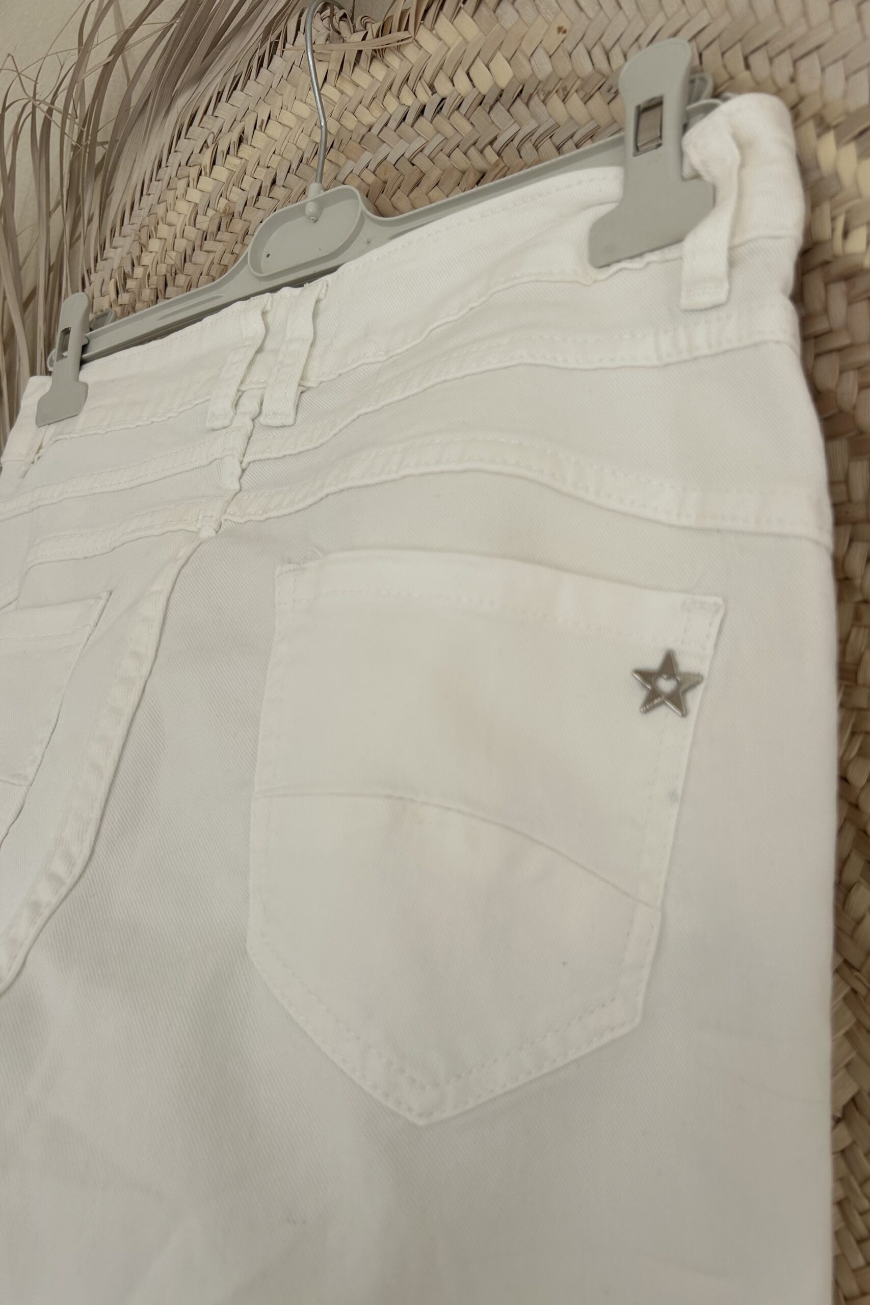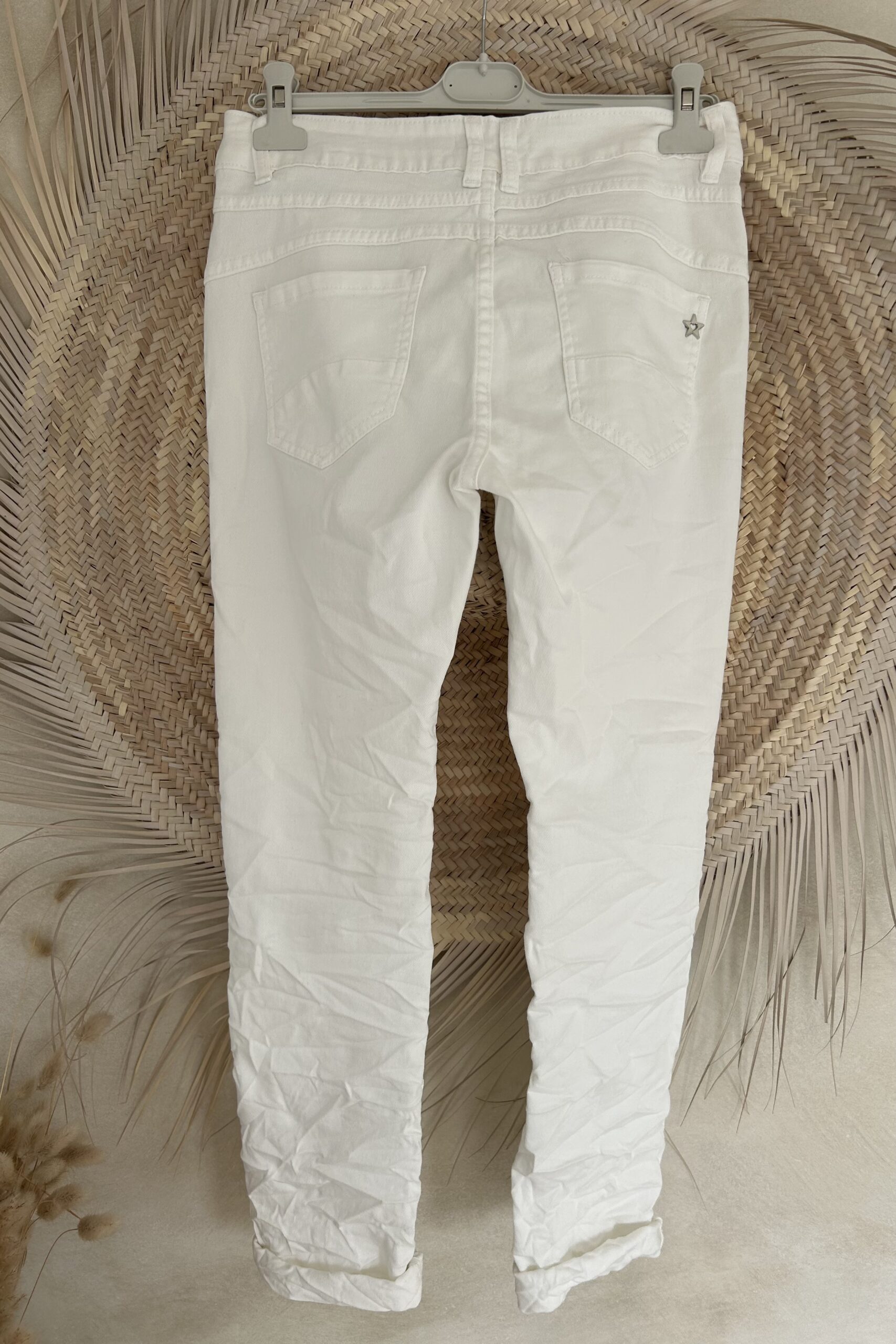 Stoere en comfortabele witte jeans met stretch in een licht baggy model en met zilverkleurige knopen op de voorkant. Op de kontzak een leuk metalen sterretje. Combineer de jeans met vele items en stijlen. Een echte basic musthave waar je alle kanten mee op kunt. De broek is verkrijgbaar in maat XS t/m XL en valt iets ruim op maat. Model draagt maat S en heeft normaal maat 38 en is 1.66 m lang.