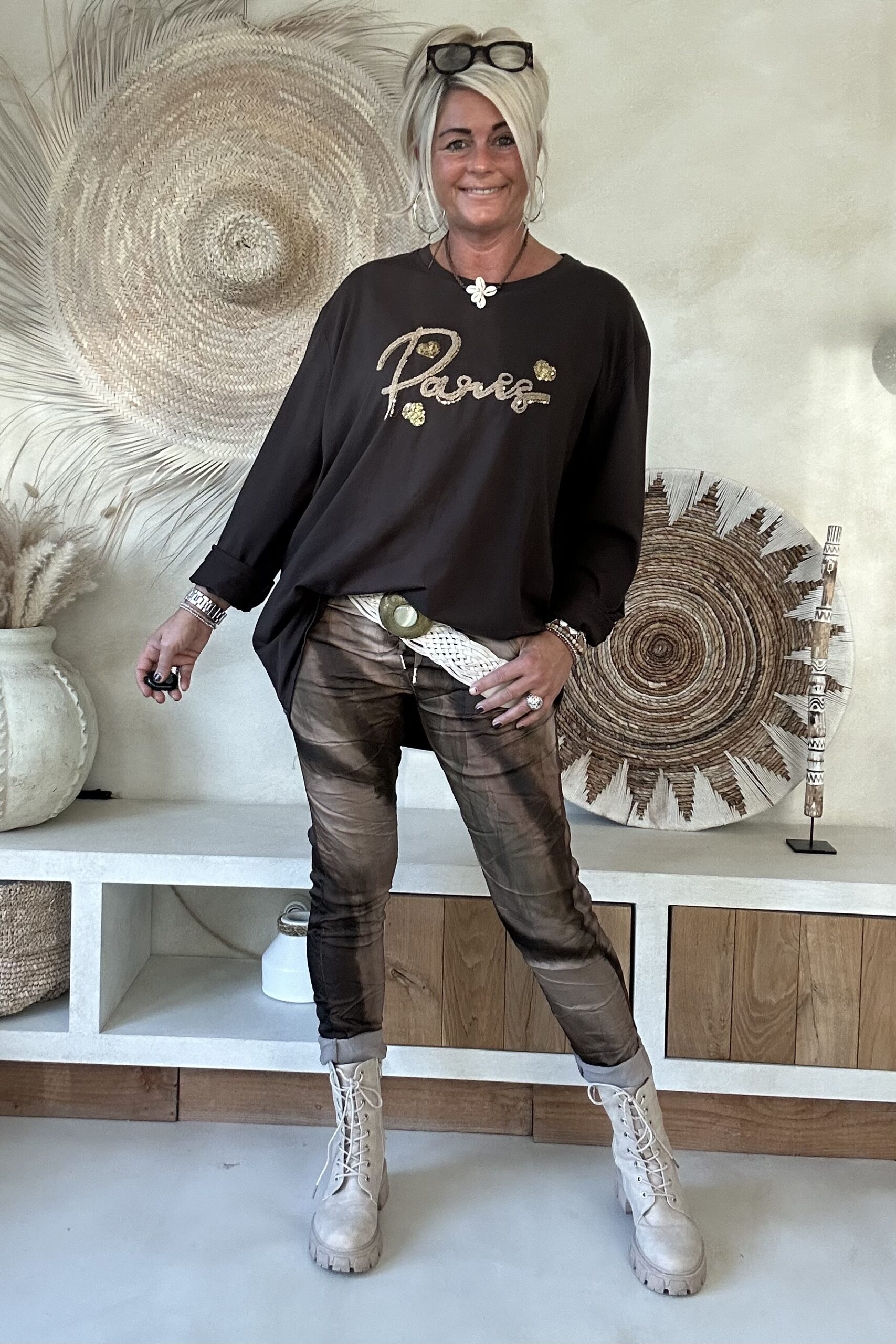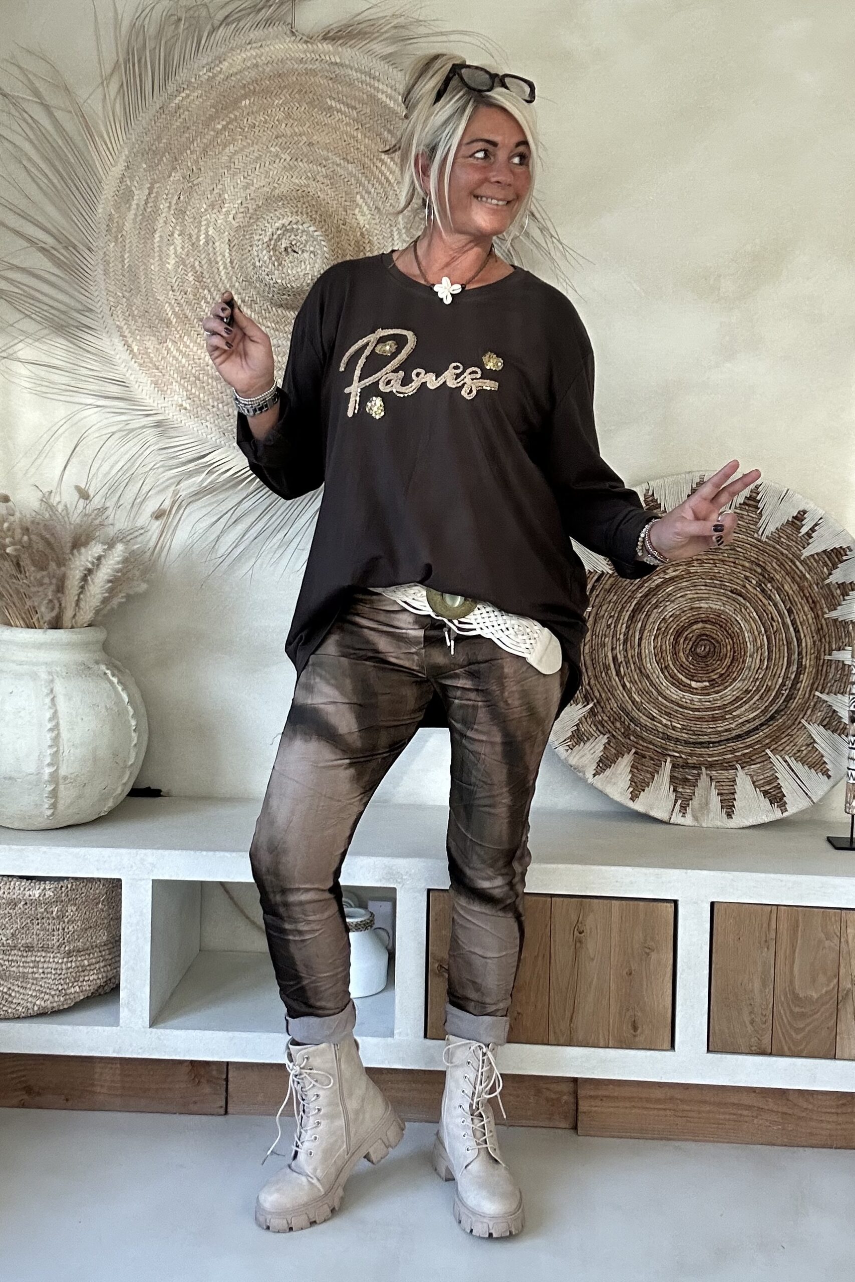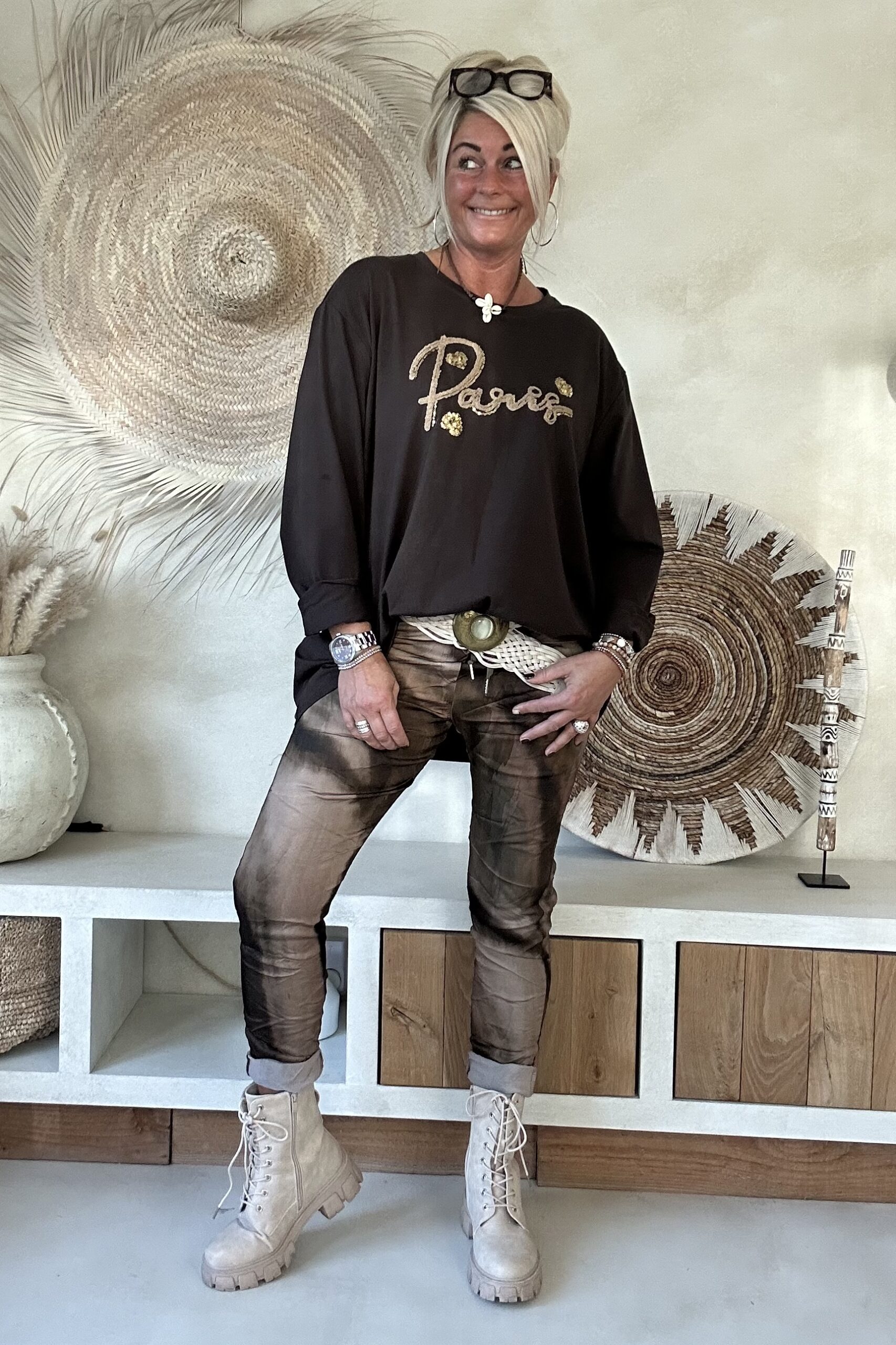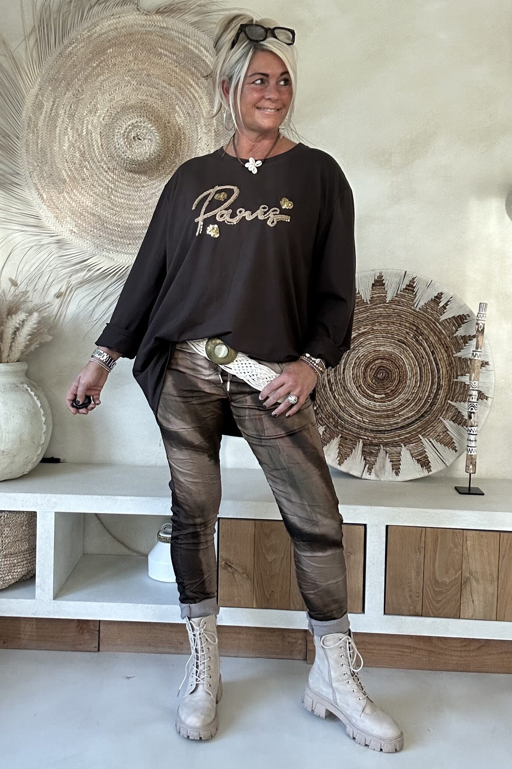 • Elastieken band met aantrek koord in de taille.