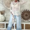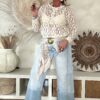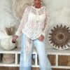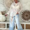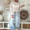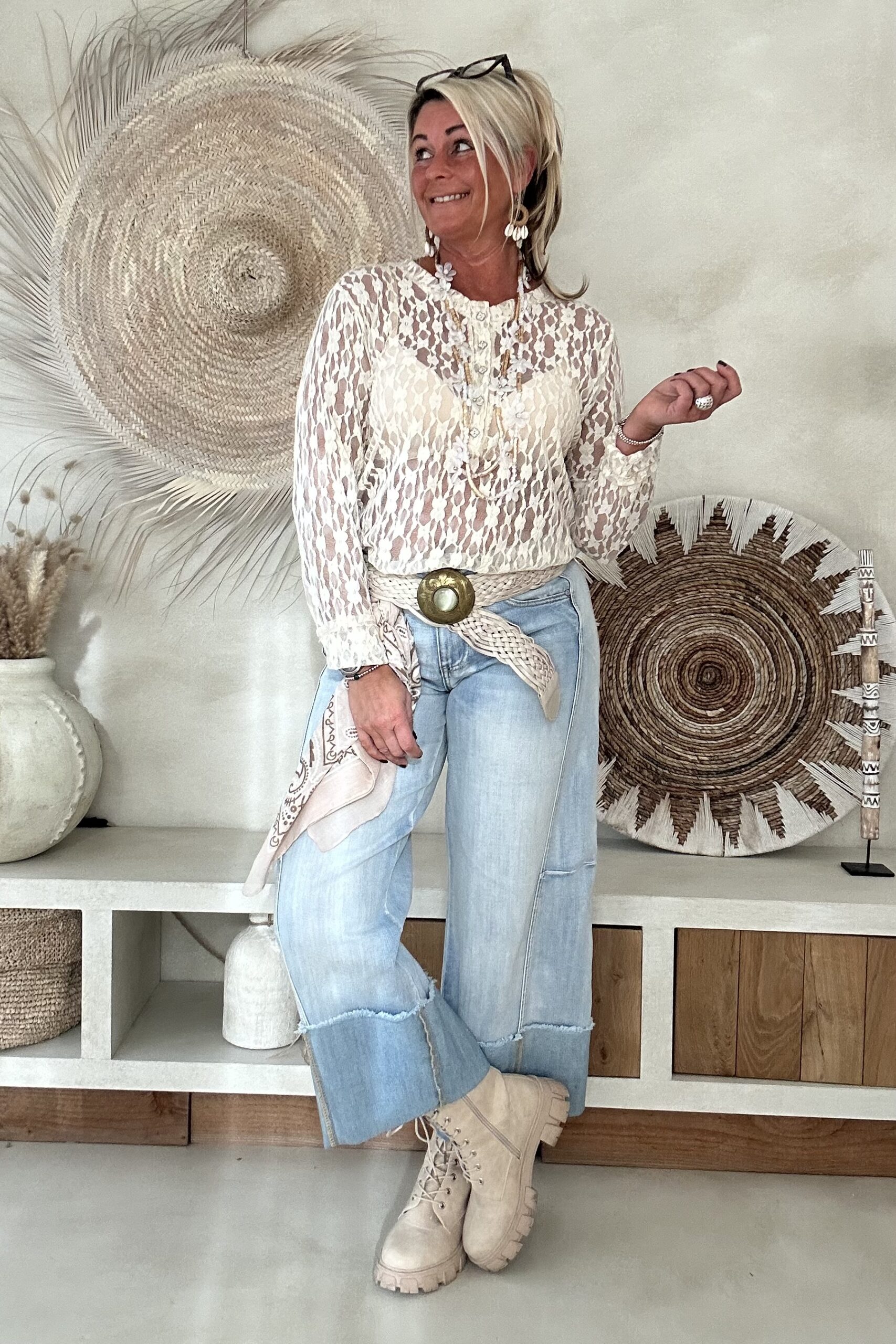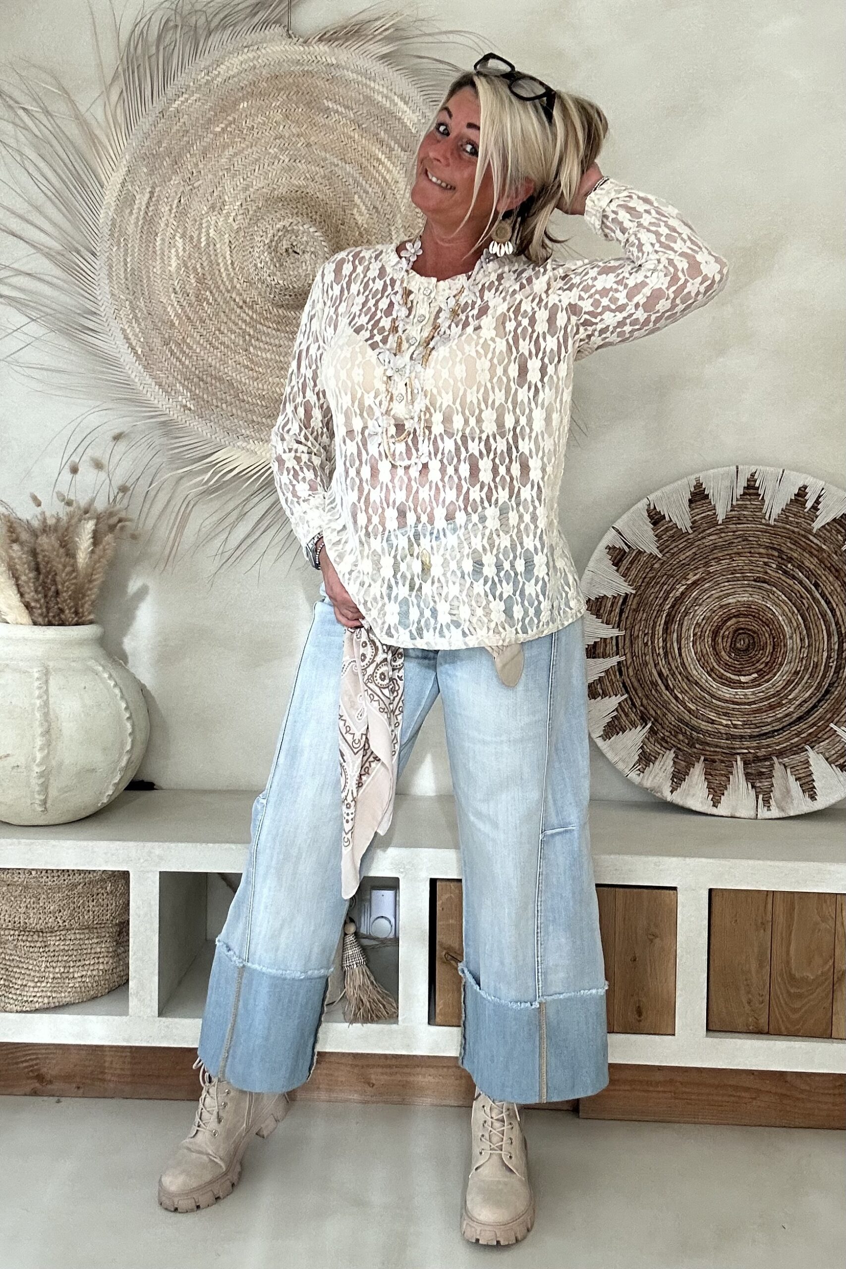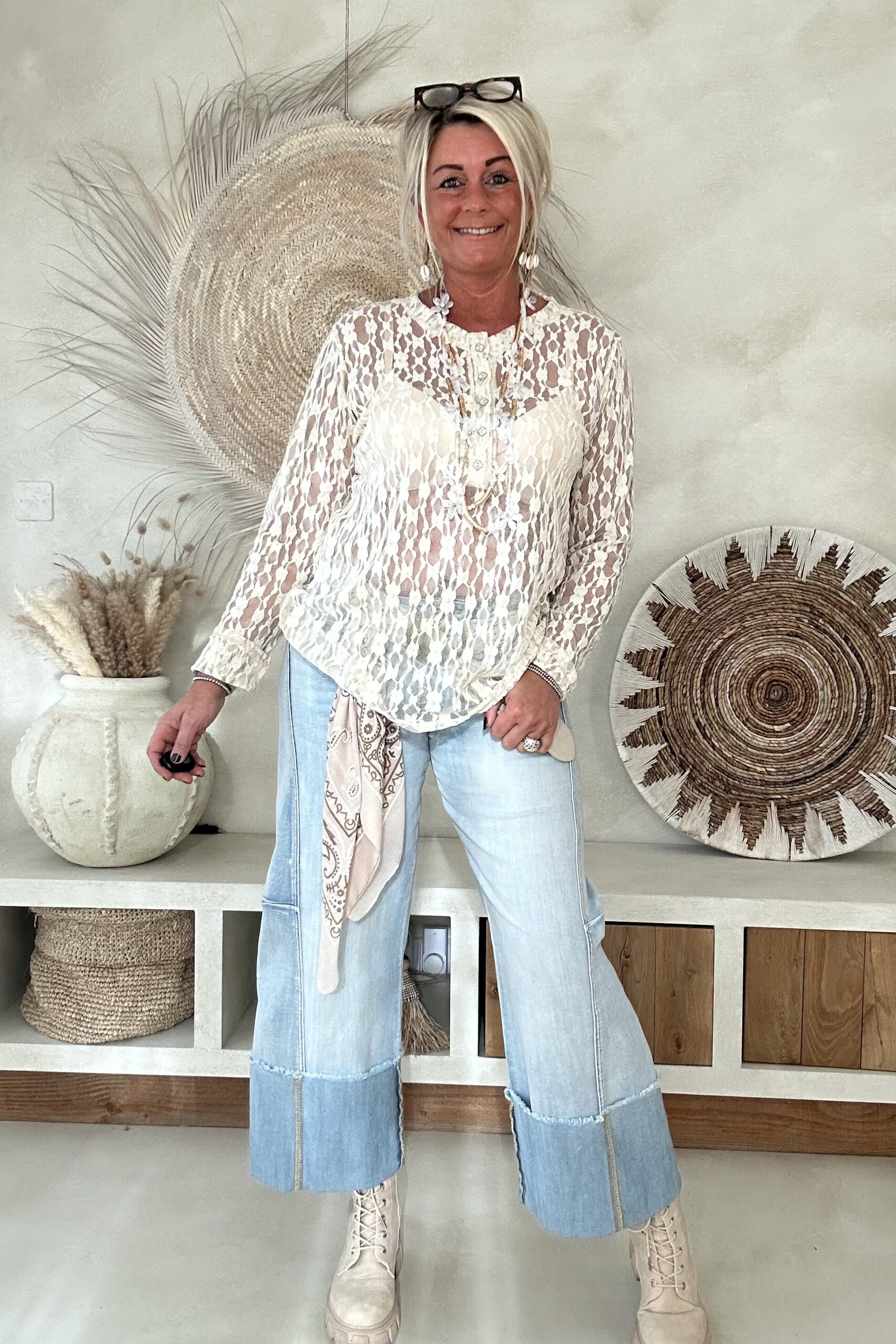 Dit verfijnde kanten truitje straalt pure elegantie uit. Het transparante kant geeft een vrouwelijke en romantische uitstraling, terwijl de subtiele glinsterknoopjes aan de voorzijde zorgen voor een chique en stijlvolle touch. De ronde hals en lange mouwen maken dit item perfect om zowel casual als gekleed te combineren. Draag hem met een topje eronder voor een sophisticated look of combineer hem met denim voor een speelse twist.