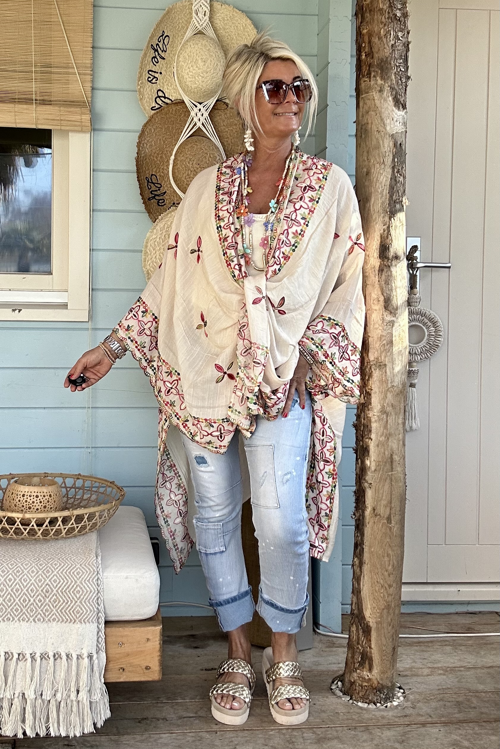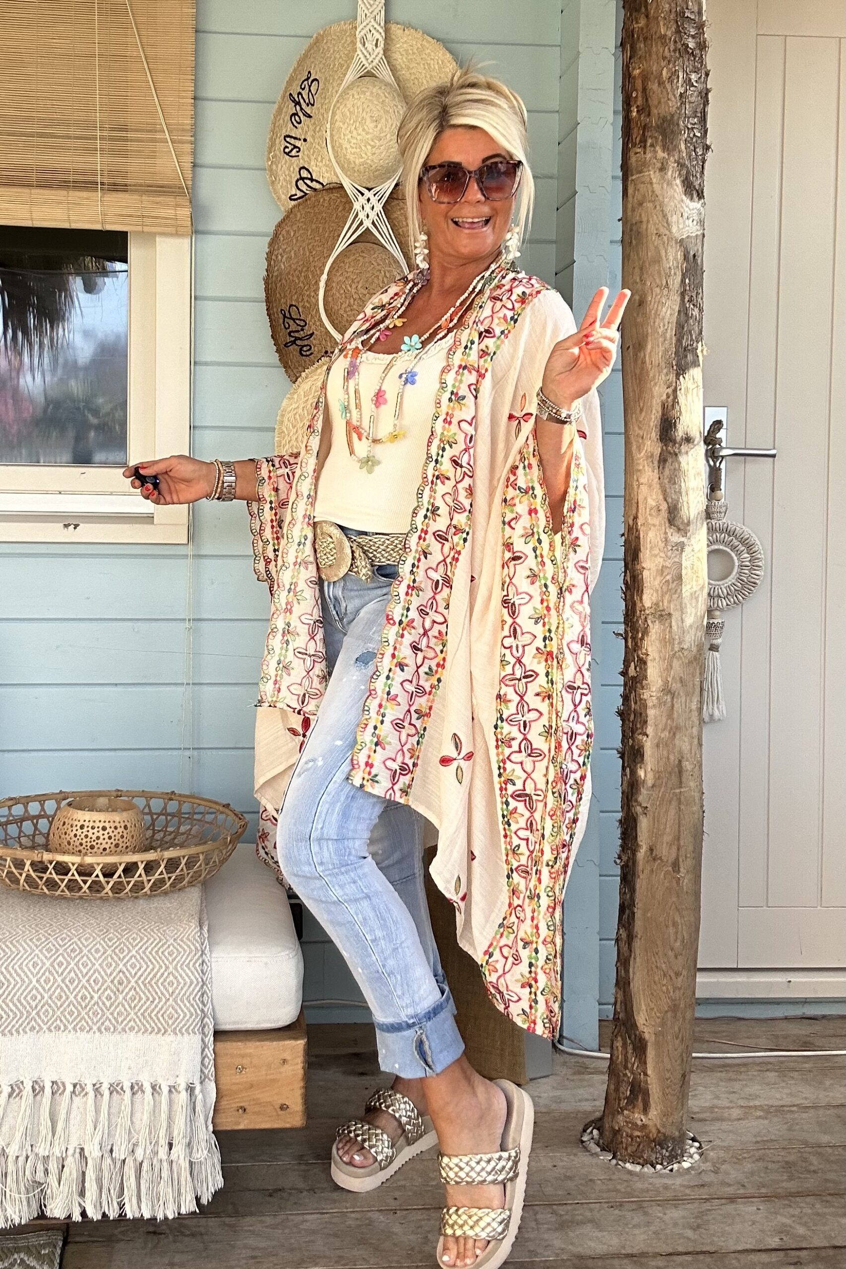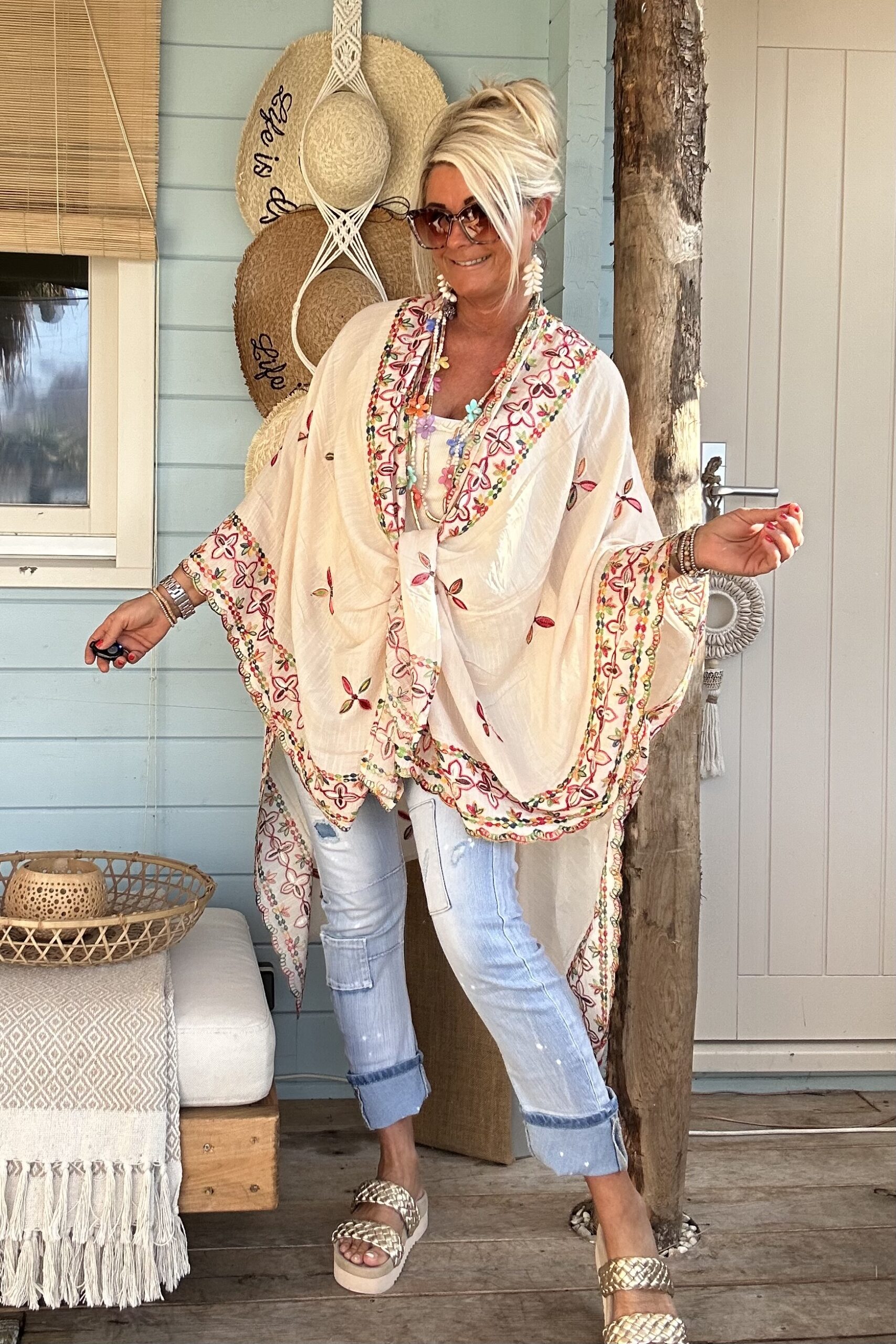 Deze heerlijke luchtige kimono-poncho is een echte eyecatcher voor het voorjaar en de zomer. Het soepel vallende model geeft een nonchalante en stijlvolle uitstraling en is perfect om over een top, blouse of jurk te dragen. De stof voelt licht en comfortabel aan door de viscose-katoen mix en beweegt mooi met je mee. De prachtige borduursels langs de randen en mouwen geven dit item een luxe, bohemian uitstraling. Dankzij het ruime model valt deze poncho altijd mooi en is hij geschikt voor heel veel maten. Ook ideaal voor een strand- of vakantiedag: draag hem losjes over je bikini of badpak voor een stijlvolle en luchtige look.