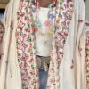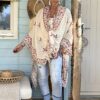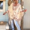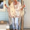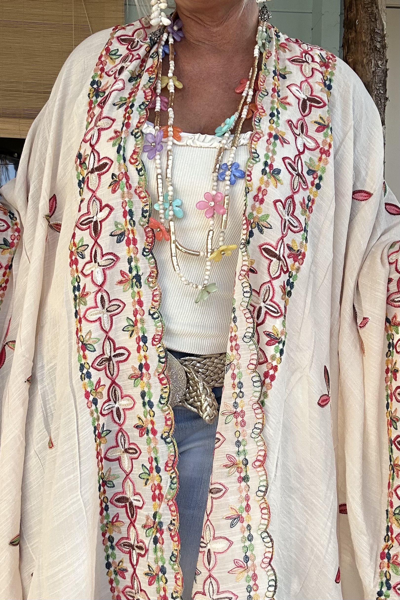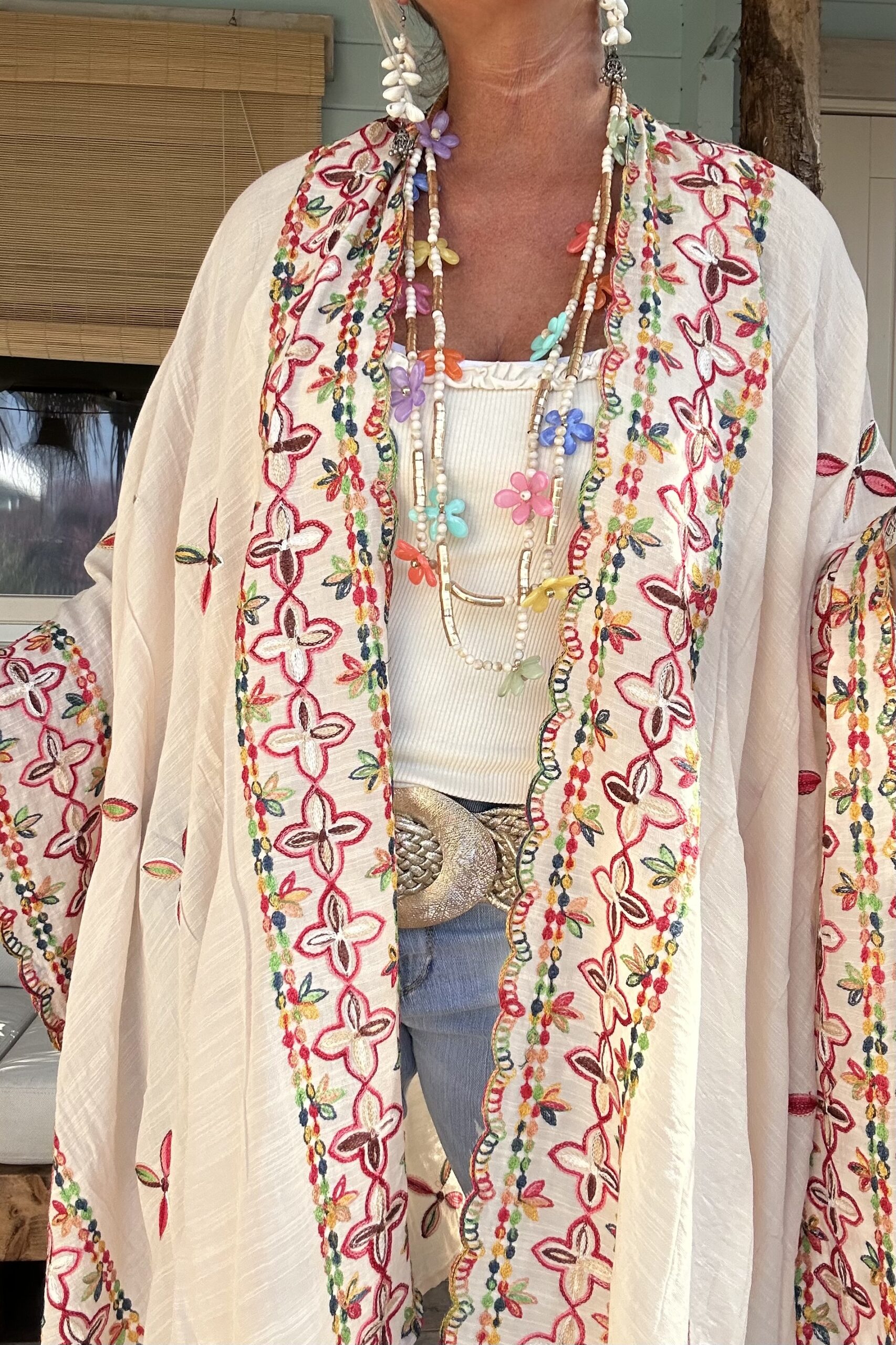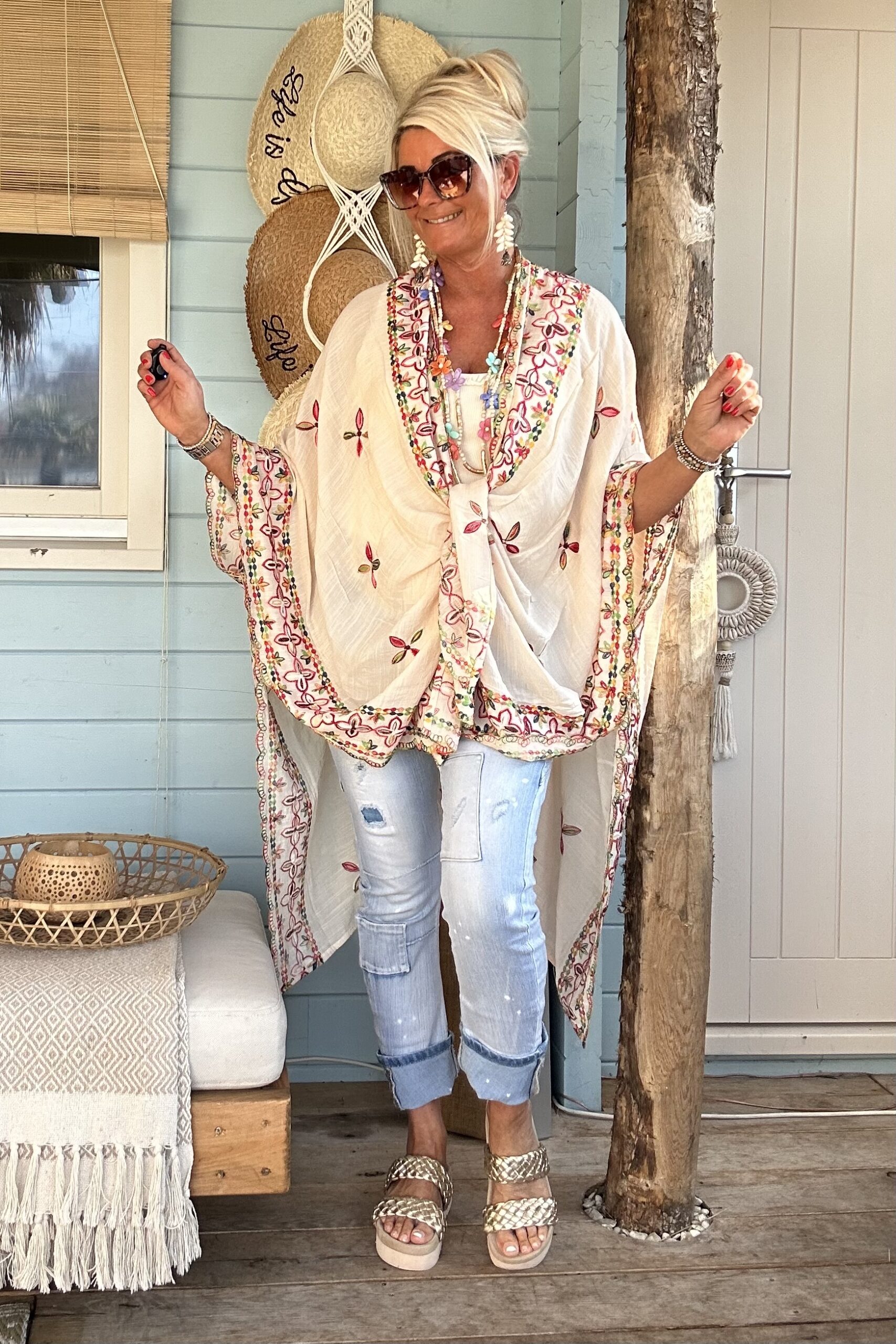 Deze heerlijke luchtige kimono-poncho is een echte eyecatcher voor het voorjaar en de zomer. Het soepel vallende model geeft een nonchalante en stijlvolle uitstraling en is perfect om over een top, blouse of jurk te dragen. De stof voelt licht en comfortabel aan door de viscose-katoen mix en beweegt mooi met je mee. De prachtige borduursels langs de randen en mouwen geven dit item een luxe, bohemian uitstraling. Dankzij het ruime model valt deze poncho altijd mooi en is hij geschikt voor heel veel maten. Ook ideaal voor een strand- of vakantiedag: draag hem losjes over je bikini of badpak voor een stijlvolle en luchtige look.