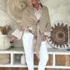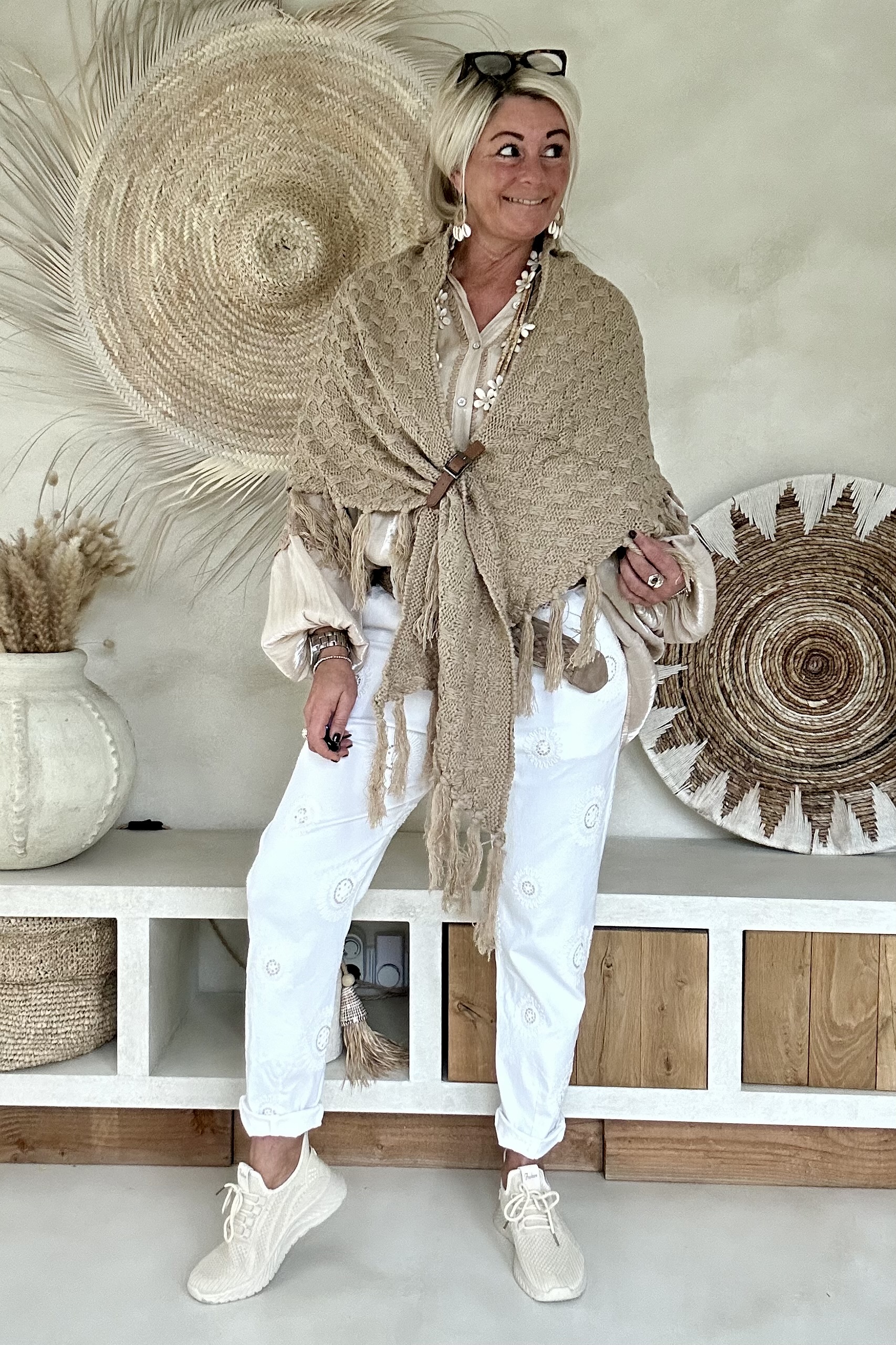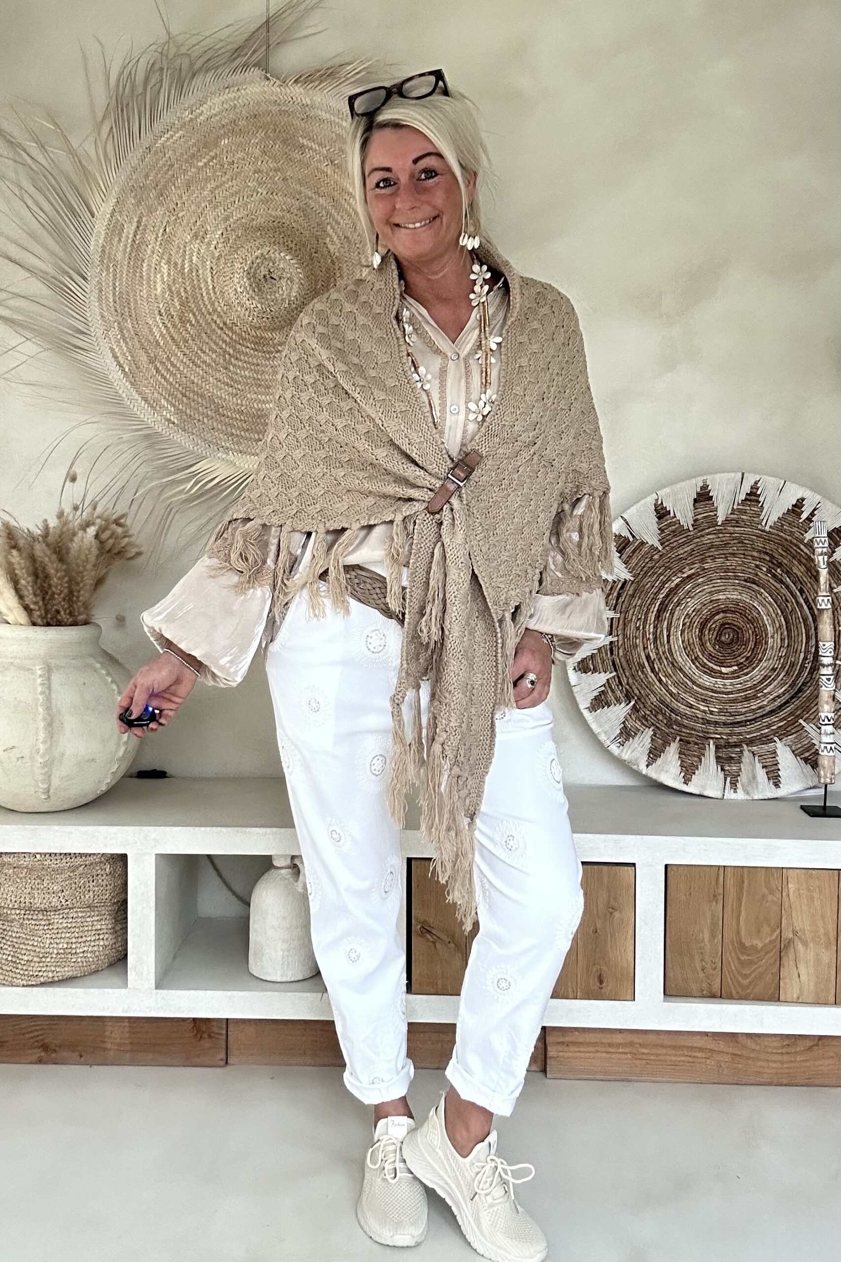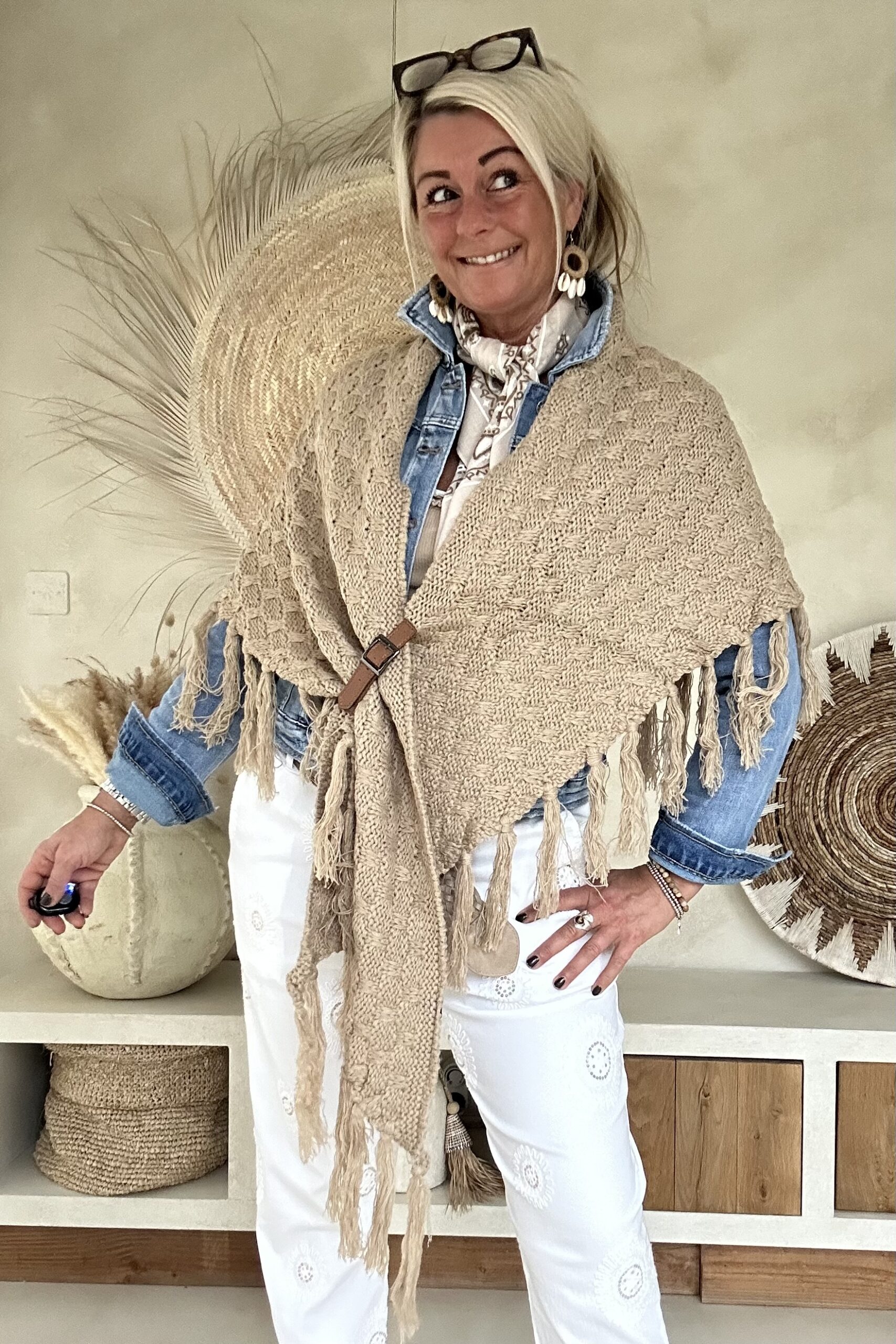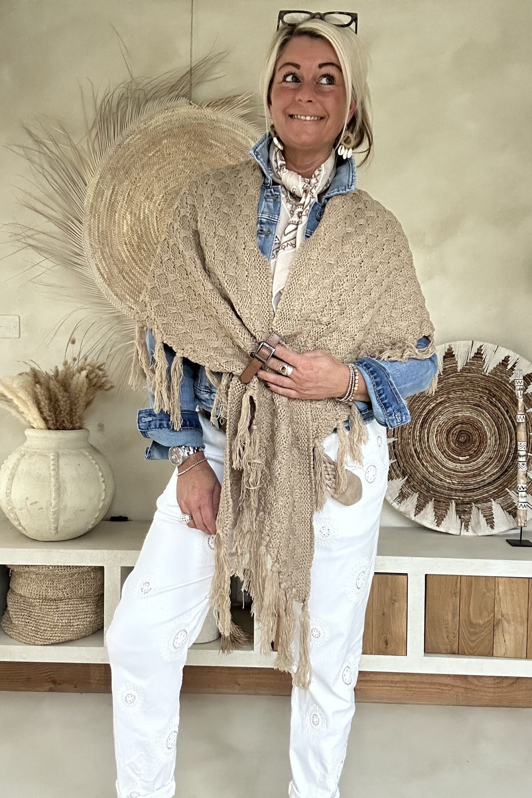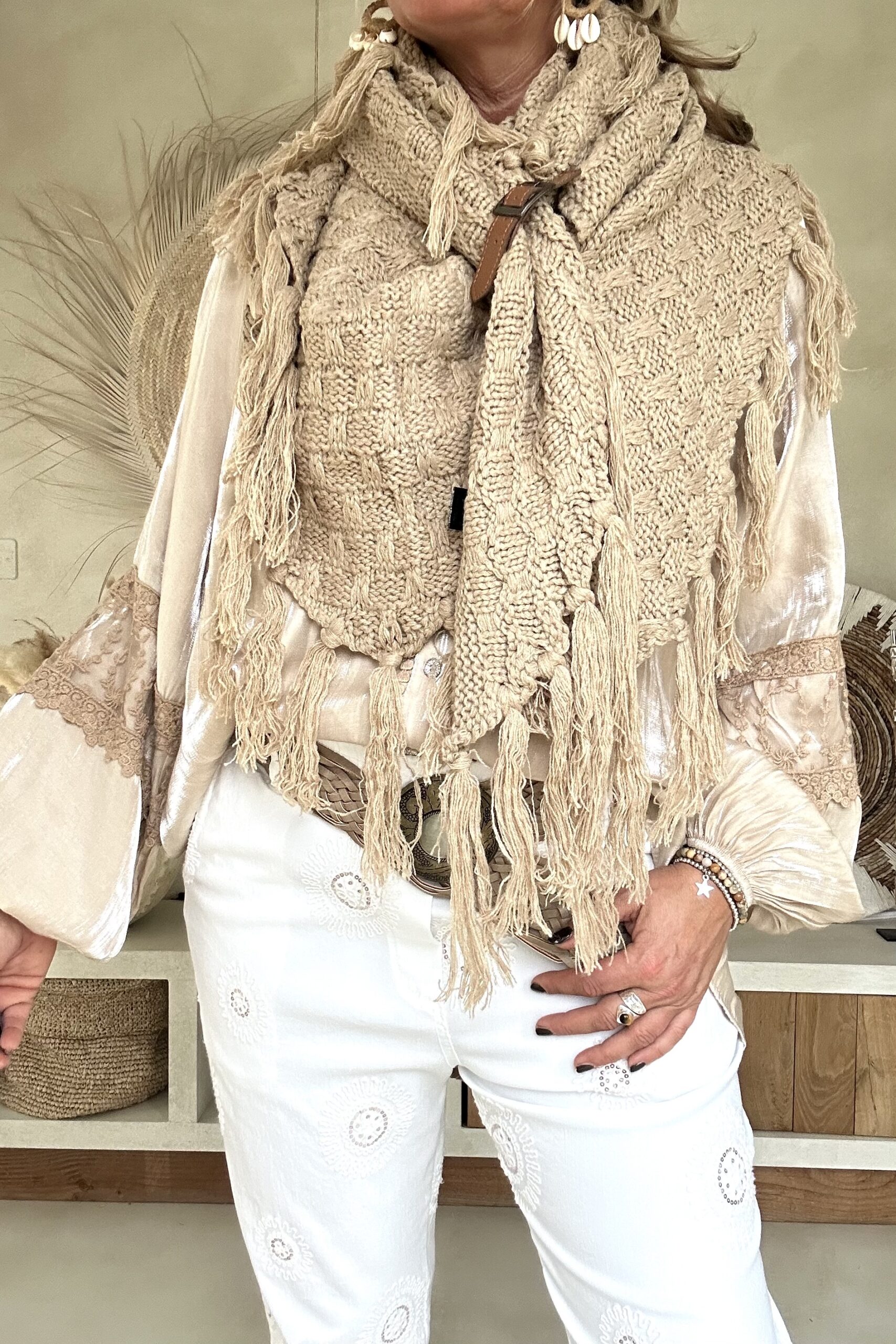 Deze knitwear omslagdoek is zo’n item dat je er in het voorjaar steeds weer bij pakt 🤍 De zachte, gebreide structuur in een warme naturel tint geeft direct een boho en stijlvolle uitstraling. Dankzij de imitatie leren lus met riempje blijft de omslagdoek mooi op z’n plek en krijgt het geheel net dat stoere detail.