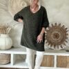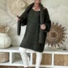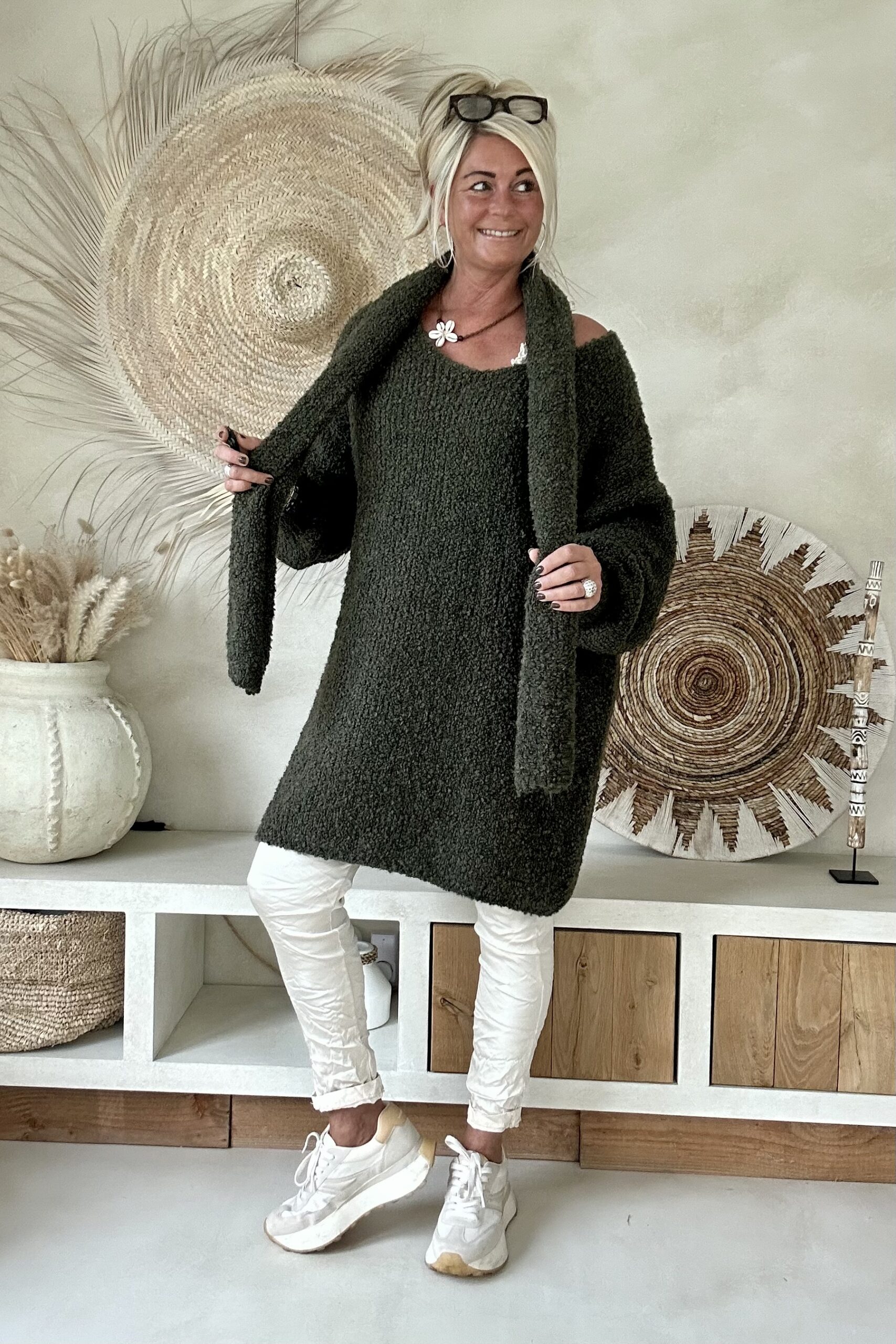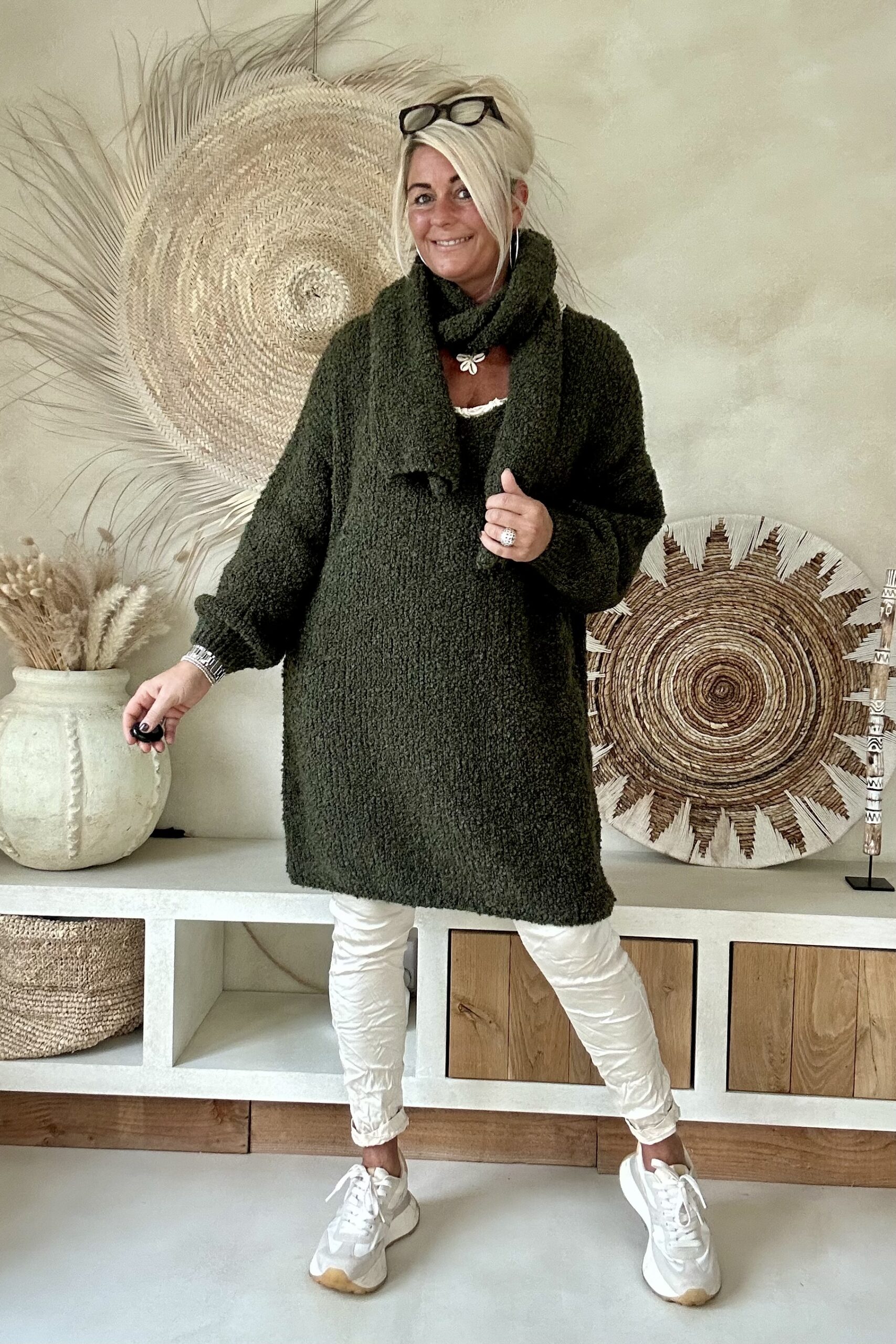 Deze heerlijk zachte, ruimvallende trui is gemaakt voor comfort én stijl. De grofgebreide structuur geeft een warme, cosy uitstraling, terwijl de bijpassende brede sjaal het geheel compleet maakt. Dankzij de fijne stretch en het oversized model valt deze trui soepel en comfortabel. Perfect voor koude dagen waarop je er toch vrouwelijk en aangekleed uit wilt zien.