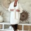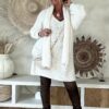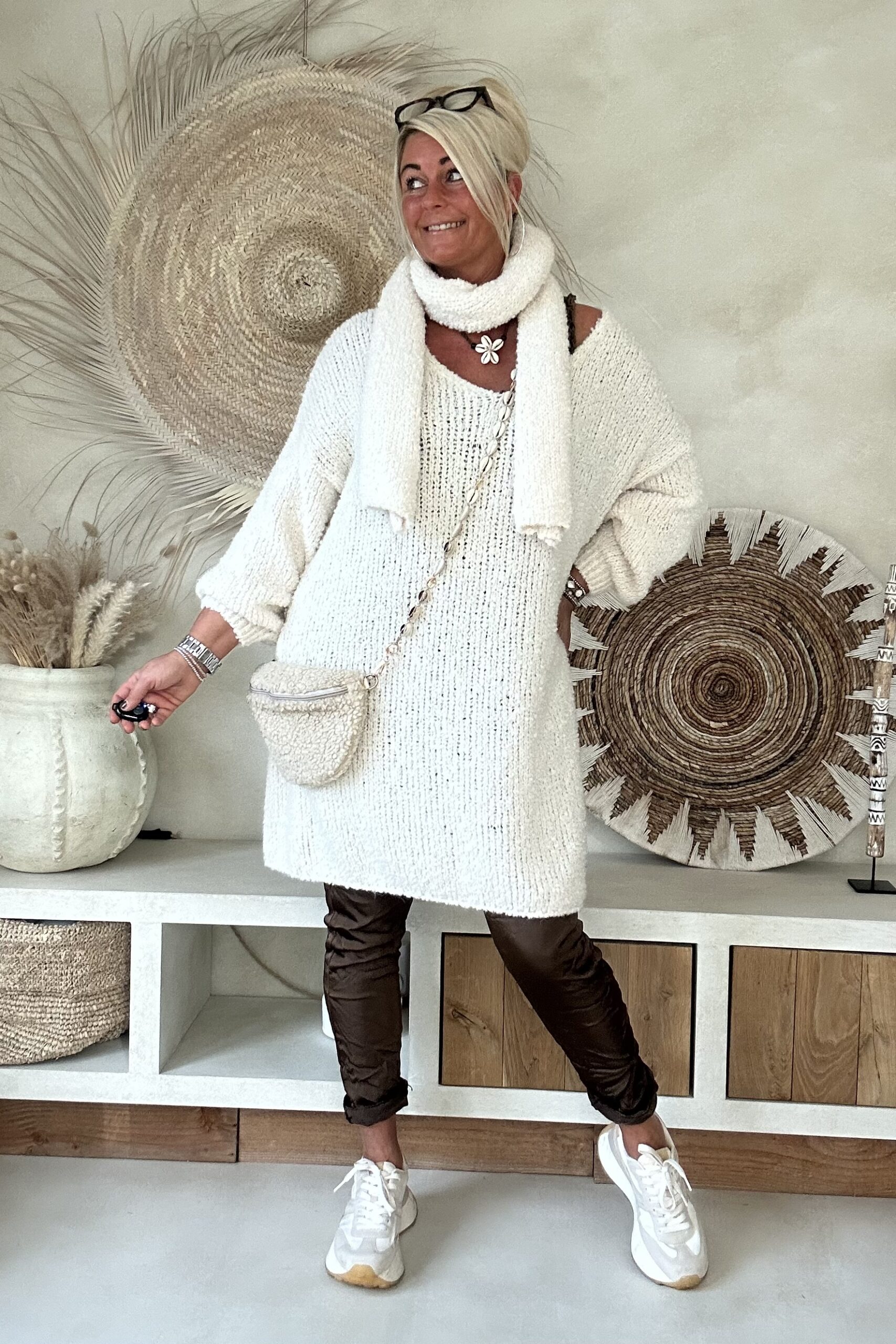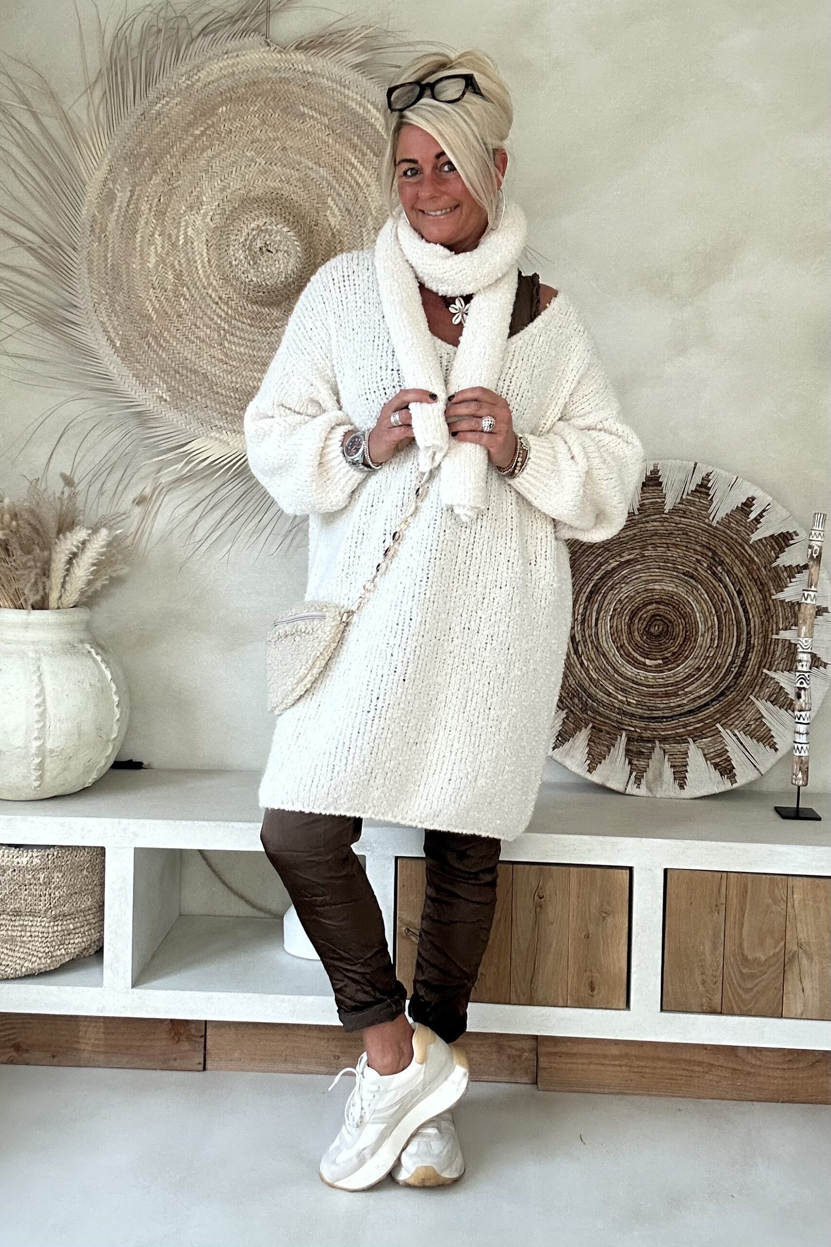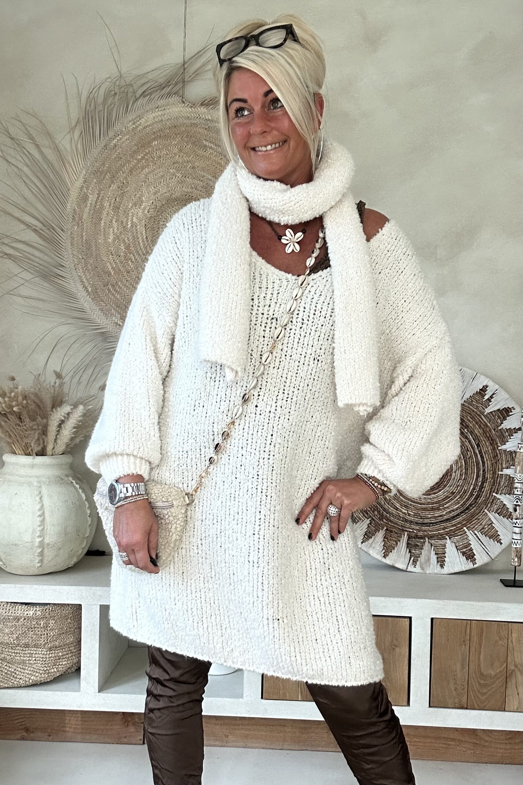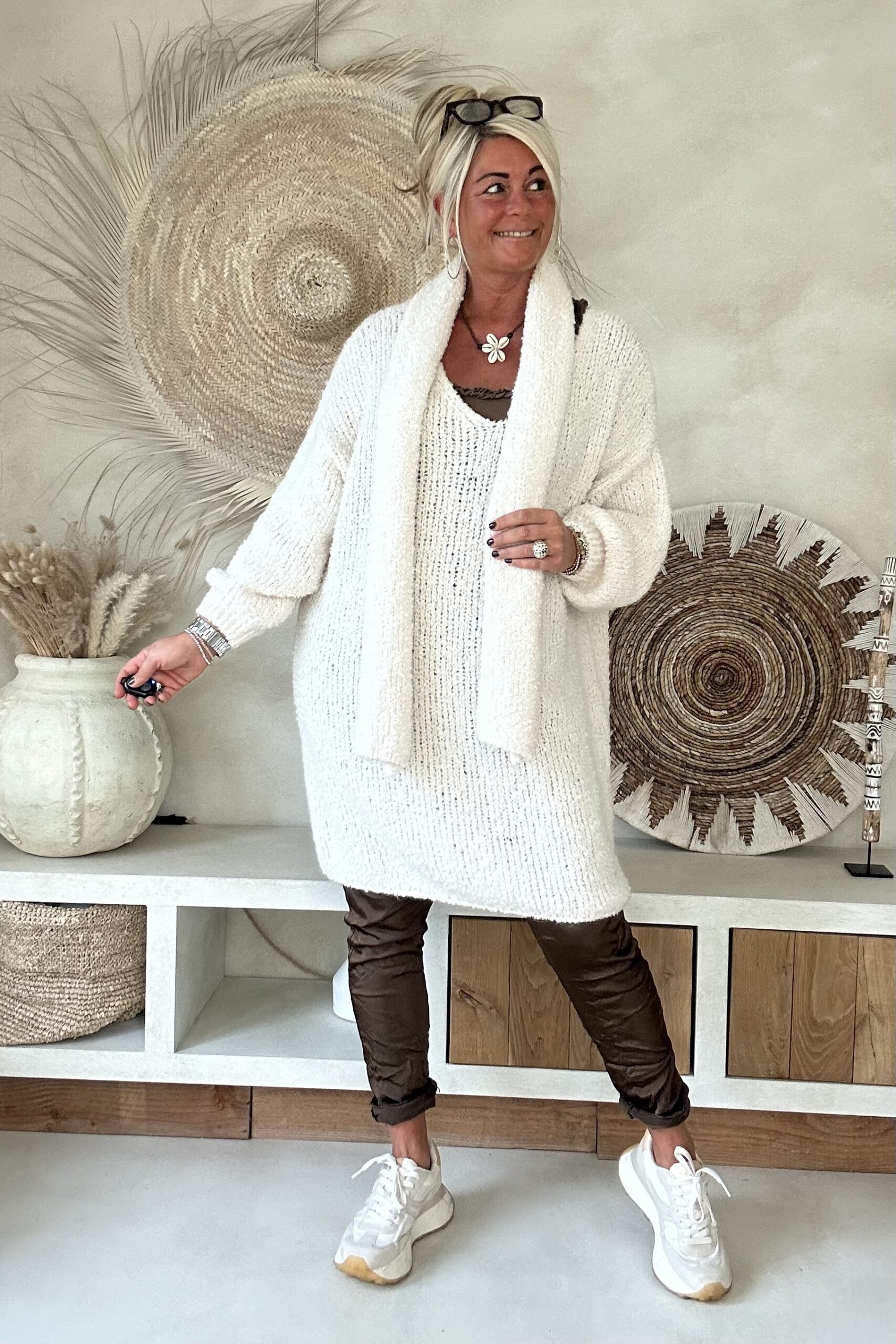 Deze heerlijk zachte, ruimvallende trui is gemaakt voor comfort én stijl. De grofgebreide structuur geeft een warme, cosy uitstraling, terwijl de bijpassende brede sjaal het geheel compleet maakt. Dankzij de fijne stretch en het oversized model valt deze trui soepel en comfortabel. Perfect voor koude dagen waarop je er toch vrouwelijk en aangekleed uit wilt zien.