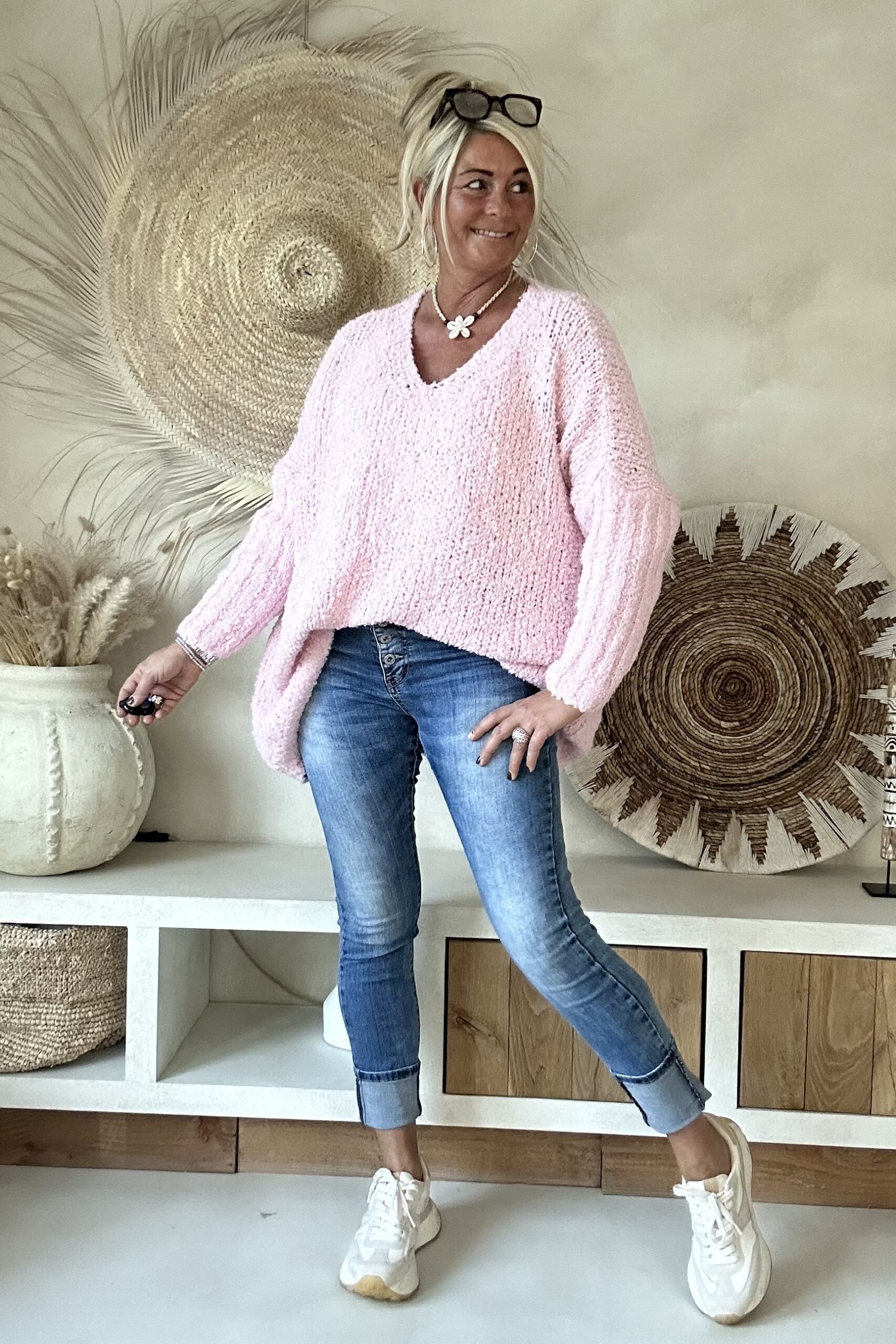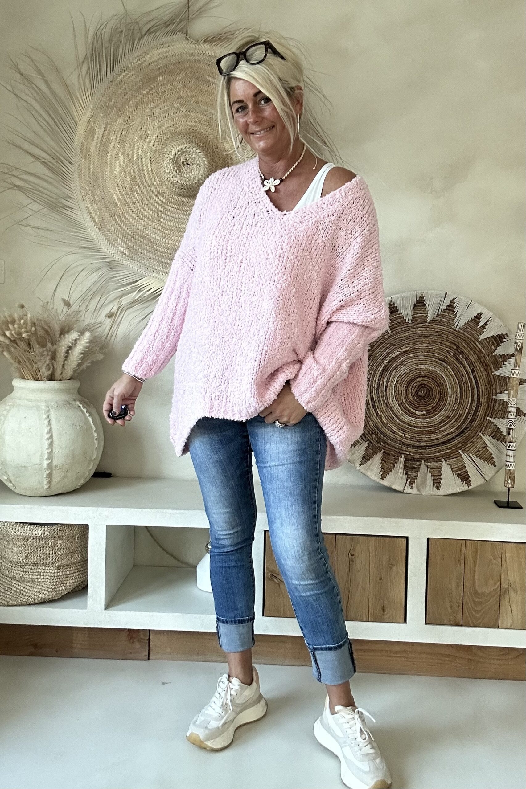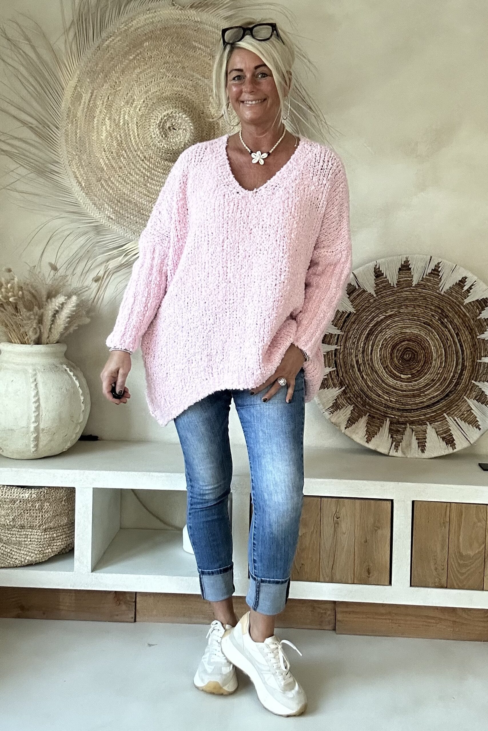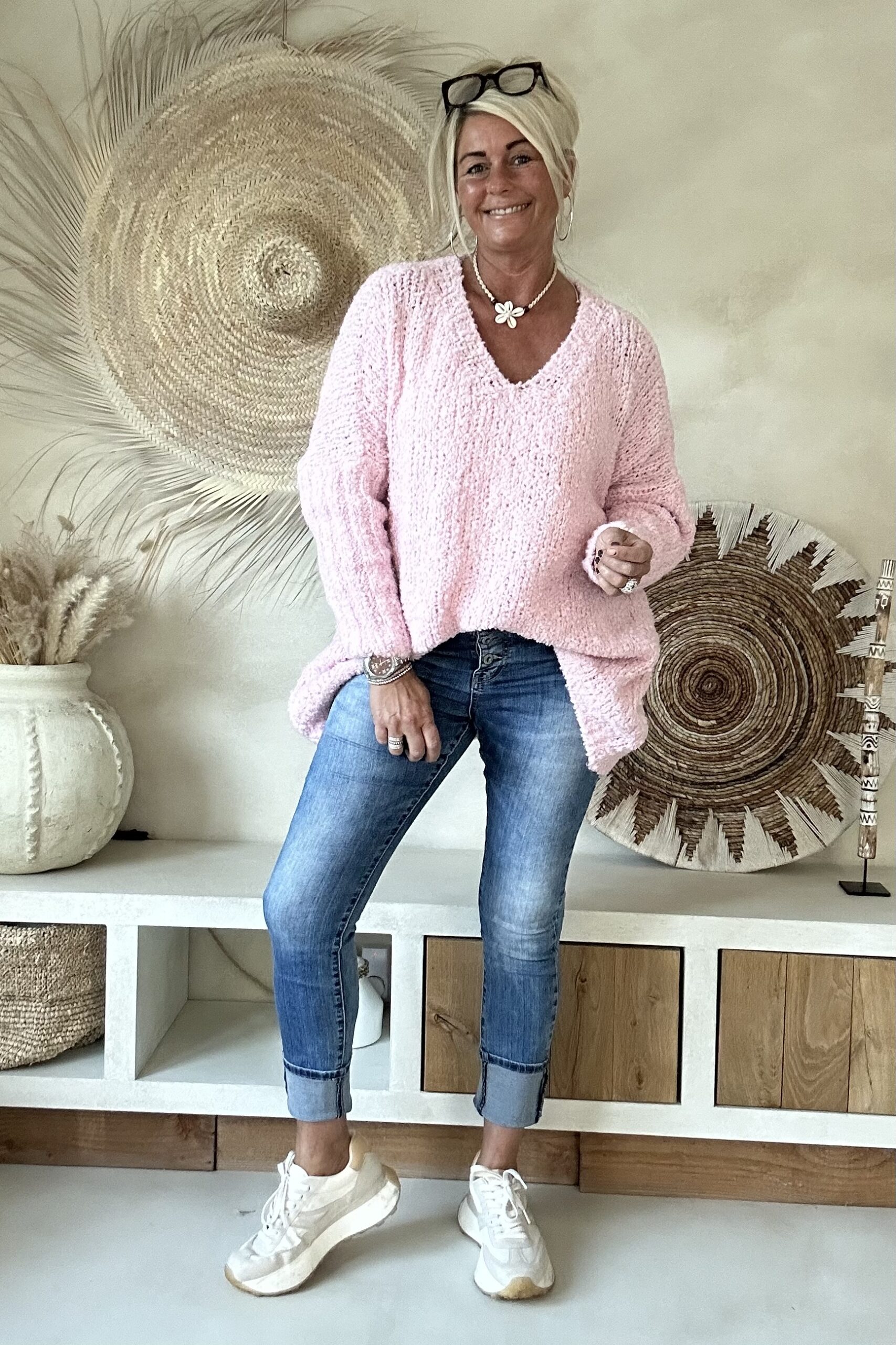 Hoe leuk is deze grof gebreide trui in zacht roze met een trendy V-hals en een kortere voorkant. Deze trui voelt super zacht aan en heeft een oversized model, waardoor hij perfect is voor die winterse boho beach look waar je naar verlangt. De ruime pasvorm maakt deze trui geschikt tot een ruime maat 44.