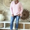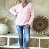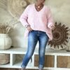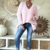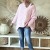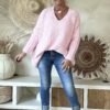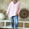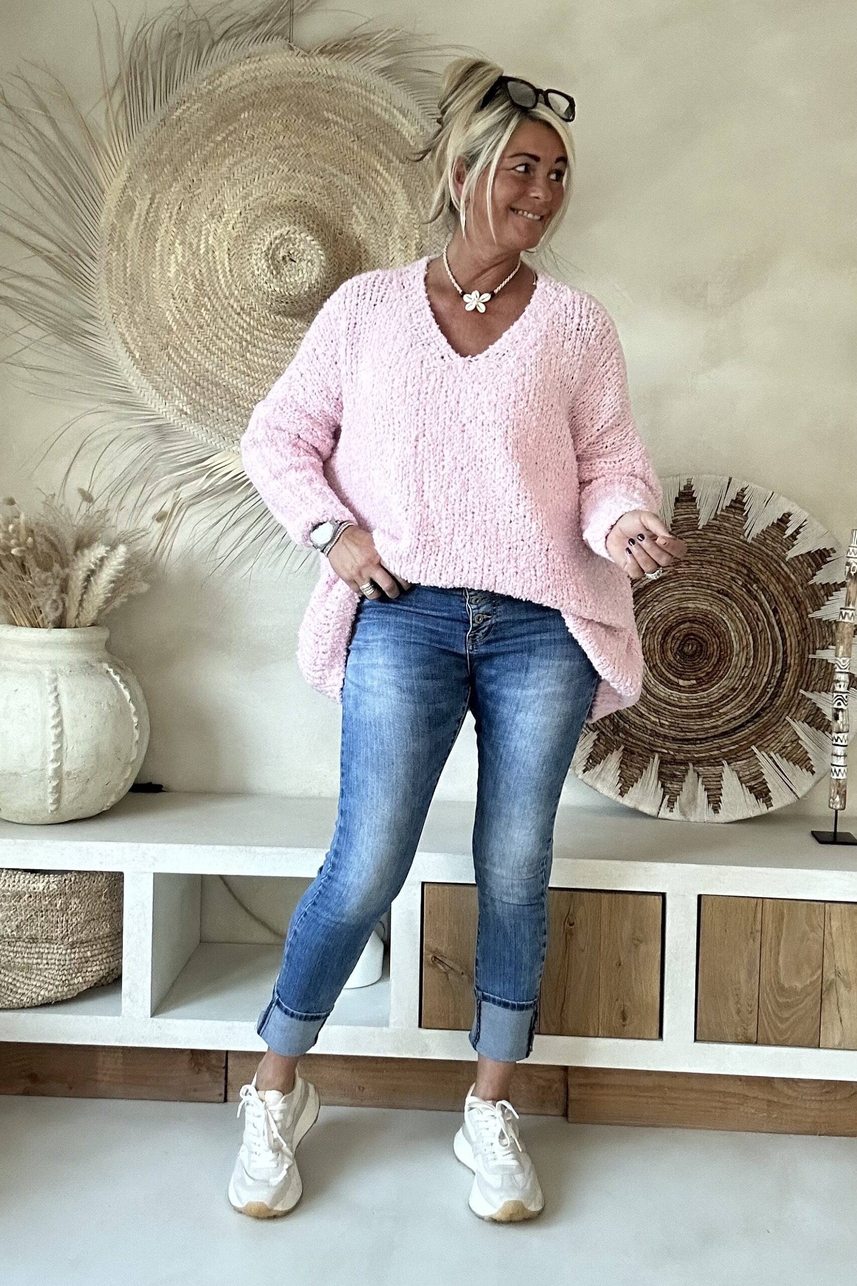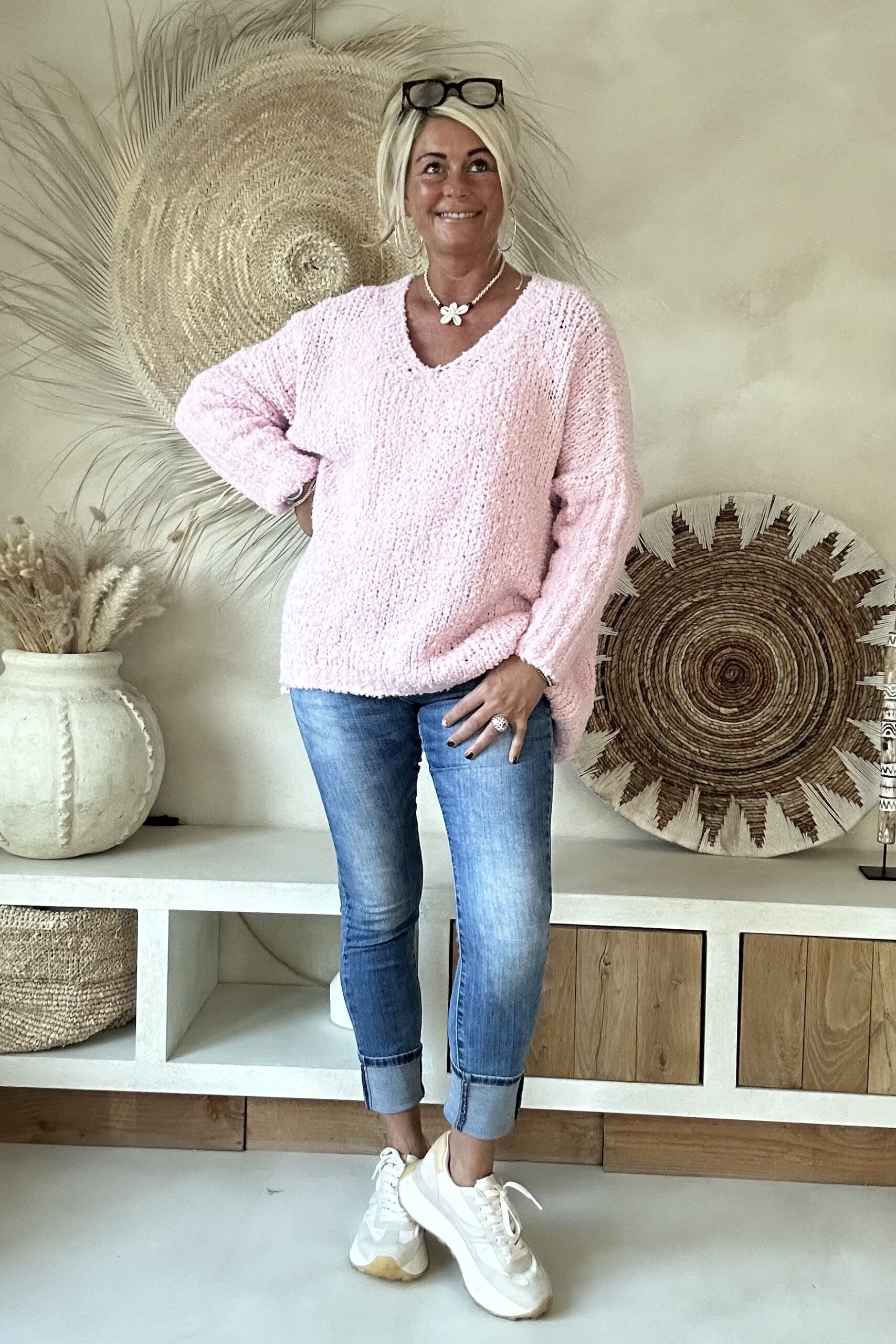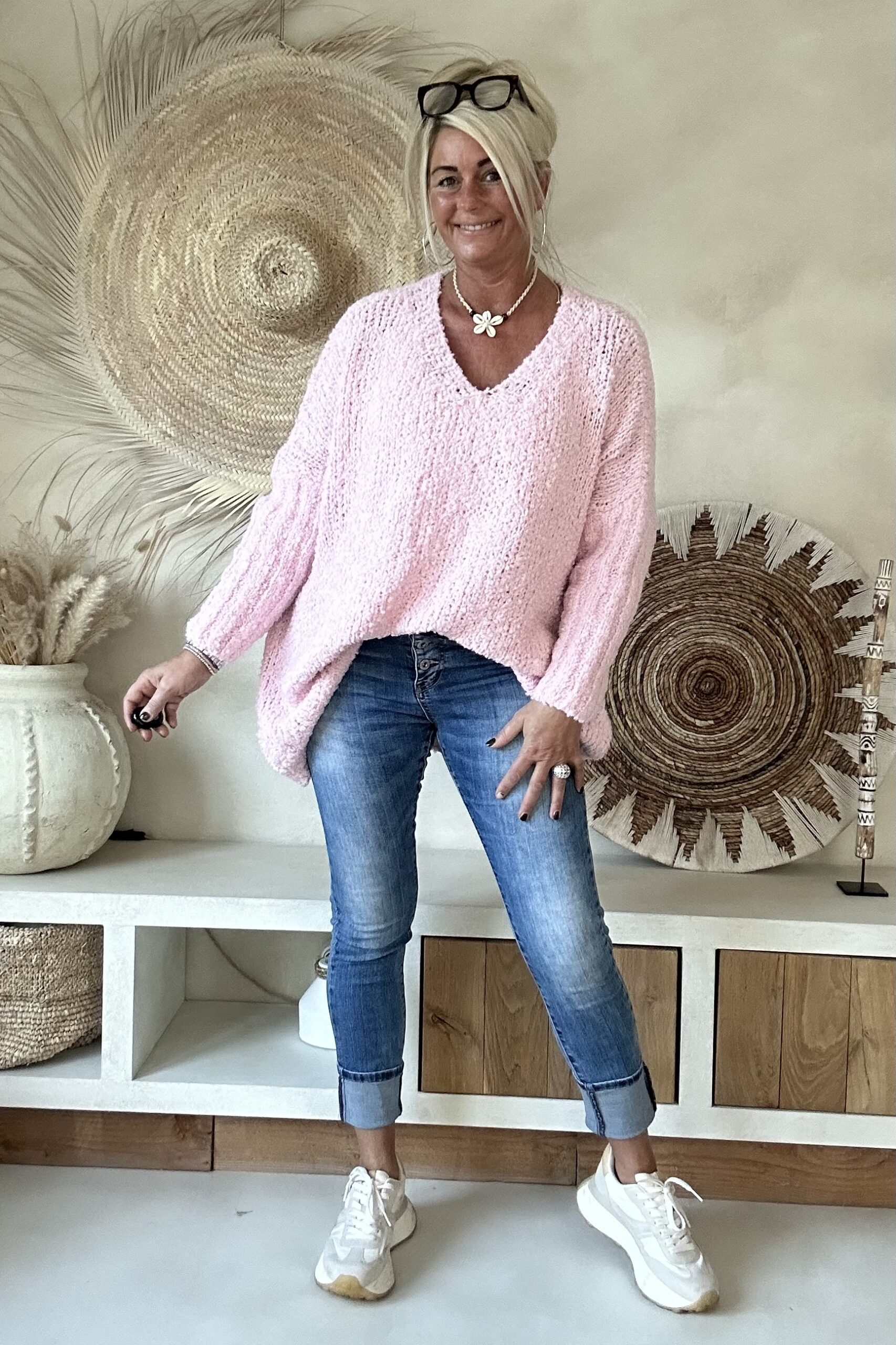 Hoe leuk is deze grof gebreide trui in zacht roze met een trendy V-hals en een kortere voorkant. Deze trui voelt super zacht aan en heeft een oversized model, waardoor hij perfect is voor die winterse boho beach look waar je naar verlangt. De ruime pasvorm maakt deze trui geschikt tot een ruime maat 44.