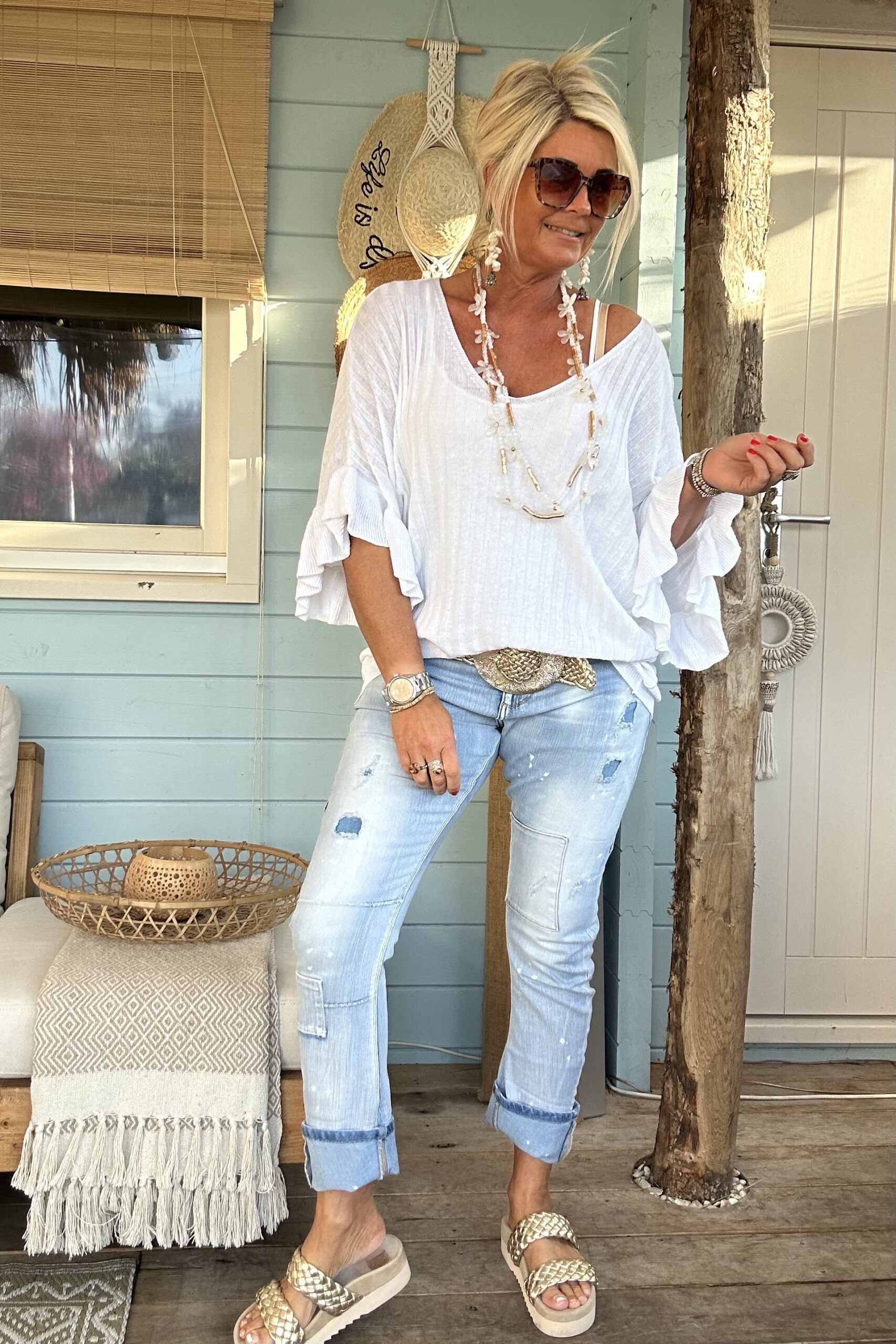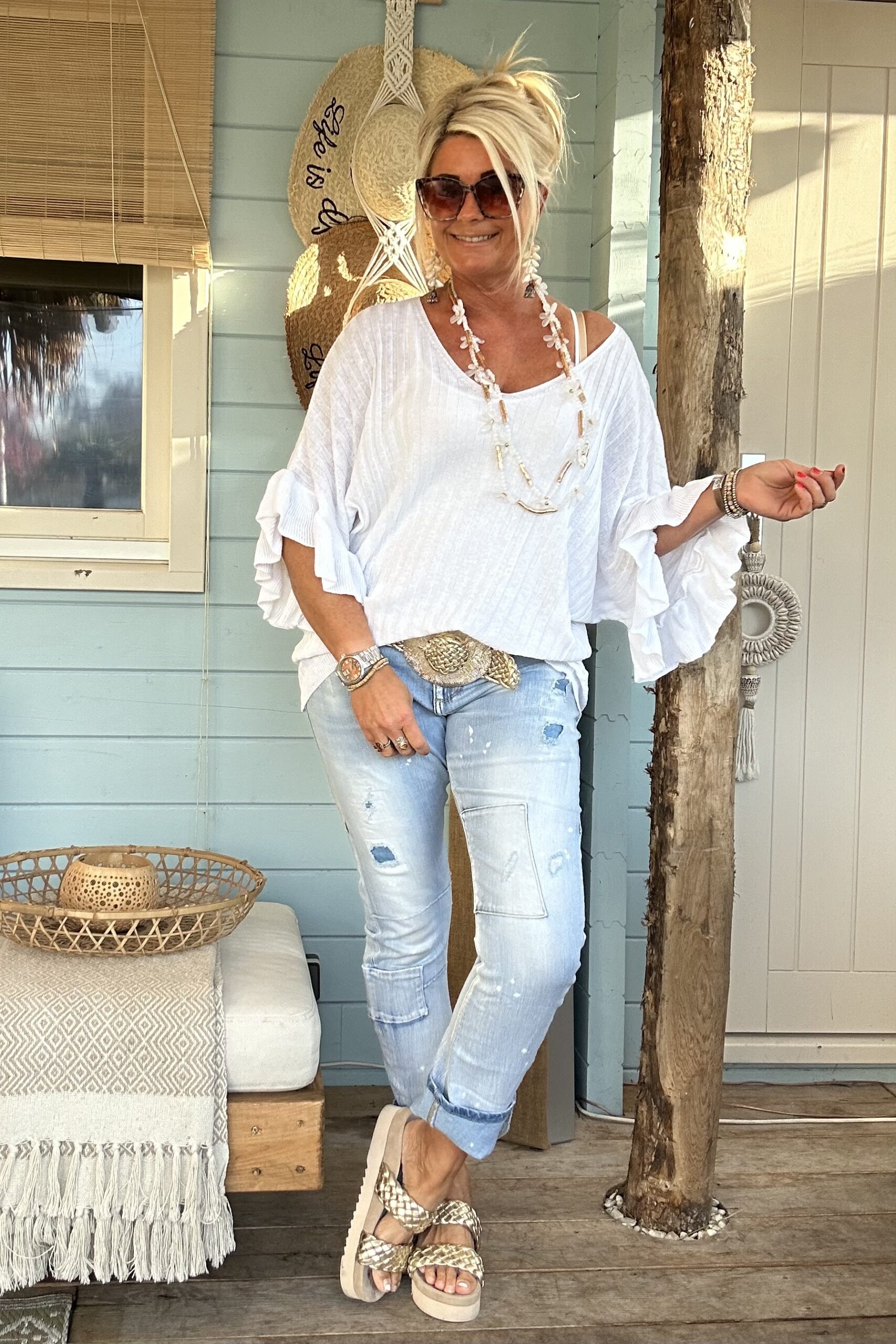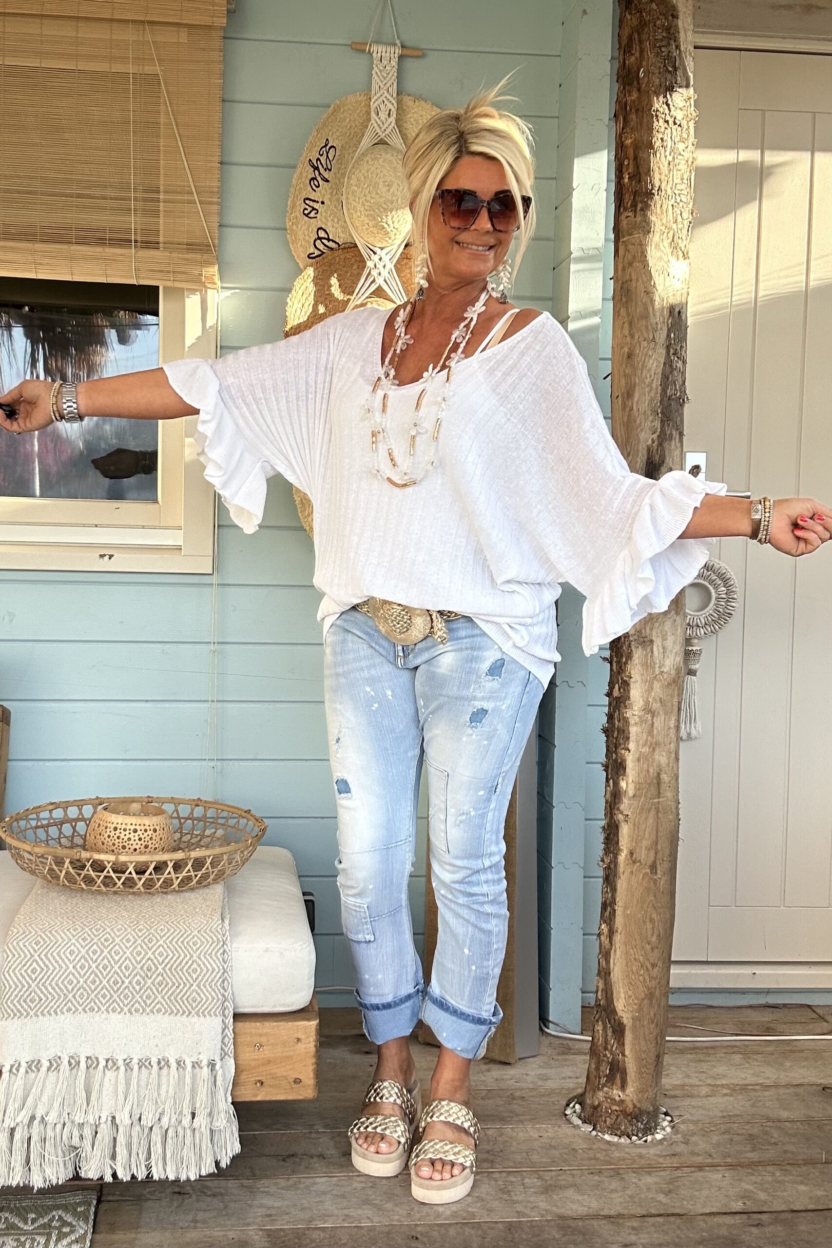 Knitwear trui Tessa korte Vlinder mouw met Volants Wit.